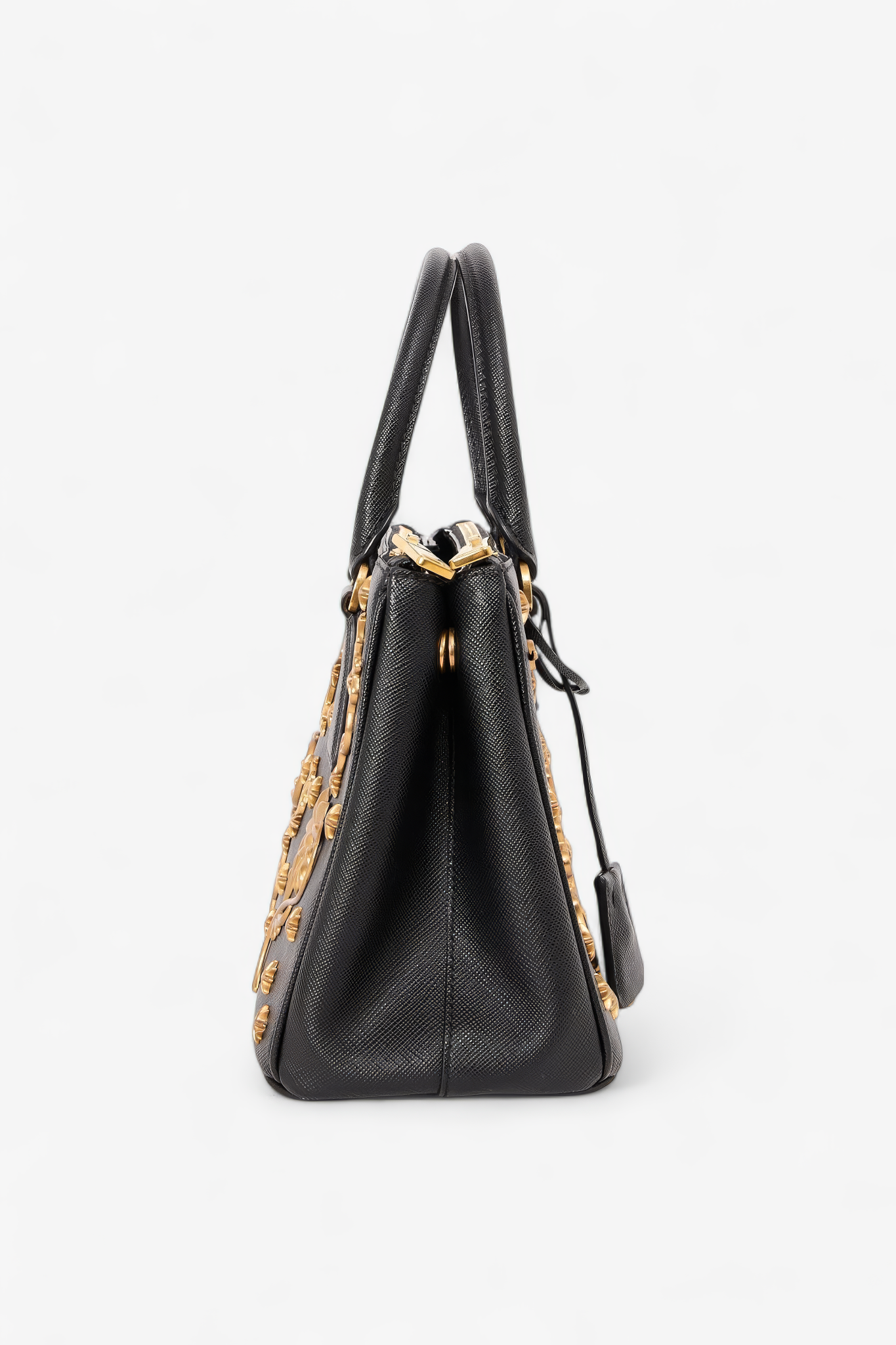 Oplev moderne luksus med denne Prada Small Galleria Studded, der kombinerer klassisk design med unikke detaljer. Tasken er udført i struktureret læder med dekorative studs og fine embellishments, som giver et eksklusivt og iøjnefaldende udtryk. Den elegante form og praktiske størrelse gør den perfekt til både hverdag og særlige anledninger.