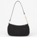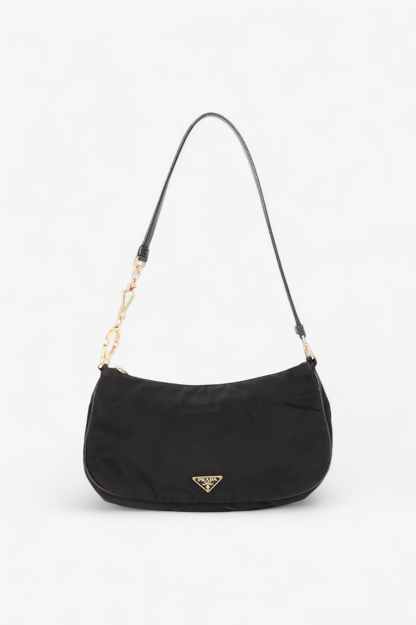 Klassisk og super eftertragtet Prada skuldertaske i sort nylon med ikonisk trekantslogo på fronten og guldfarvet hardware. Den elegante hobo-silhuet sidder flot på skulderen og giver et tidløst, minimalistisk Prada-look, der fungerer perfekt til både hverdag og aften.