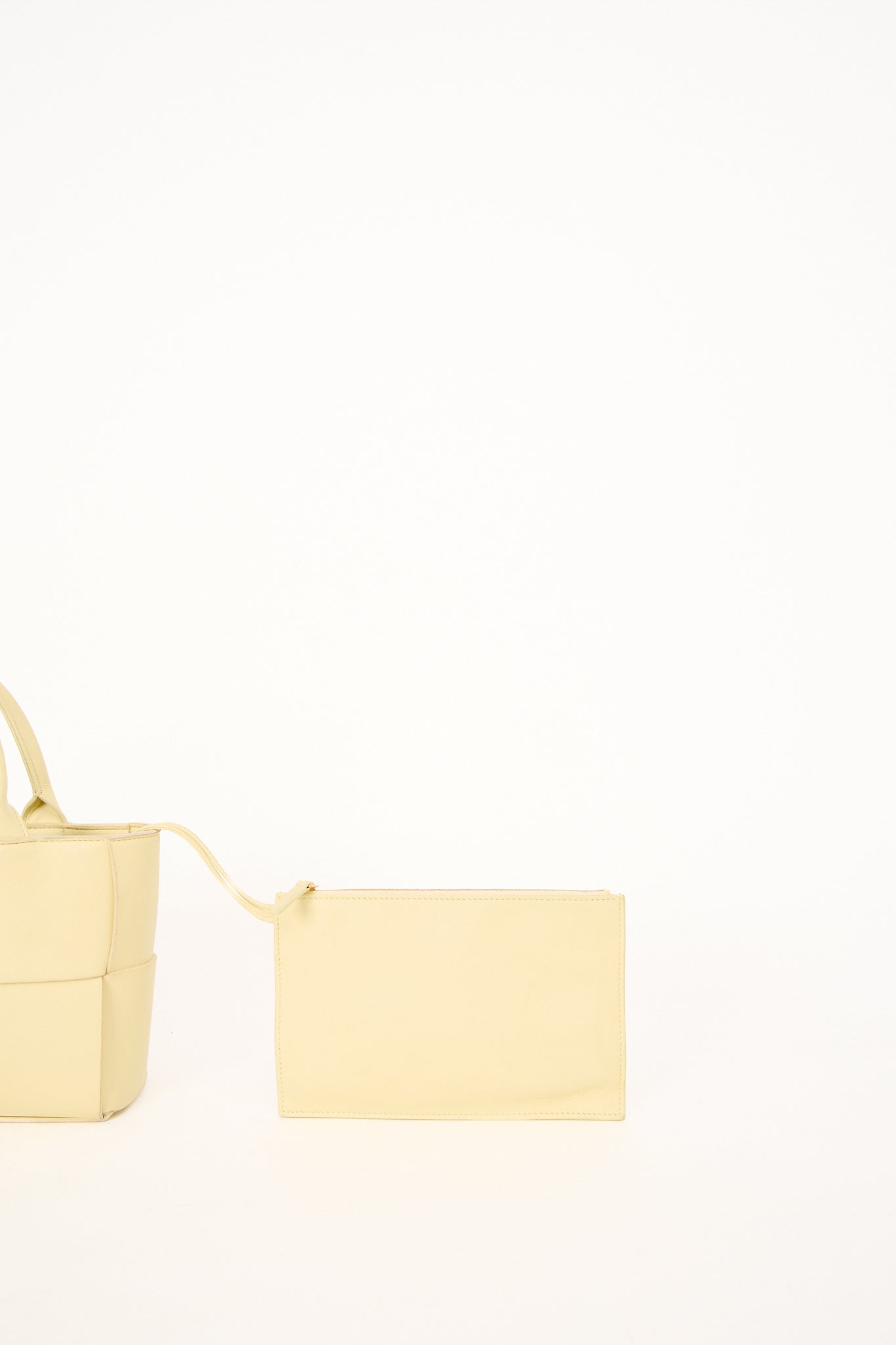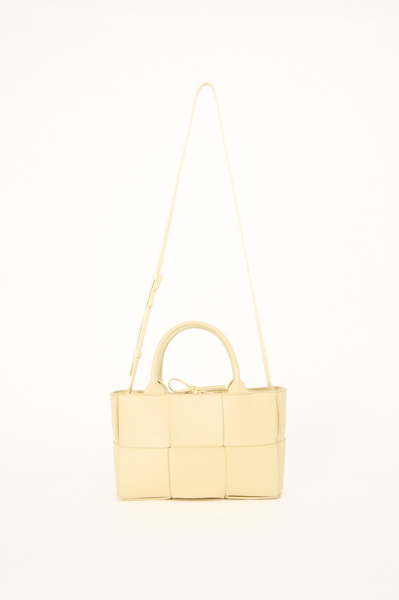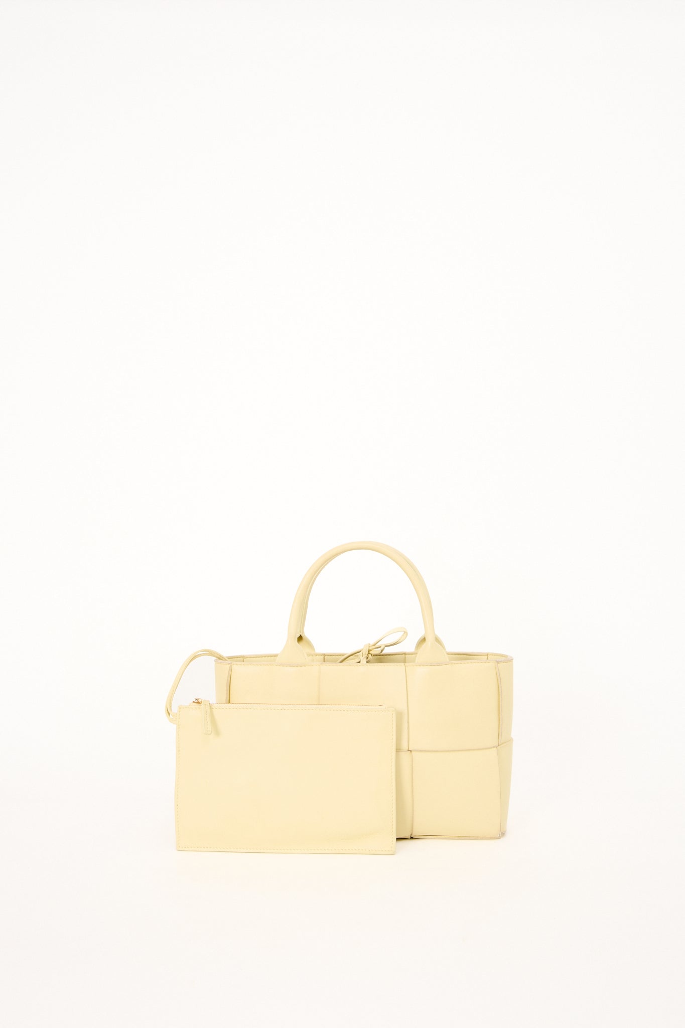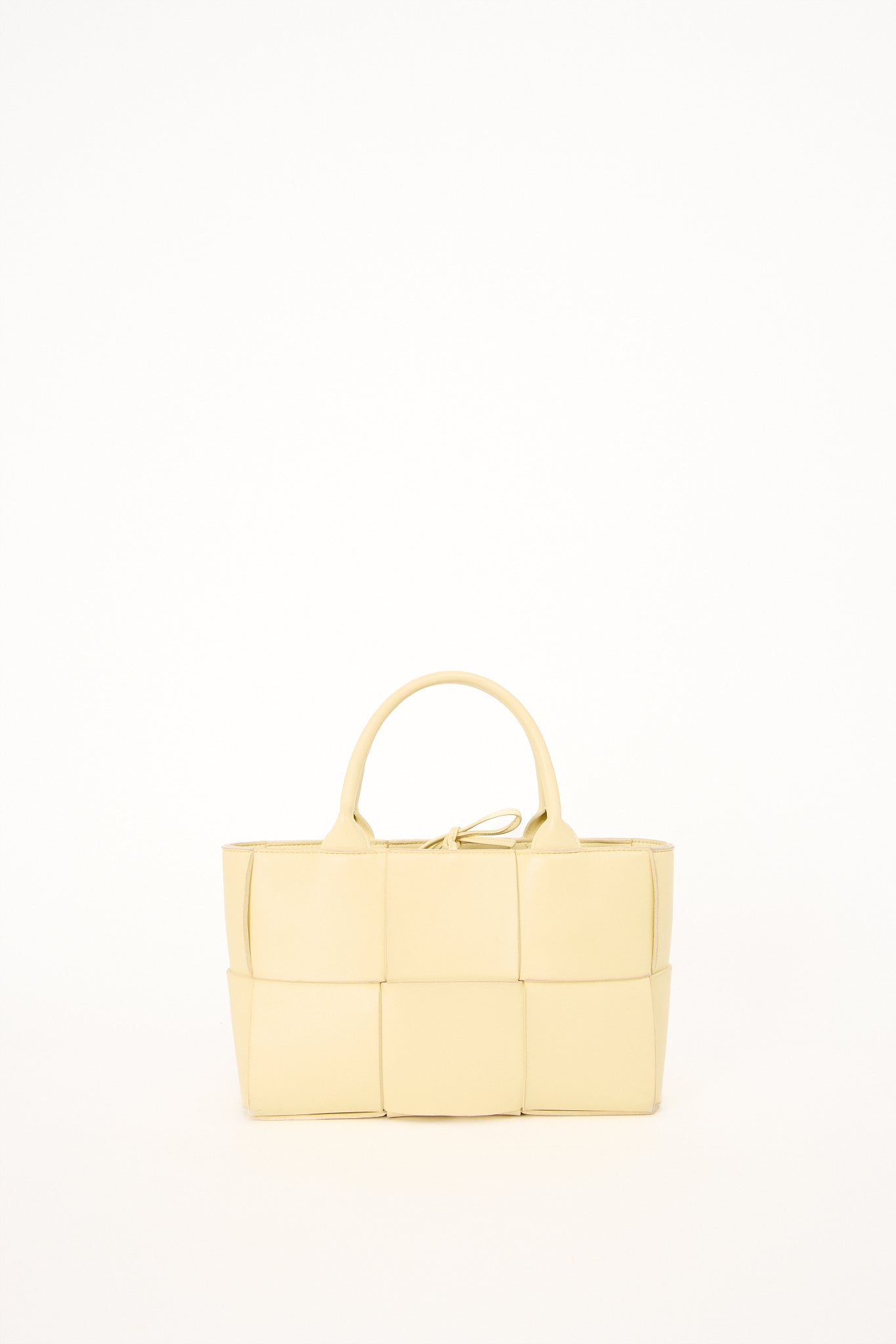 Bottega Veneta Arco Tote er et mesterværk i italiensk håndværk og moderne design. Tasken er udført i smørblødt kalveskind med husets karakteristiske Intrecciato-vævning, her fortolket i en stor, grafisk skala, der giver et minimalistisk og arkitektonisk udtryk. Den bløde gule nuance tilfører varme og friskhed til det strukturerede design, mens de runde håndtag og rummelige form gør tasken ideel til både arbejde, rejser og fritid. Indvendigt afslører den en luksuriøs, uforet konstruktion, der fremhæver læderets naturlige kvalitet.