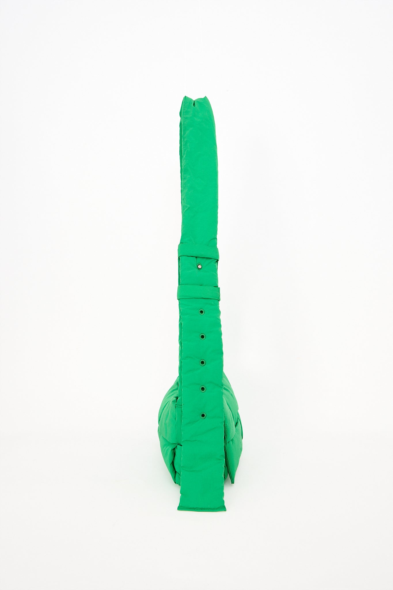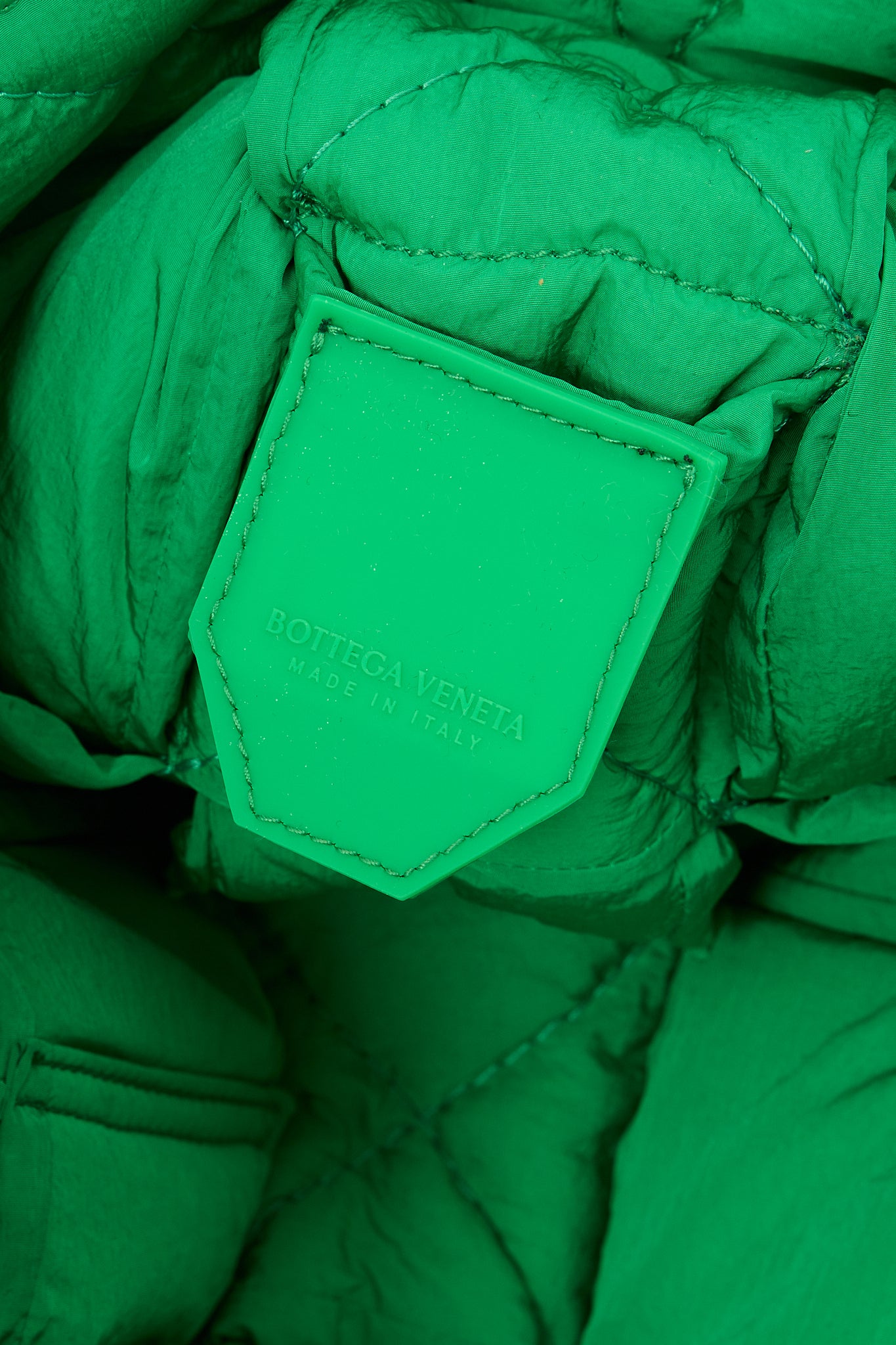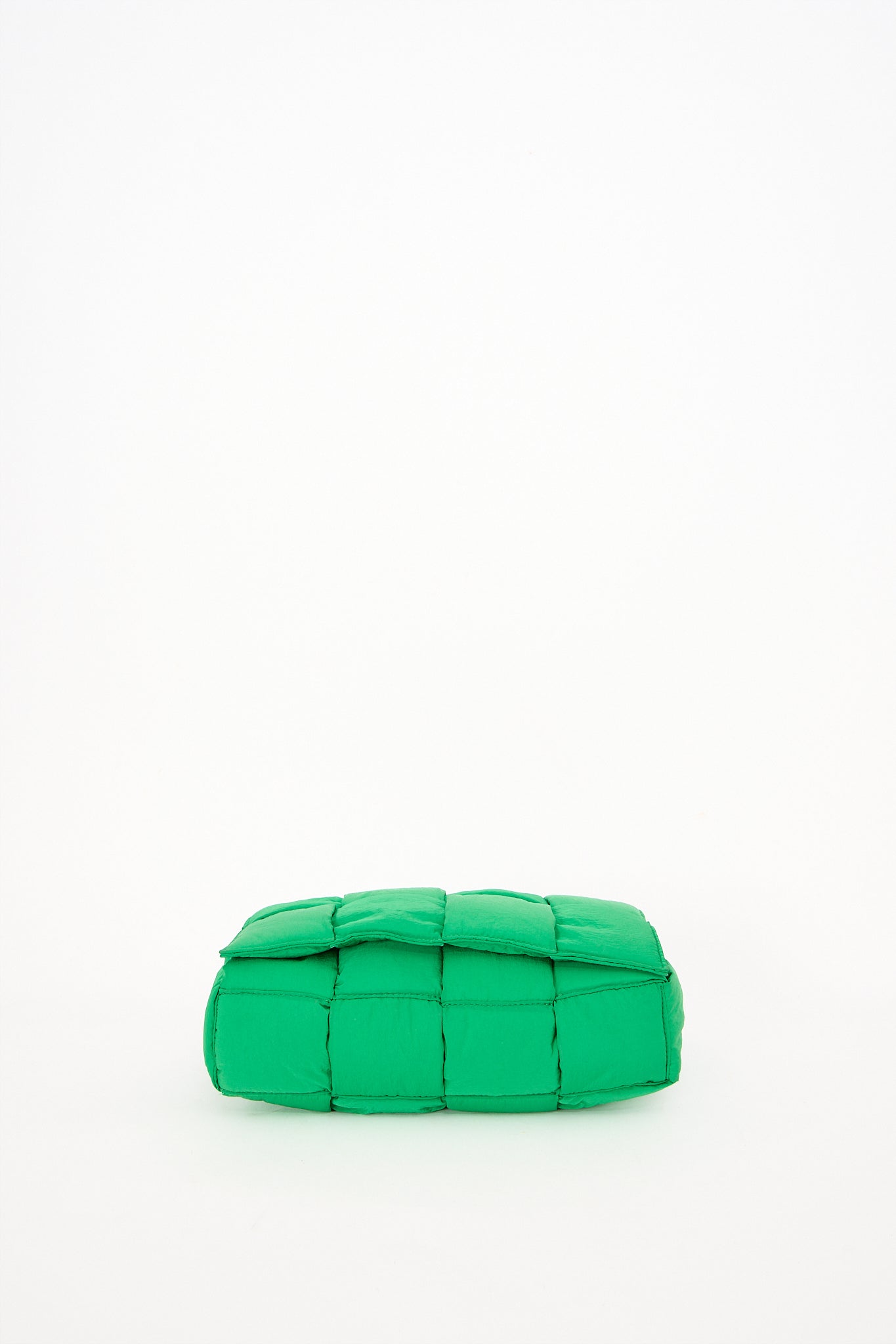 Den ikoniske Padded Cassette fra Bottega Veneta - Med dens polstret nylon og den karakteristiske intrecciato-fletstruktur. Tasken er både iøjnefaldende og praktisk med sin dybe, grønne nuance, der tilfører et friskt pust til enhver garderobe. Den polstrede silhuet og brede skulderrem giver et afslappet, men luksuriøst udtryk, perfekt til både hverdag og rejse.