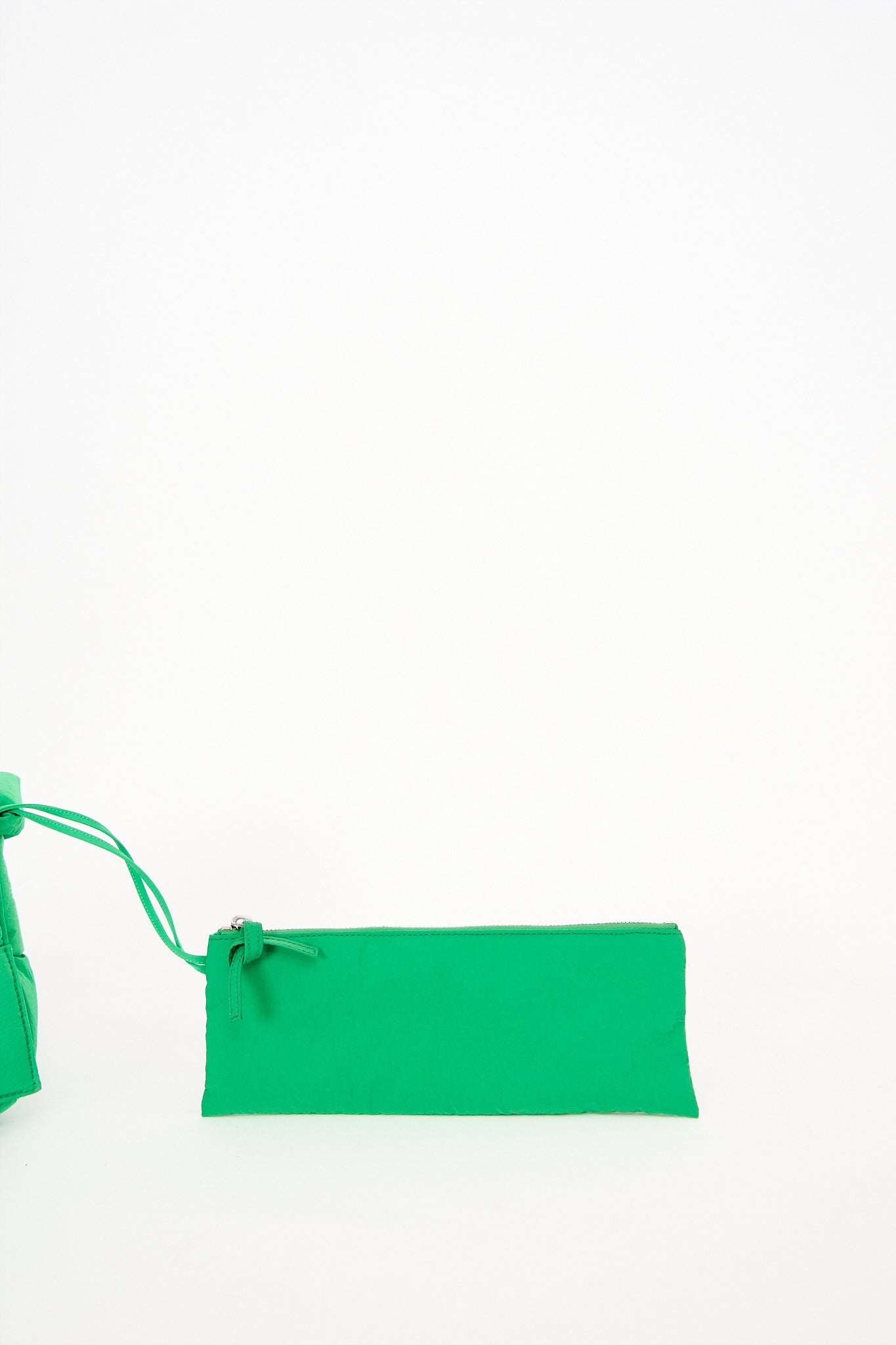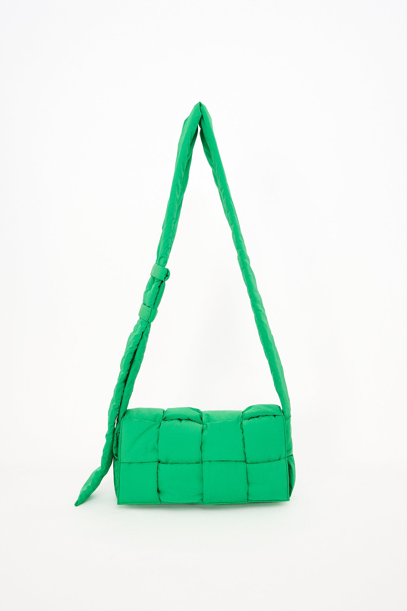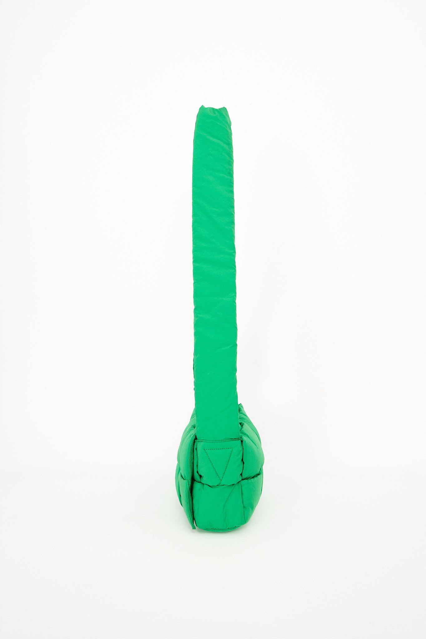 Den ikoniske Padded Cassette fra Bottega Veneta - Med dens polstret nylon og den karakteristiske intrecciato-fletstruktur. Tasken er både iøjnefaldende og praktisk med sin dybe, grønne nuance, der tilfører et friskt pust til enhver garderobe. Den polstrede silhuet og brede skulderrem giver et afslappet, men luksuriøst udtryk, perfekt til både hverdag og rejse.