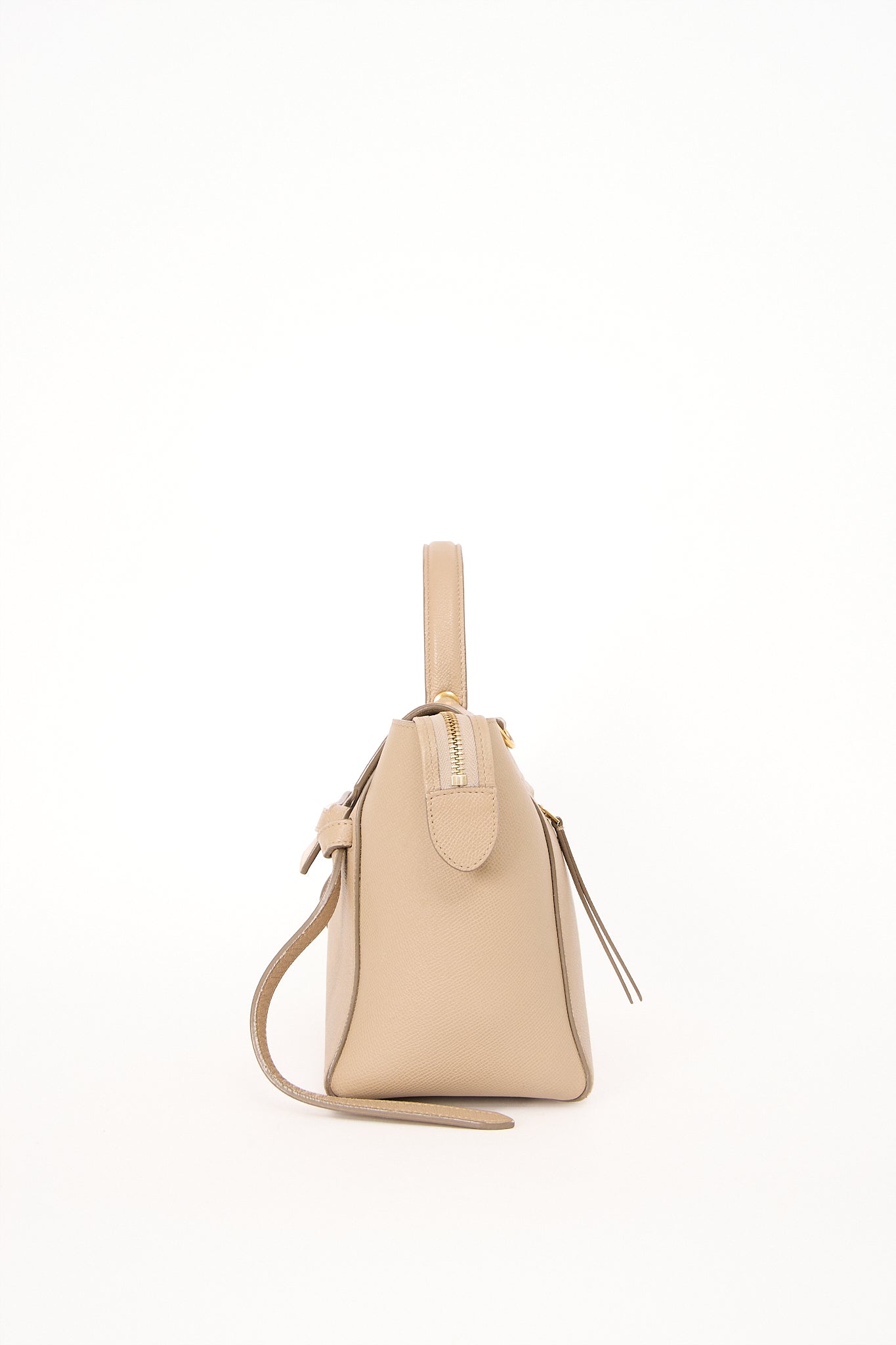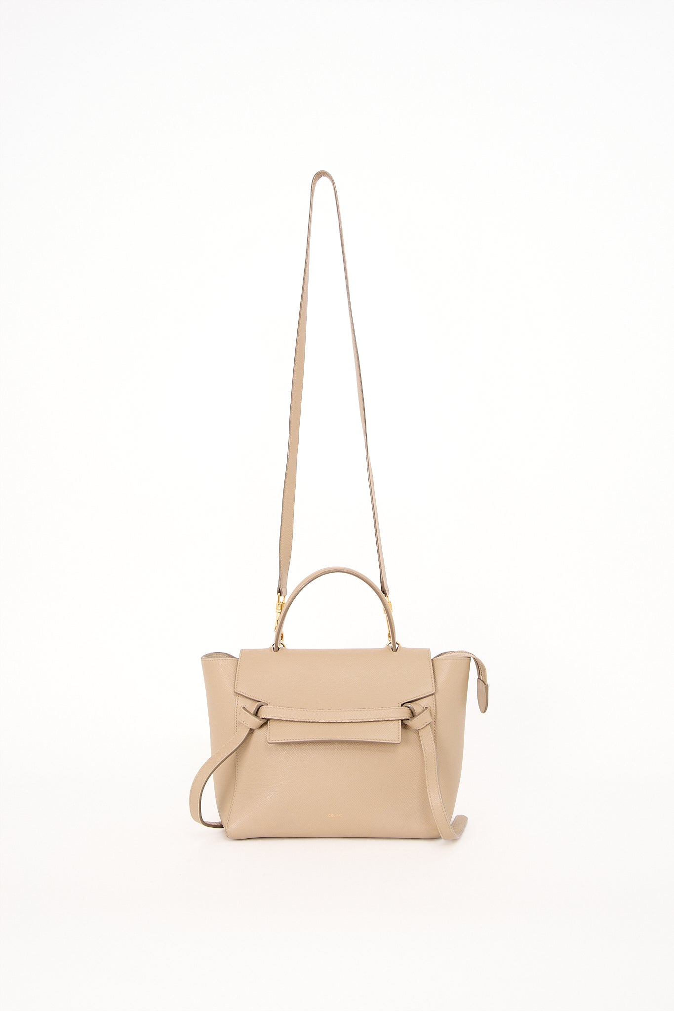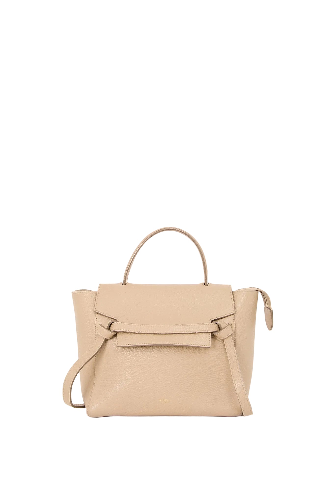 Elegant og minimalistisk Celine Belt i beige grained kalveskind. Tasken har et sofistikeret design med den karakteristiske bælte-detalje på fronten, top-hank og aftagelig skulderrem, der gør den både praktisk og stilfuld. Et tidløst valg, der passer perfekt til både hverdag og kontorbrug.