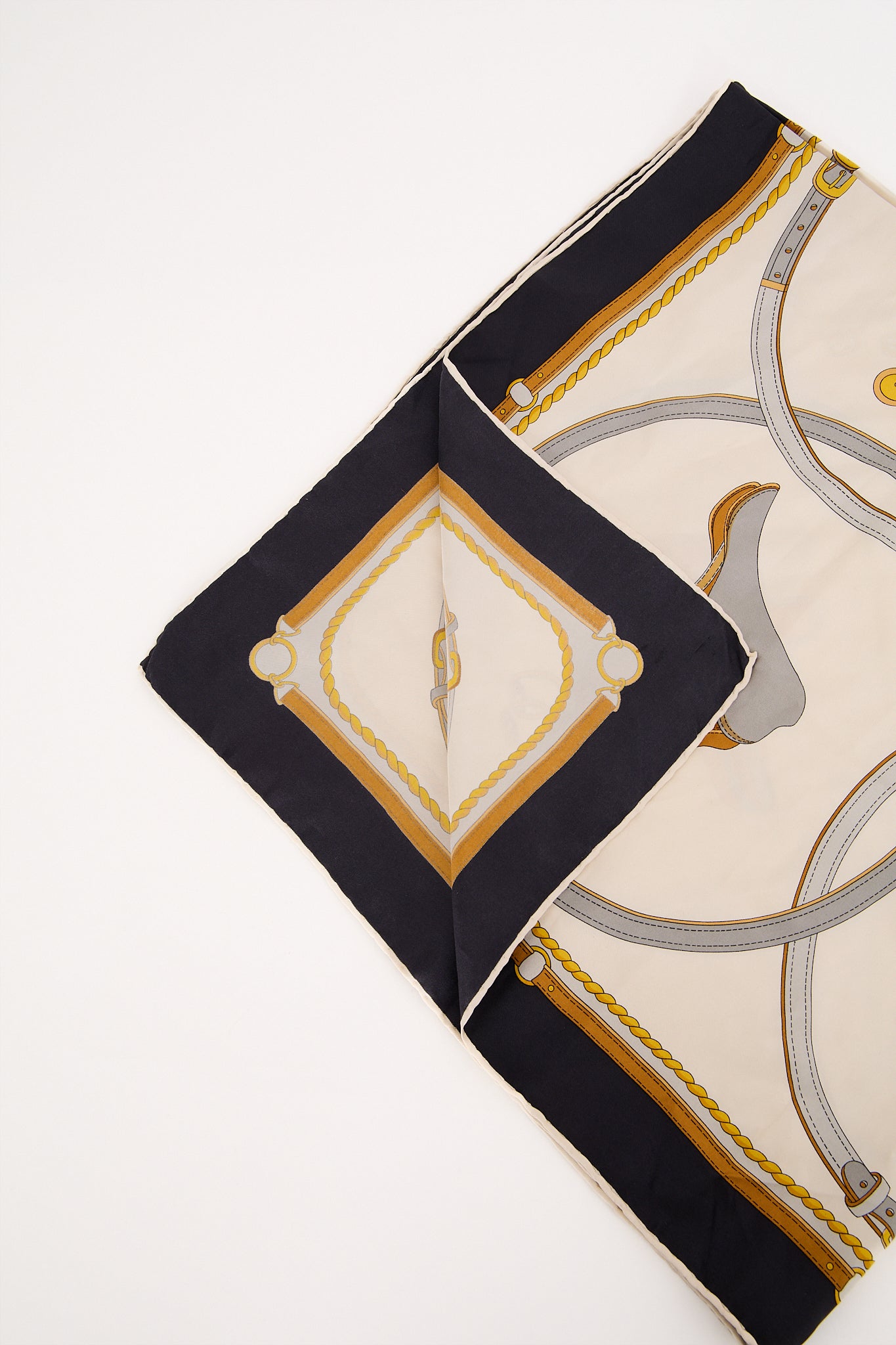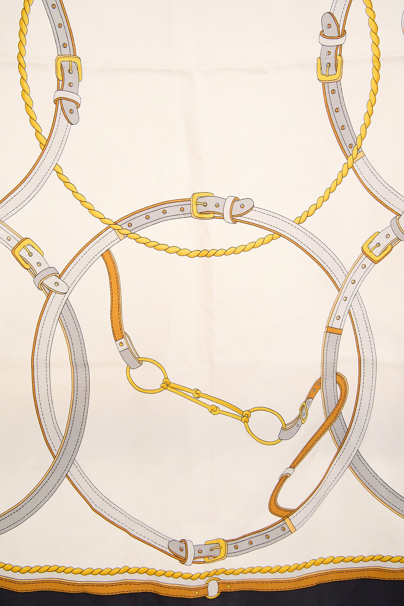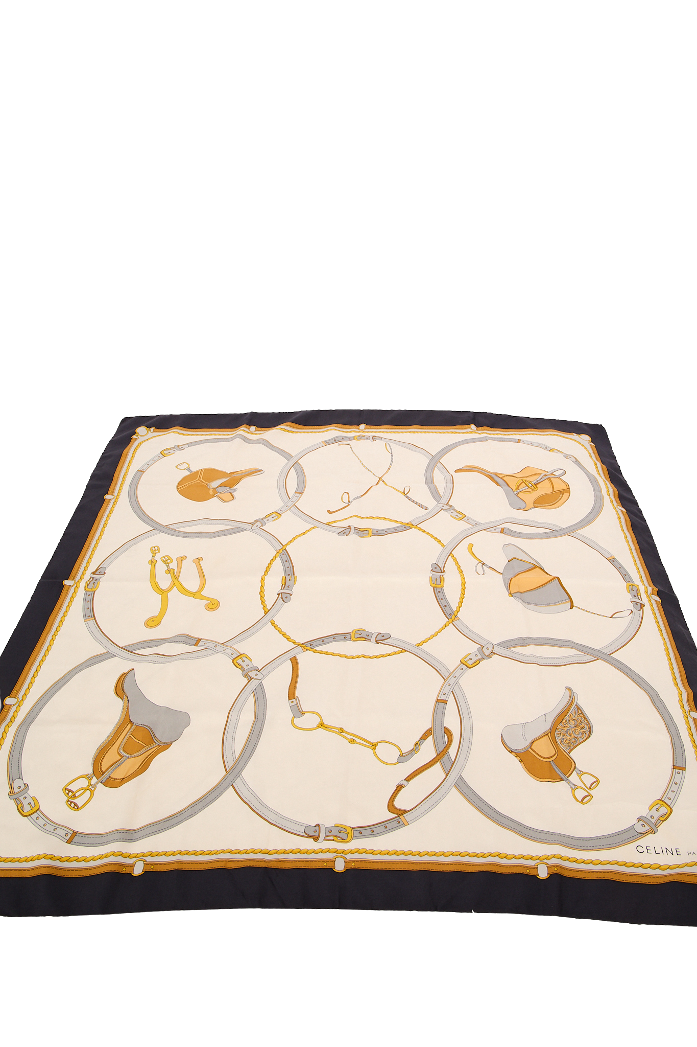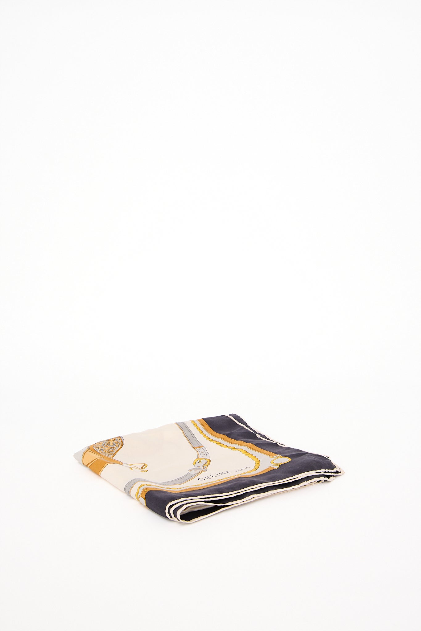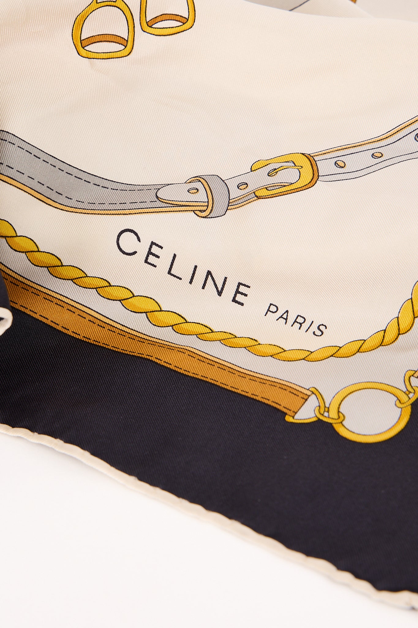 Et eksklusivt vintage Celine-tørklæde i 100% silke med det karakteristiske equestrian print, der er en hyldest til husets klassiske franske elegance. Designet kombinerer gyldne bælte- og rebdetaljer på en elfenbensfarvet baggrund med en mørk kant – et tidløst og luksuriøst accessory. Perfekt til at binde om halsen, i håret eller på tasken for et elegant parisisk touch.