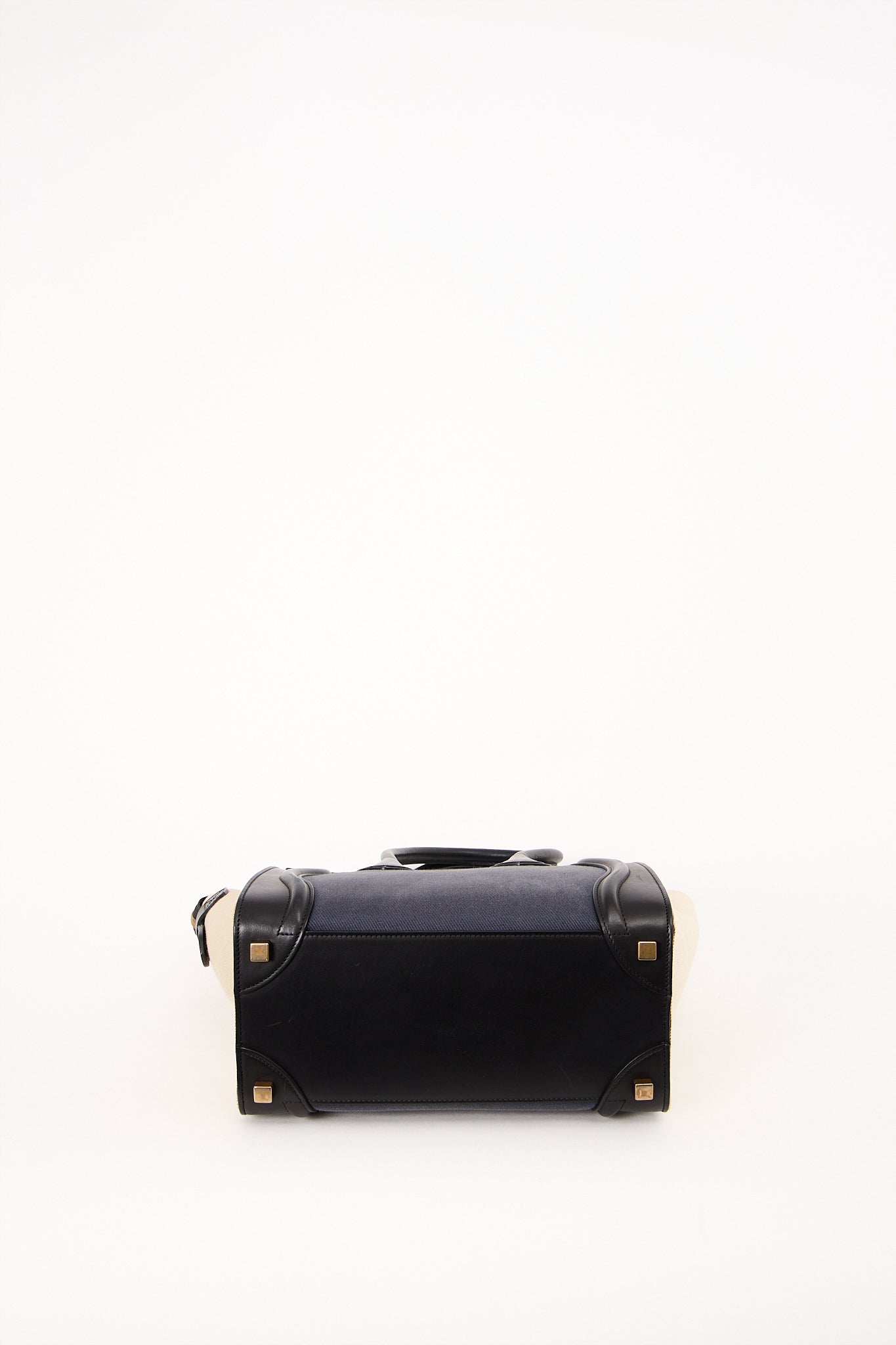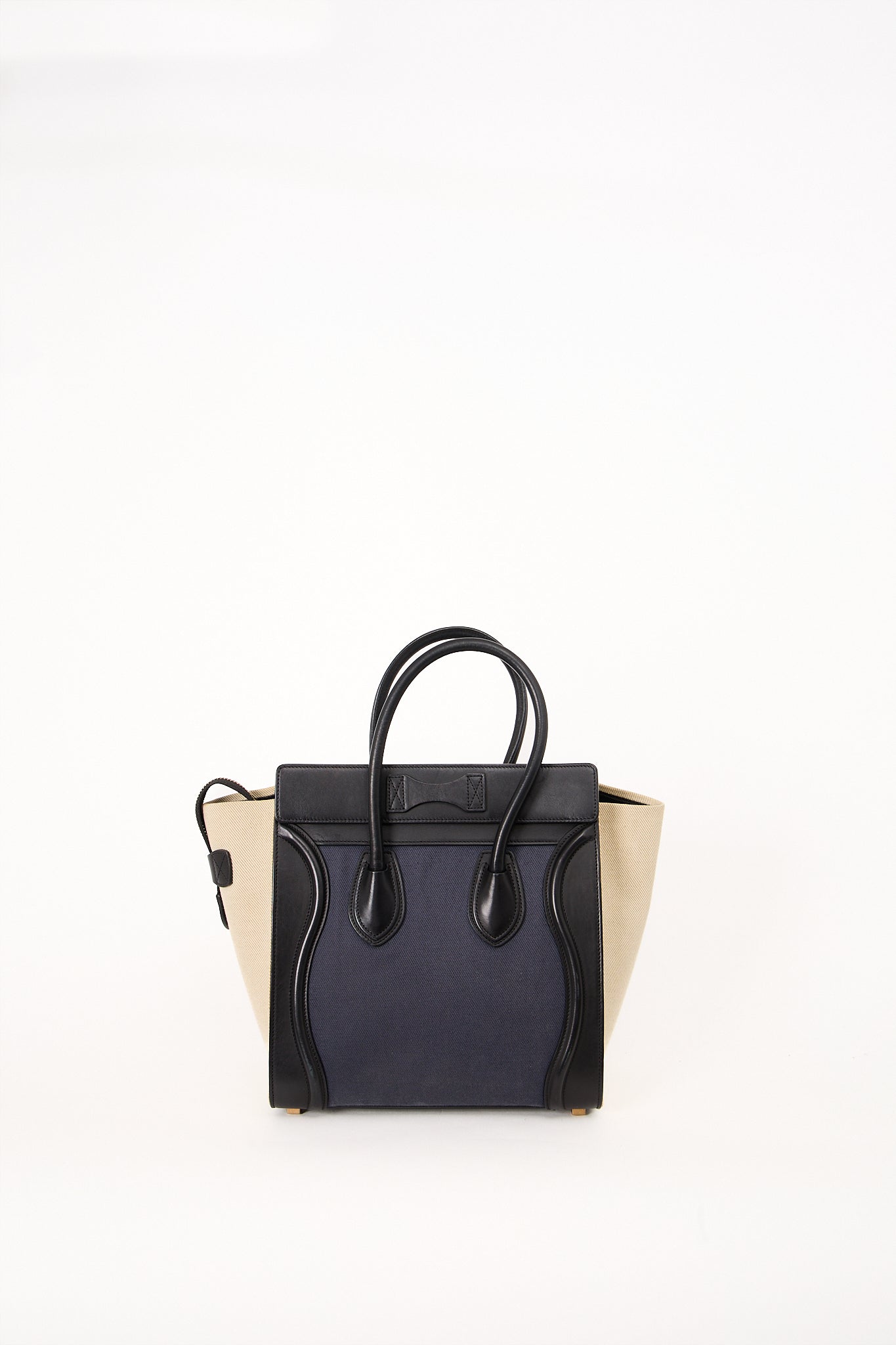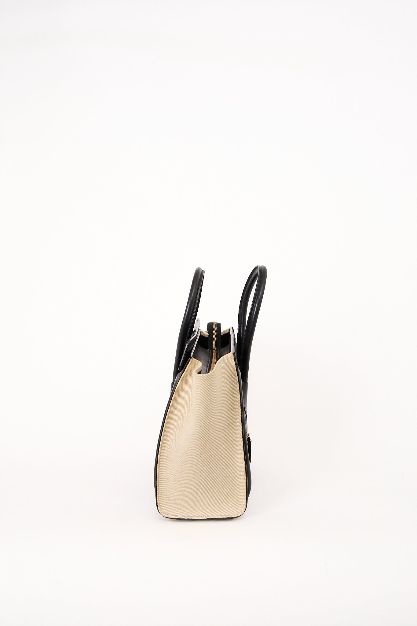 Céline Luggage Tote er en moderne klassiker og en af modehusets mest ikoniske modeller. Tasken er udført i en elegant kombination af sort og beige med blå ruskindsdetaljer, og har den karakteristiske frontlynlås og buede syninger. Et luksuriøst design, der kombinerer funktionalitet og sofistikeret stil – perfekt til både hverdag og aften.