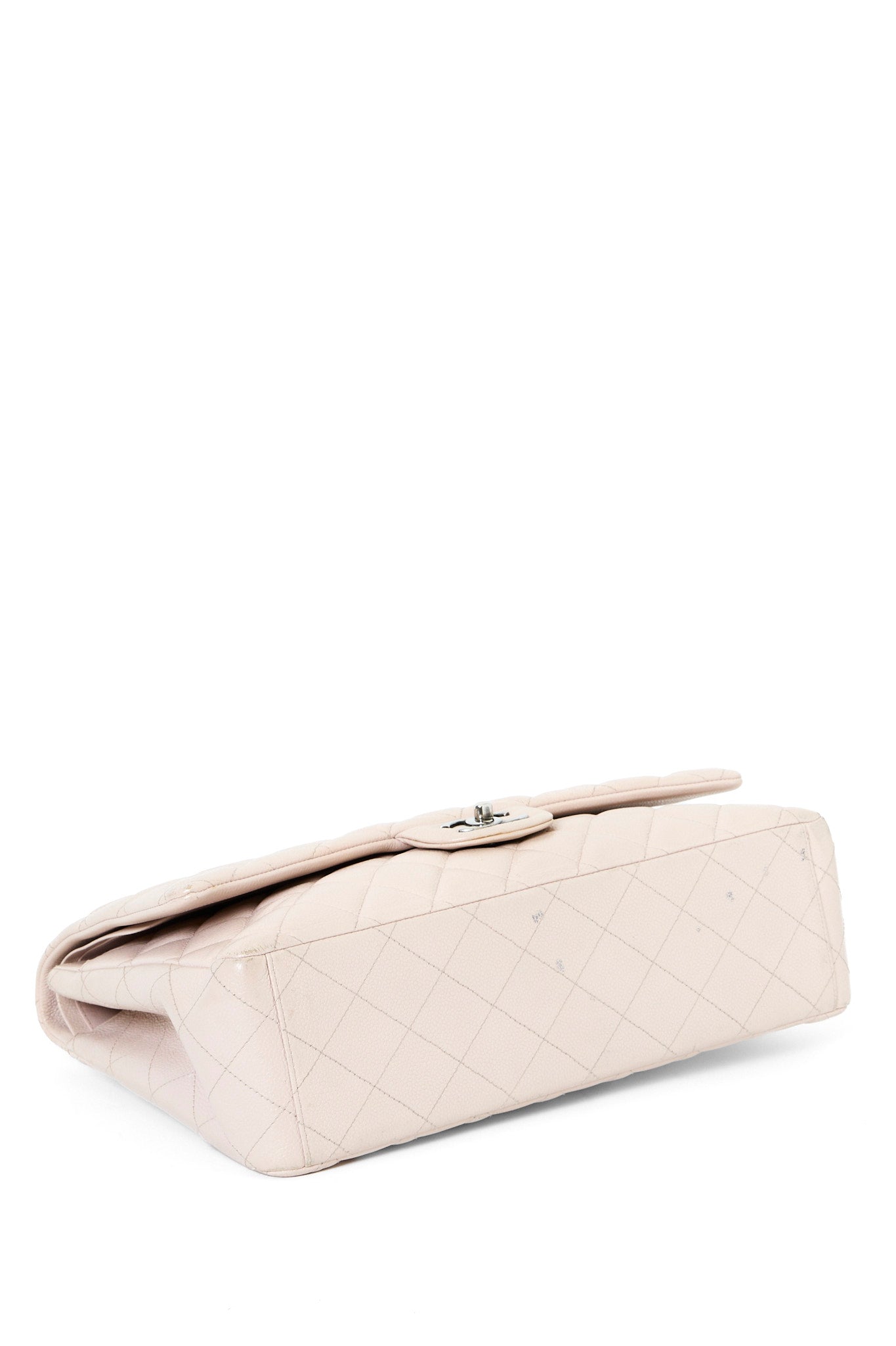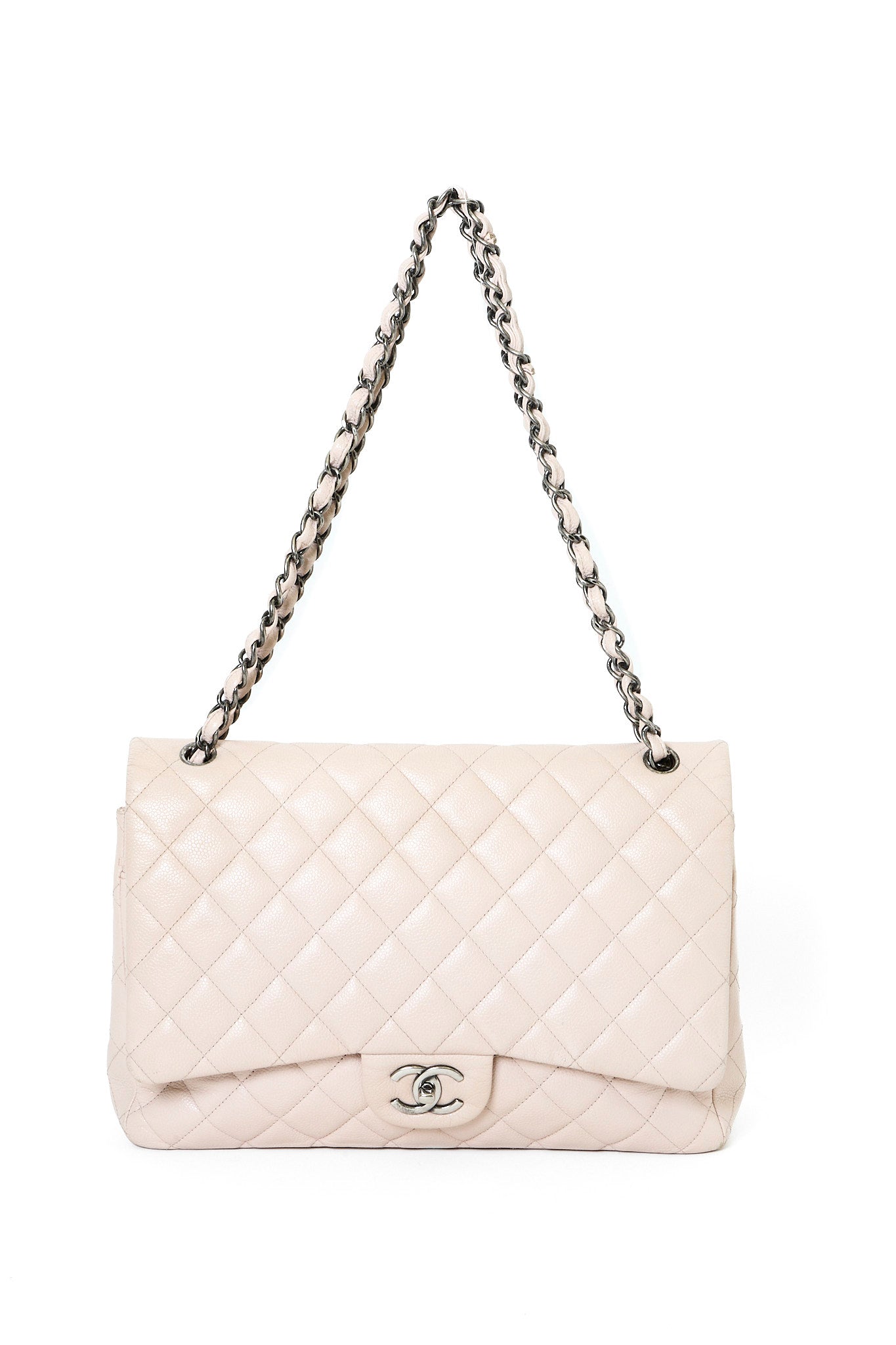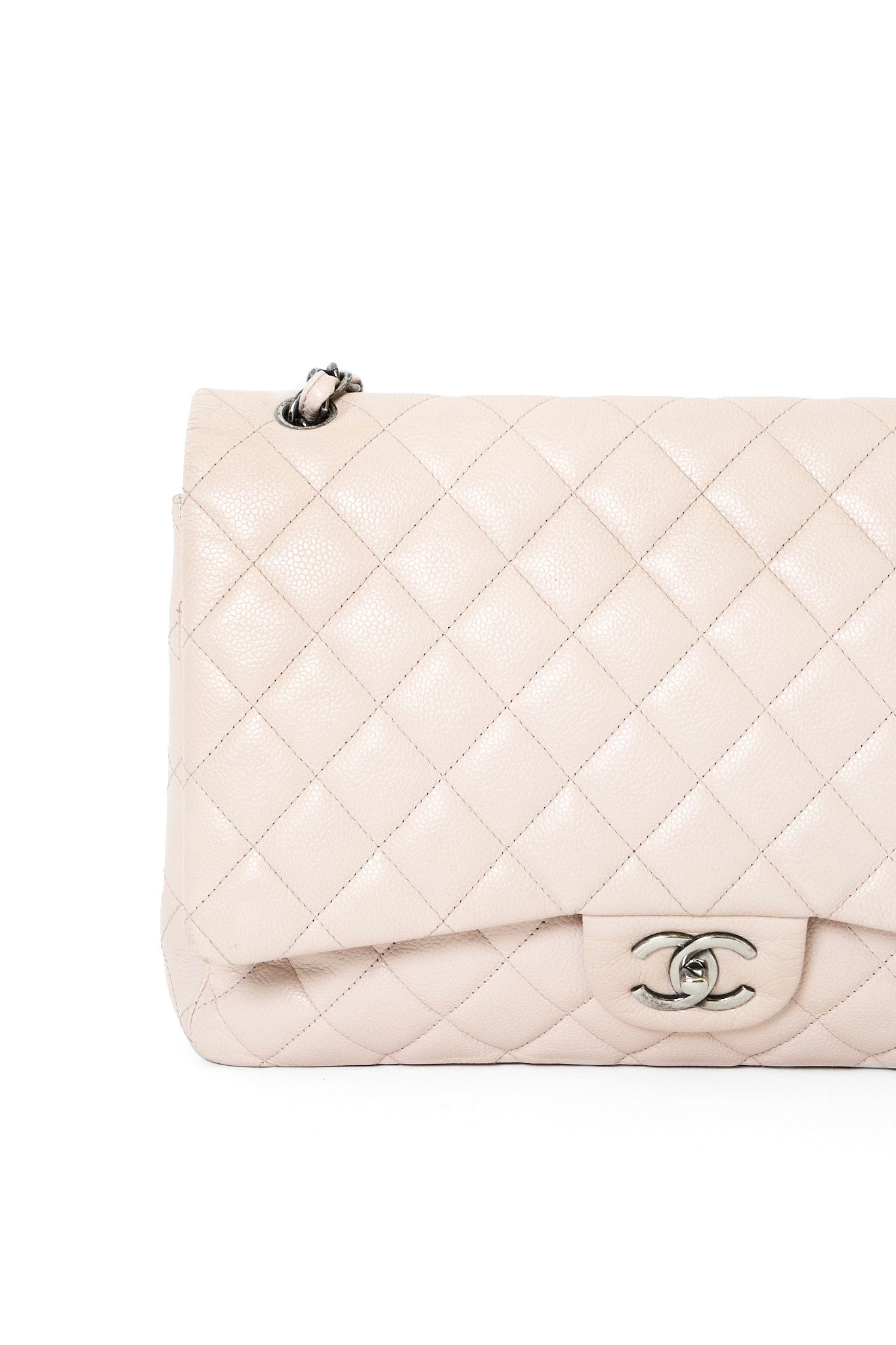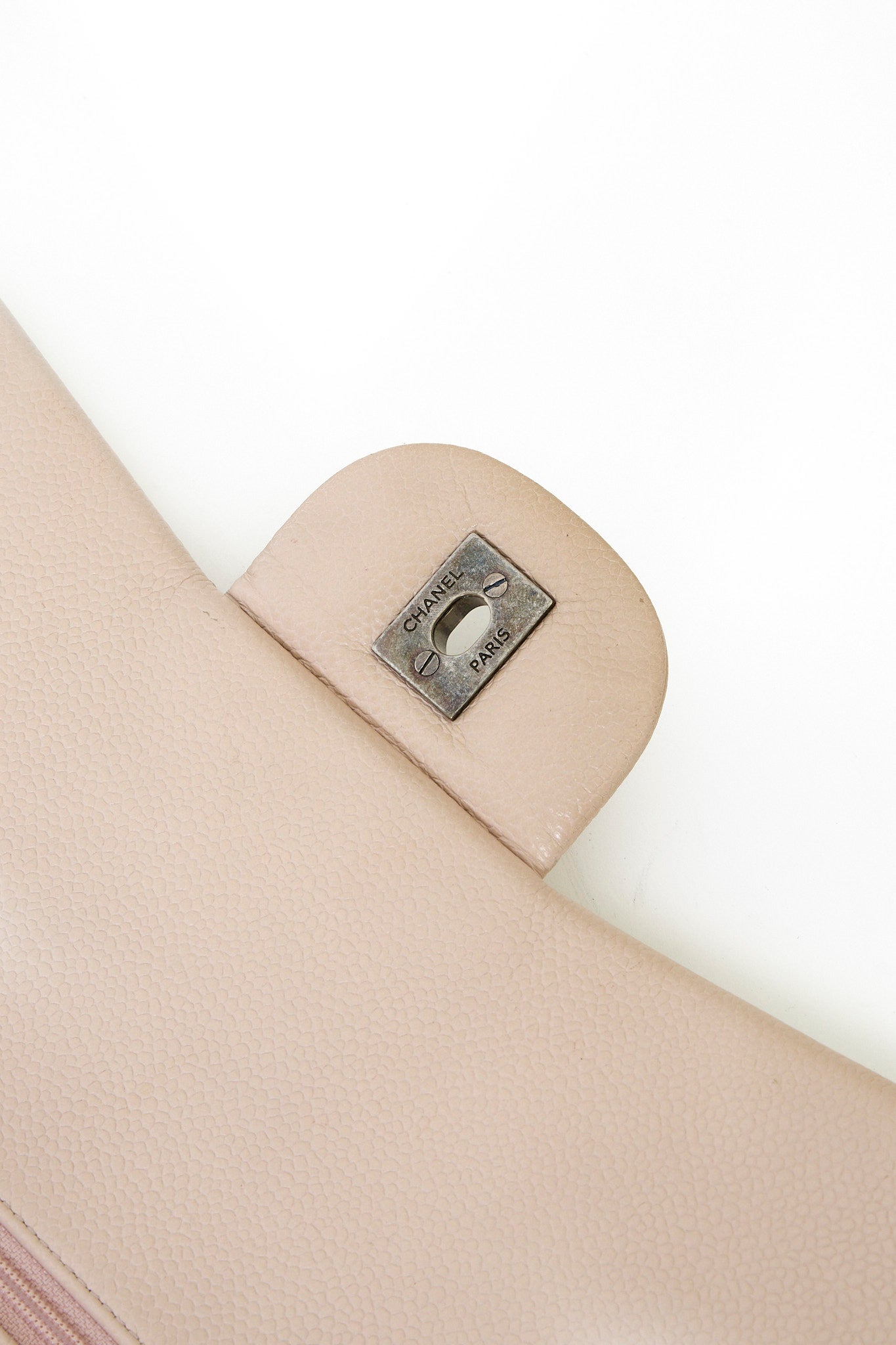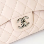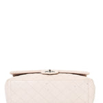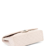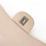 Chanel Classic Jumbo Flapbag i beige læder med sølv hardware - et tidløst ikon, der kombinerer luksus, funktionalitet og uovertruffen håndværk. Denne version er udført i beige læder med sølvfarvet hardware og Chanels klassiske double flap-lukning. Den quiltede overflade og den læderflettede kæderem tilfører et sofistikeret og feminint udtryk, som passer til enhver anledning.