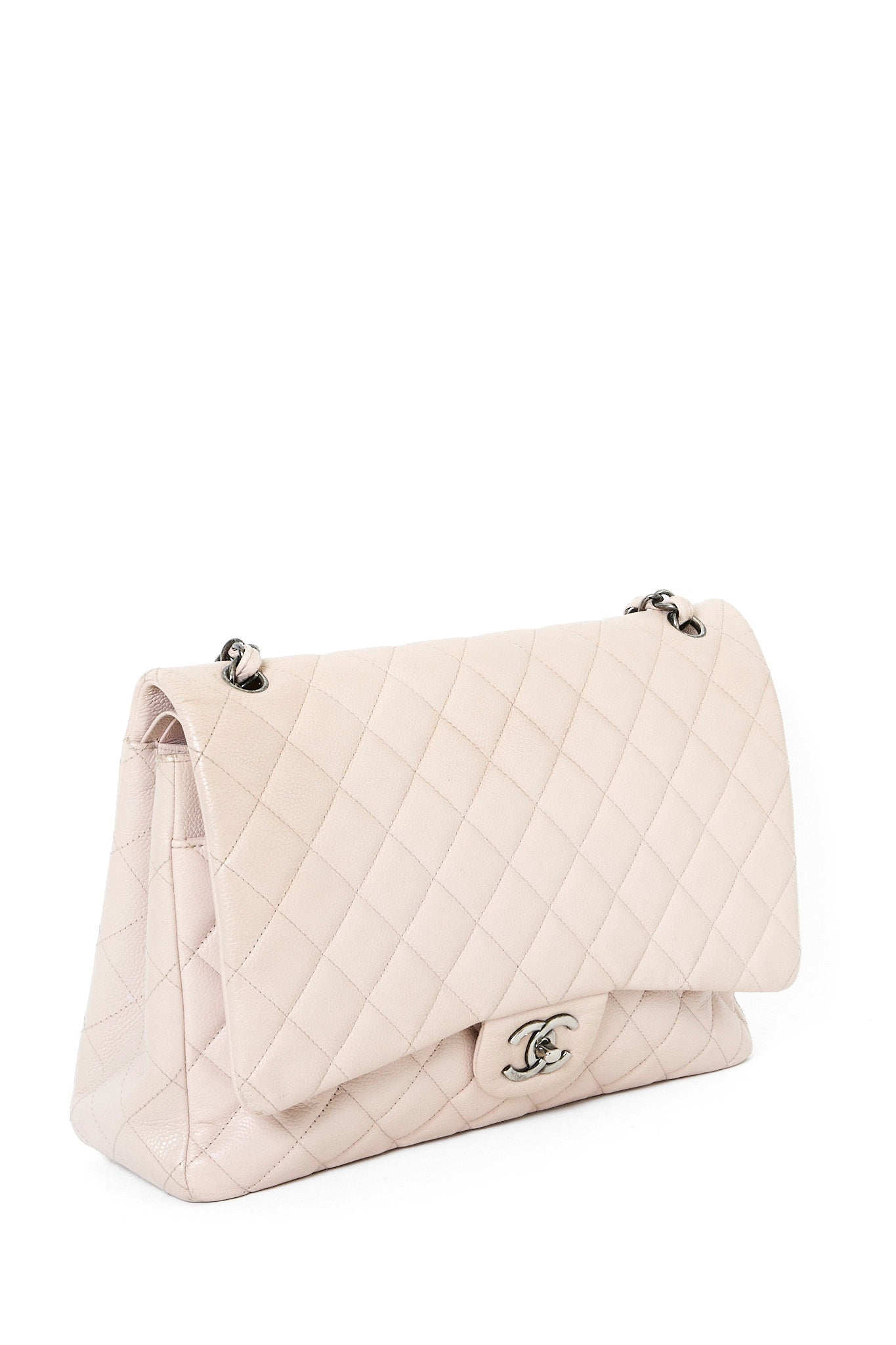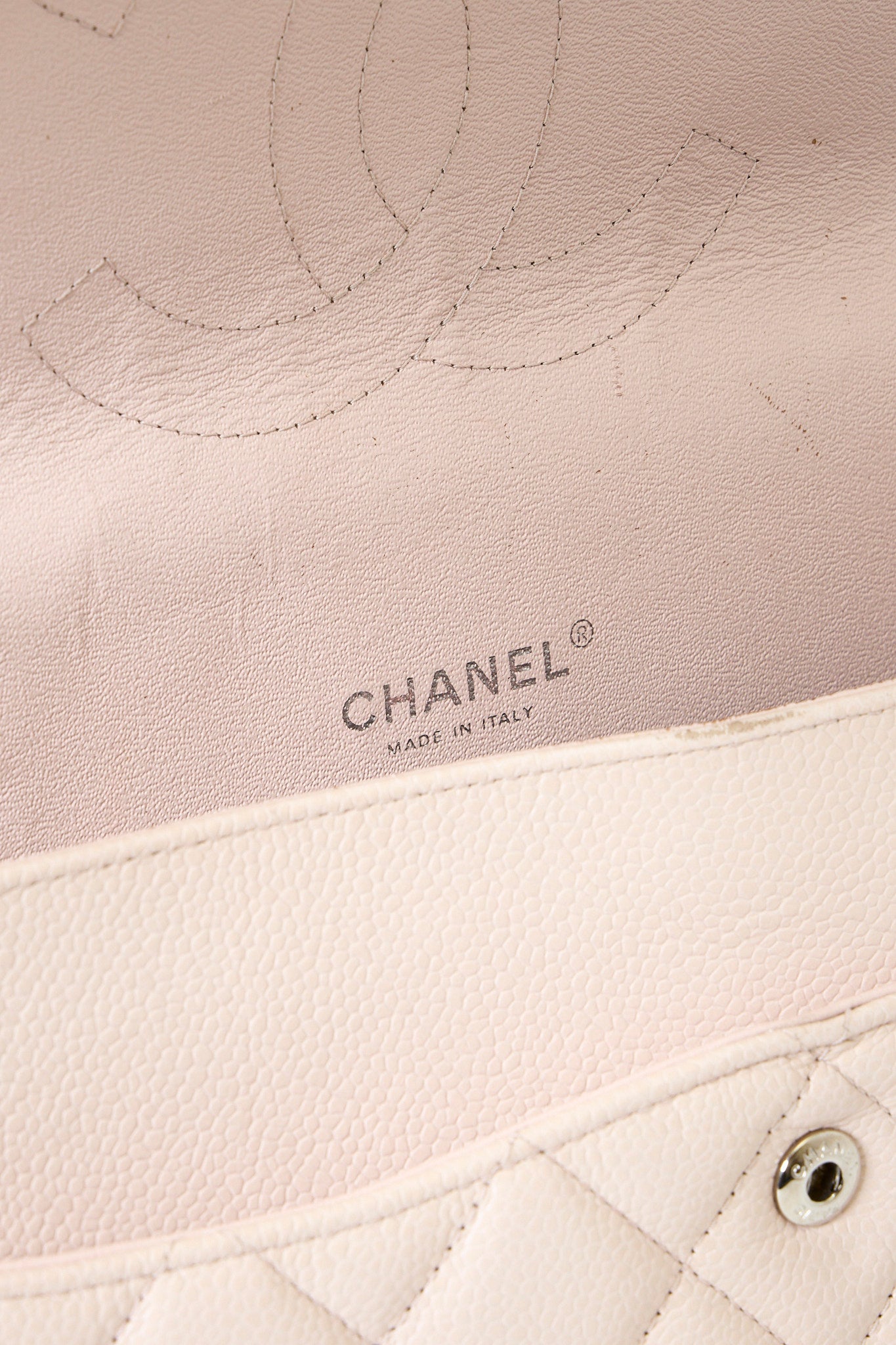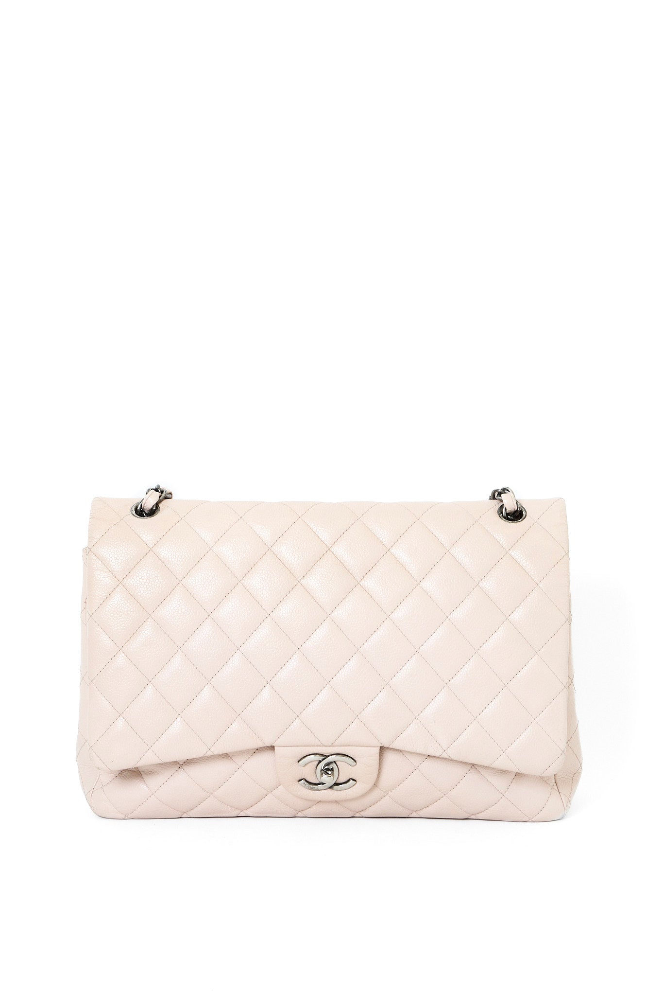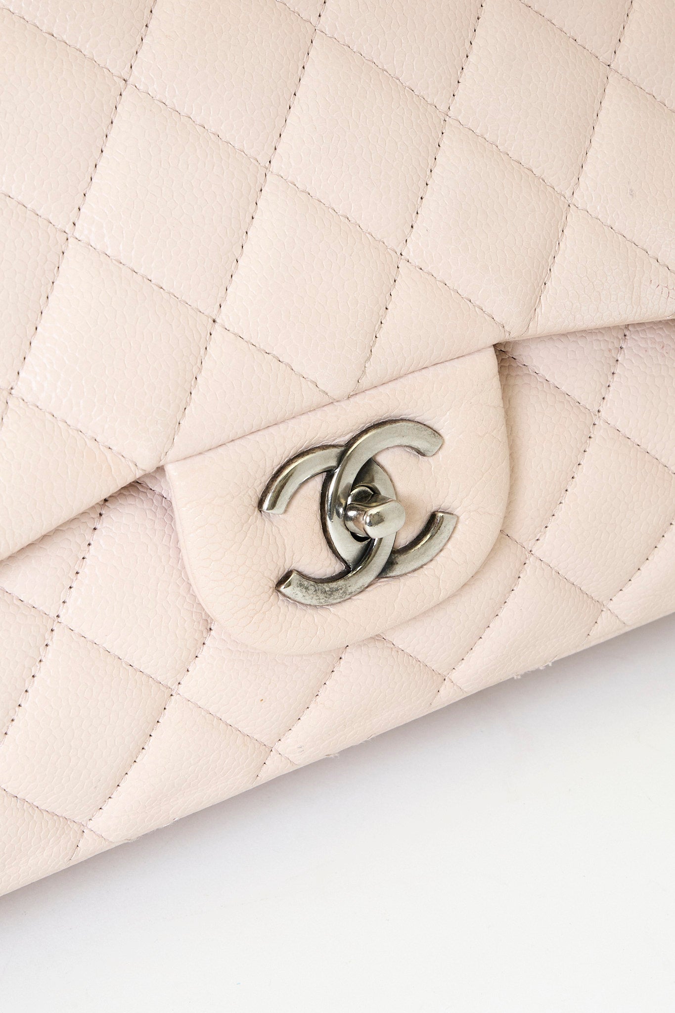 Chanel Classic Jumbo Flapbag i beige læder med sølv hardware - et tidløst ikon, der kombinerer luksus, funktionalitet og uovertruffen håndværk. Denne version er udført i beige læder med sølvfarvet hardware og Chanels klassiske double flap-lukning. Den quiltede overflade og den læderflettede kæderem tilfører et sofistikeret og feminint udtryk, som passer til enhver anledning.