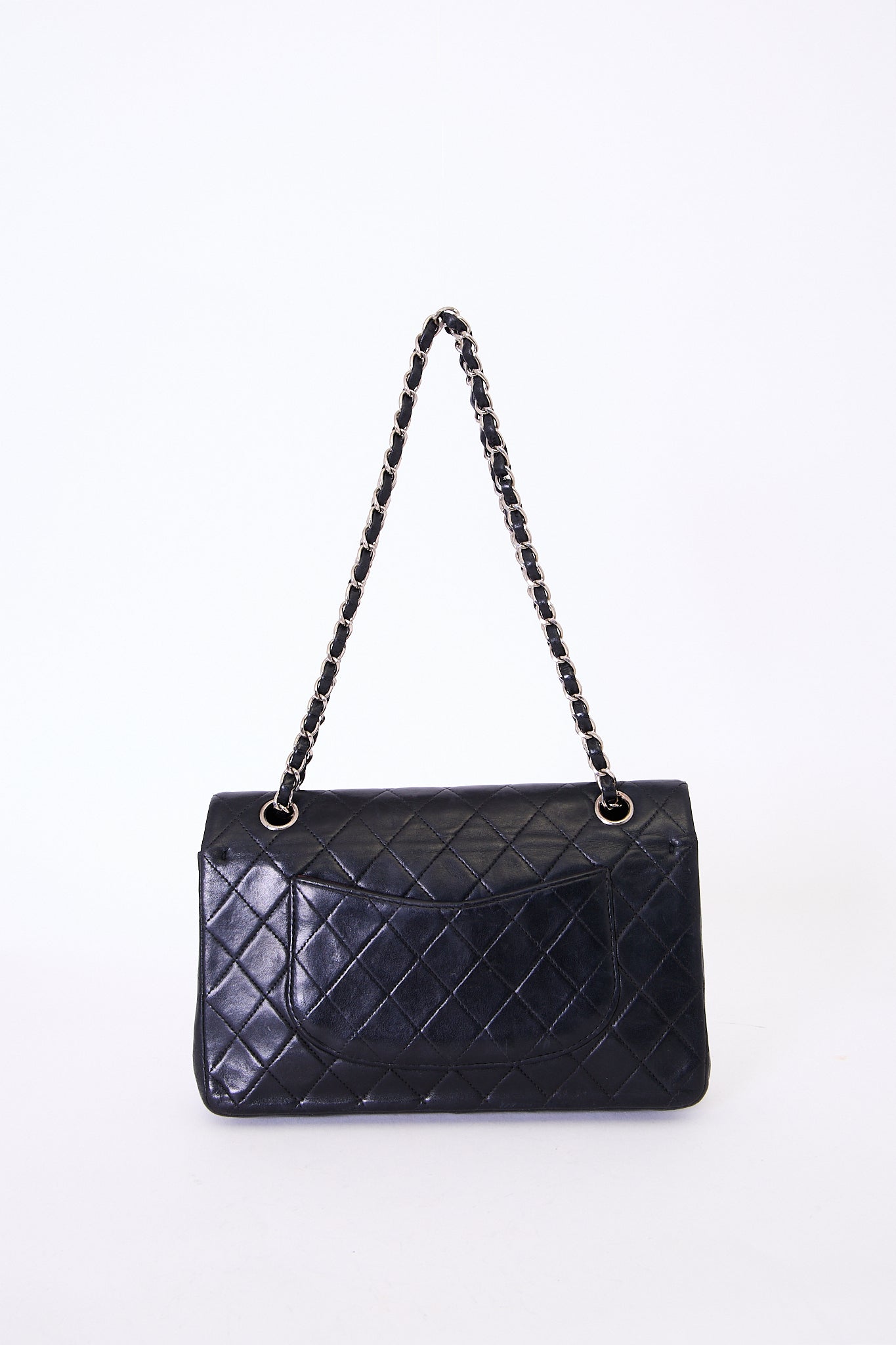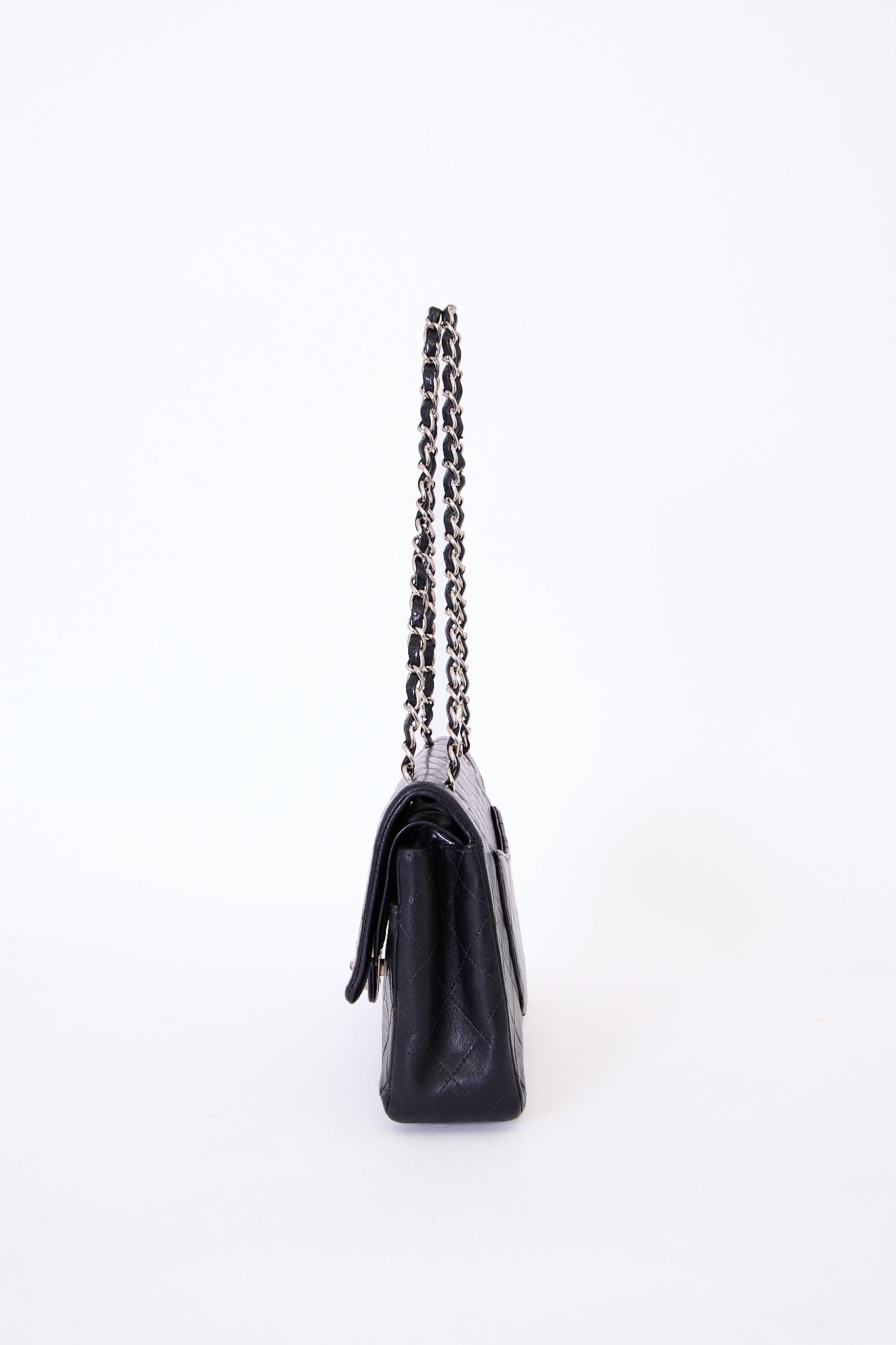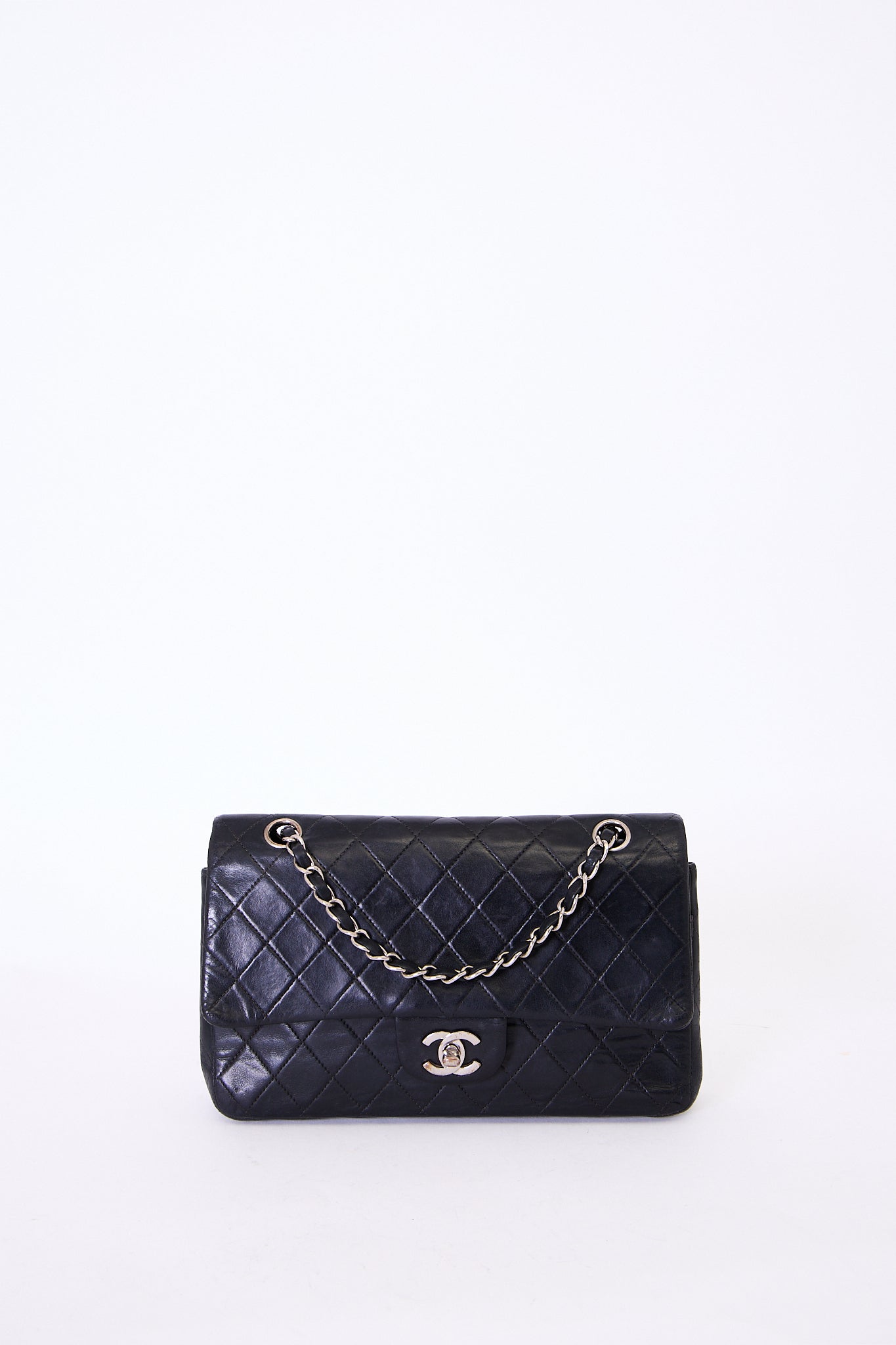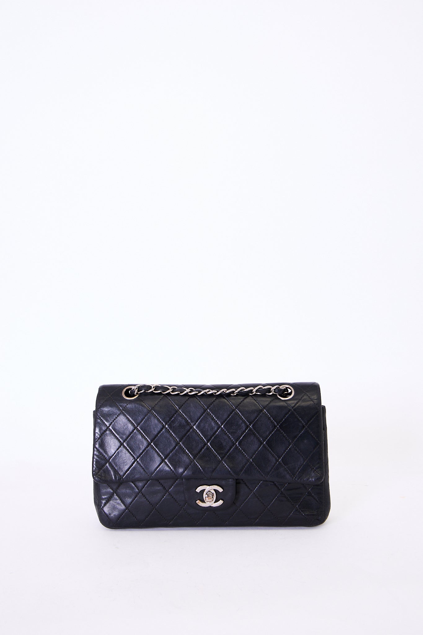 Den ikoniske Chanel Classic Double Flapbag i blødt sort lammeskind med sølvfarvet hardware - et evigt symbol på elegance og parisisk luksus. Tasken har det klassiske quiltede mønster, den ikoniske CC-lås og den flettede kæderem, der kan bæres både enkelt og dobbelt over skulderen. Et tidløst design, der løfter ethvert outfit og forbliver et af modeverdenens mest eftertragtede tasker.