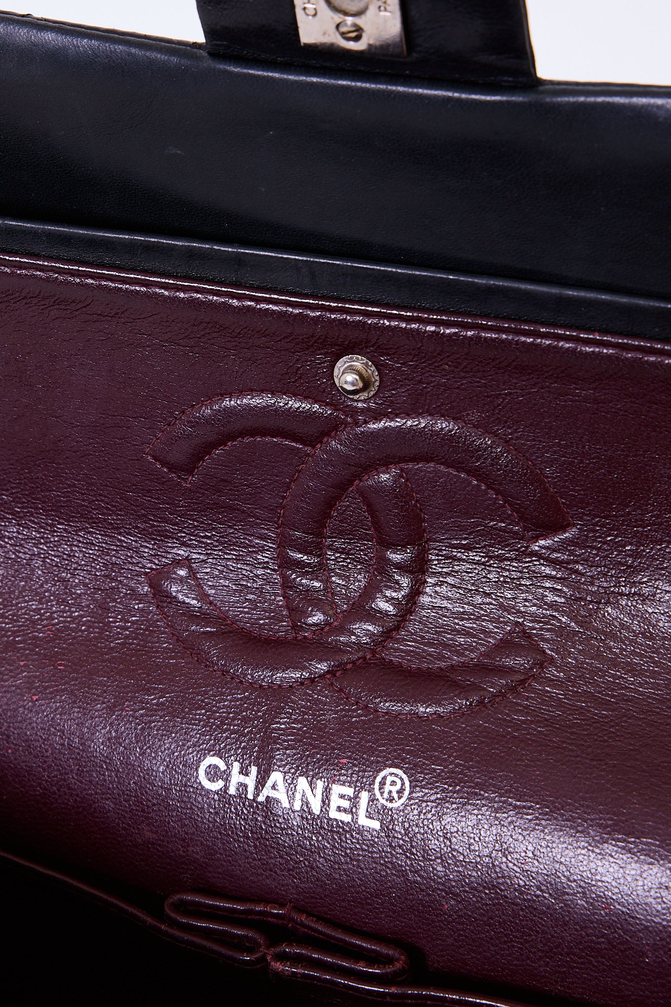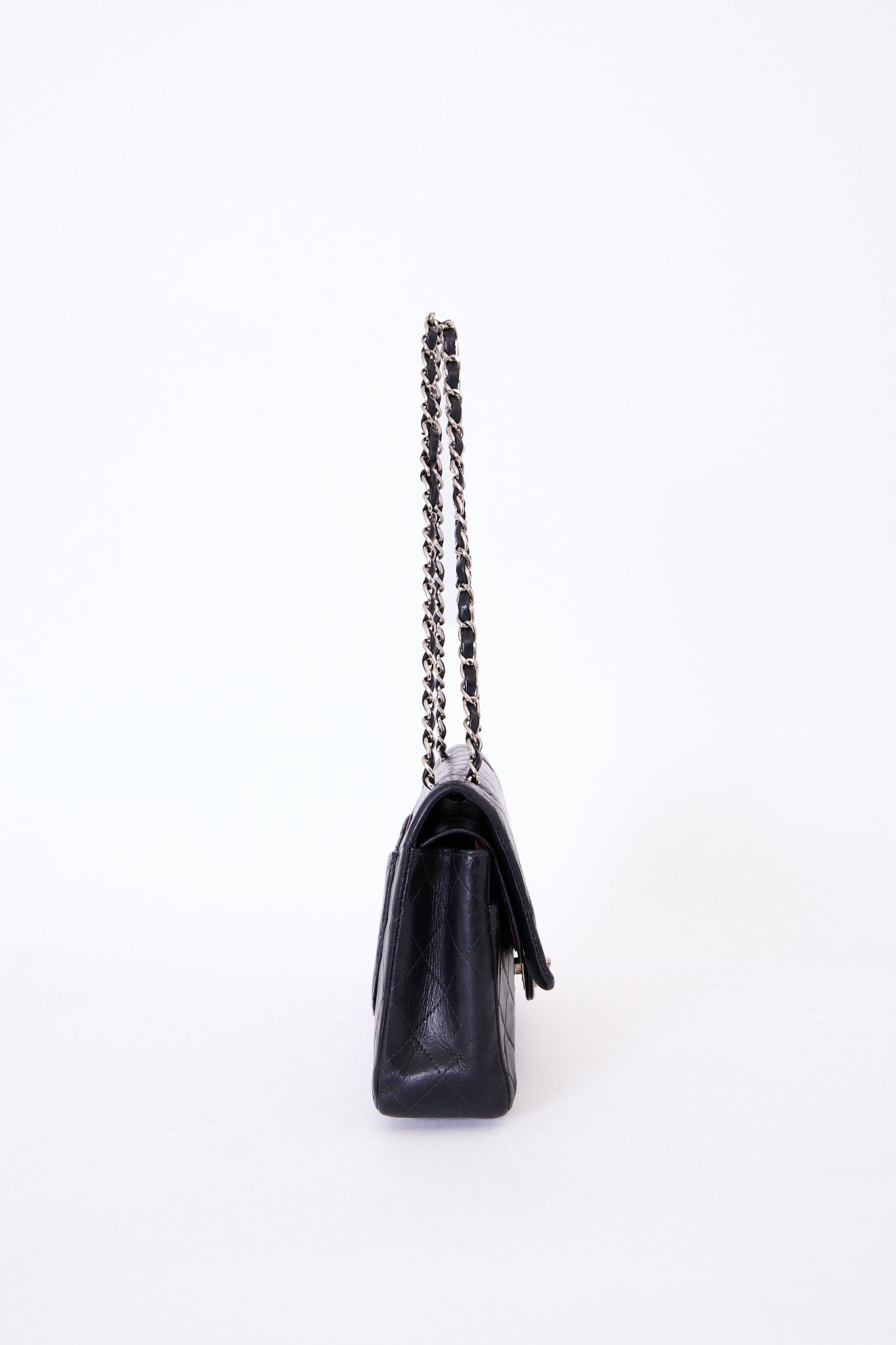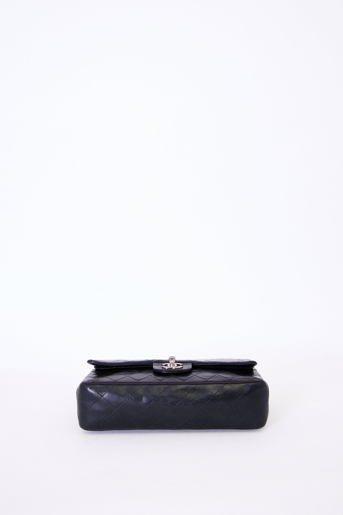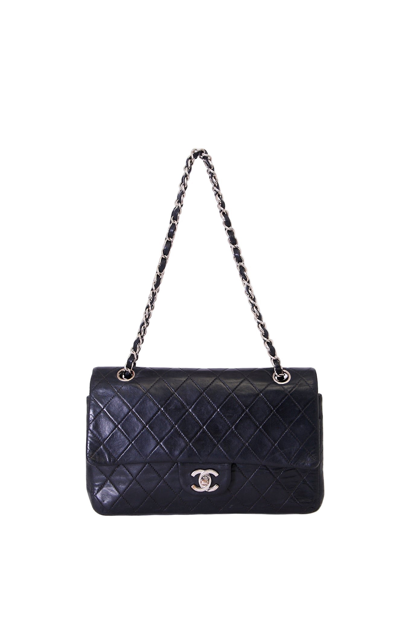 Den ikoniske Chanel Classic Double Flapbag i blødt sort lammeskind med sølvfarvet hardware - et evigt symbol på elegance og parisisk luksus. Tasken har det klassiske quiltede mønster, den ikoniske CC-lås og den flettede kæderem, der kan bæres både enkelt og dobbelt over skulderen. Et tidløst design, der løfter ethvert outfit og forbliver et af modeverdenens mest eftertragtede tasker.