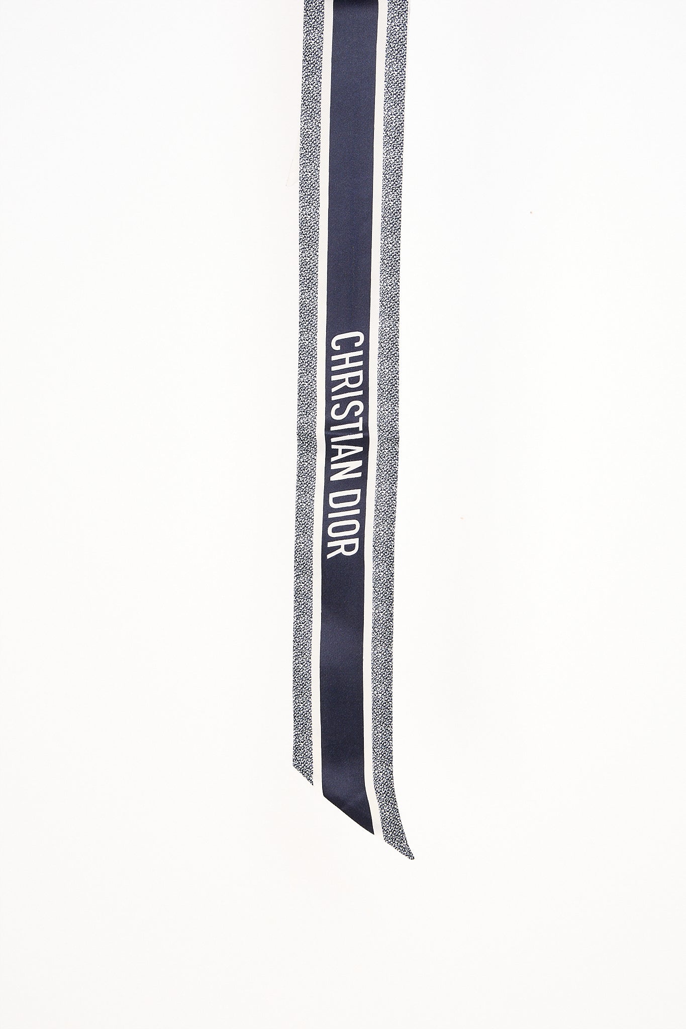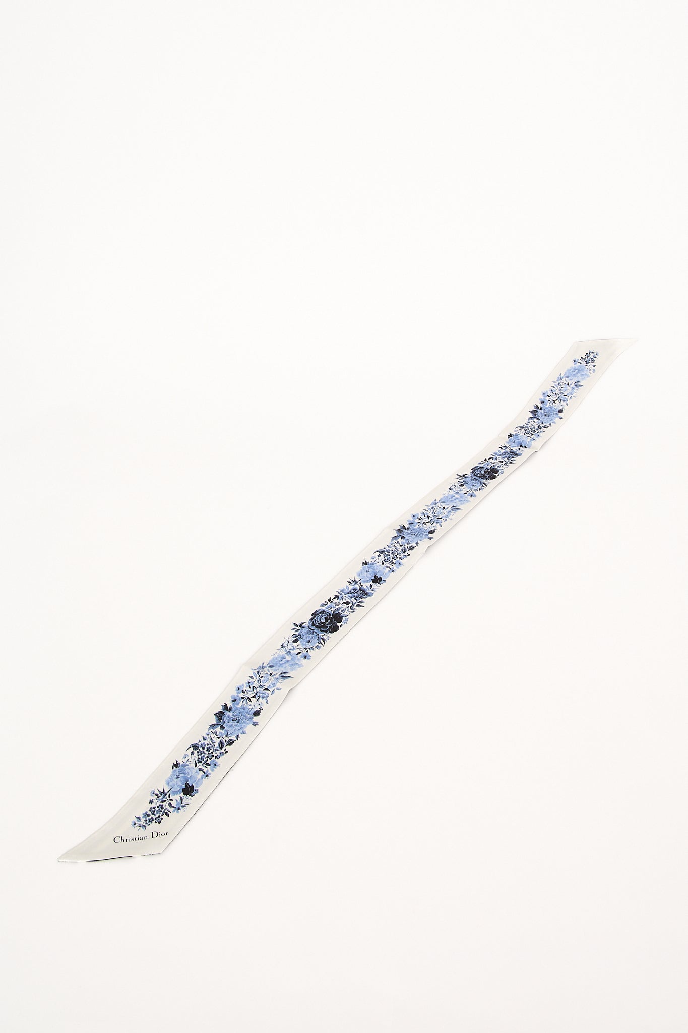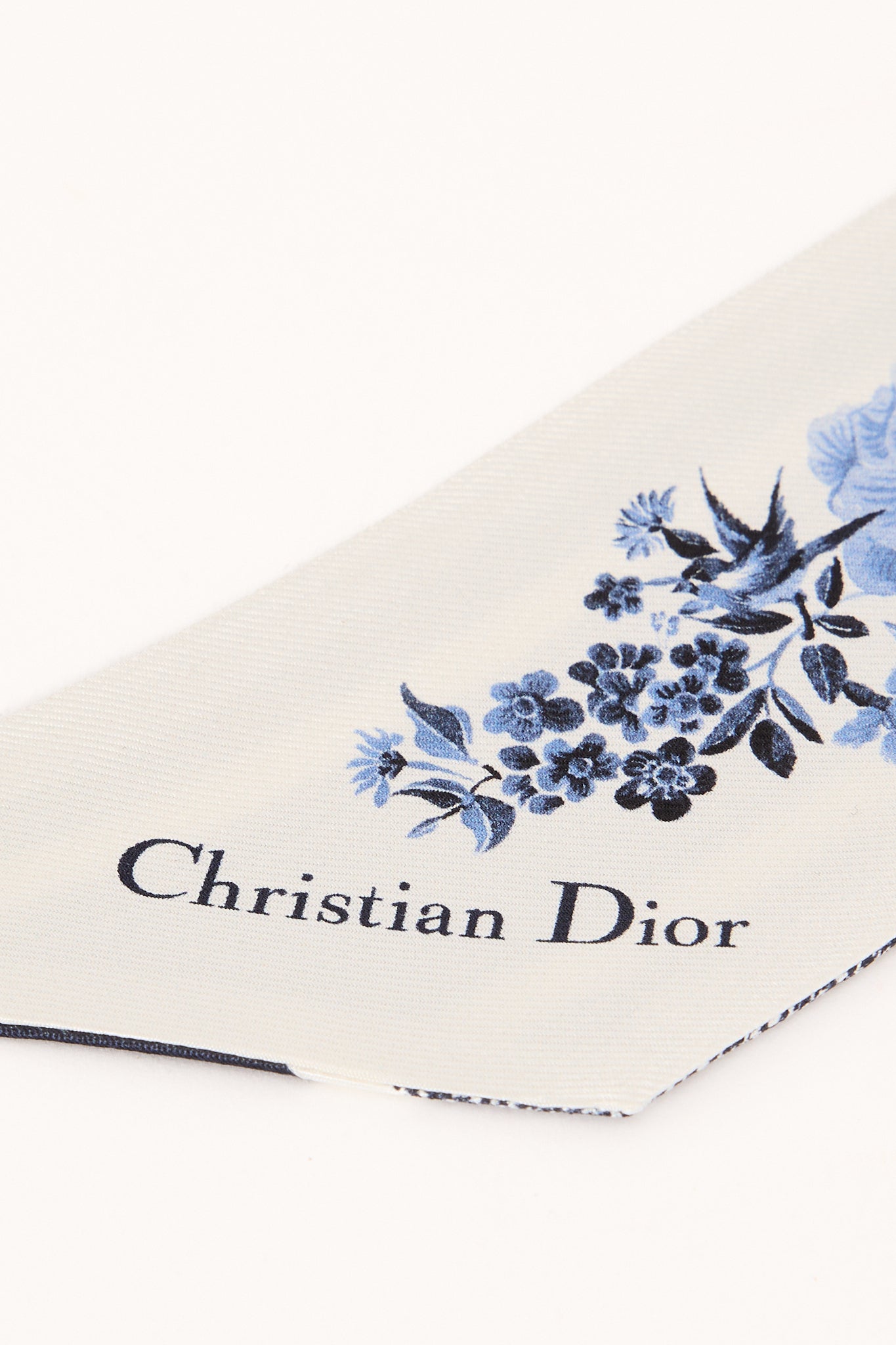Raffineret Christian Dior silk twilly i klassisk navy og hvid med smukt blomstermotiv. Den ene side prydes af blå florale detaljer, mens den anden side har det ikoniske “CHRISTIAN DIOR” logo i kontrastfarve. Perfekt som luksuriøst touch til hår, håndled eller taske.