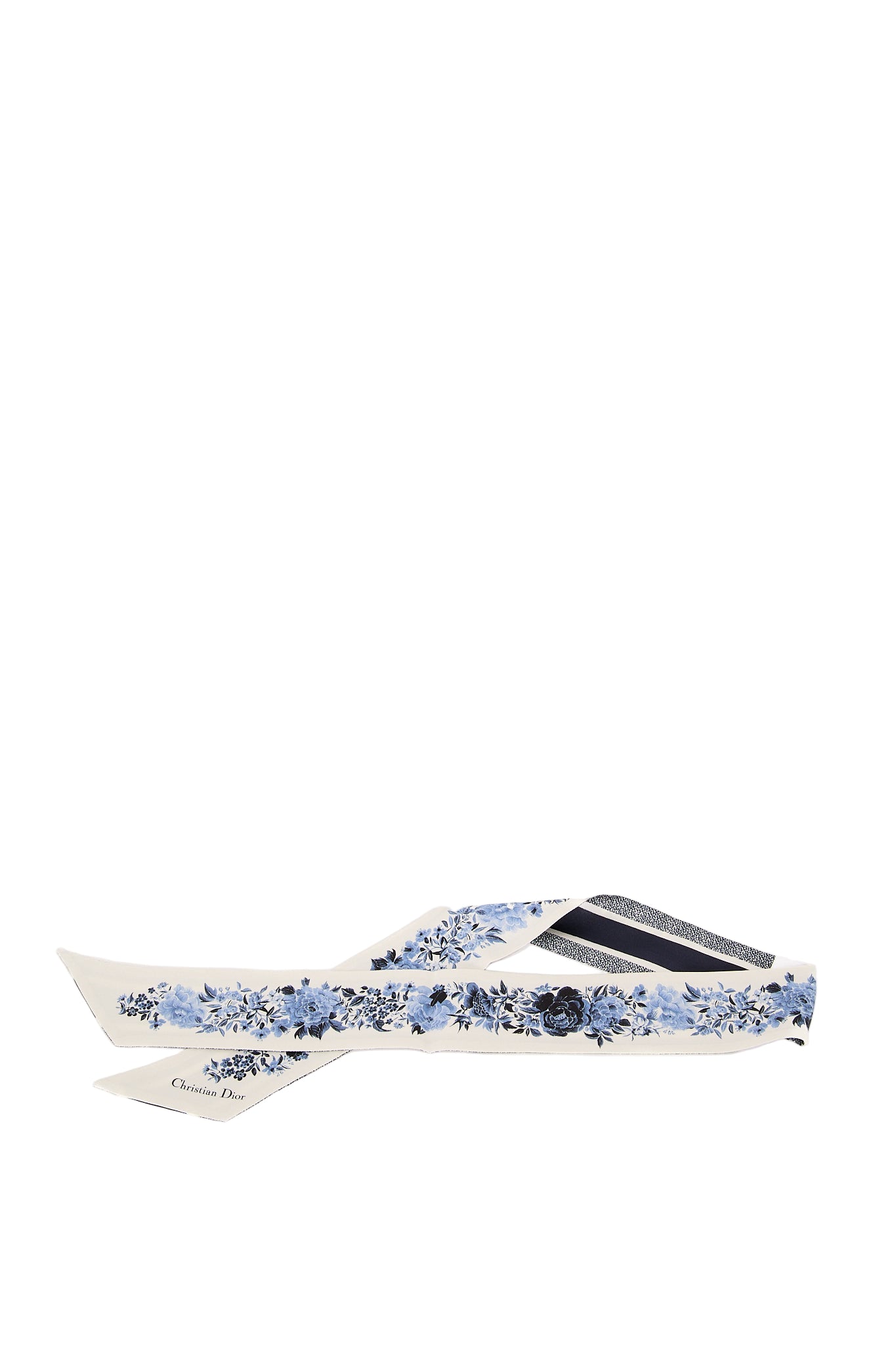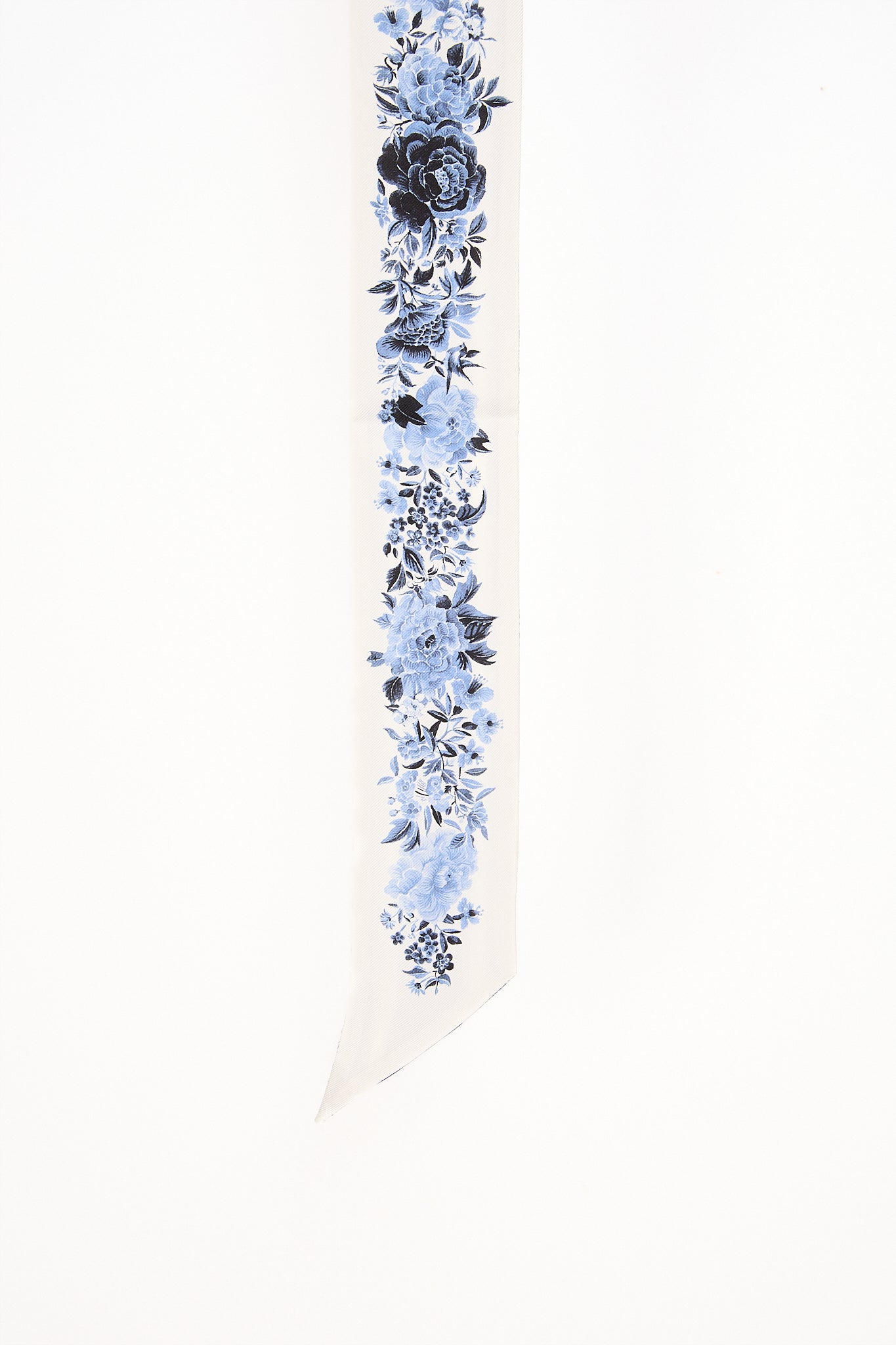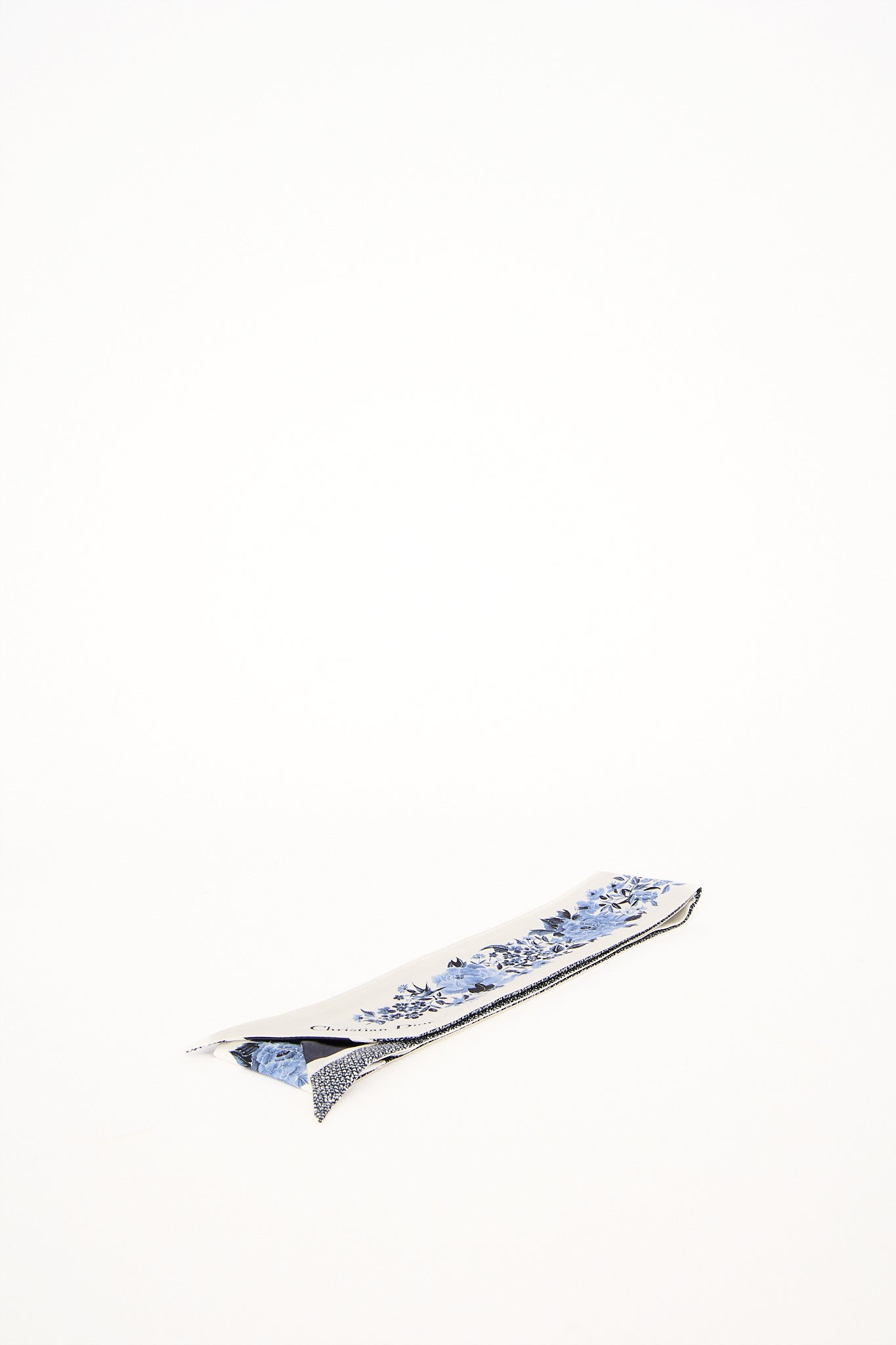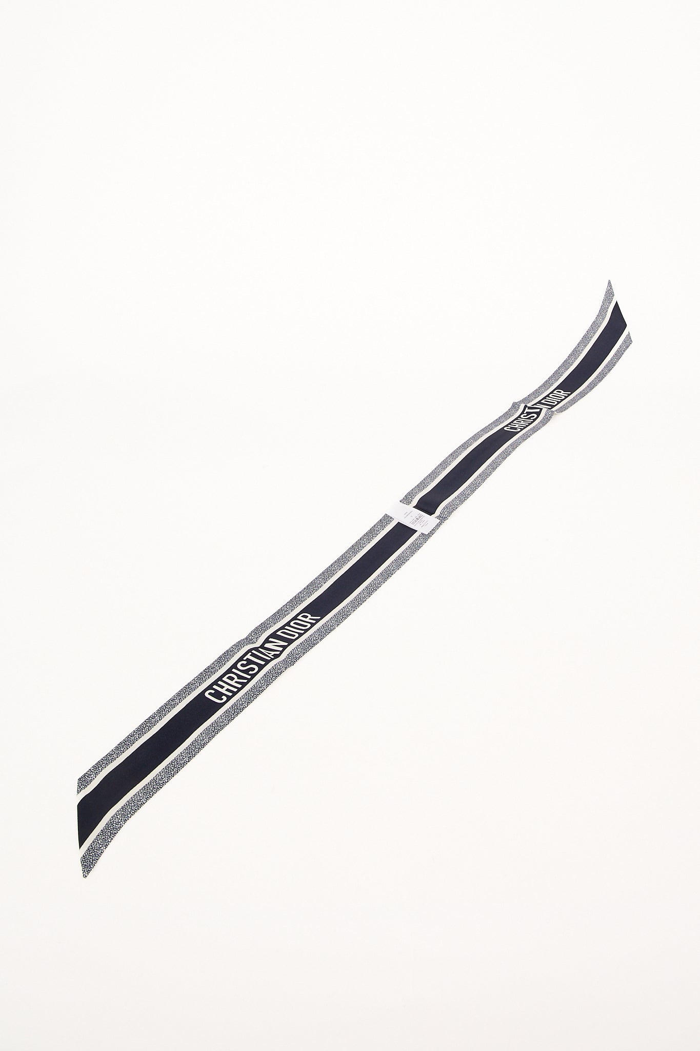 Raffineret Christian Dior silk twilly i klassisk navy og hvid med smukt blomstermotiv. Den ene side prydes af blå florale detaljer, mens den anden side har det ikoniske “CHRISTIAN DIOR” logo i kontrastfarve. Perfekt som luksuriøst touch til hår, håndled eller taske.