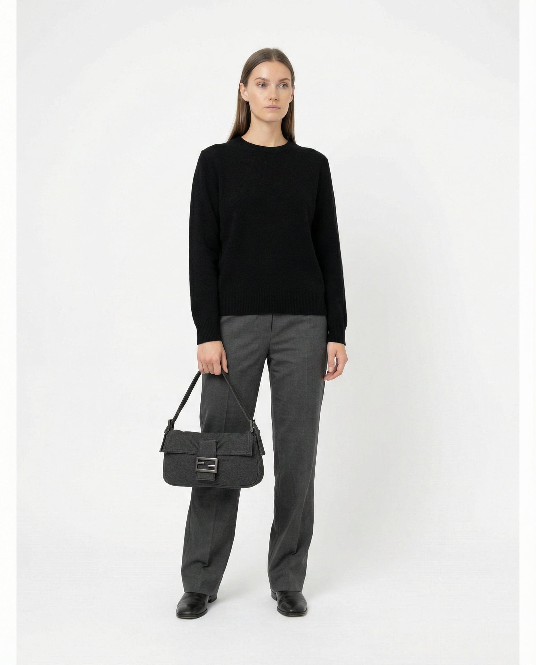 Opdag den ikoniske Fendi Baguette i en moderne og afslappet udgave. Tasken er designet i en dyb mørkegrå jersey, som giver et cool og ubesværet udtryk, perfekt til både hverdagsbrug og mere edgy styling. Den klassiske Baguette-silhuet kombineres med et tone-i-tone spænde, der giver tasken et minimalistisk og sofistikeret look.