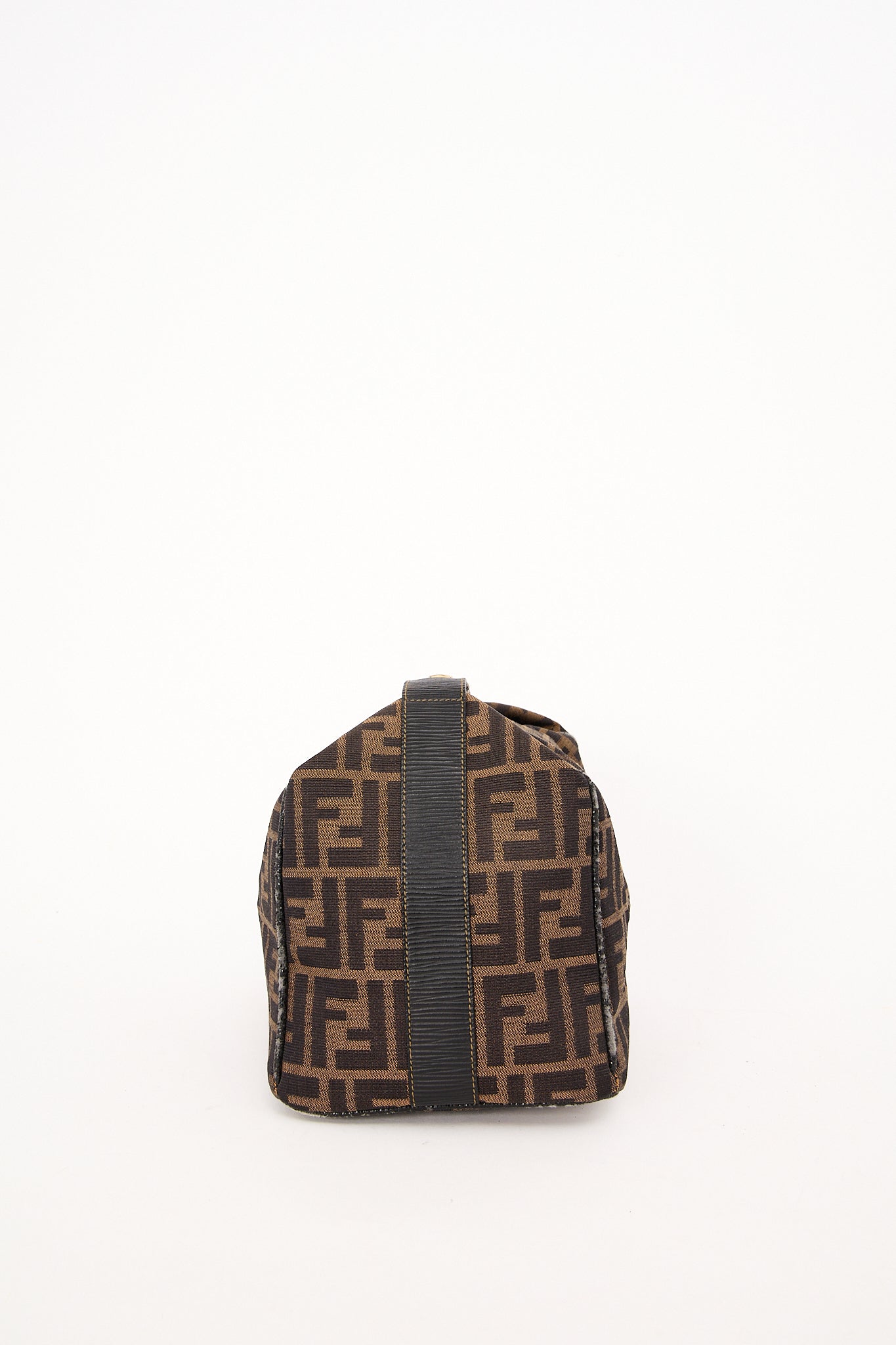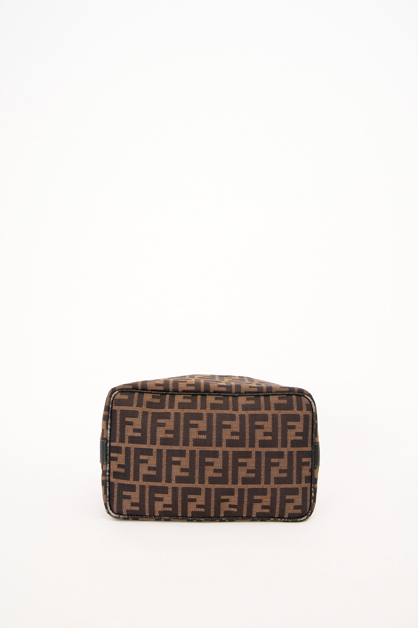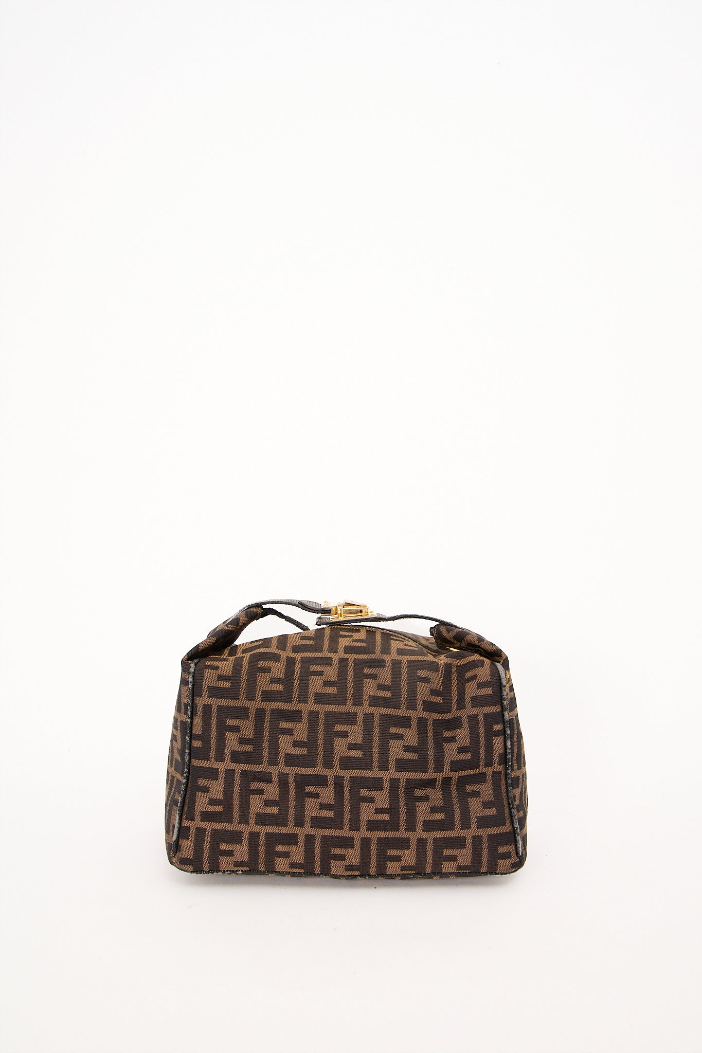 Den udsøgte FENDI Zucca Round Vanity taske har ikonisk Zucca jacquard og raffinerede læderdetaljer. Guldhardware tilføjer et eksklusivt præg, mens det rummelige indre gør den praktisk til nødvendigheder.