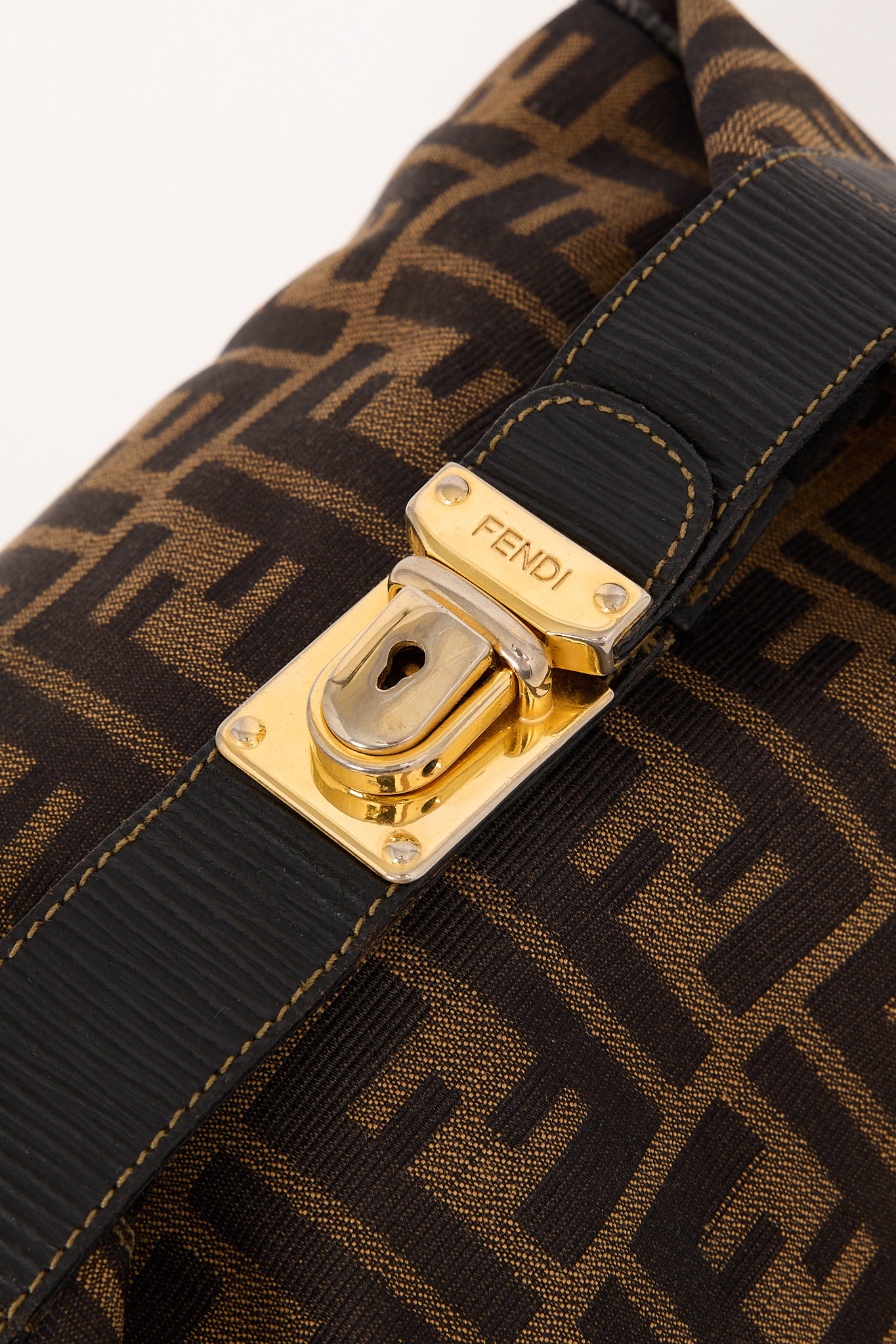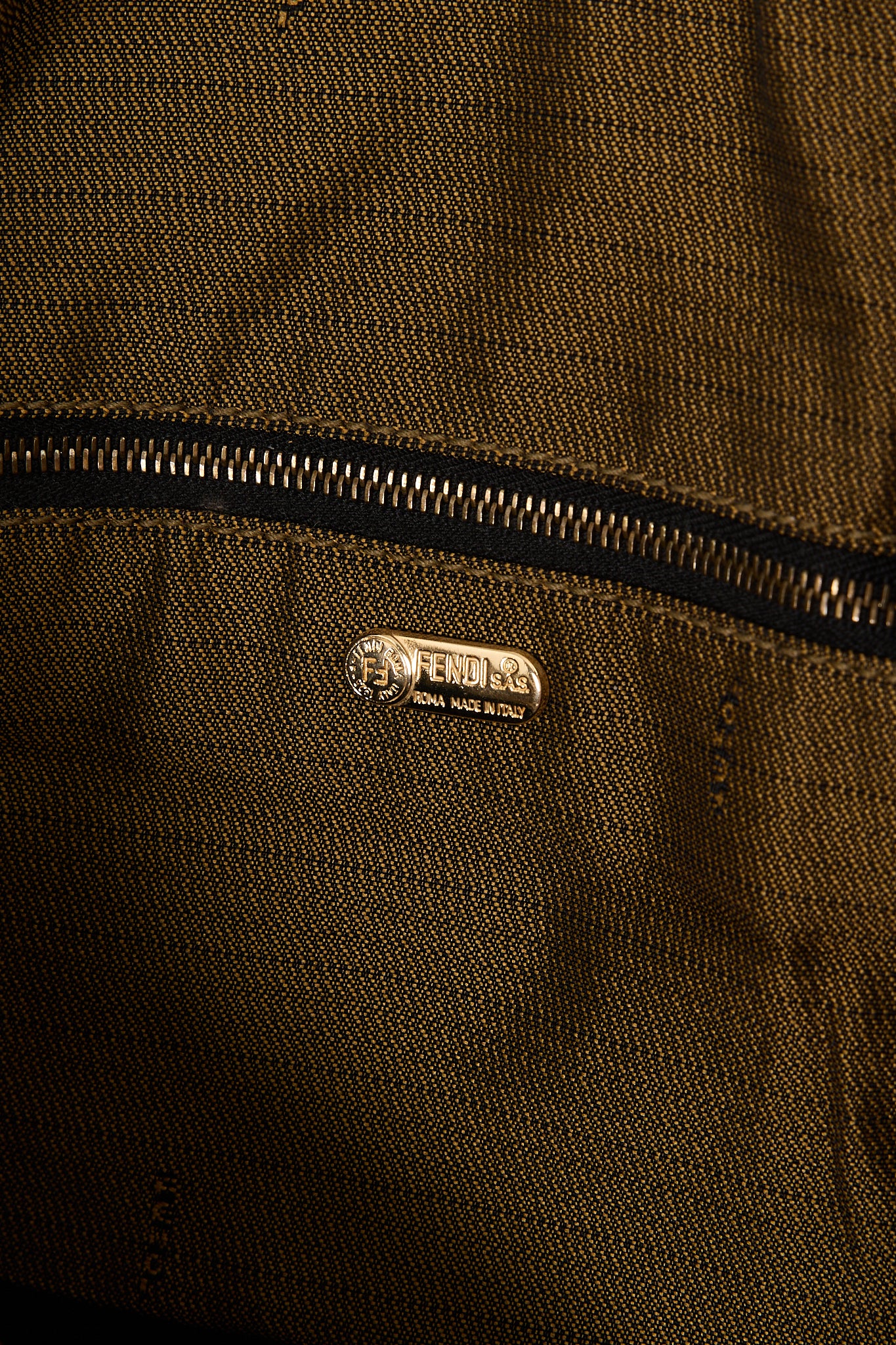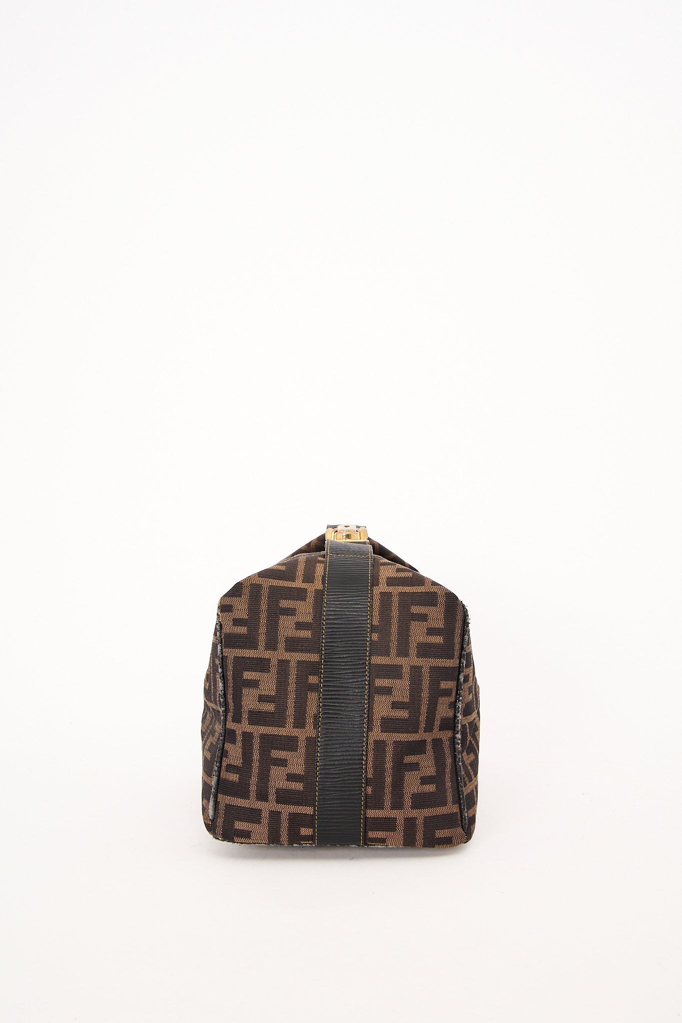 Den udsøgte FENDI Zucca Round Vanity taske har ikonisk Zucca jacquard og raffinerede læderdetaljer. Guldhardware tilføjer et eksklusivt præg, mens det rummelige indre gør den praktisk til nødvendigheder.