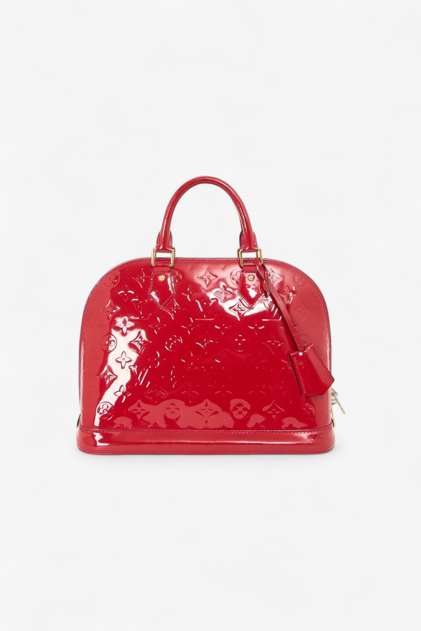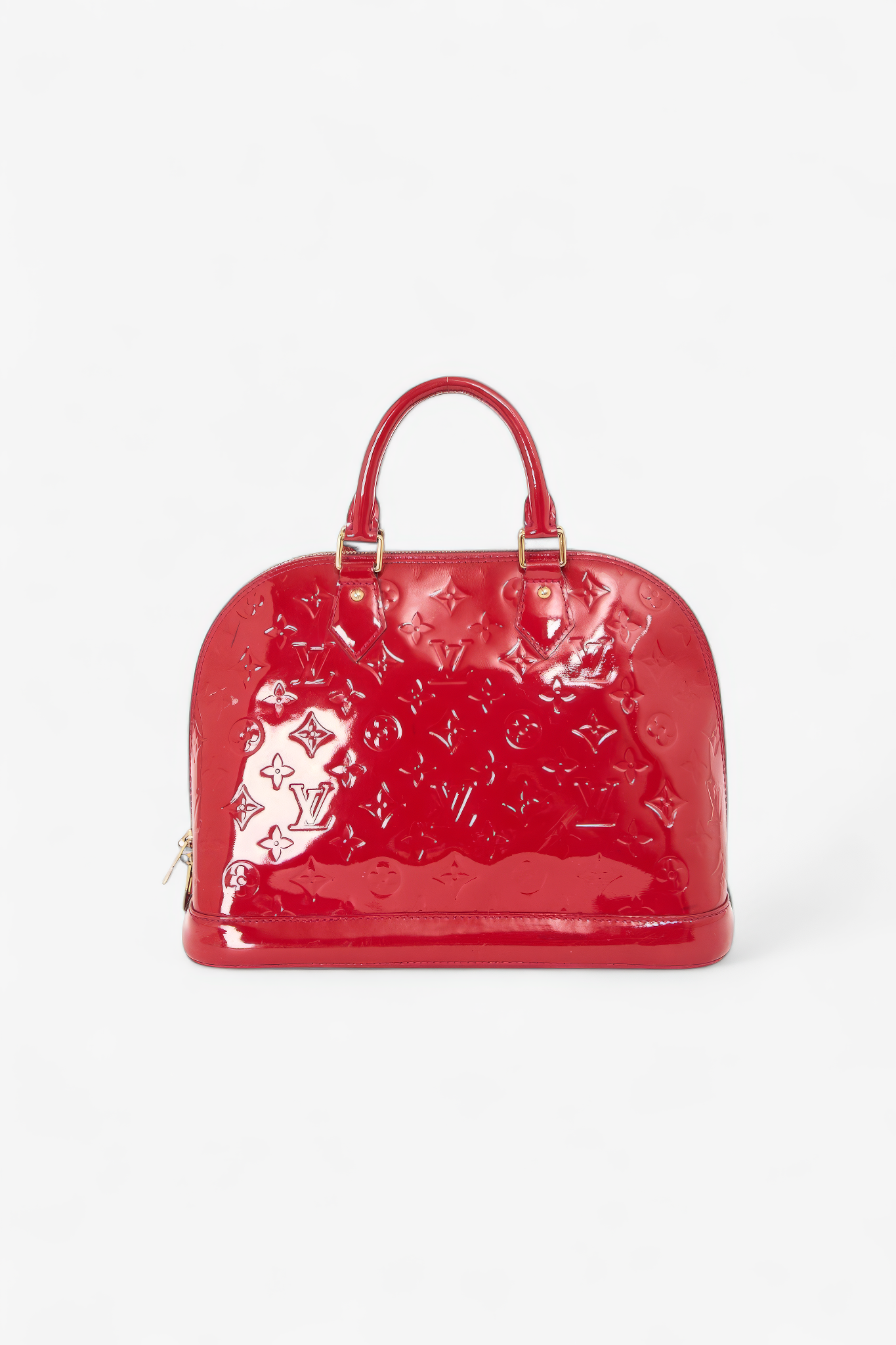 Smuk Louis Vuitton Alma PM i iøjnefaldende rød Vernis med præget monogram og guldfarvet hardware. Alma er en af Louis Vuittons mest ikoniske modeller med sin elegante kuppelform og strukturerede silhuet, der gør den perfekt til både hverdag og pænere brug. Vernis-finishen giver et luksuriøst, glossy statement-look, som virkelig løfter et outfit.