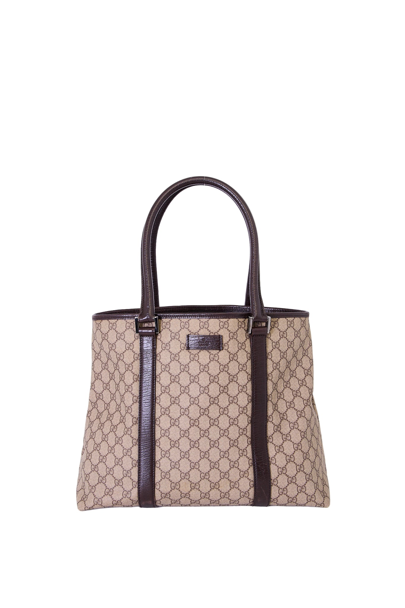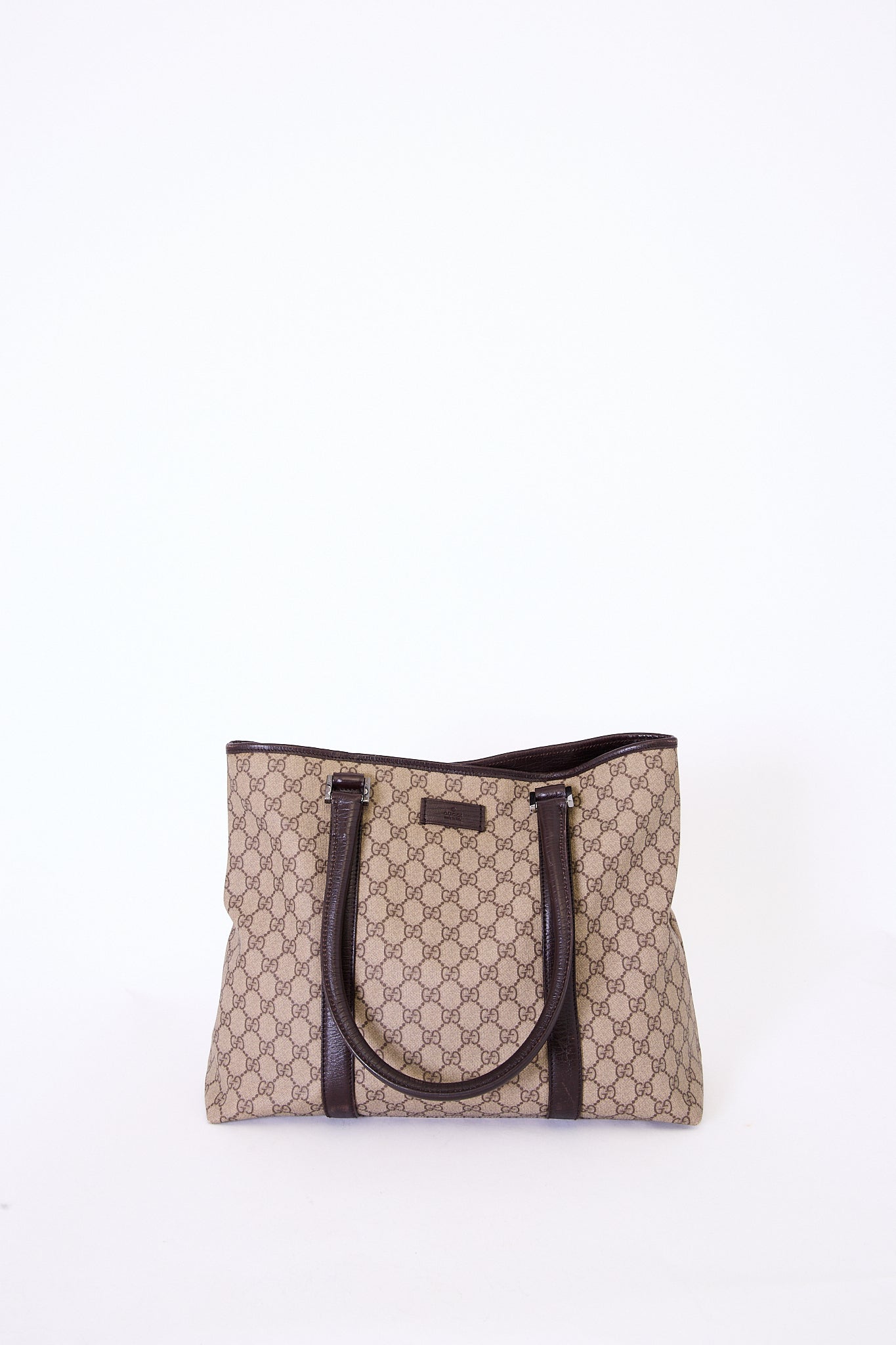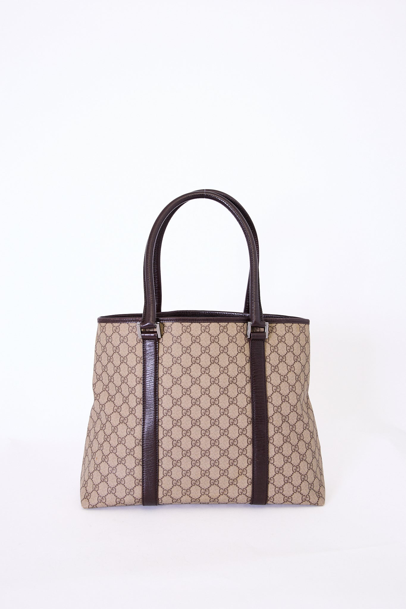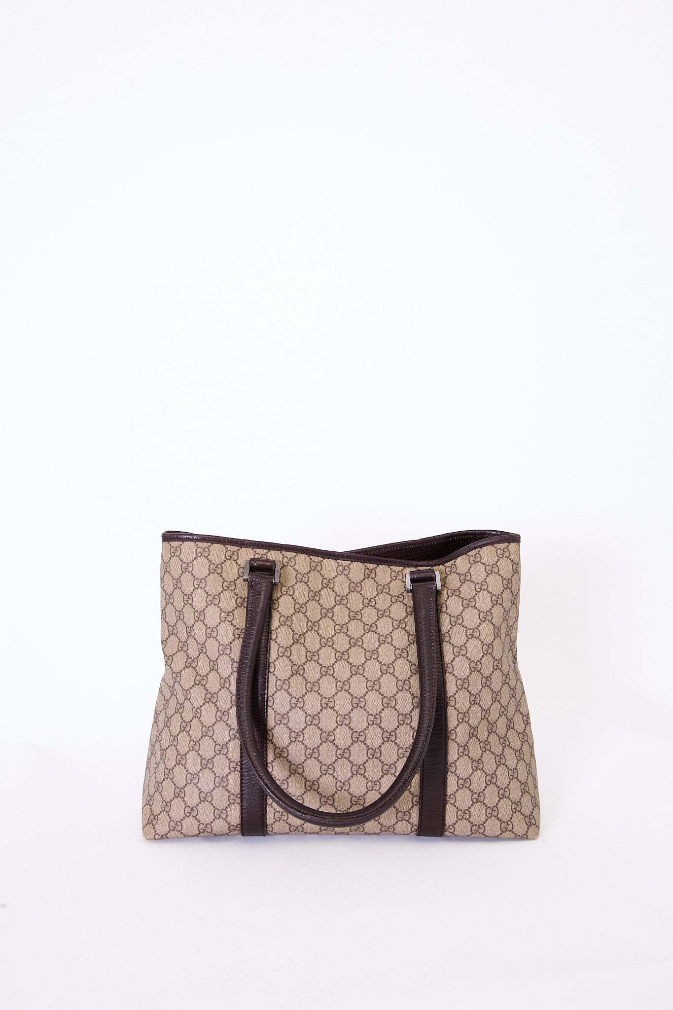 Klassisk Gucci tote i beige GG-canvas med mørkebrune læderdetaljer. Et tidløst design, der kombinerer Guccis ikoniske monogram med praktisk elegance - perfekt som hverdagstaske, work bag eller rejsekompanion. De dobbelte håndtag gør den nem at bære på skulderen, mens det rummelige indre giver plads til alt det nødvendige med stil.