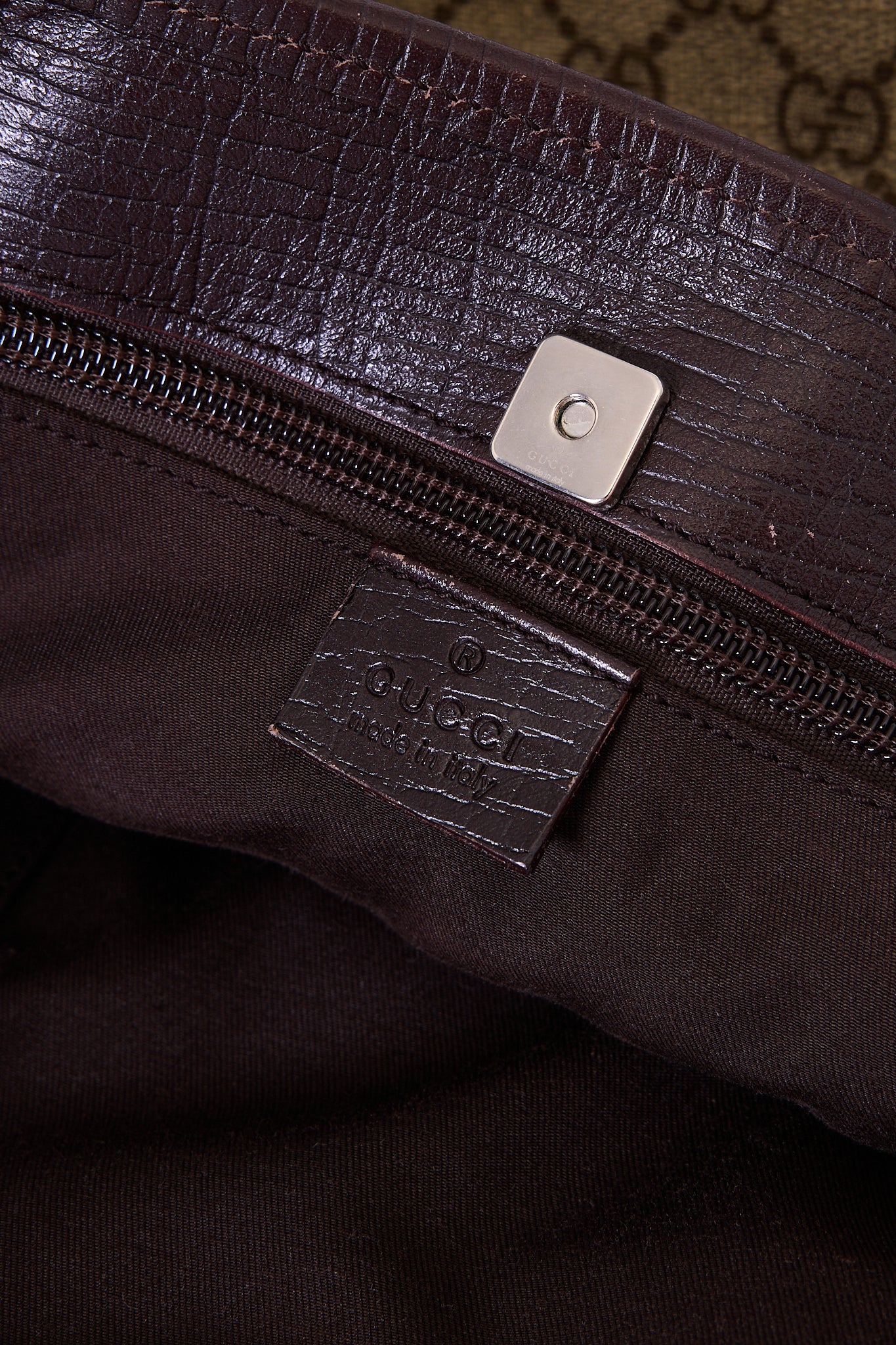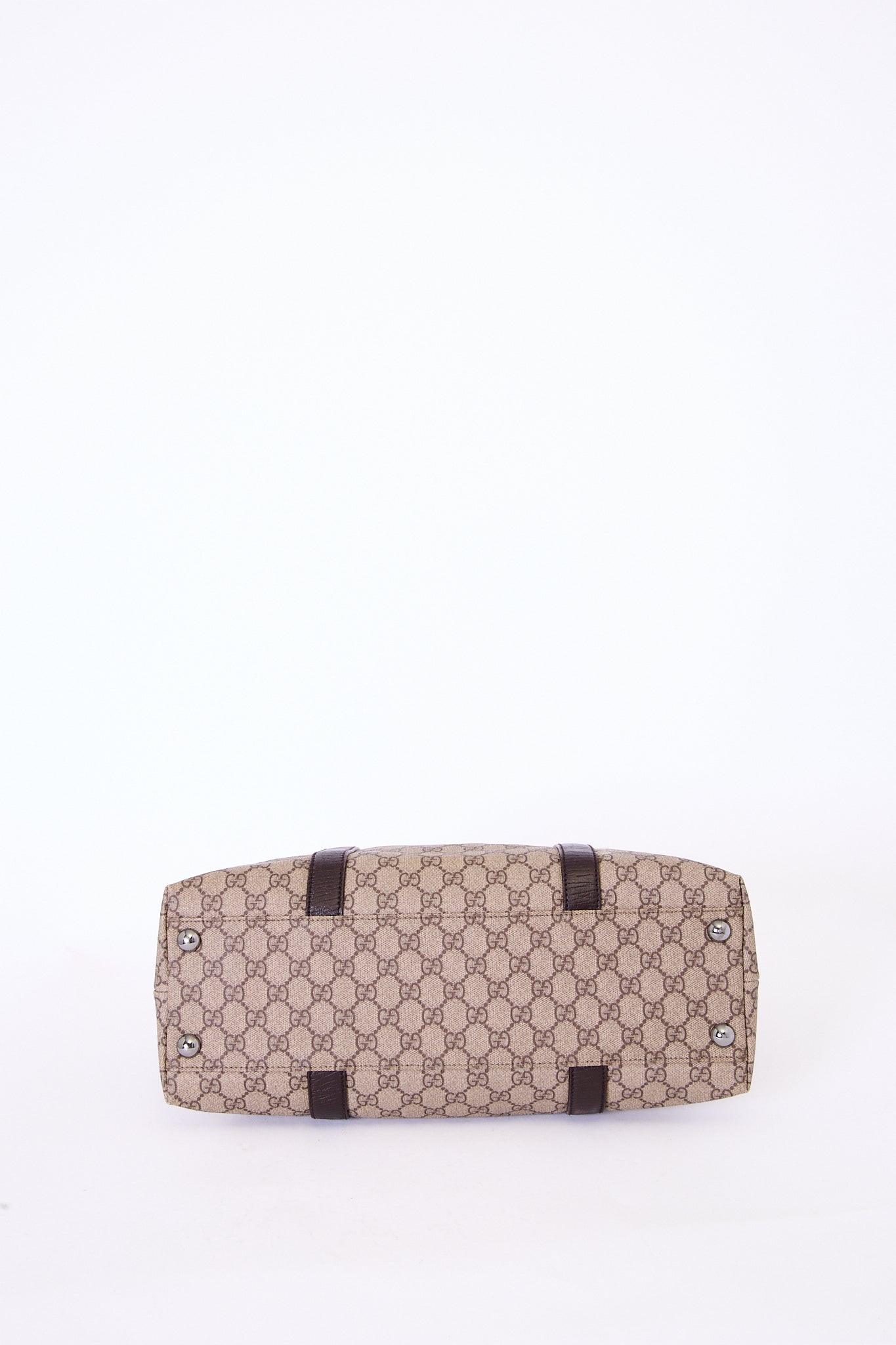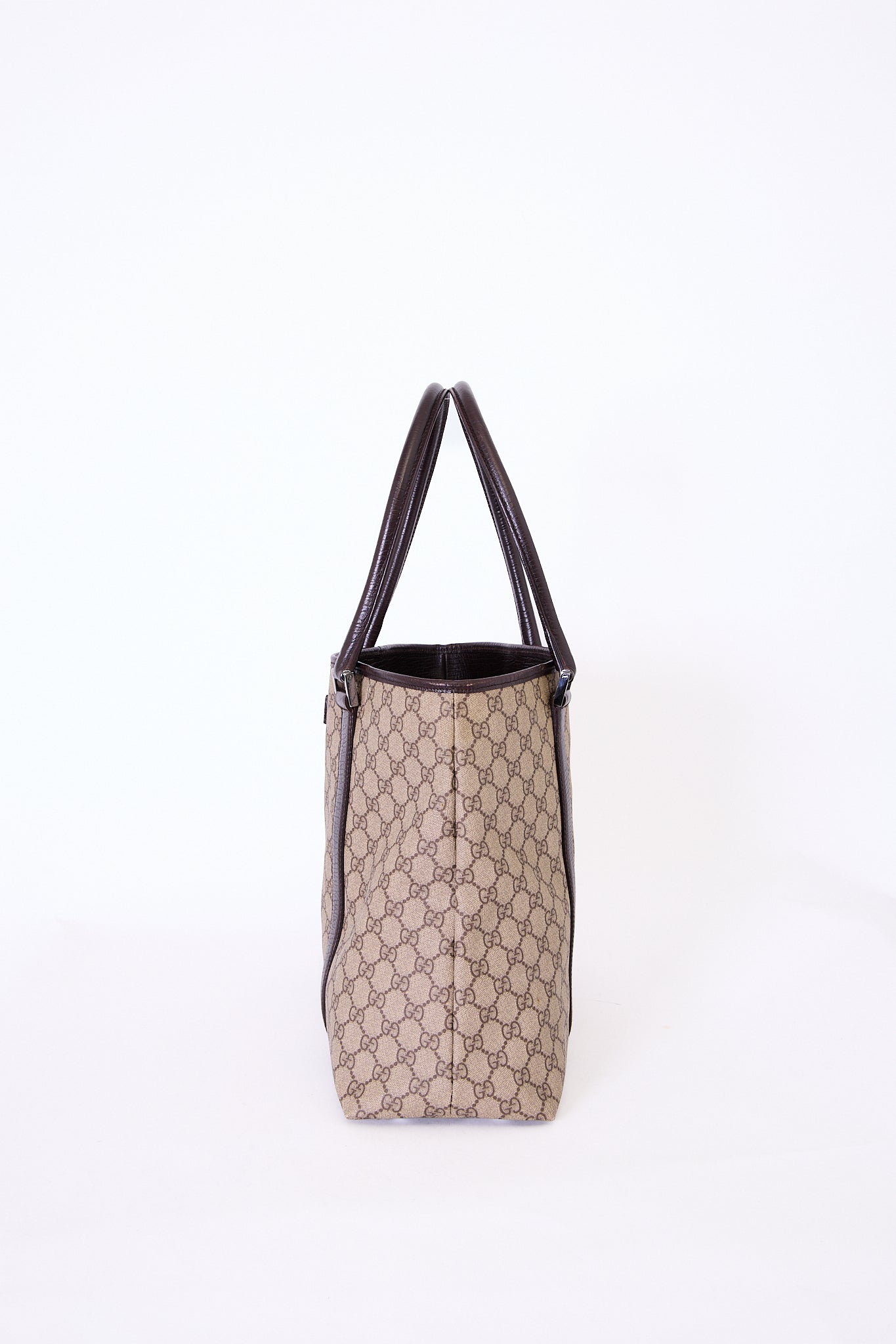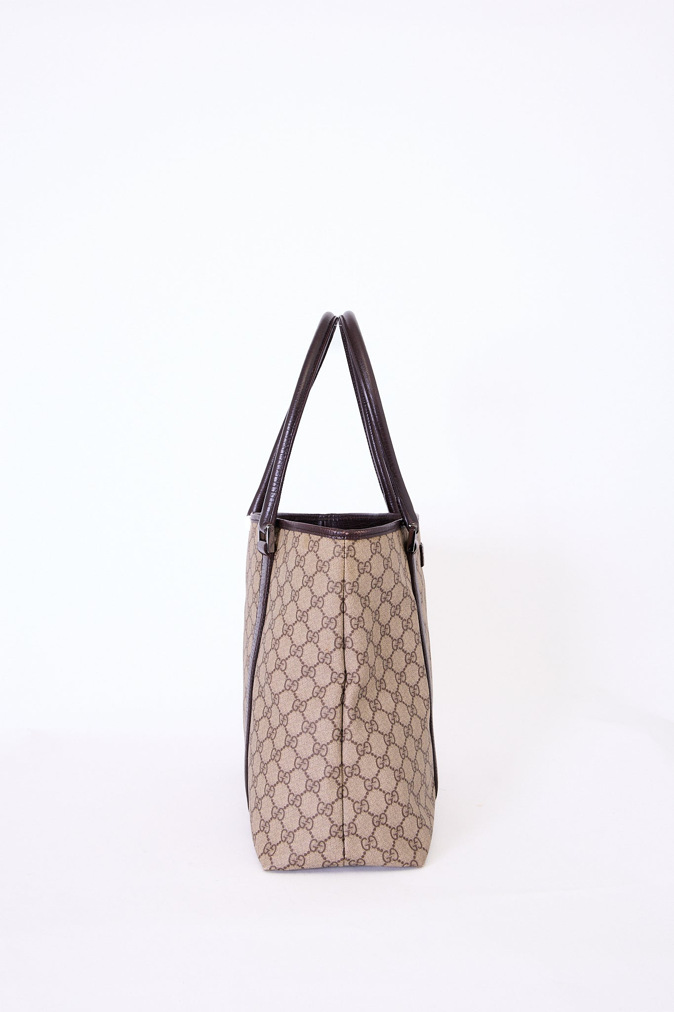 Klassisk Gucci tote i beige GG-canvas med mørkebrune læderdetaljer. Et tidløst design, der kombinerer Guccis ikoniske monogram med praktisk elegance - perfekt som hverdagstaske, work bag eller rejsekompanion. De dobbelte håndtag gør den nem at bære på skulderen, mens det rummelige indre giver plads til alt det nødvendige med stil.