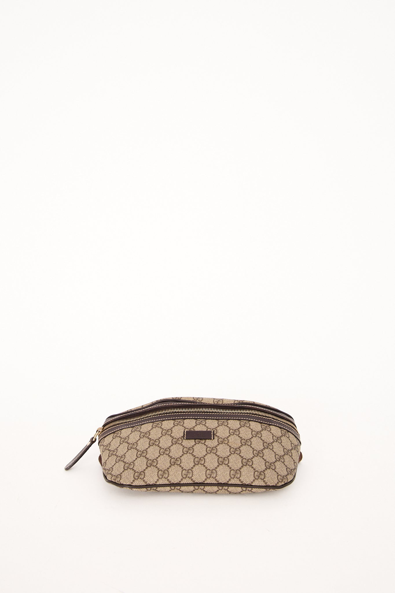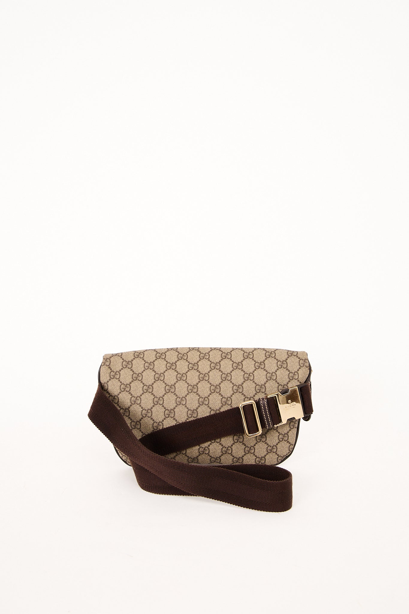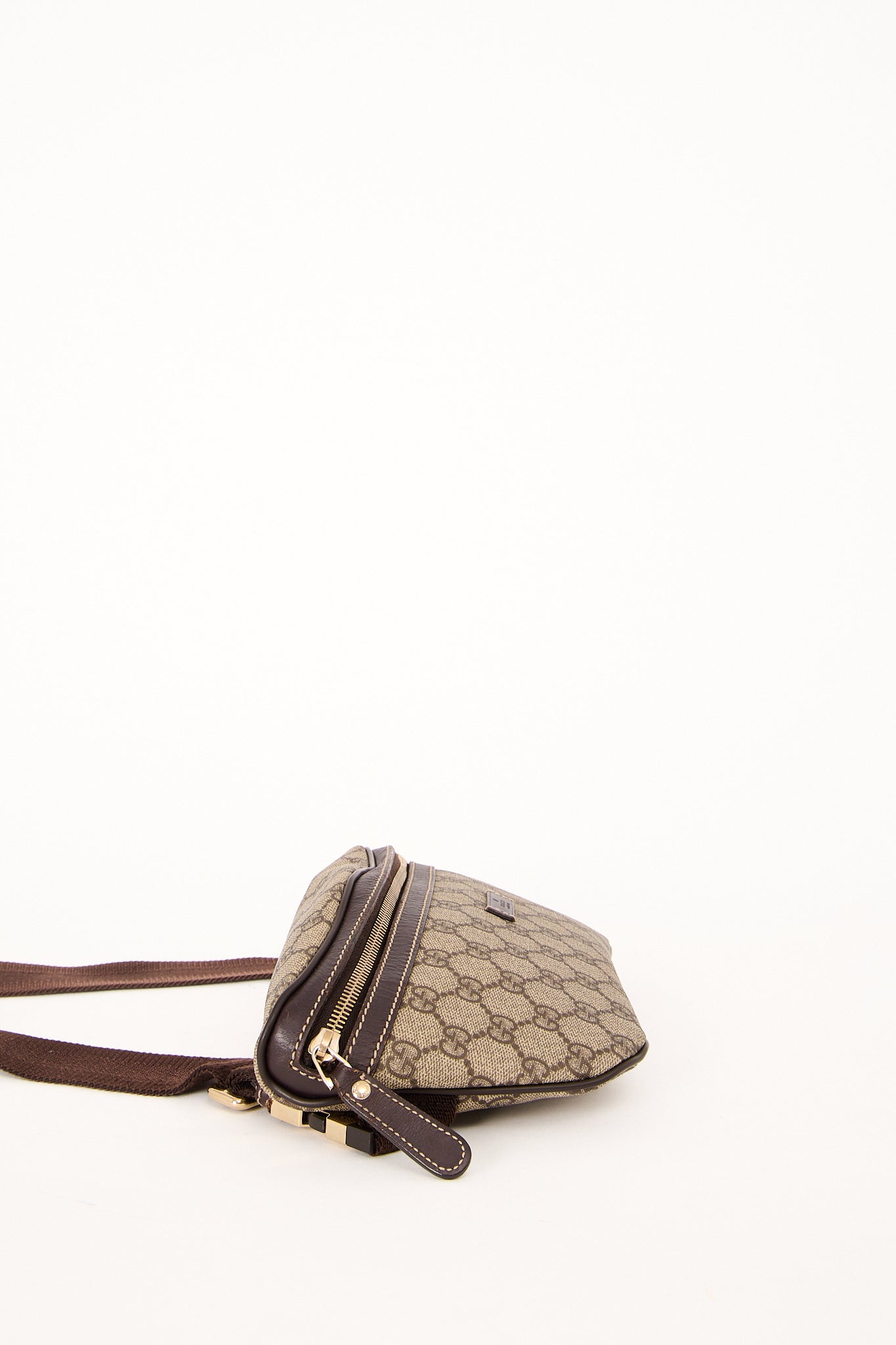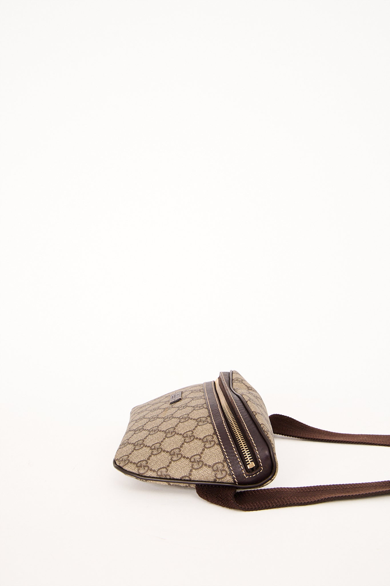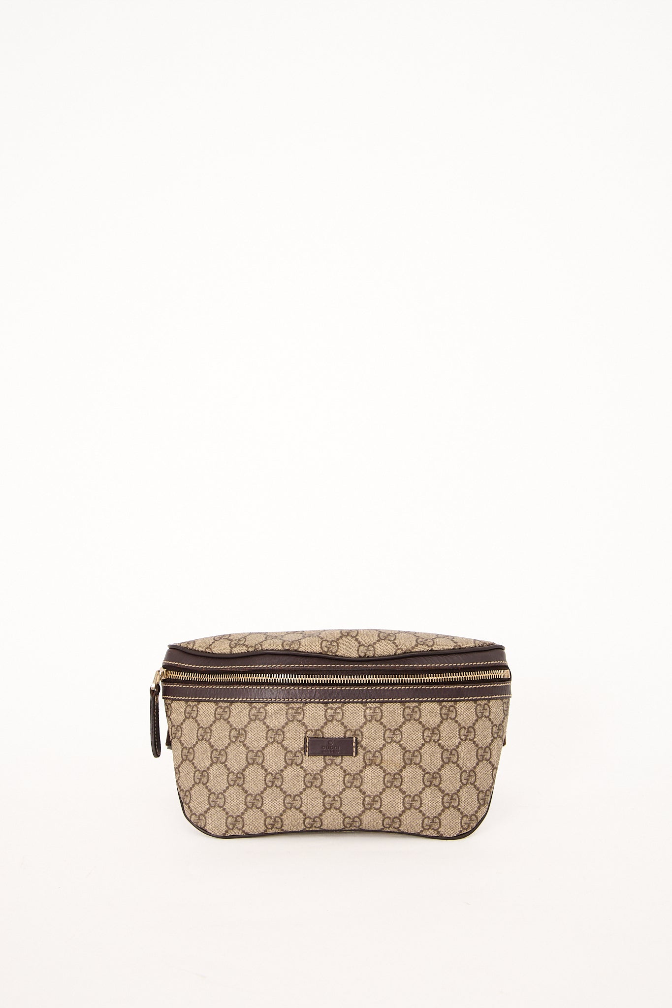 Klassisk Gucci GG Supreme bæltetaske i beige/brun canvas med mørkebrune læderdetaljer og guldfarvet hardware. Tasken har justerbar rem, der gør den nem at bære både om livet og som crossbody. Et sporty, men elegant design – ideel til både hverdag og rejse.