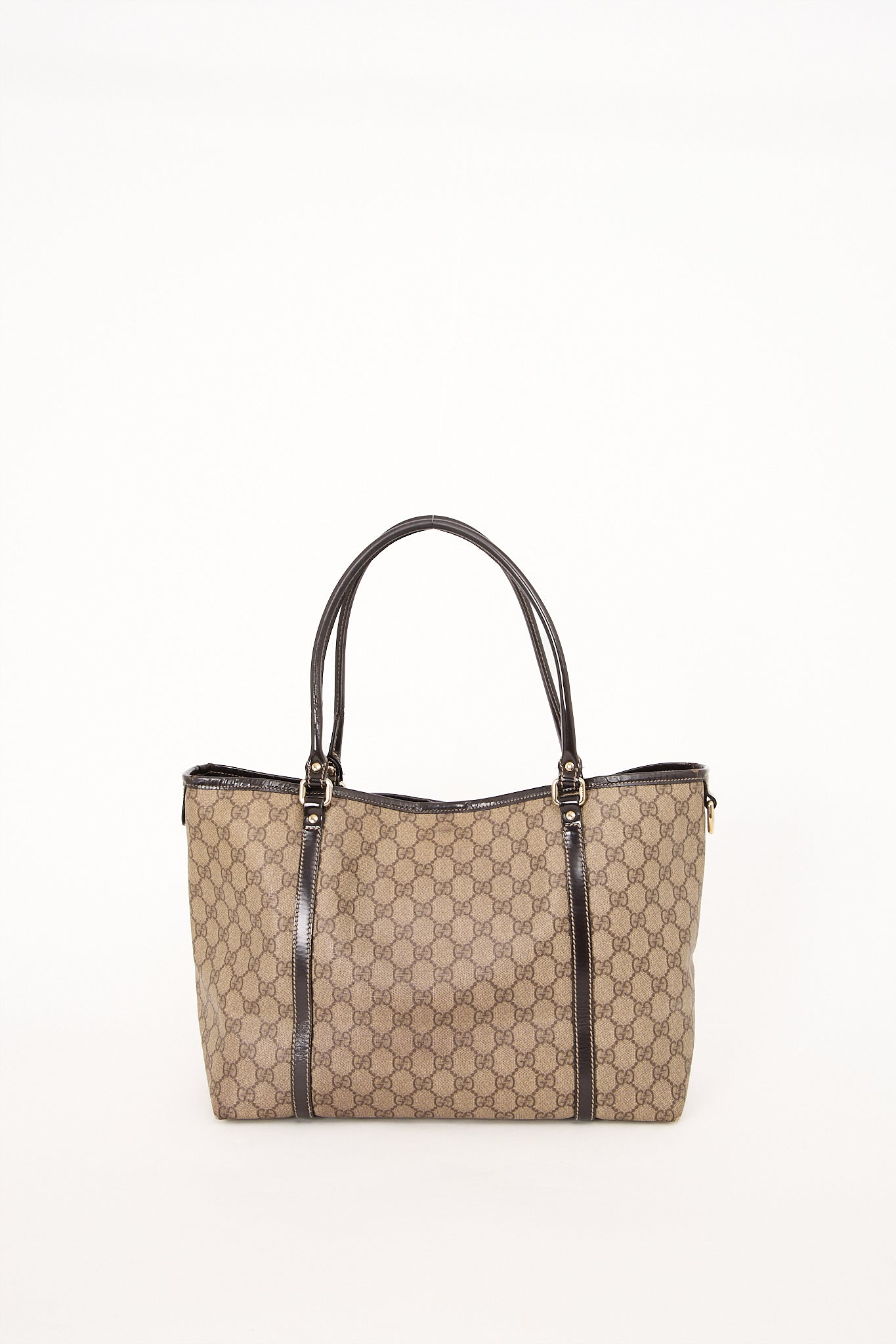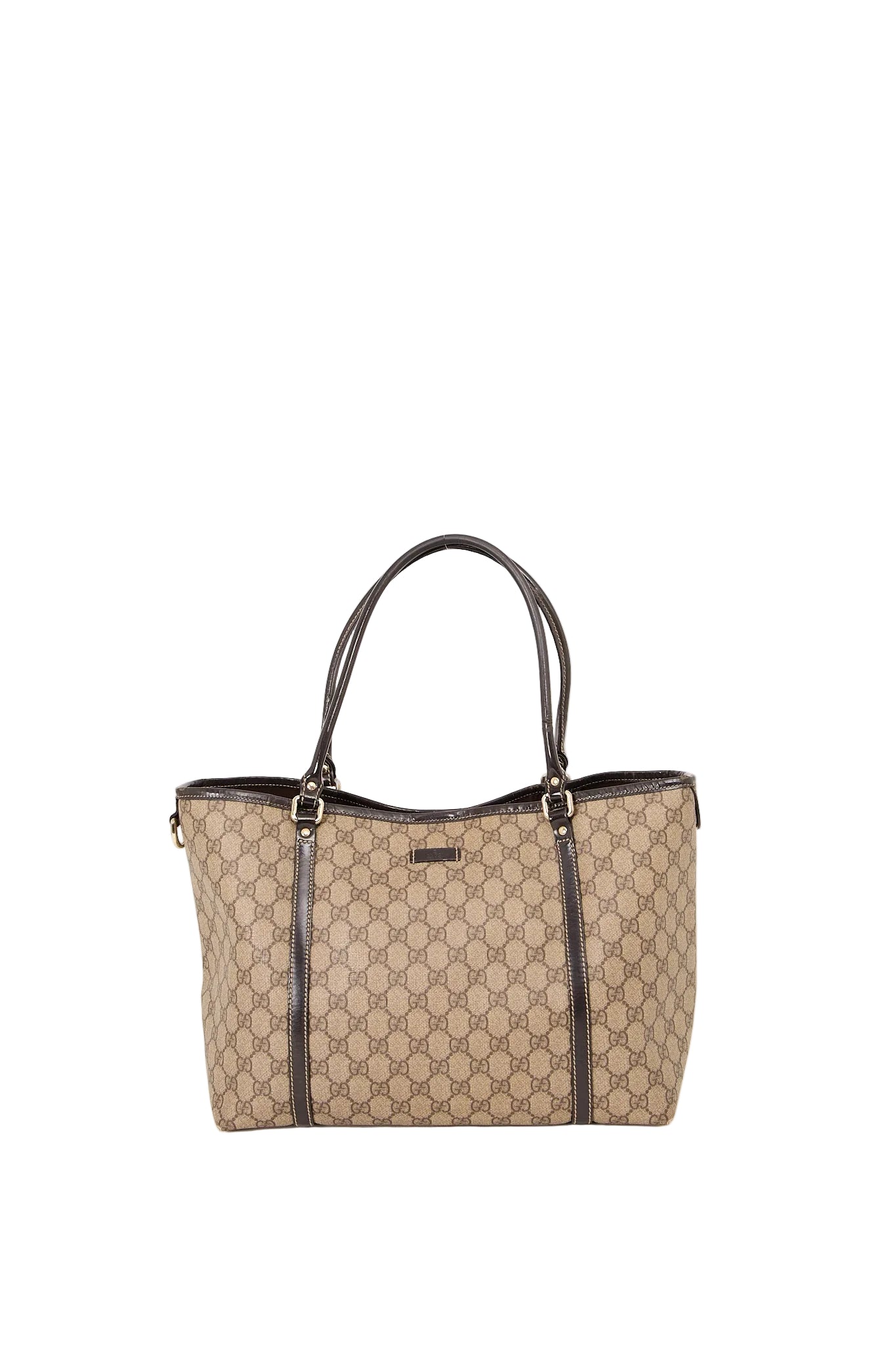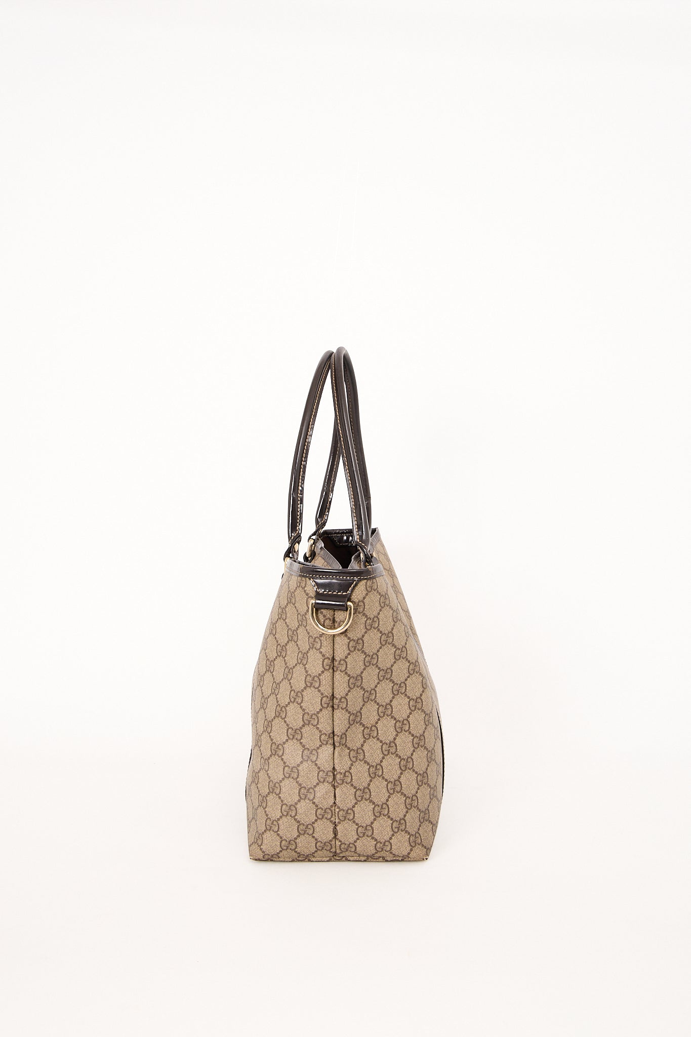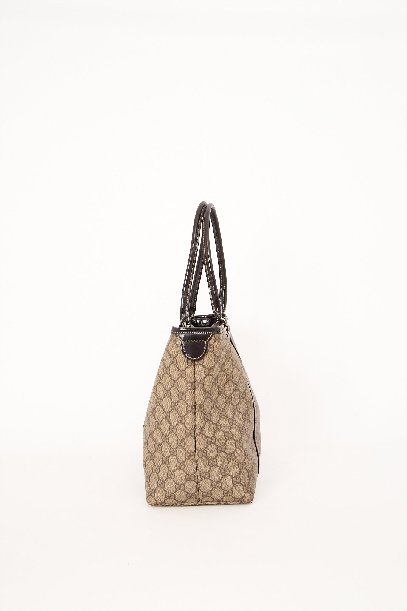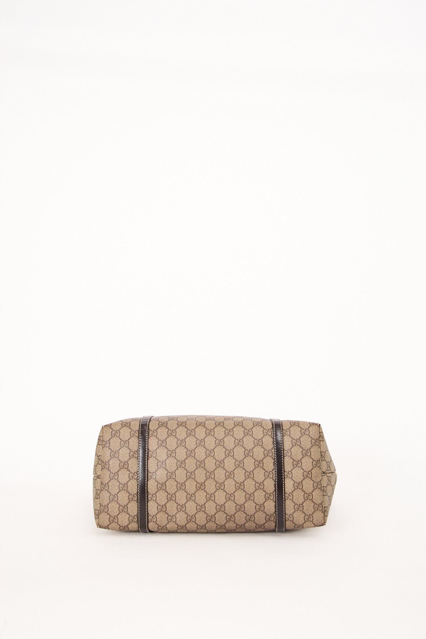 Klassisk Gucci tote bag i beige GG-signet canvas med smukke sølvfarvede læderdetaljer. Tasken har dobbelte hanke, lynlåslukning og et rummeligt hovedrum med plads til både computer, dokumenter og hverdagsessentials. Den tidløse kombination af Guccis ikoniske monogram og metalliske detaljer giver tasken et elegant og sofistikeret udtryk, der passer perfekt både til hverdag og rejse. En luksuriøs og funktionel taske, der udstråler klassisk Gucci-stil.