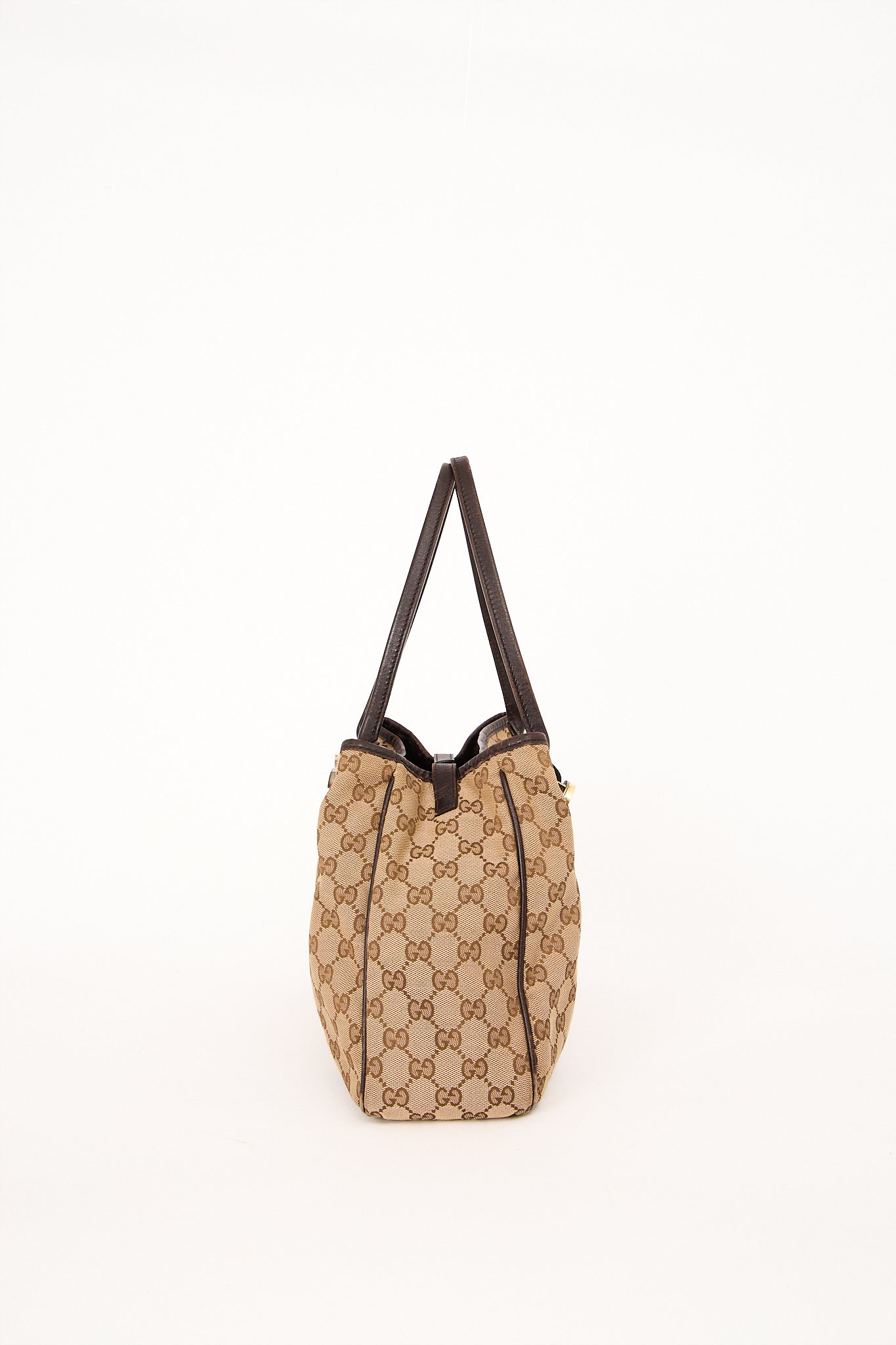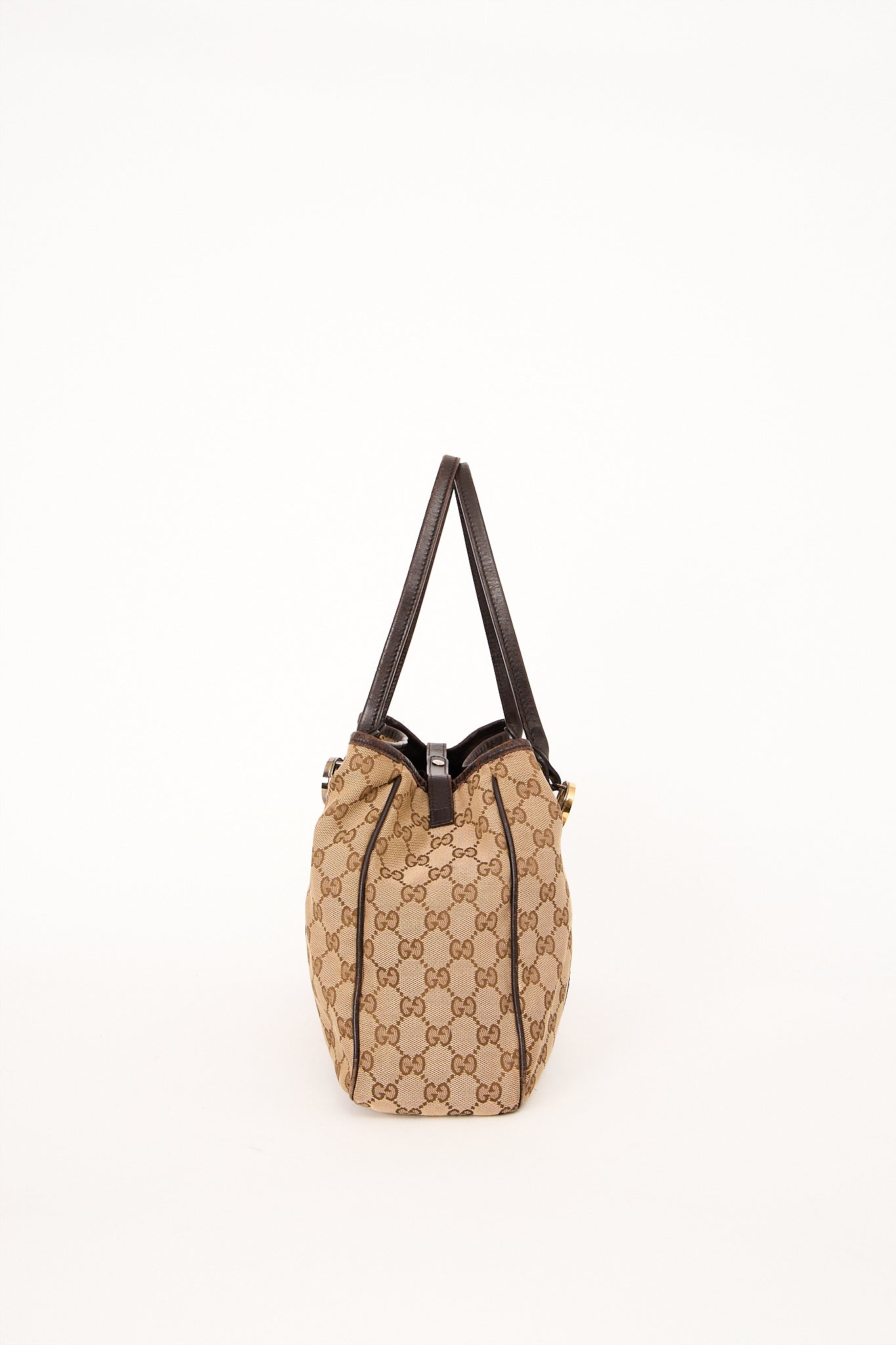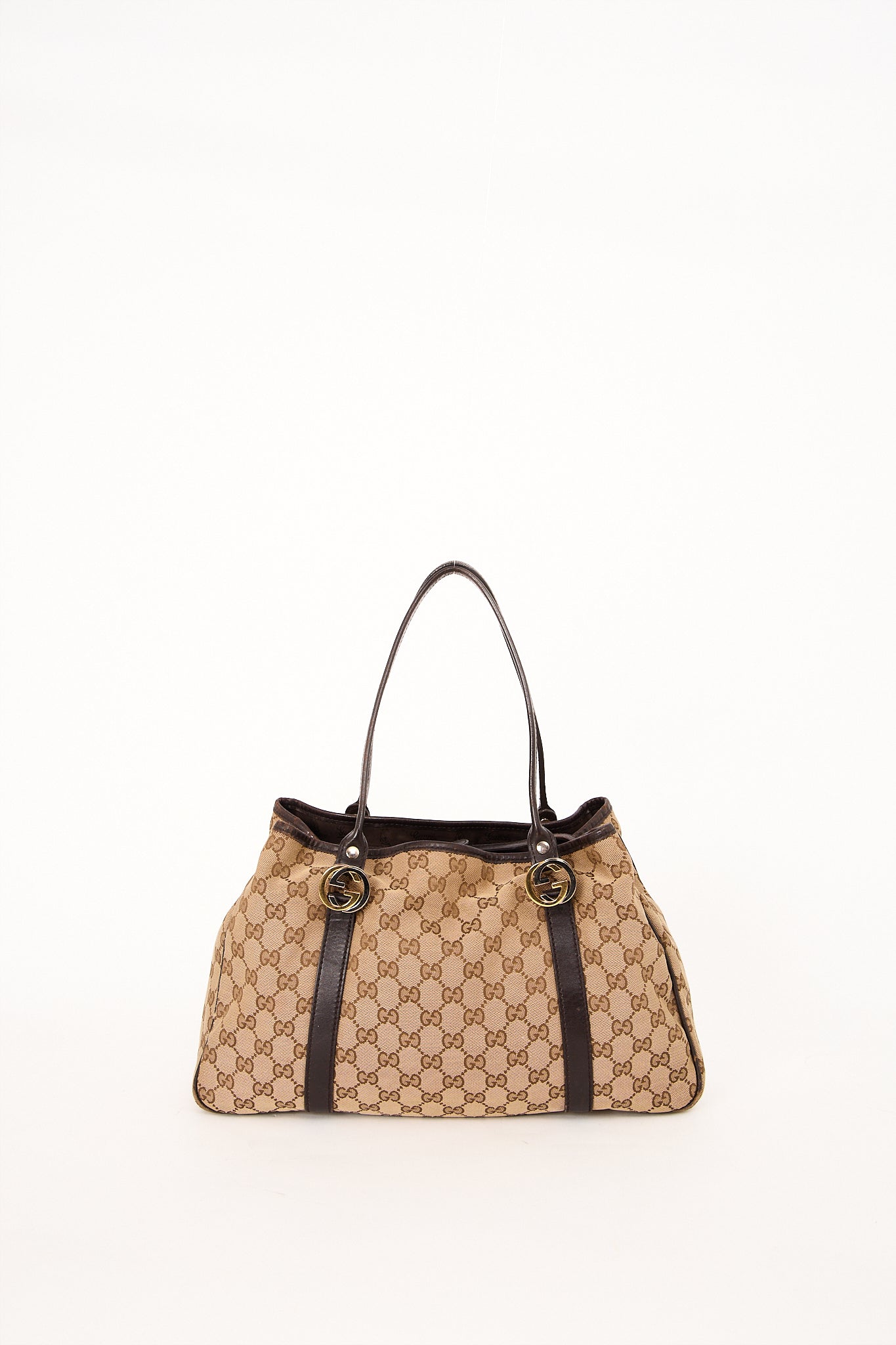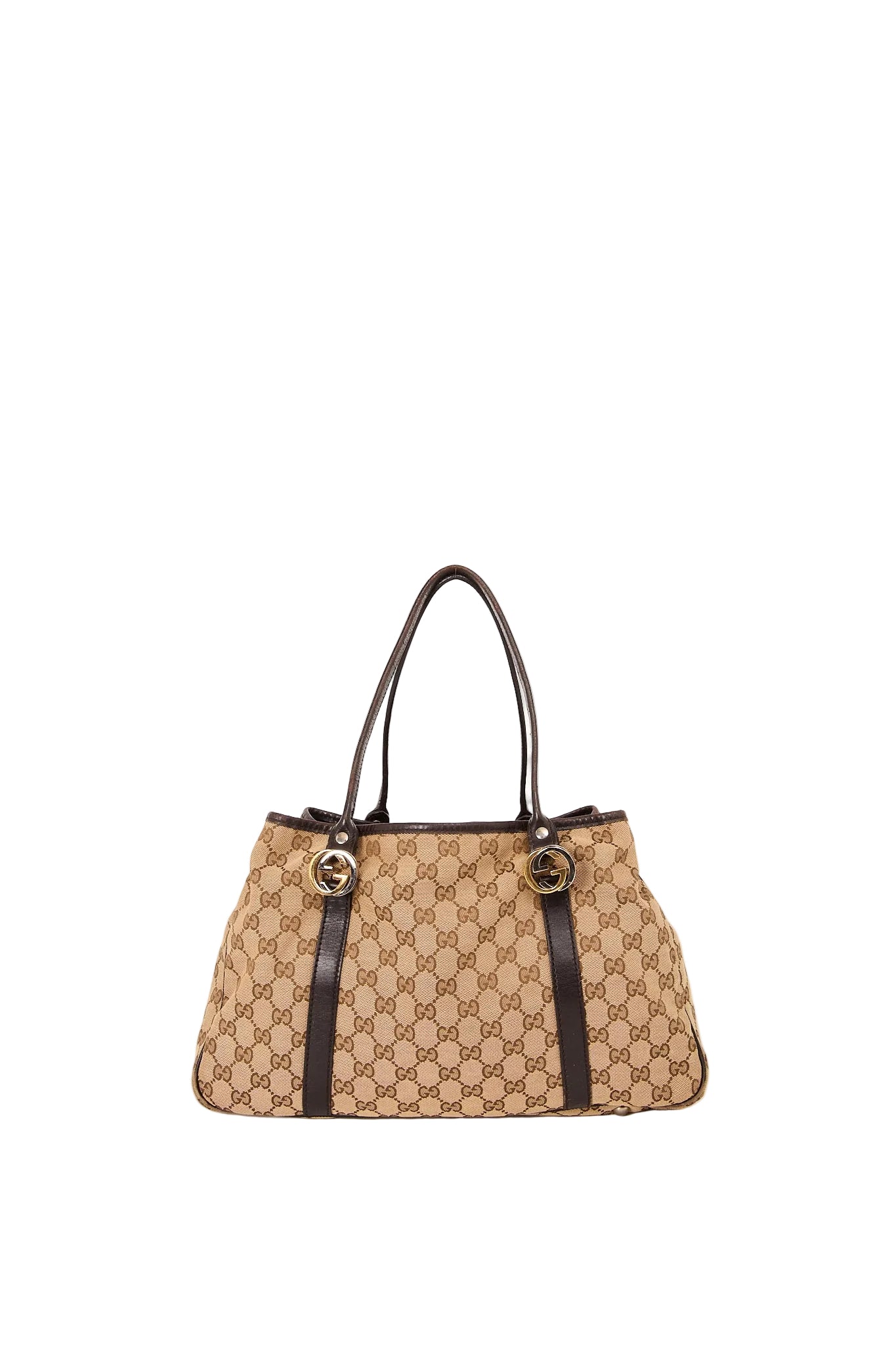 Elegant og rummelig Gucci Twin Tote udført i det klassiske beige GG Supreme canvas med brune læderdetaljer og dobbelt-tonede GG-logo-ringe i guld og sølv. Tasken forener Guccis ikoniske designarv med funktionalitet og tidløs stil. Med sin strukturerede form og generøse indvendige plads er den perfekt som både hverdagstaske og arbejds-/shoppetaske. Indvendigt er der god plads til computer, pung og andre nødvendigheder, hvilket gør den både praktisk og sofistikeret.