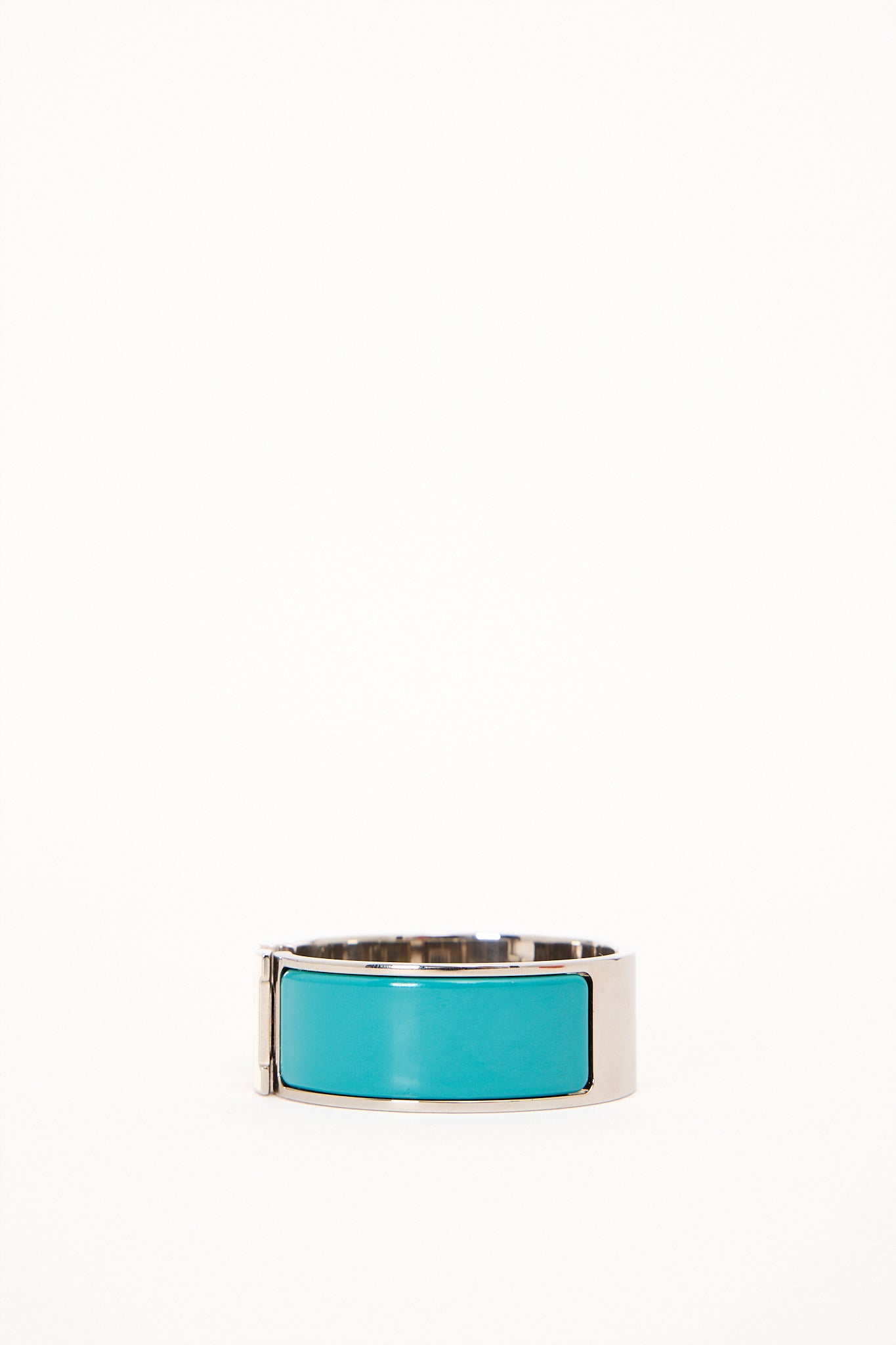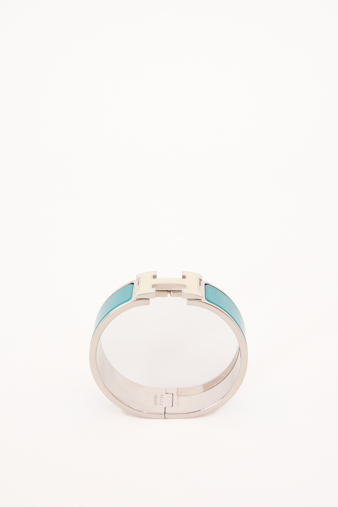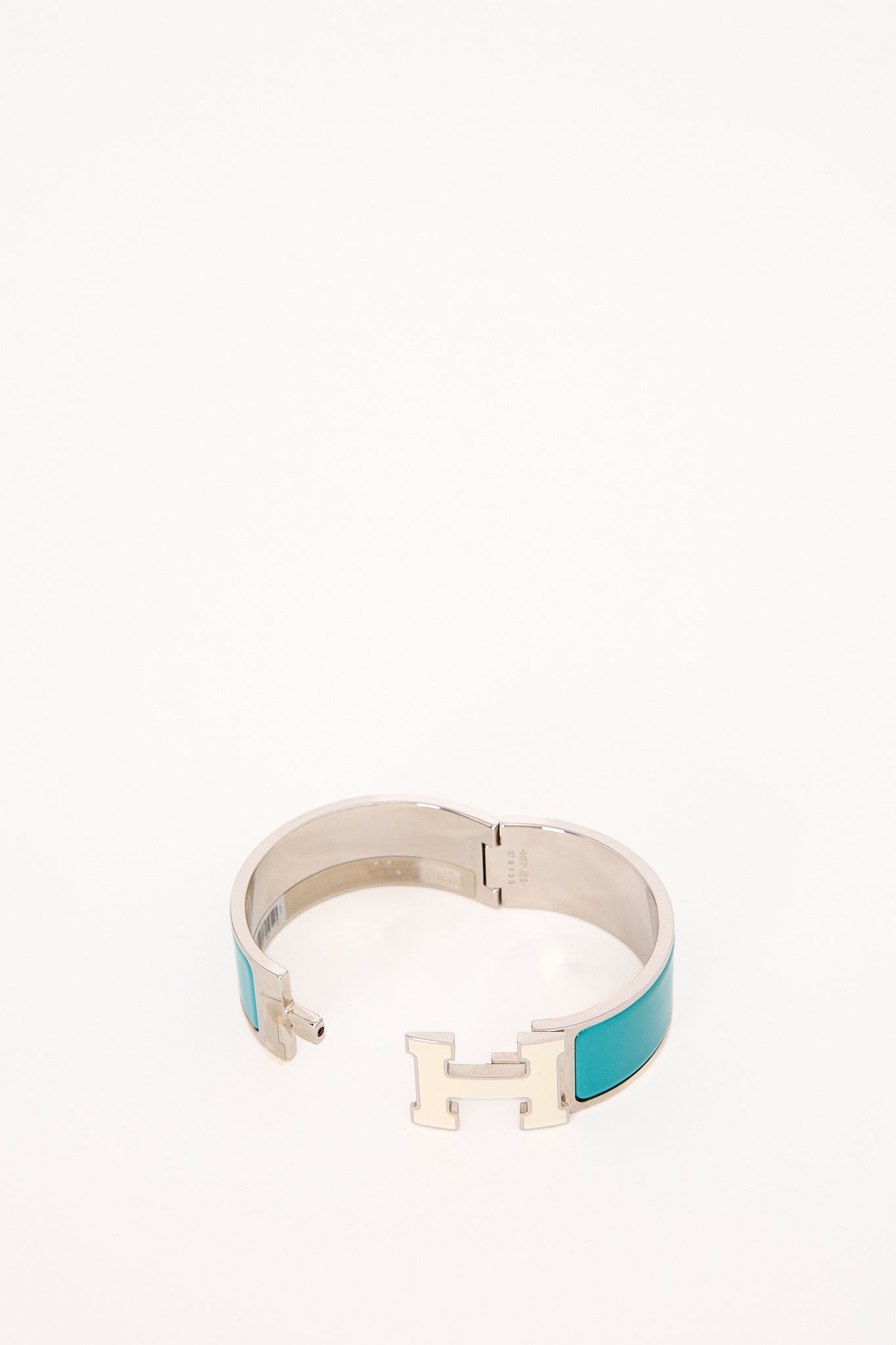 Klassisk Hermès Clic H-armbånd med turkis emalje og palladiumbelagt metal. Det elegante armbånd åbnes med den karakteristiske “H”-kliklås, og kombinerer tidløs luksus med diskret Hermès-signatur. Et alsidigt smykke, der løfter både hverdags- og aftenlook.