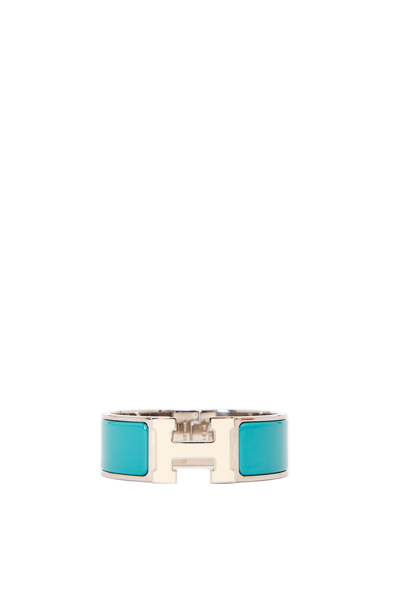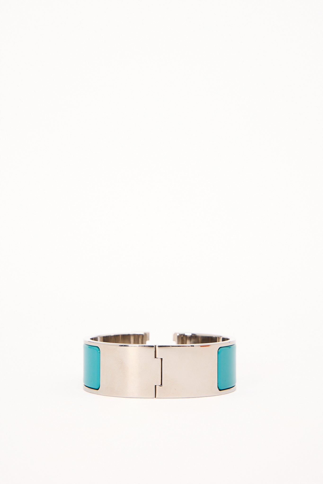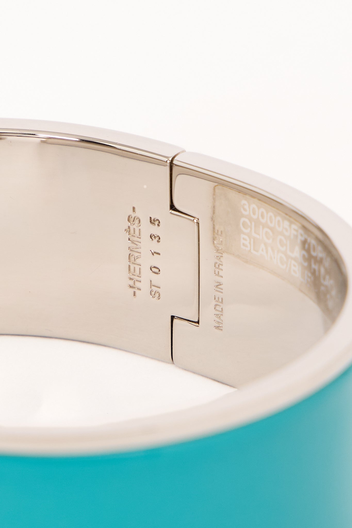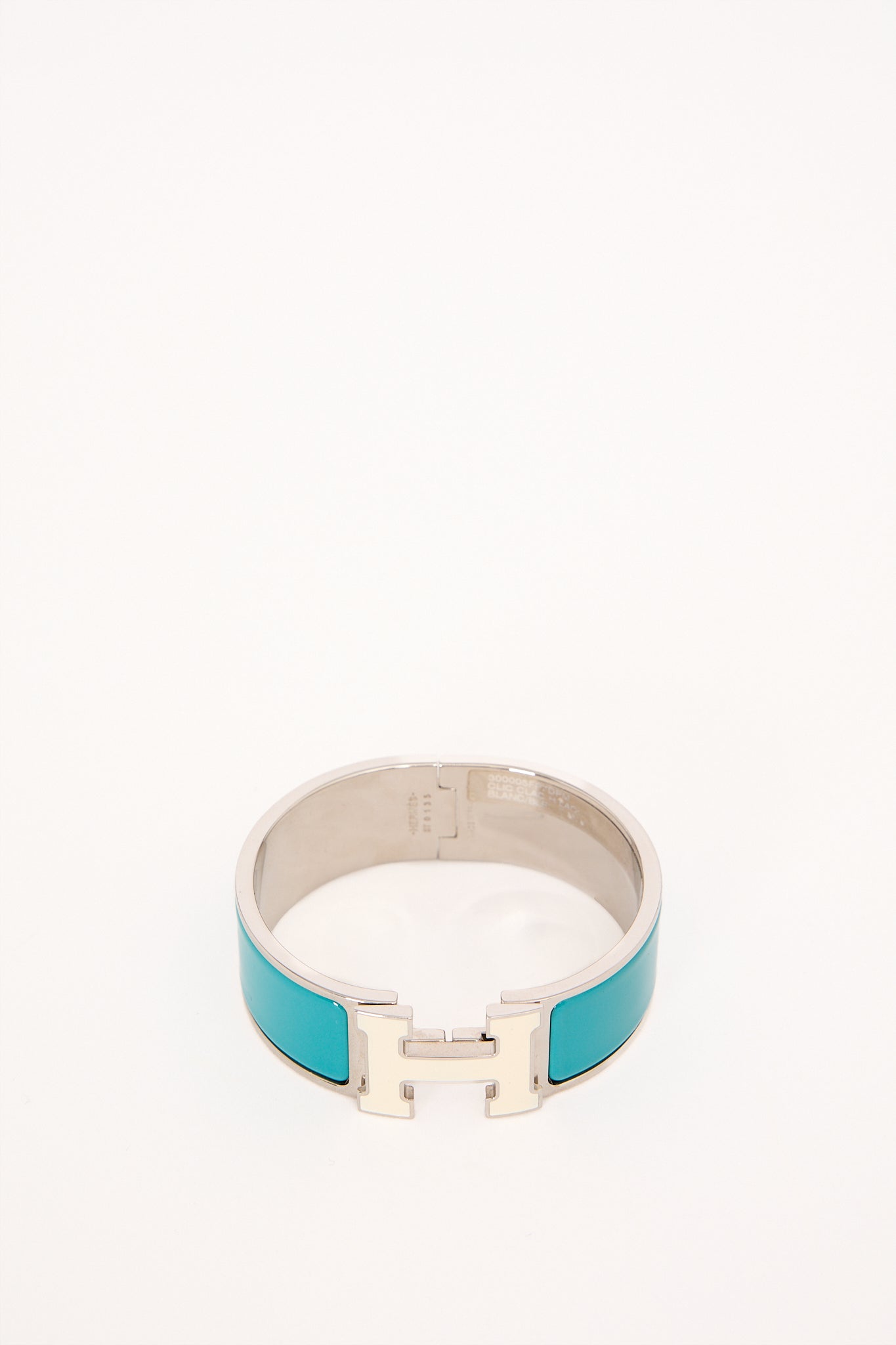 Klassisk Hermès Clic H-armbånd med turkis emalje og palladiumbelagt metal. Det elegante armbånd åbnes med den karakteristiske “H”-kliklås, og kombinerer tidløs luksus med diskret Hermès-signatur. Et alsidigt smykke, der løfter både hverdags- og aftenlook.