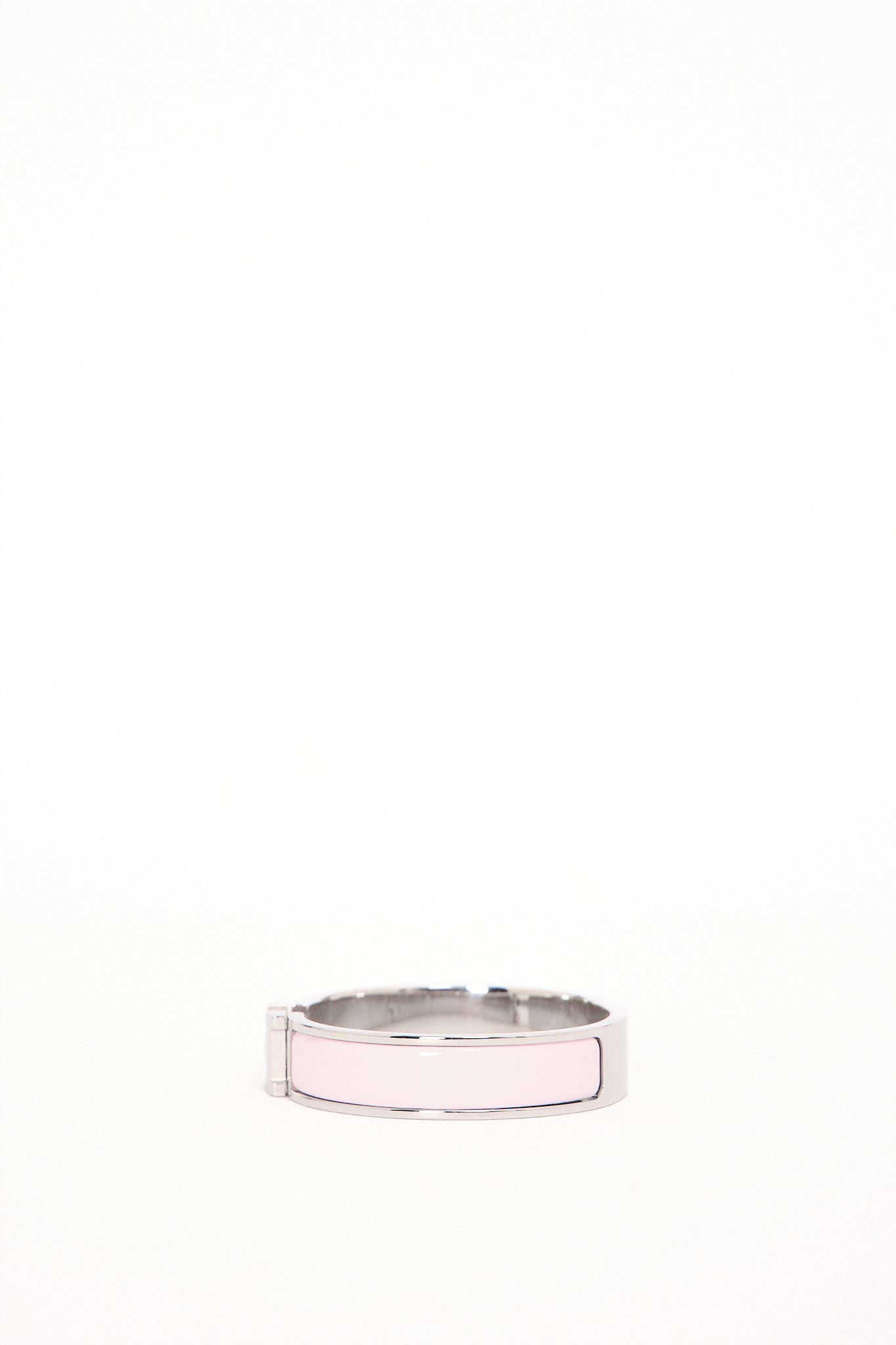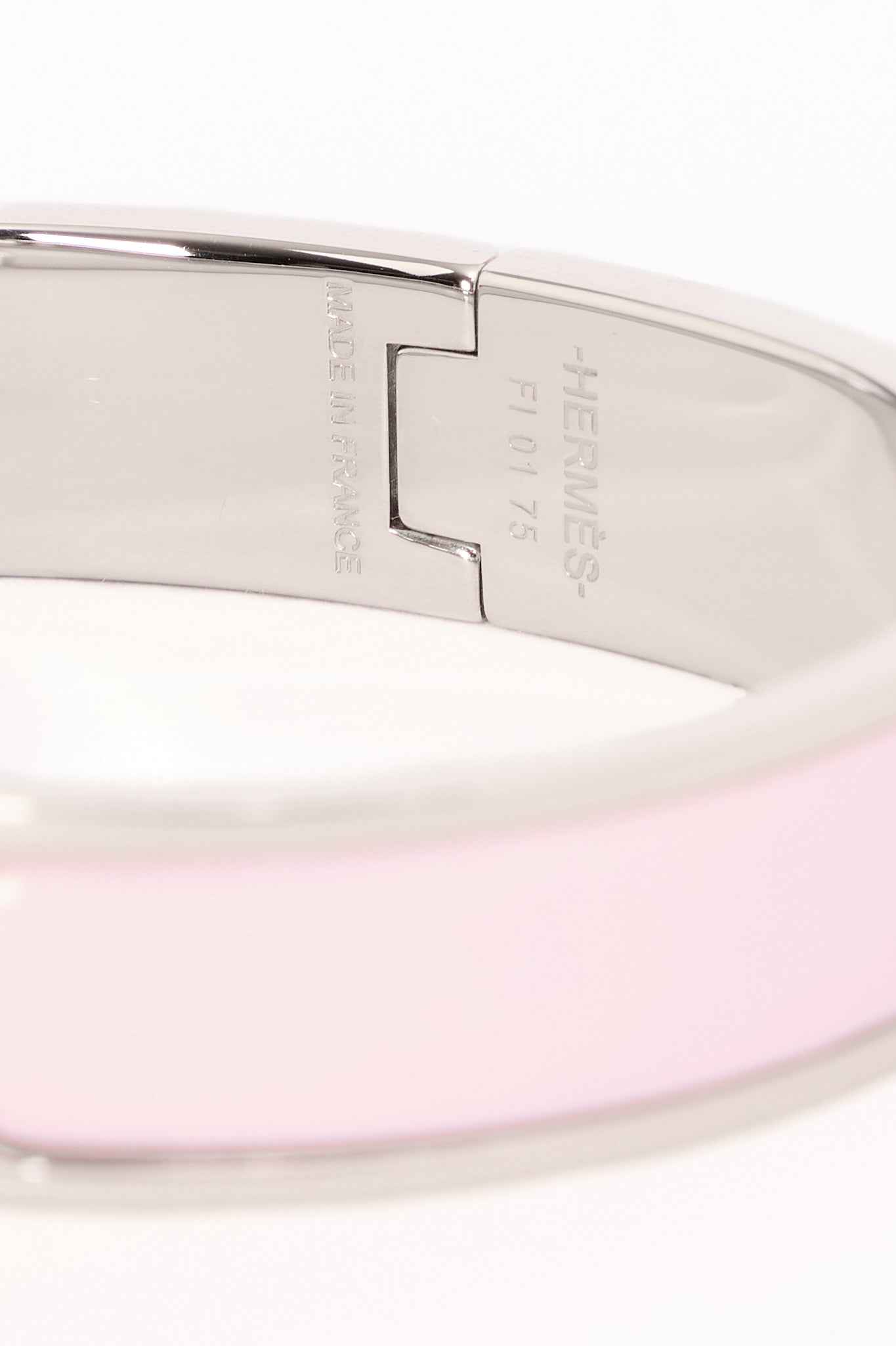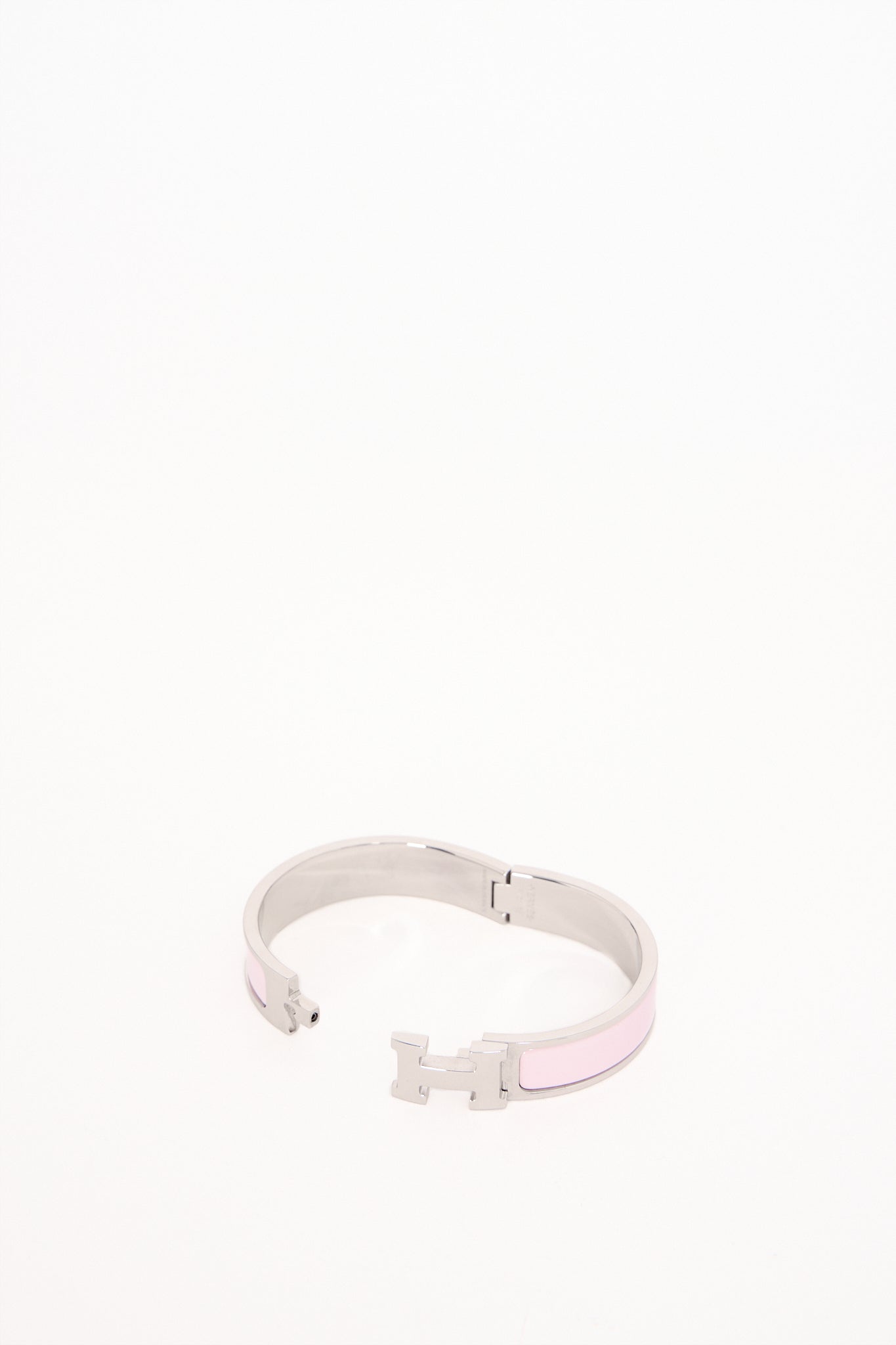 Elegant Hermès Clic H-armbånd i lyserød emalje med palladiumbelagt metal. Et ikonisk smykke fra Hermès, der kombinerer legende farve med klassisk luksus. Perfekt til både hverdagsbrug og som et feminint statement-piece.