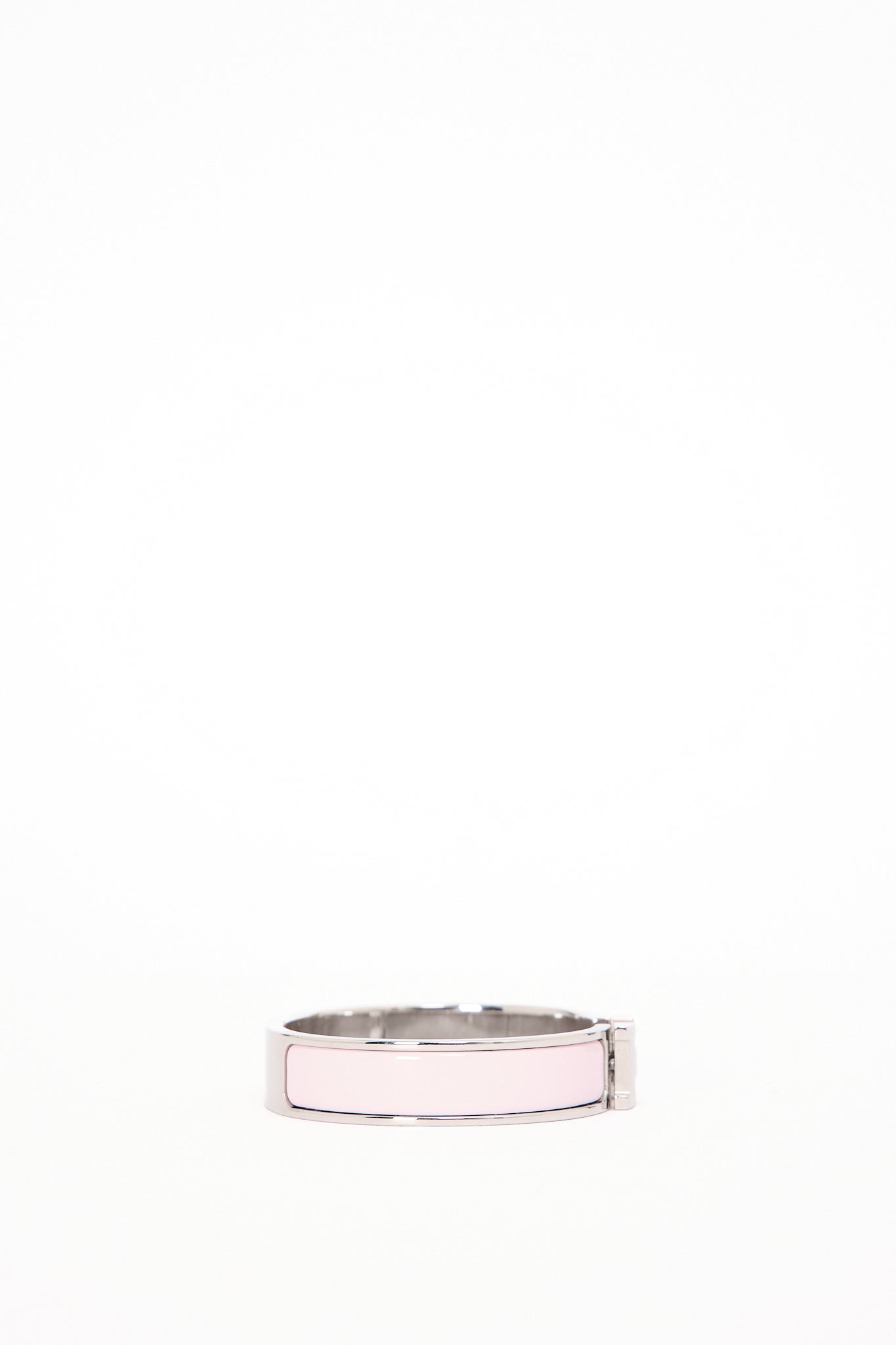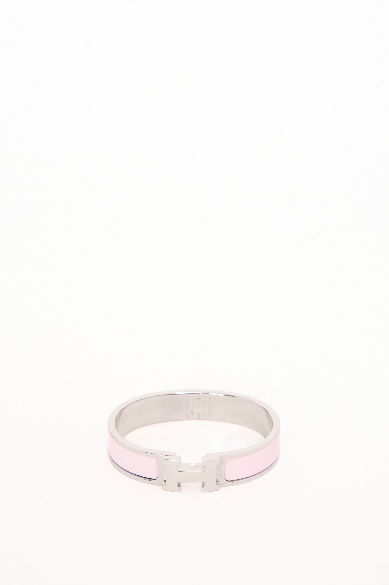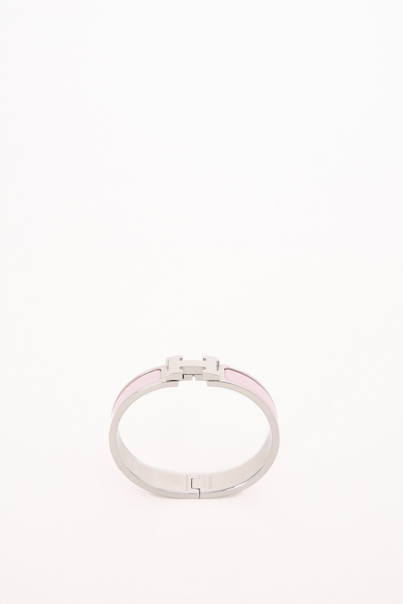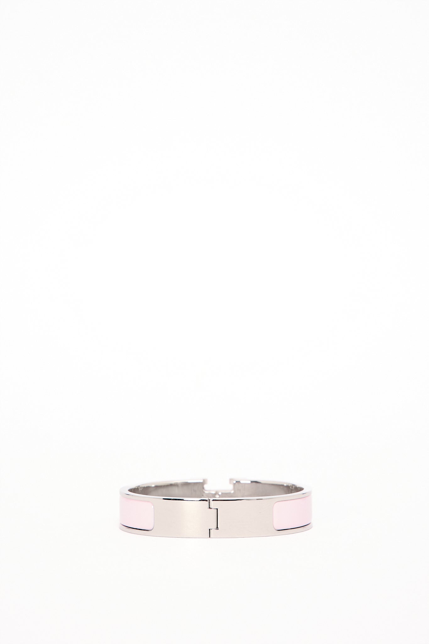 Elegant Hermès Clic H-armbånd i lyserød emalje med palladiumbelagt metal. Et ikonisk smykke fra Hermès, der kombinerer legende farve med klassisk luksus. Perfekt til både hverdagsbrug og som et feminint statement-piece.