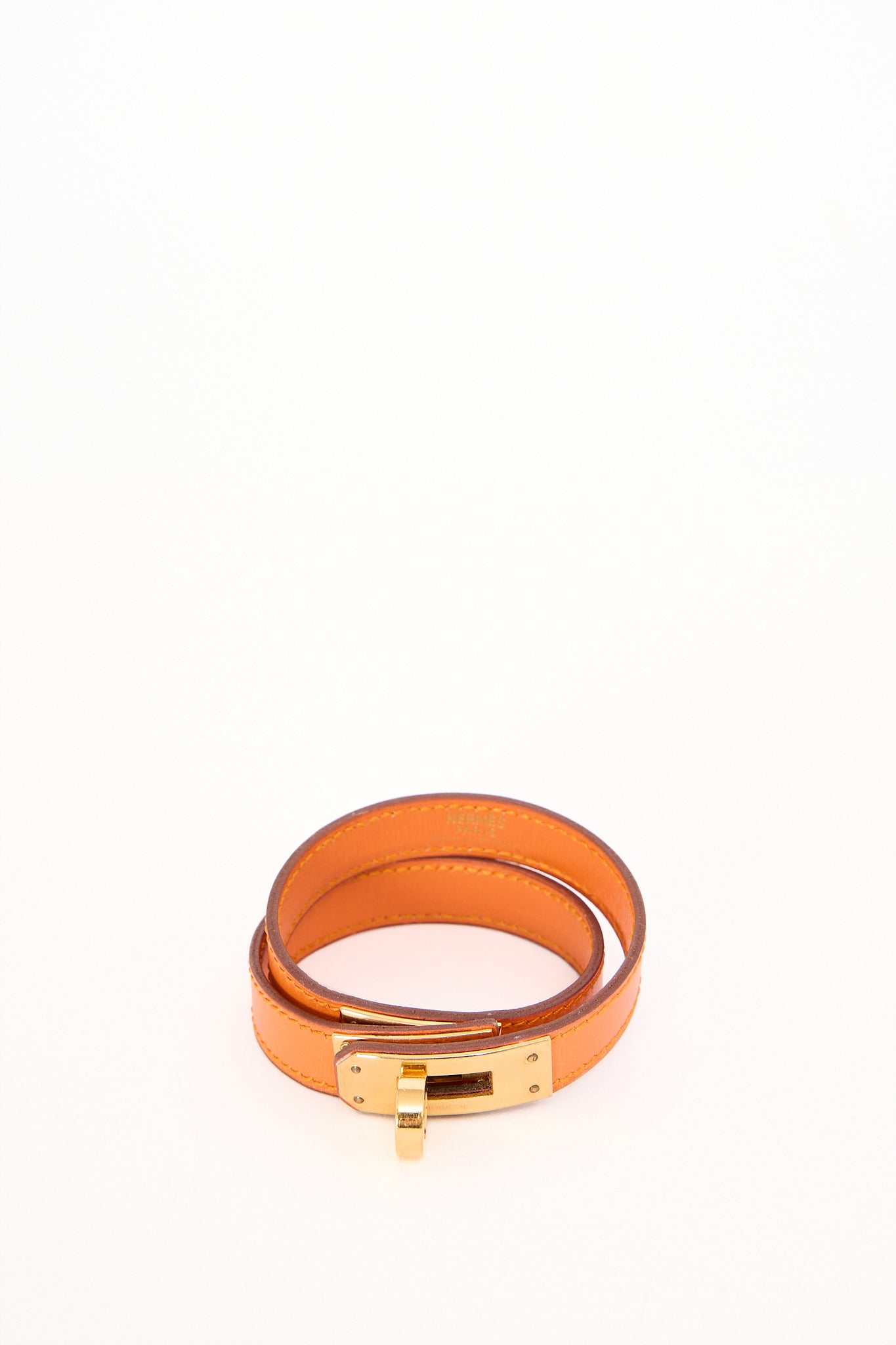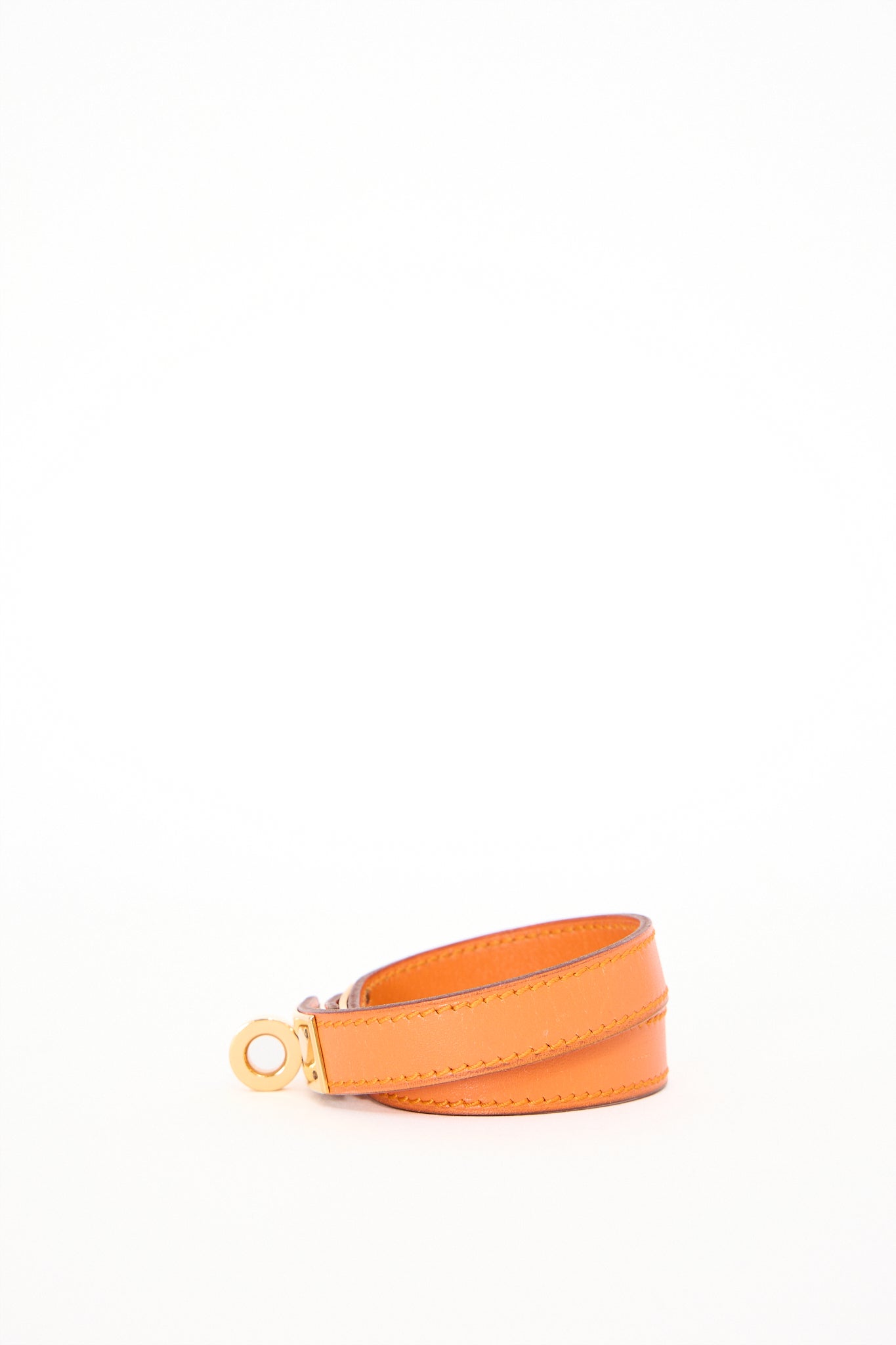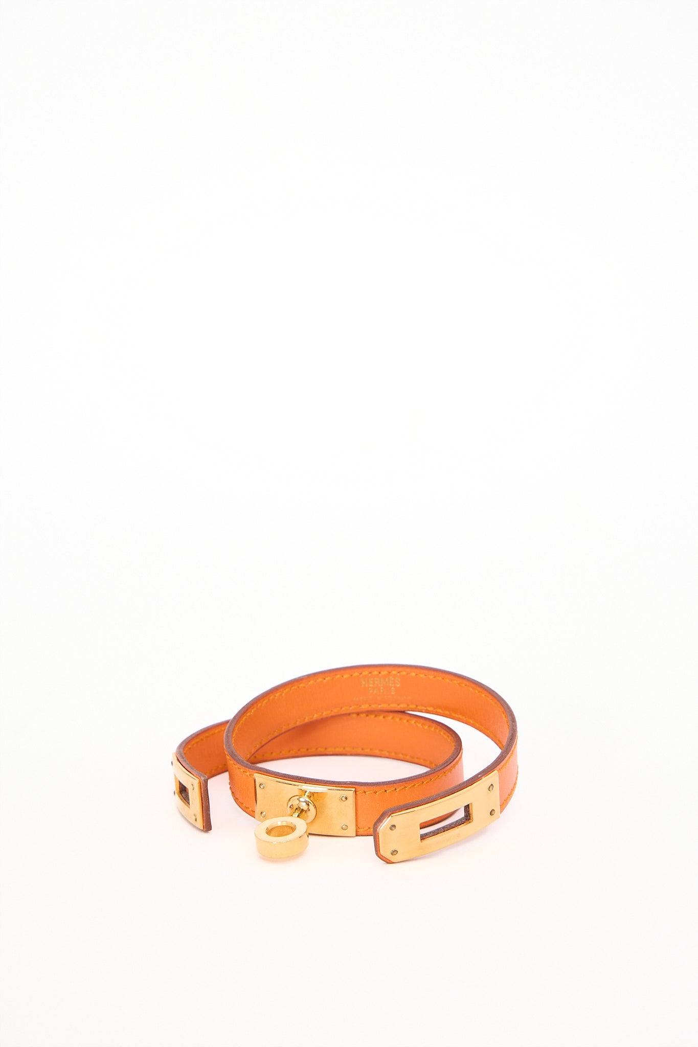 Ikonisk Hermès Kelly Double Tour armbånd i orange læder med guldfarvet lås. Designet henter inspiration fra den legendariske Kelly-taske og snor sig elegant to gange om håndleddet. Et tidløst statement piece, der kombinerer Hermès’ luksuriøse håndværk med diskret elegance.