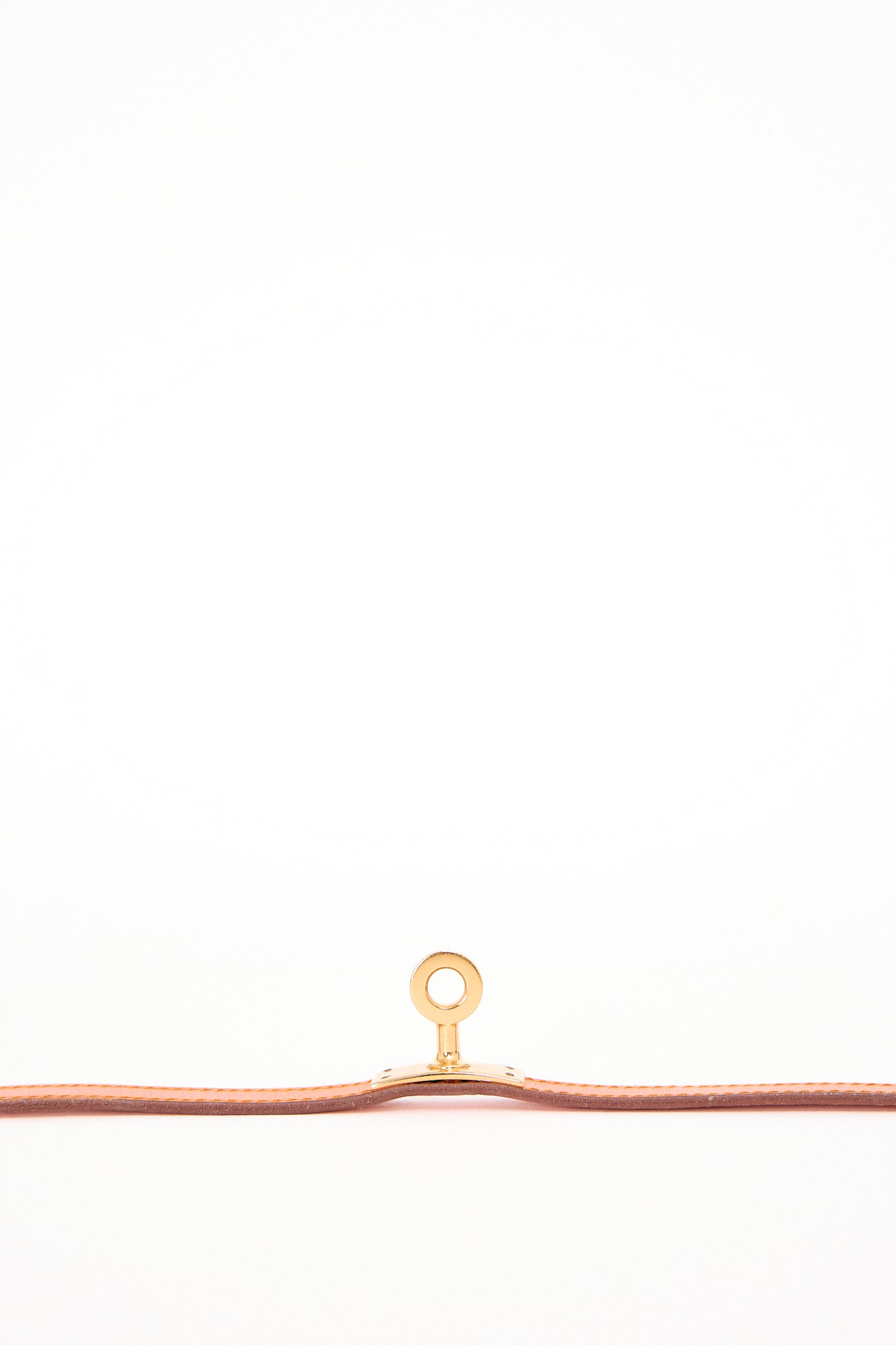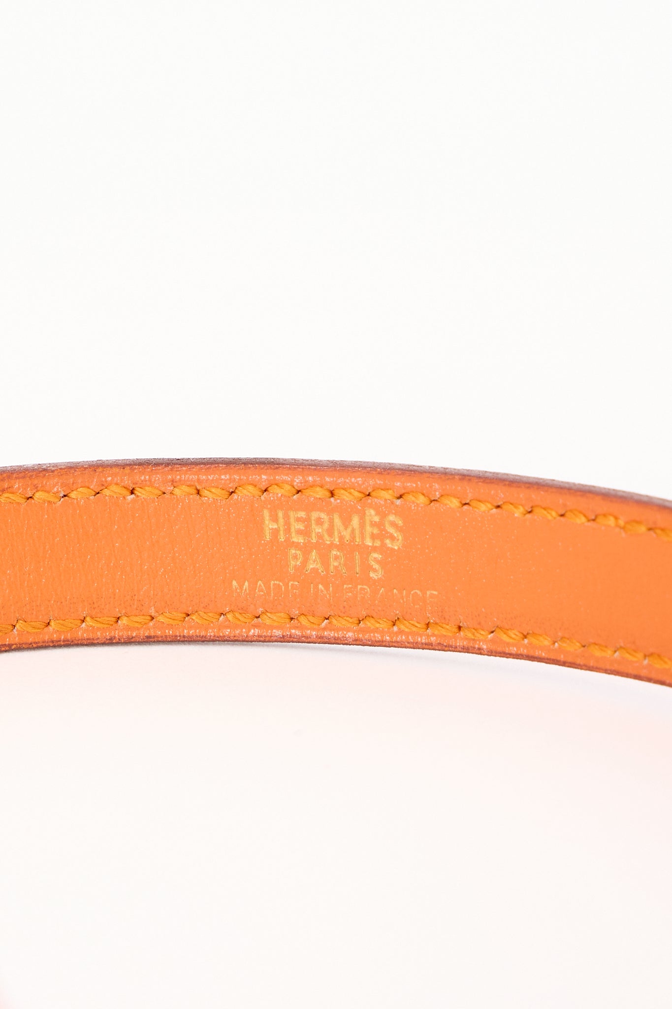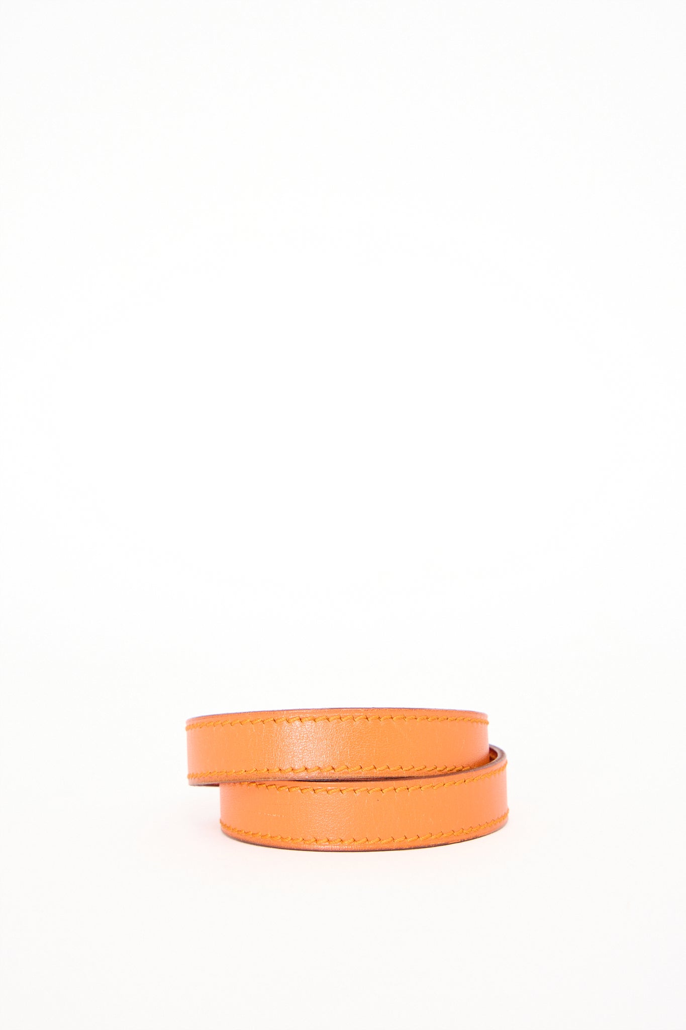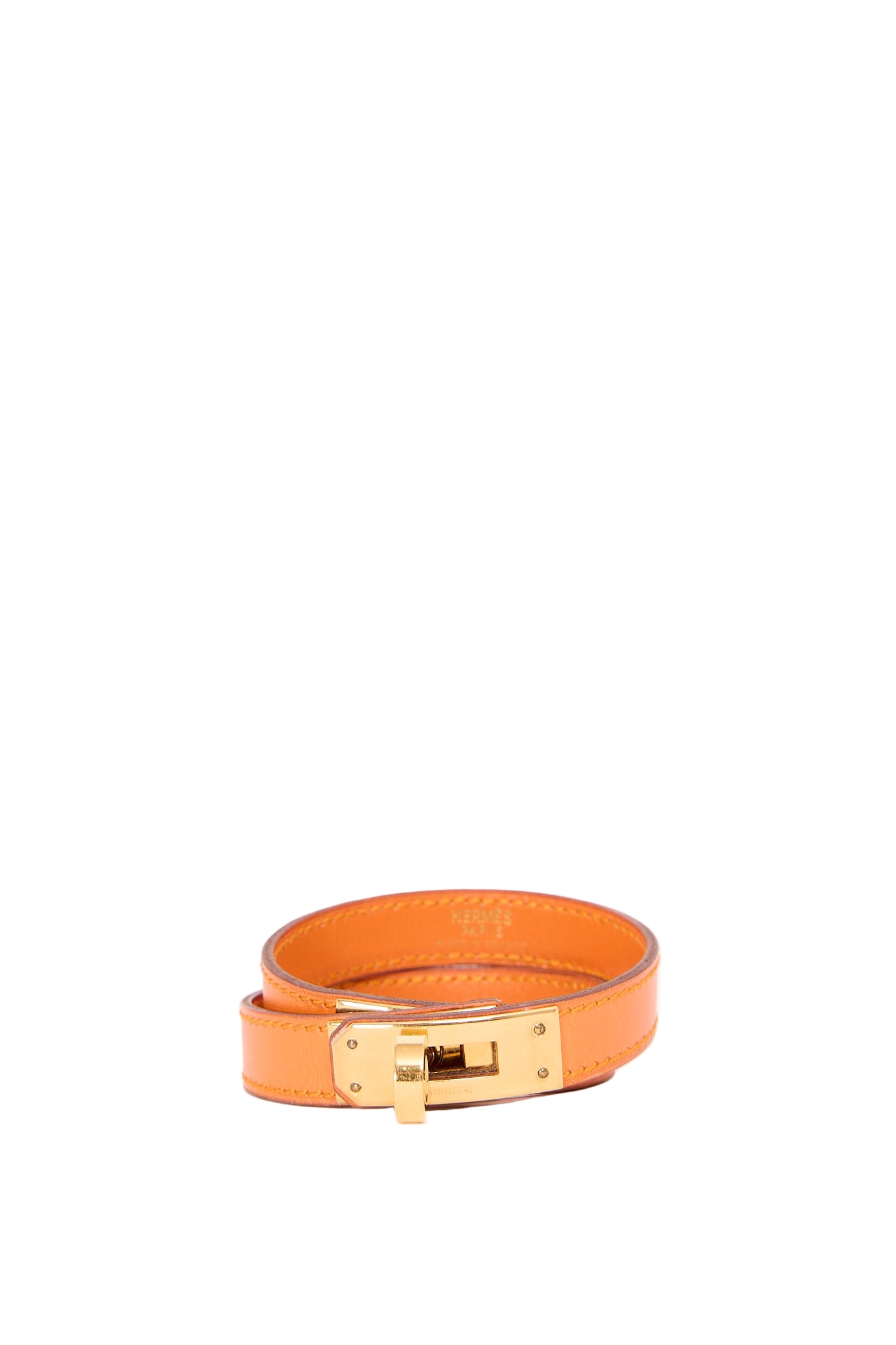 Ikonisk Hermès Kelly Double Tour armbånd i orange læder med guldfarvet lås. Designet henter inspiration fra den legendariske Kelly-taske og snor sig elegant to gange om håndleddet. Et tidløst statement piece, der kombinerer Hermès’ luksuriøse håndværk med diskret elegance.