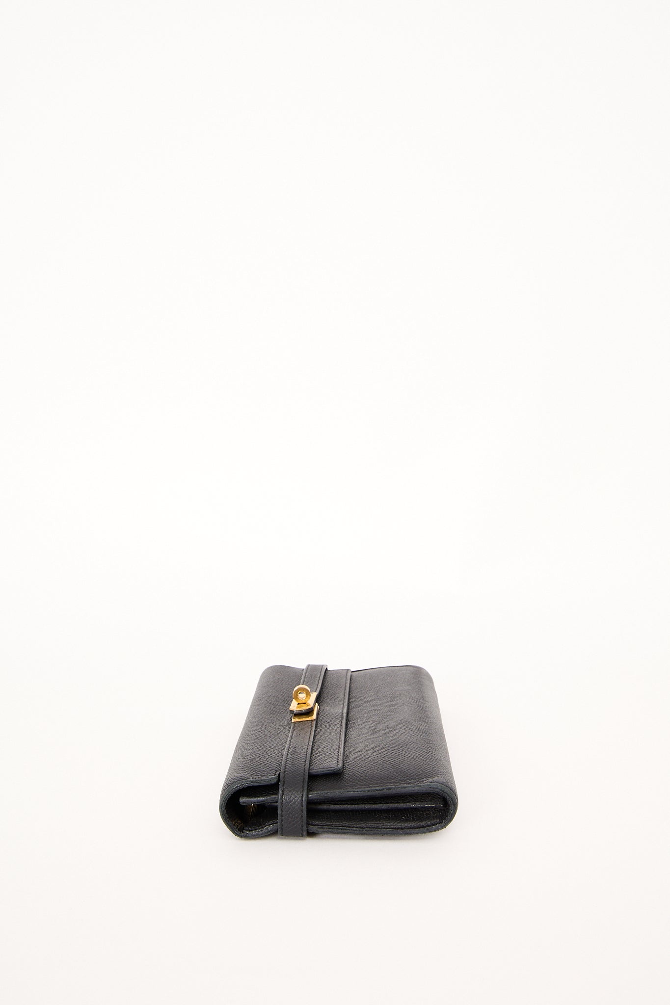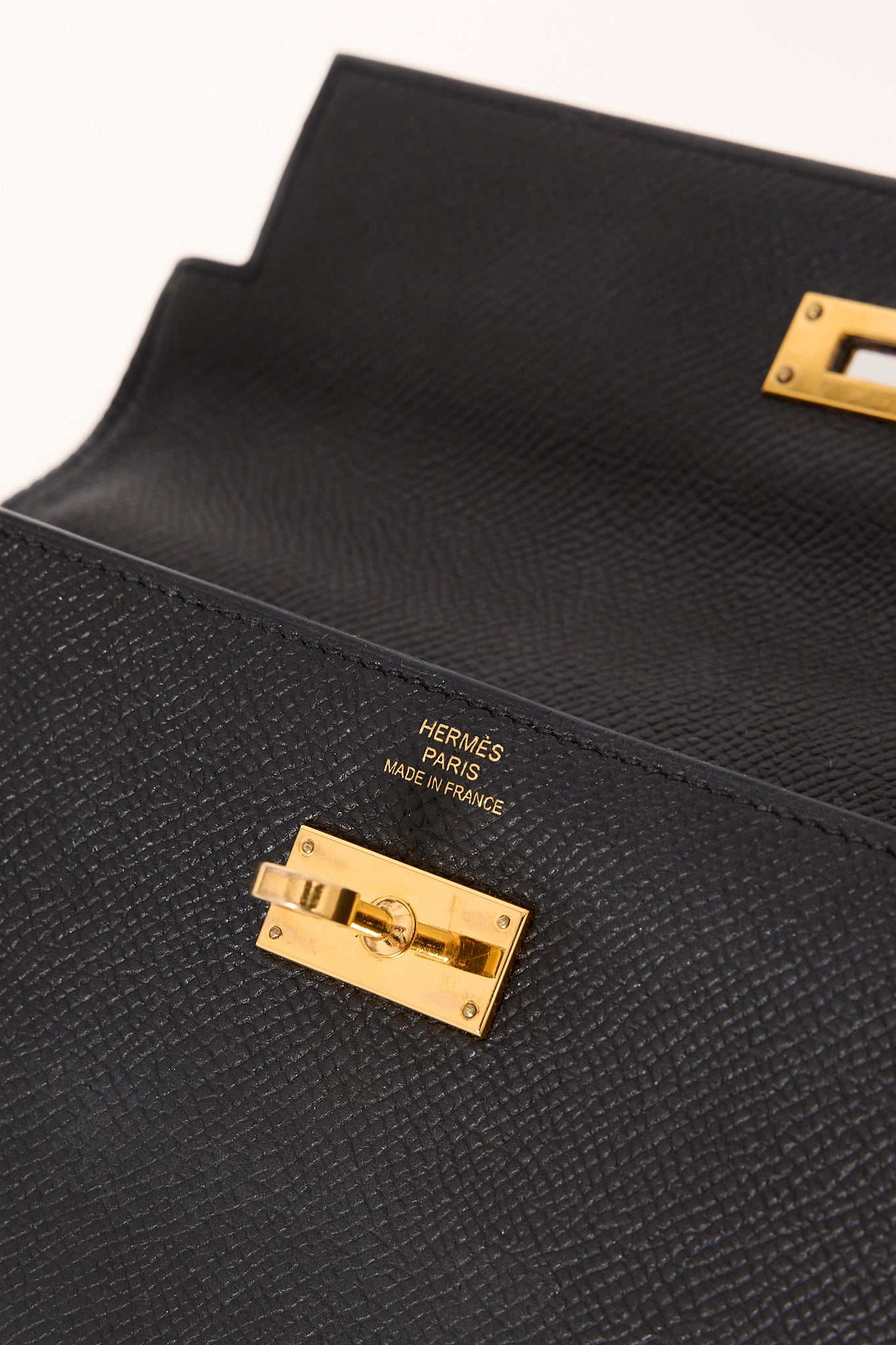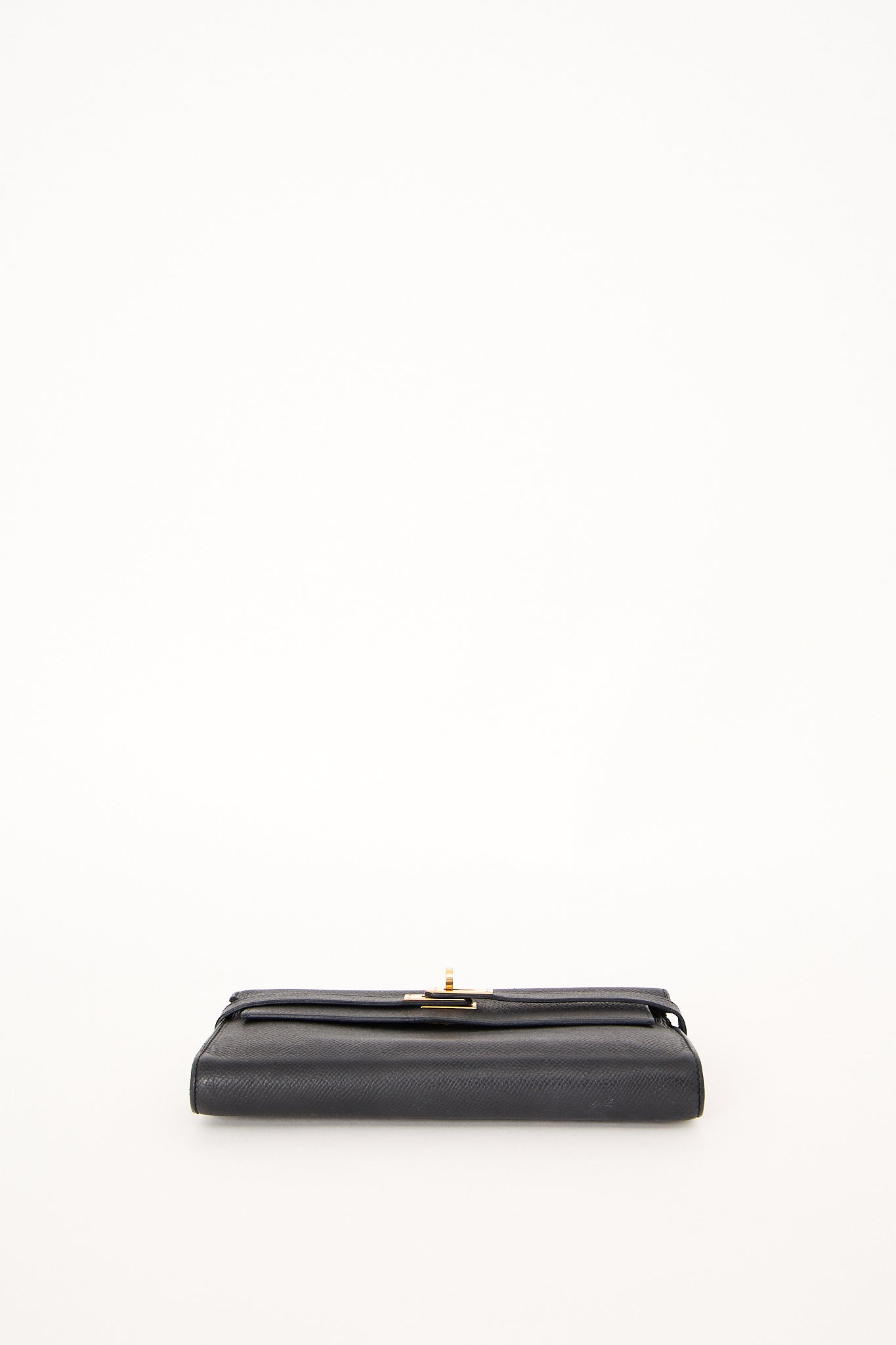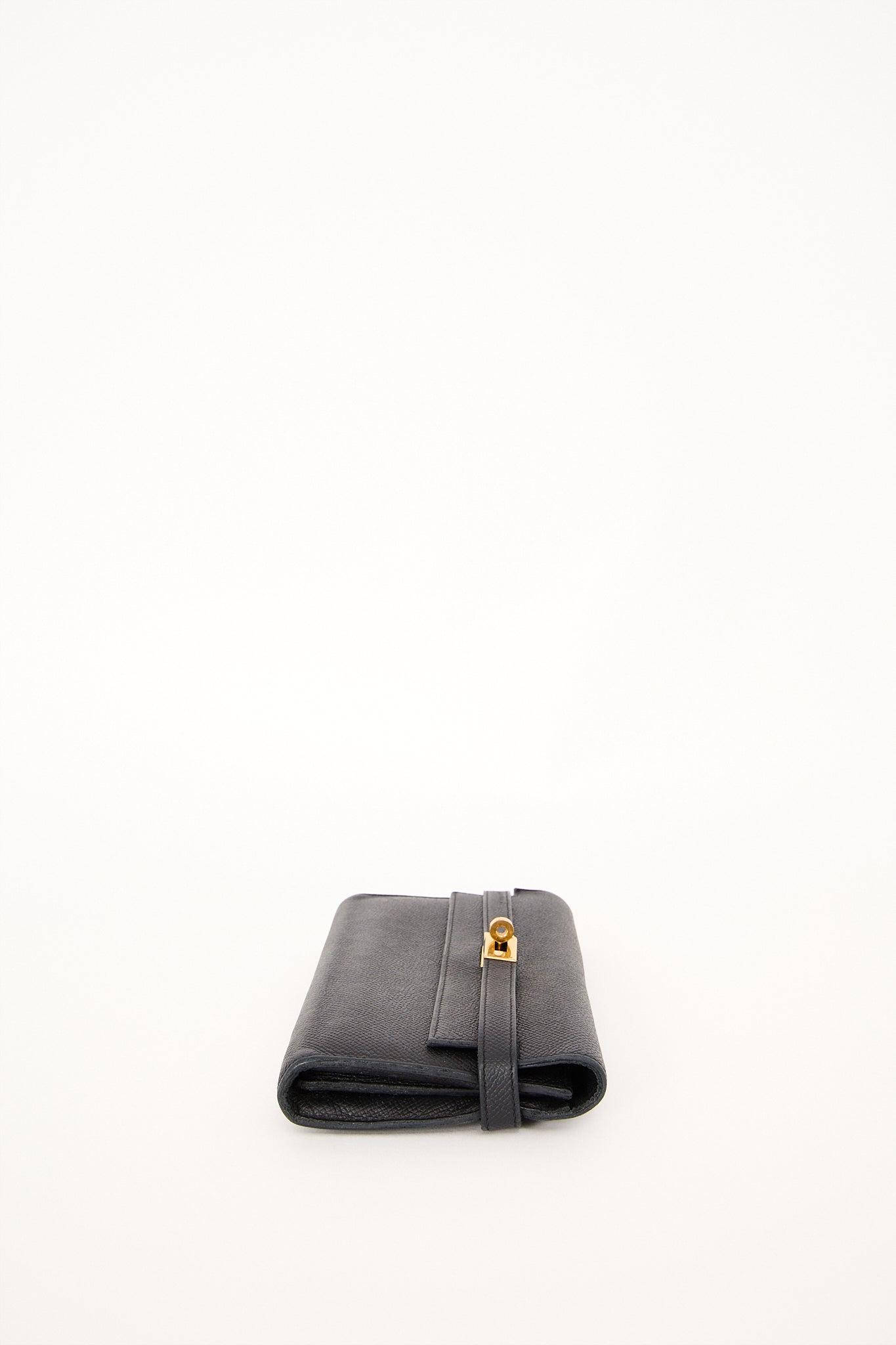 Denne Hermès Kelly Wallet er et ikonisk accessory, der kombinerer luksus og enkel elegance. Den er fremstillet i smukt, struktureret Epsom-læder, som er kendt for sin holdbarhed og skarpe finish. Den klassiske Kelly-lås i guld giver et eksklusivt og genkendeligt Hermès-udtryk. Perfekt som både pung og lille clutch – style den alene til aftener ude eller som et luksuriøst element i din favorit-taske for et sofistikeret look.