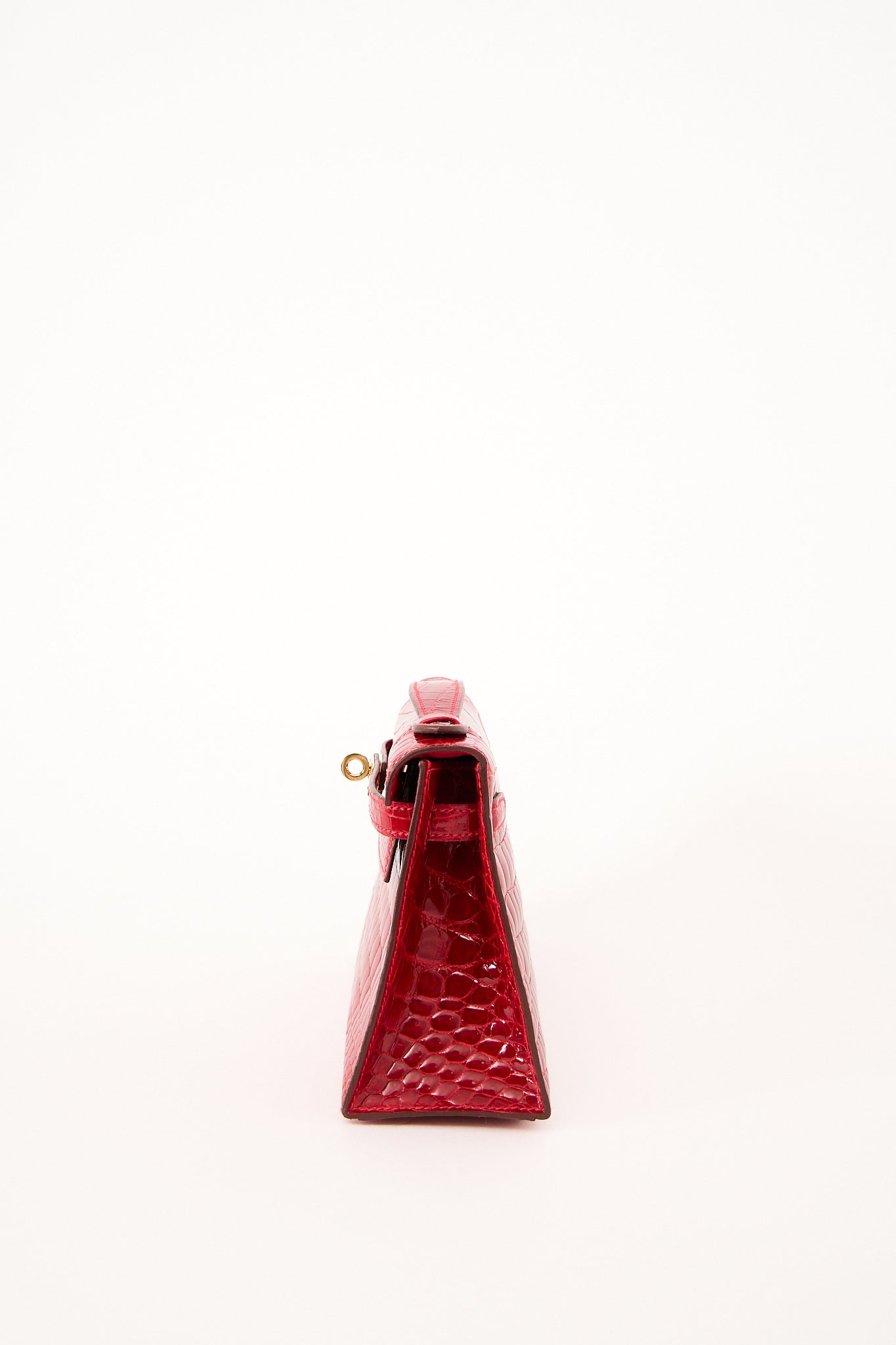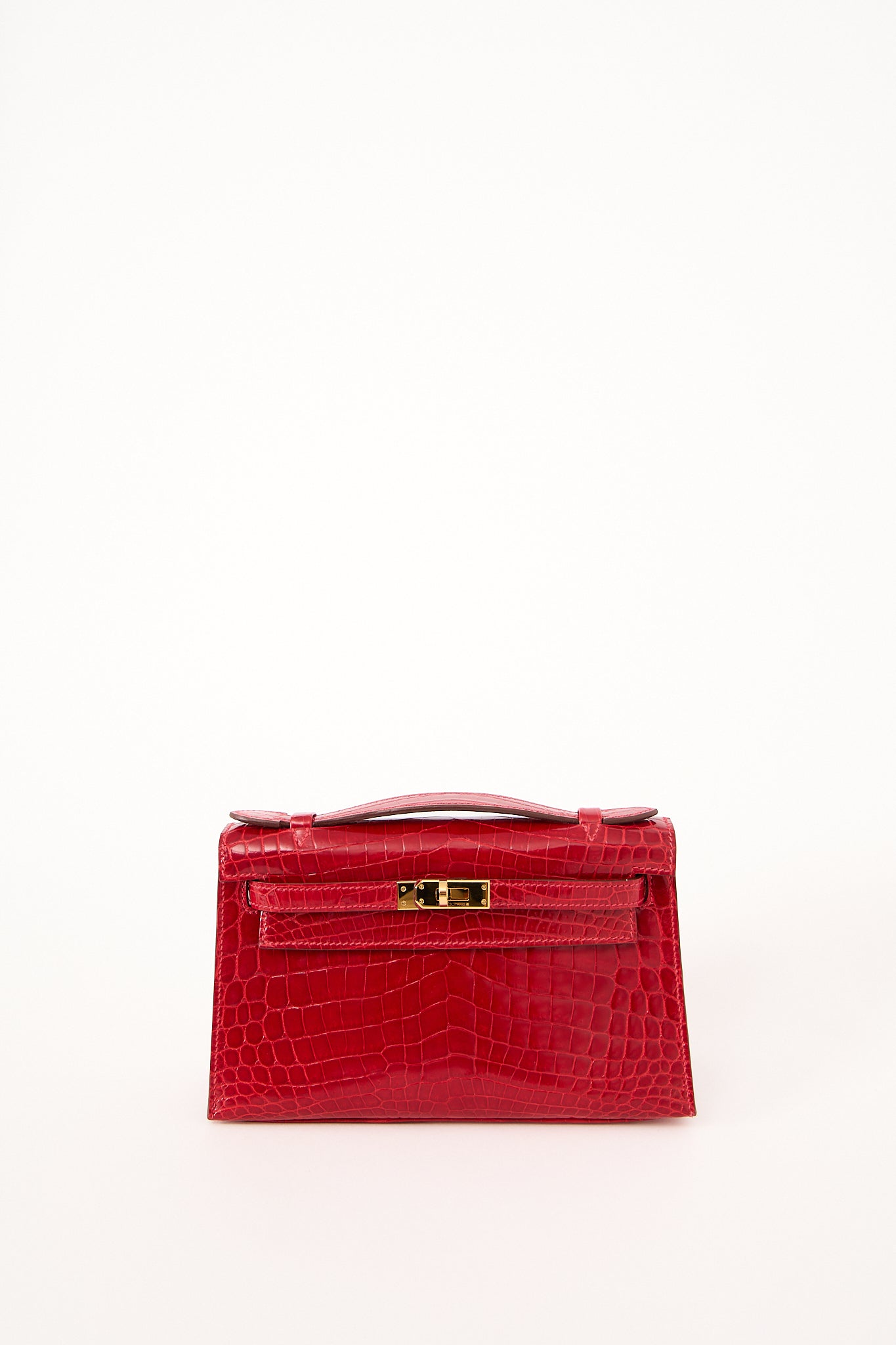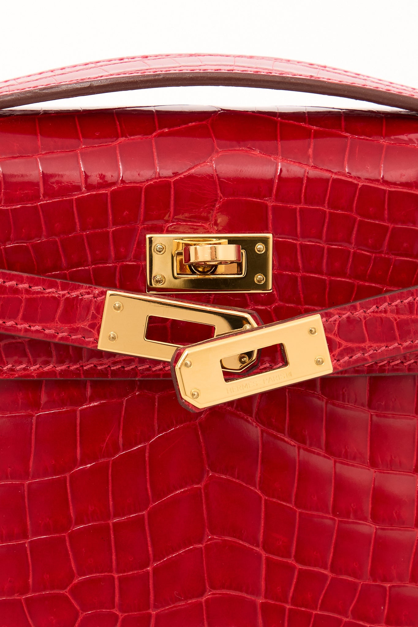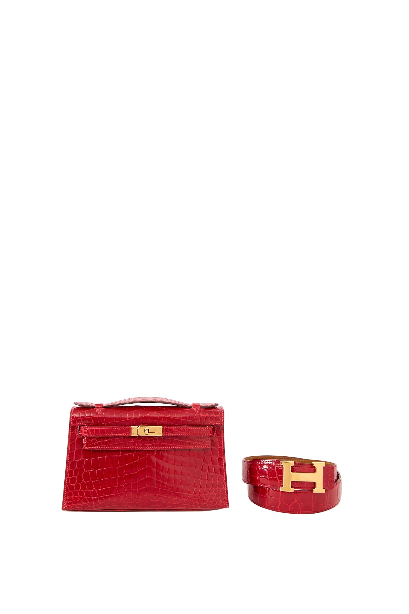 Her får du et sjældent sæt bestående af en Hermès Mini Kelly Pochette fra 2008 i Crocodile Niloticus og et Constance bælte fra 2007 i Crocodile Porosus - begge farven Braise med varmt guld hardware.