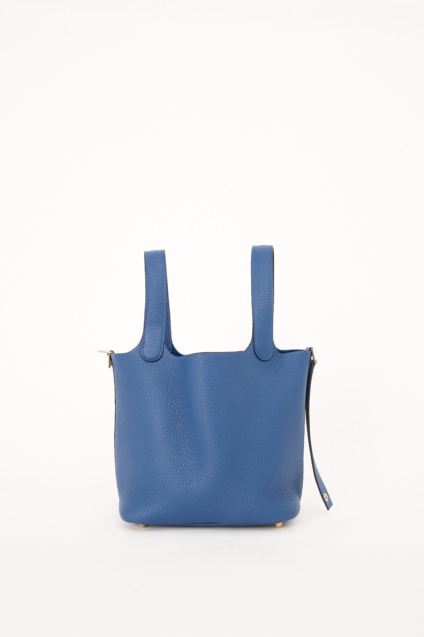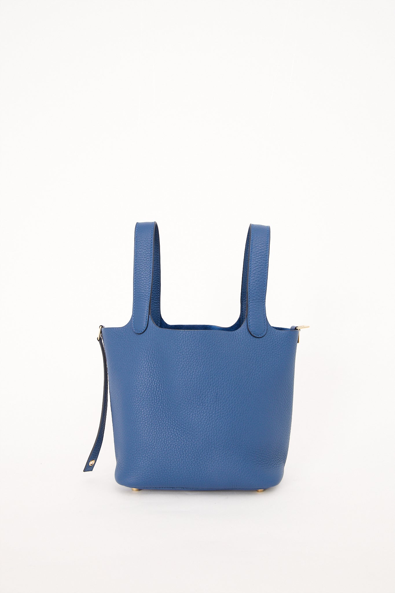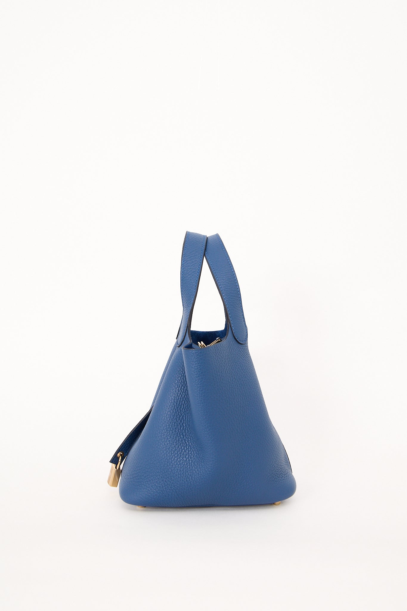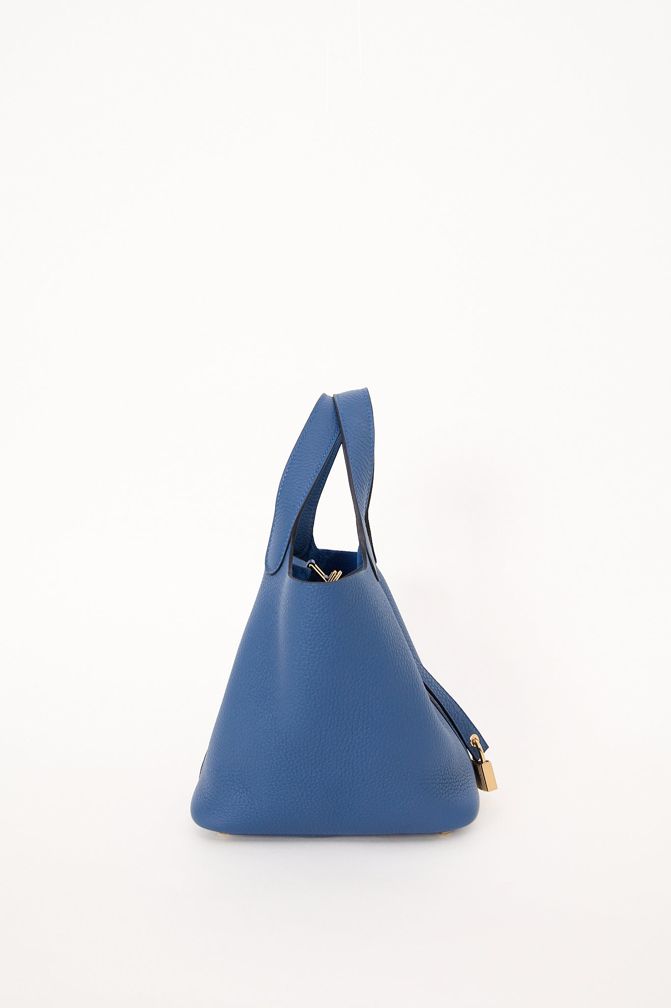 Eksklusiv Hermès Picotin Lock 18 i den smukke farve Blue Tie, udført i blødt og holdbart Clemence-læder med guld hardware. Tasken er kendetegnet ved sit minimalistiske og raffinerede design, der balancerer luksus og funktionalitet på fineste vis. Den ikoniske Picotin-model har et åbent design med lås og nøgle som elegant detalje, og bæres let i hånden eller på underarmen. Et tidløst Hermès-design, der tilføjer et strejf af diskret luksus til enhver garderobe. Der medfølger original æske, dustbag samt lås og nøgle.