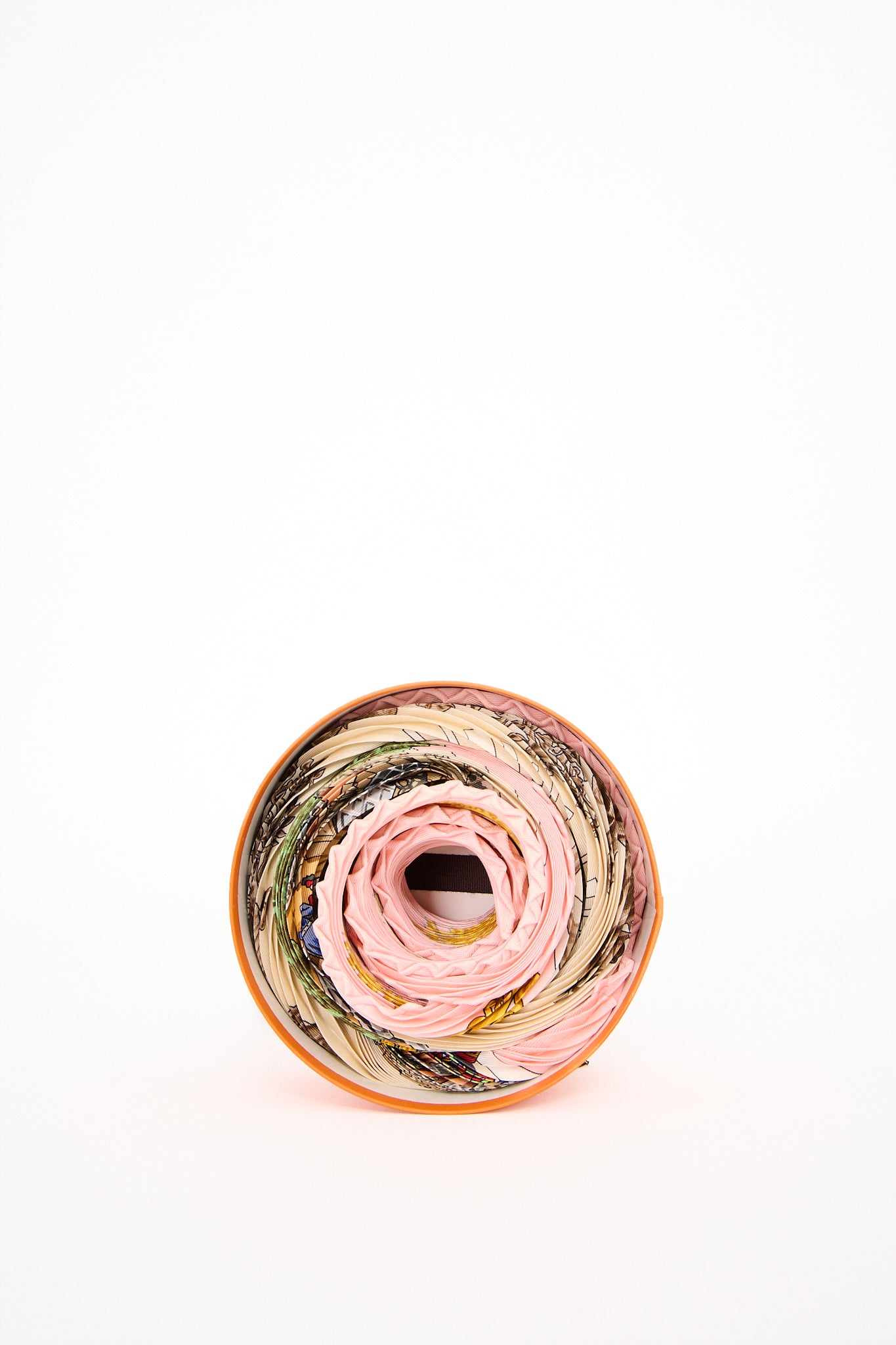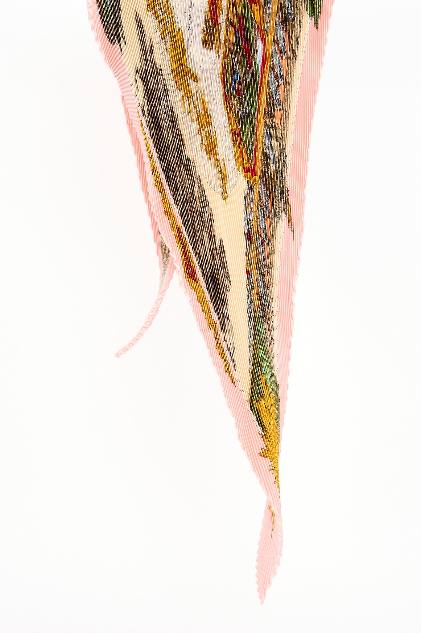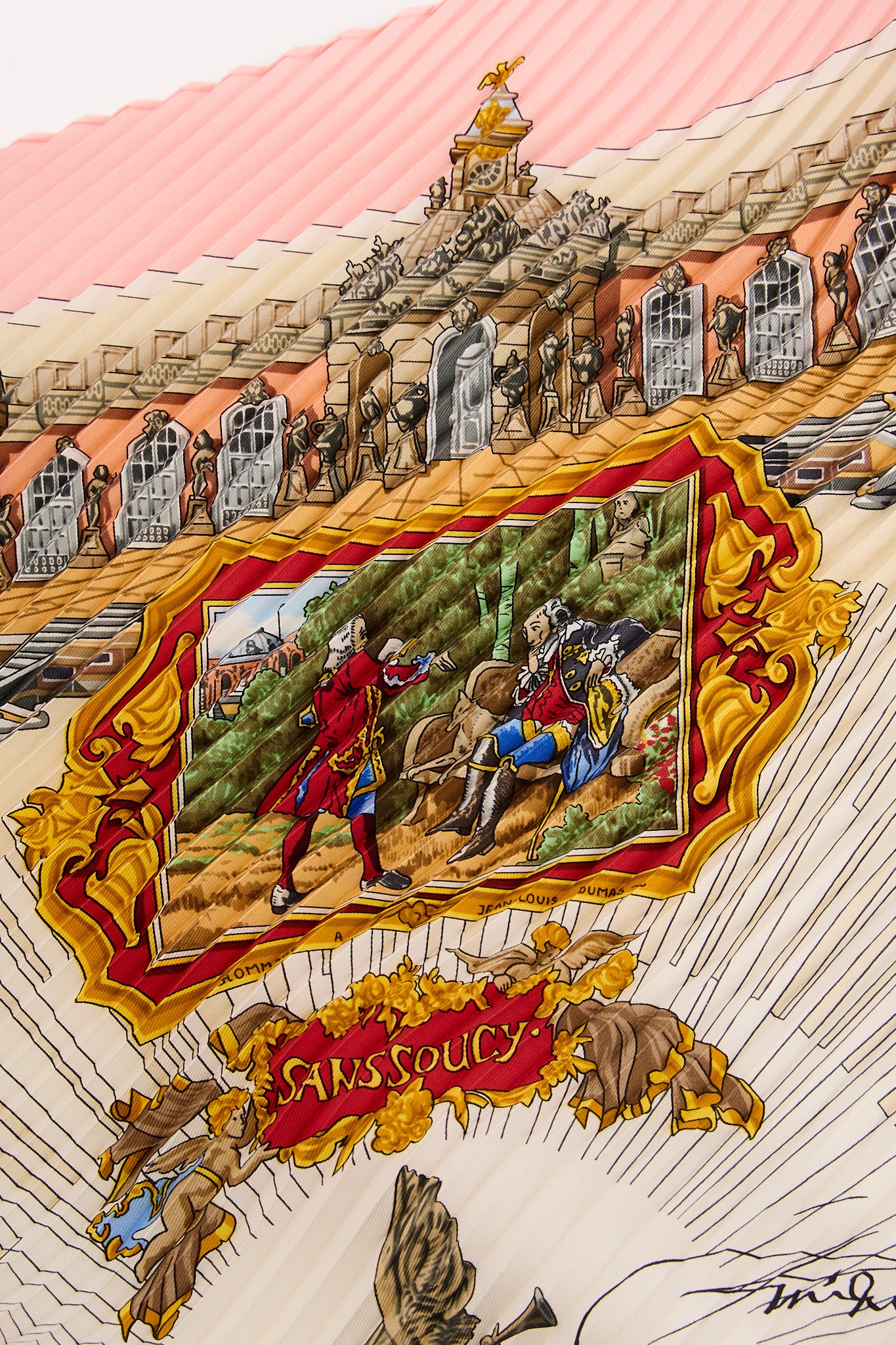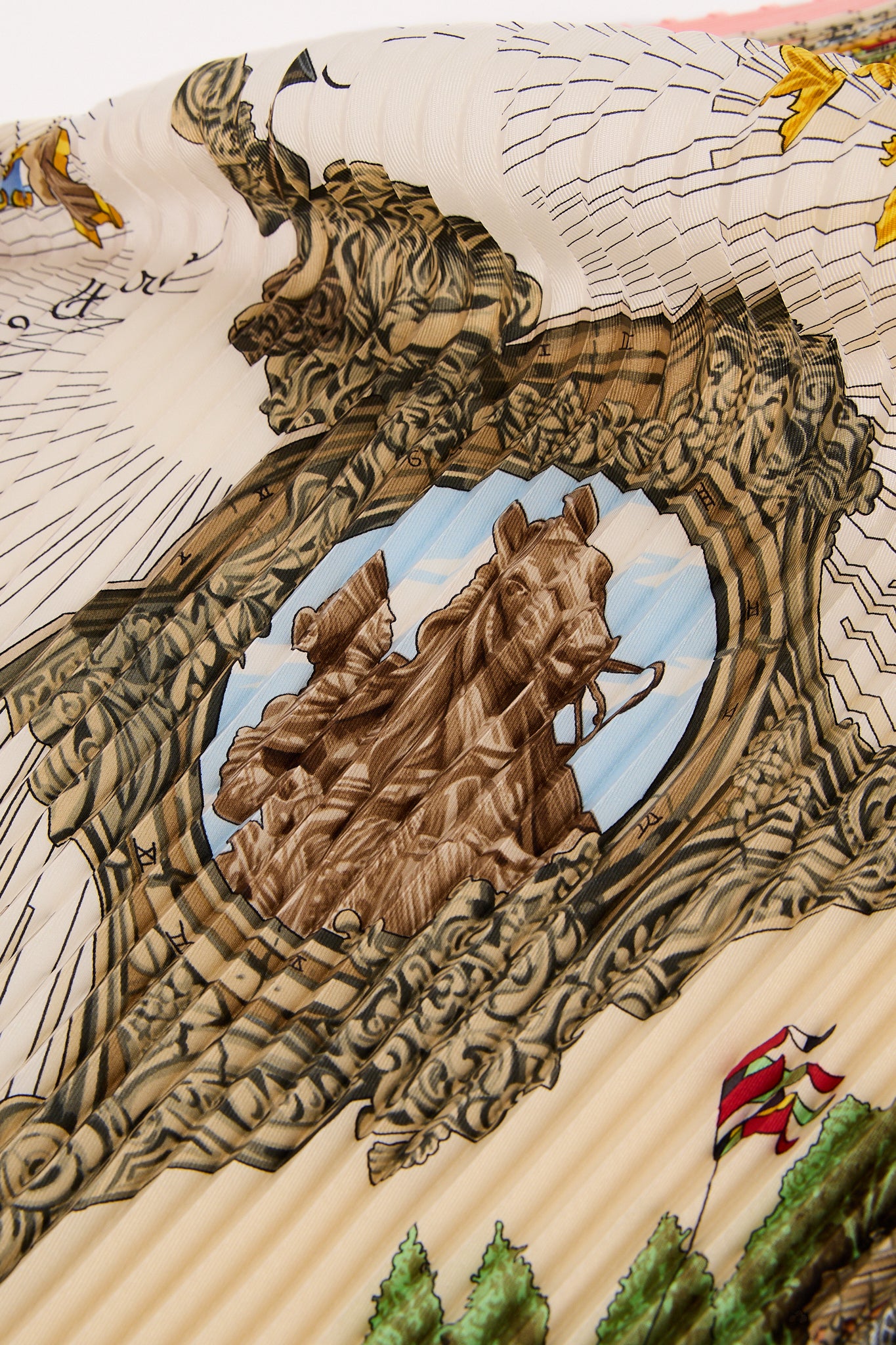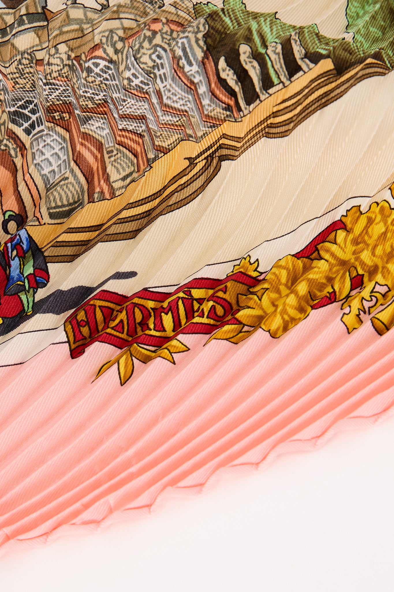 Et eksklusivt Hermès Plissé tørklæde i silke med smukt, detaljeret motiv og delikat rosa kant. Det plisserede design giver et unikt, tredimensionelt udtryk, der tilfører elegance og bevægelse til ethvert outfit.