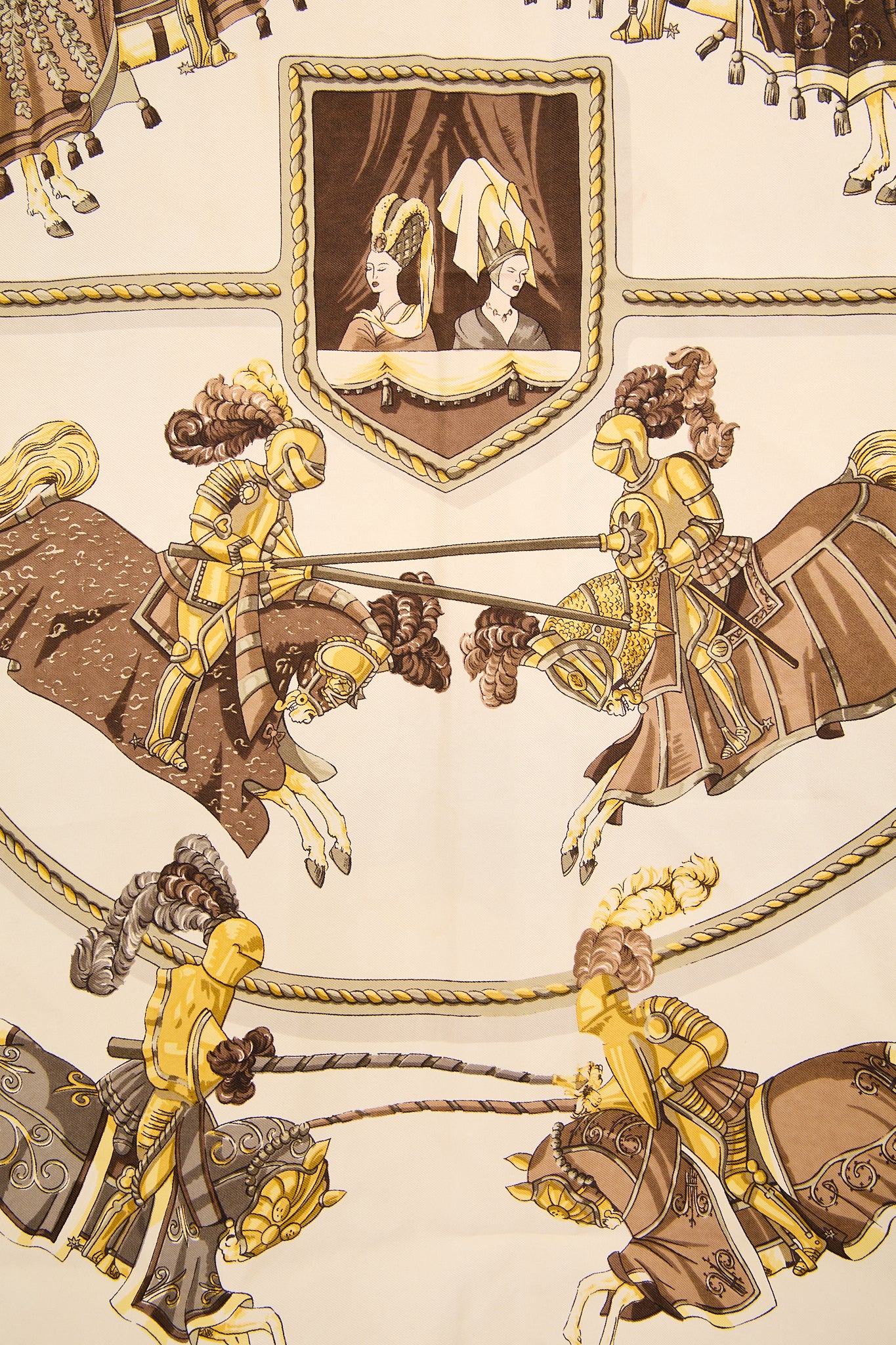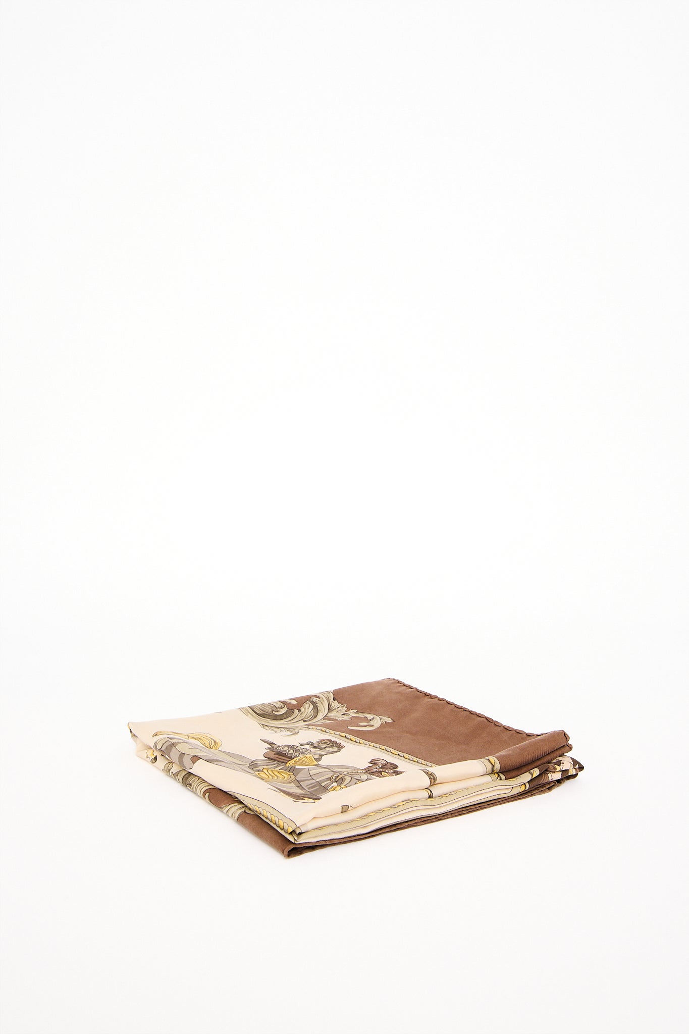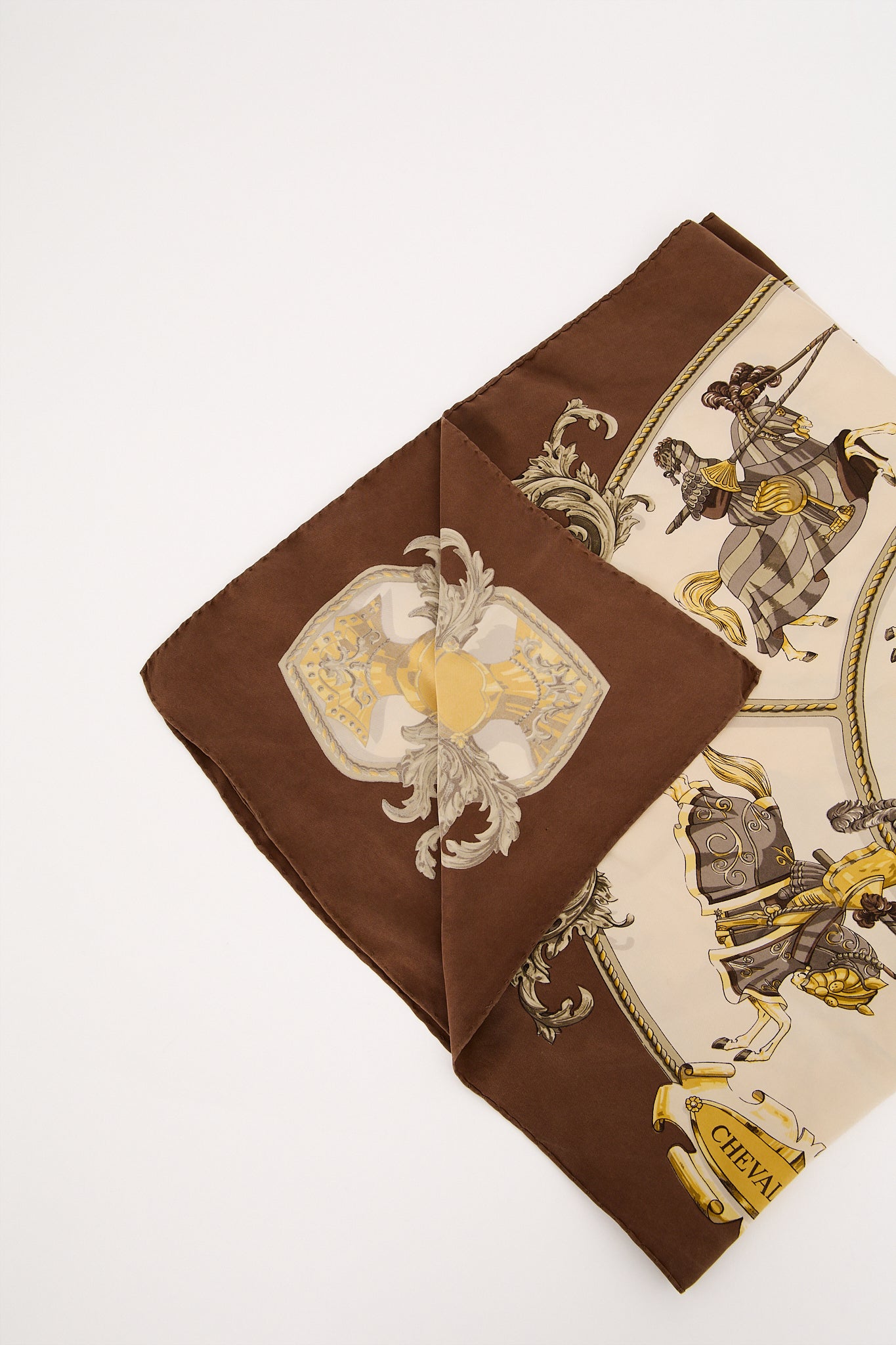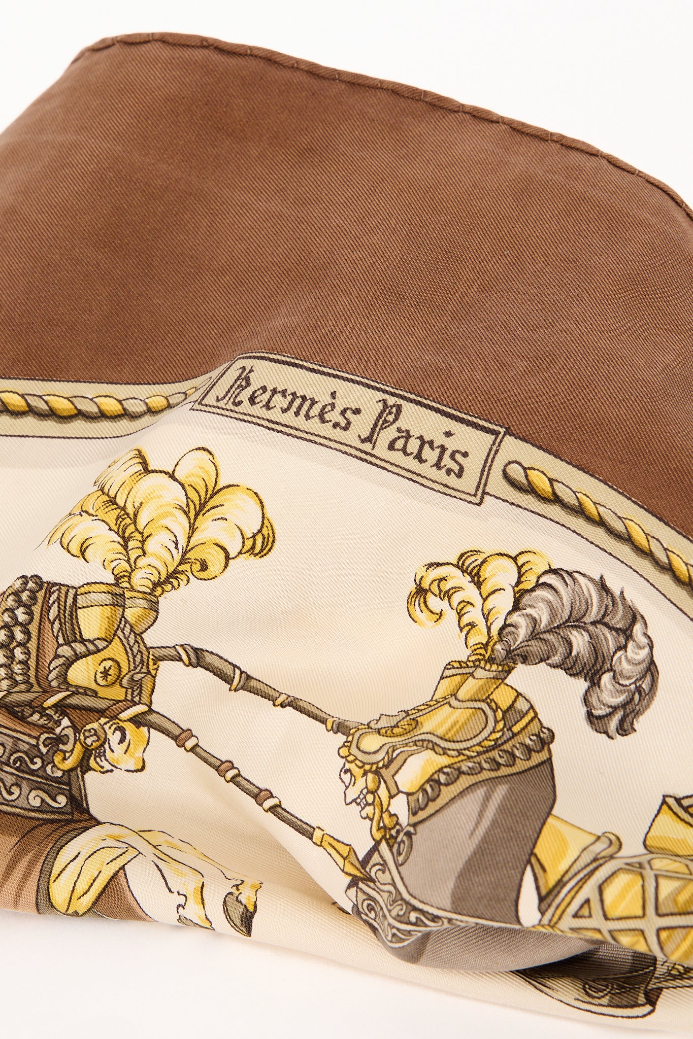 Et eksklusivt Hermès silketørklæde i det ikoniske carré-format, prydet med et klassisk equestrian-motiv – inspireret af sadler, reb og seletøj, som er et gennemgående tema i husets designhistorie. Farvepaletten i varme brune og gyldne nuancer giver tørklædet et elegant og tidløst udtryk, perfekt til både hverdags- og aftenbrug.