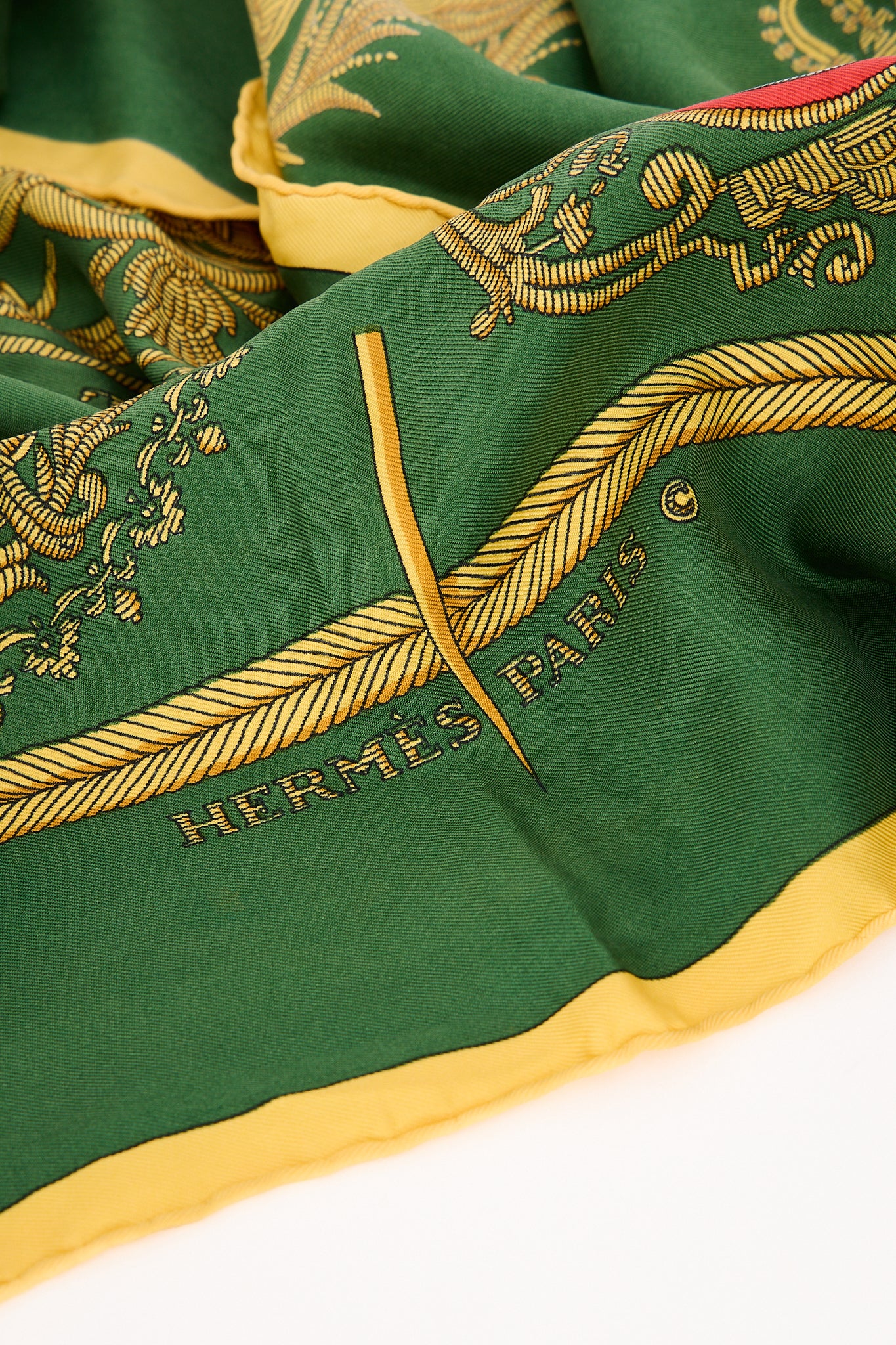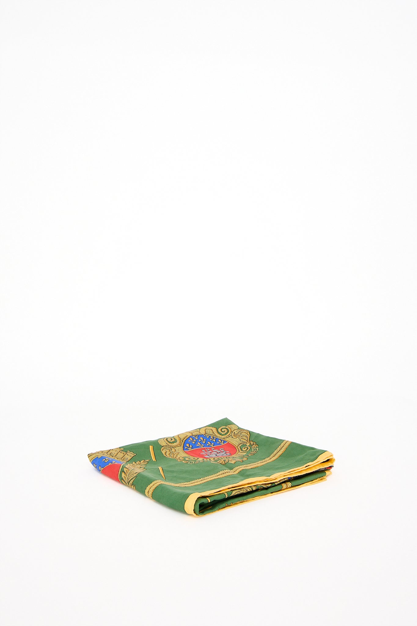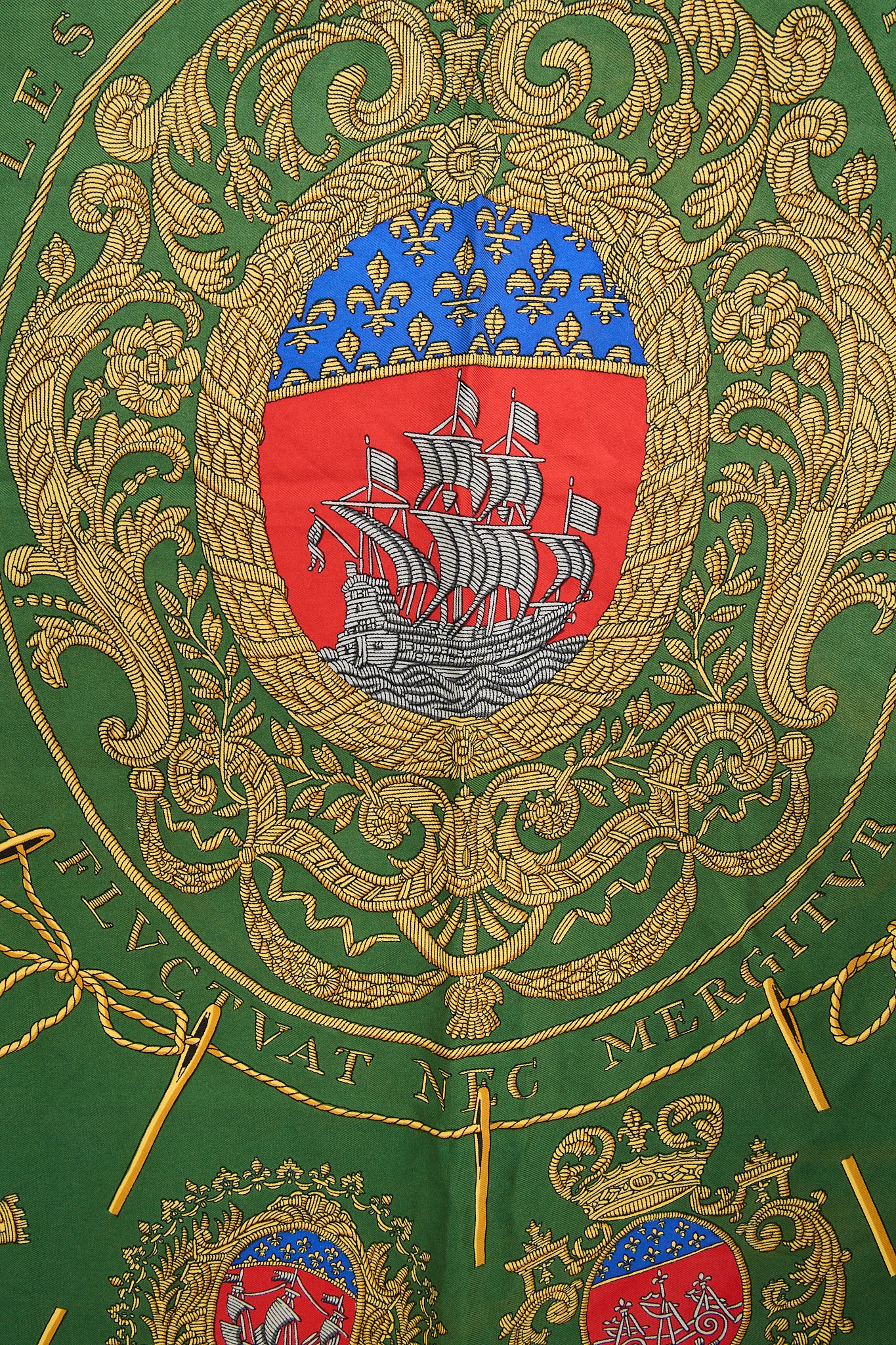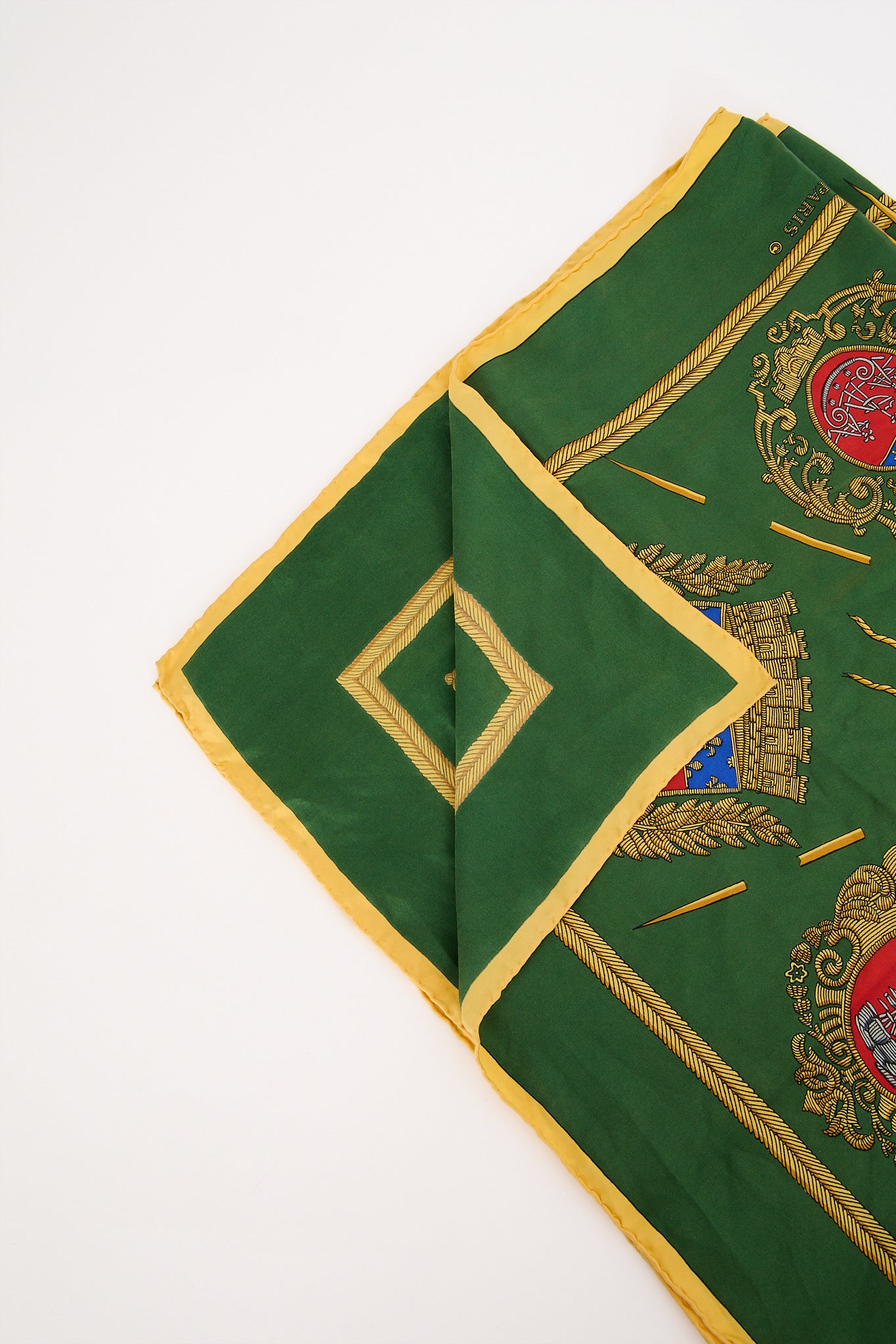 Eksklusivt vintage Hermès silketørklæde i designet Armes de Paris, et ikonisk motiv skabt af Hermès’ egne kunstnere. Tørklædet er udført i dyb grøn silke med gyldne og røde våbenskjolde, der symboliserer Paris’ historiske adel og maritime arv. Et sandt samlerobjekt, der udstråler klassisk fransk elegance – perfekt bundet om halsen, i håret eller som accessory til tasken.