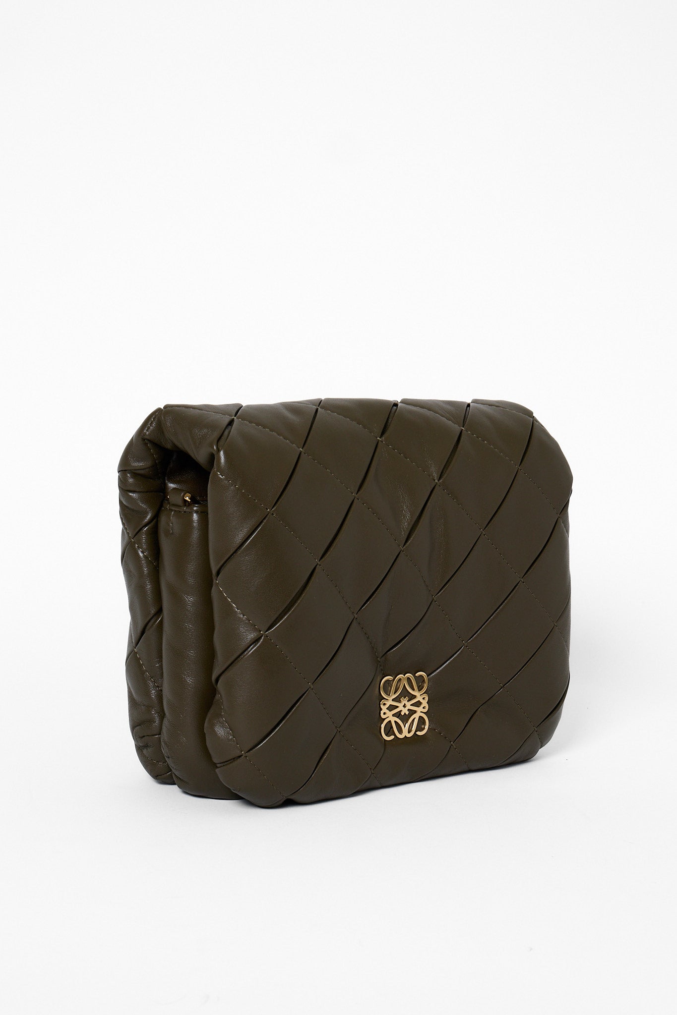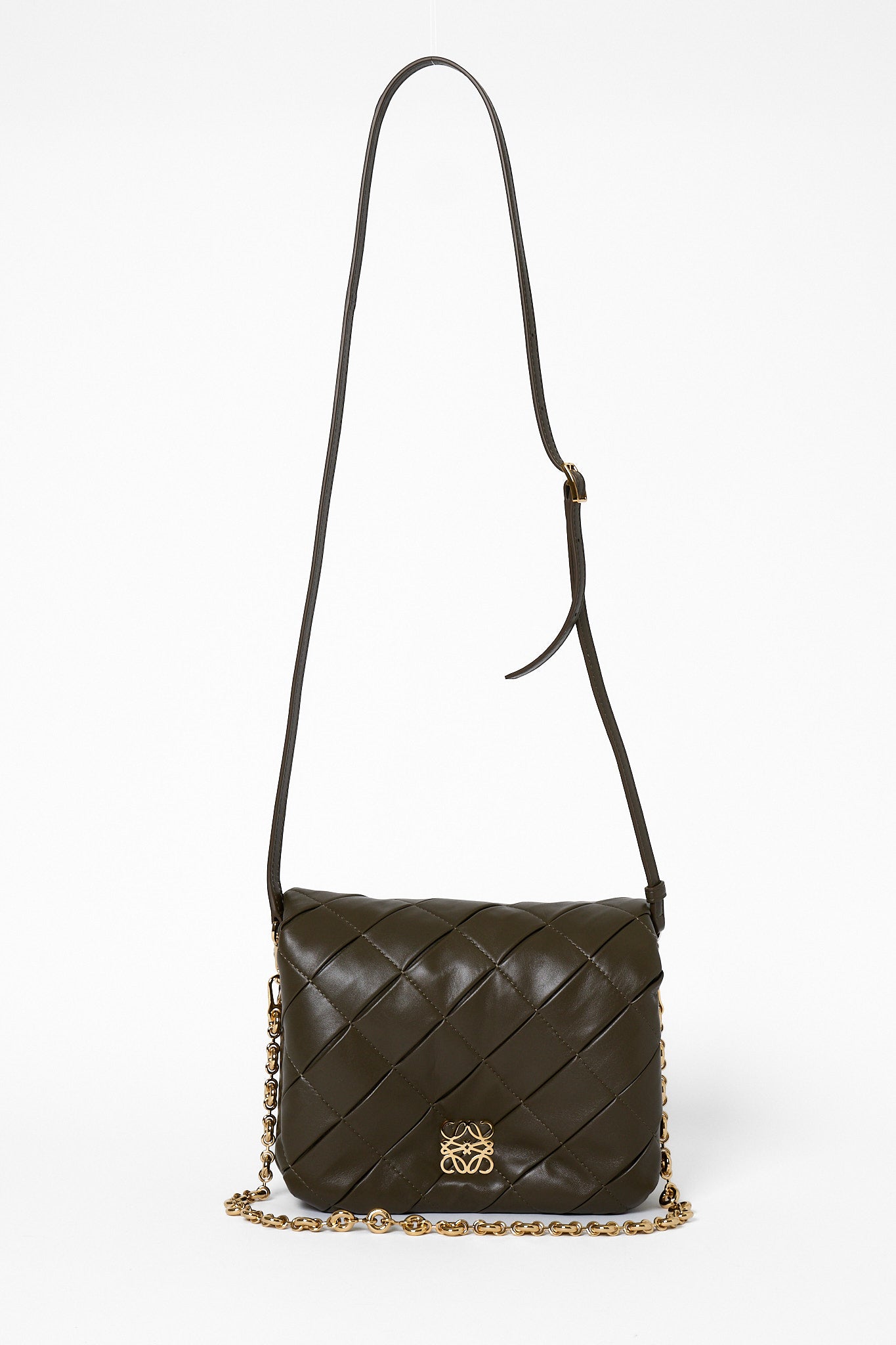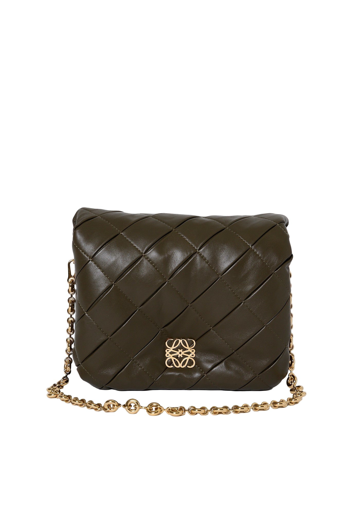 Blød luksus og moderne elegance mødes i Loewe Goya Puffer i olivengrønt nappalæder. Den quiltede silhuet og kæderemmen i guldfarvet metal giver tasken et sofistikeret, men samtidig afslappet udtryk. Forsynet med det ikoniske Anagram-logo foran – et symbol på Loewe’s håndværk og tidløse design. Perfekt som crossbody eller skuldertaske til både dag og aften.