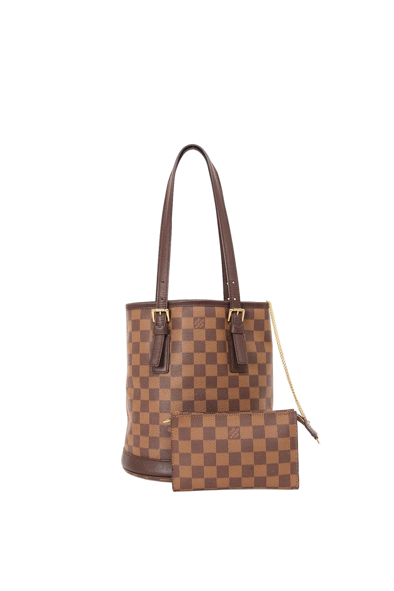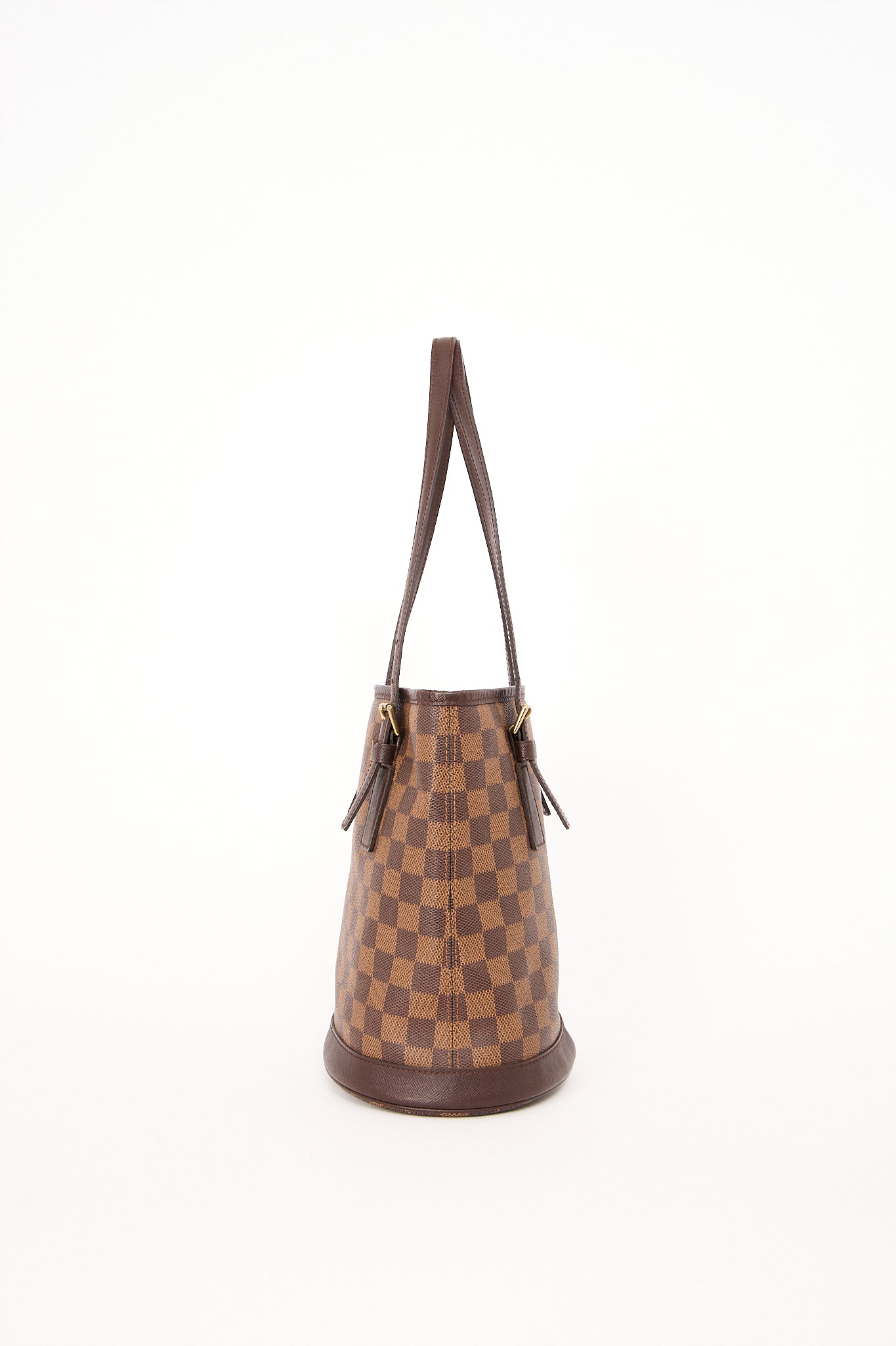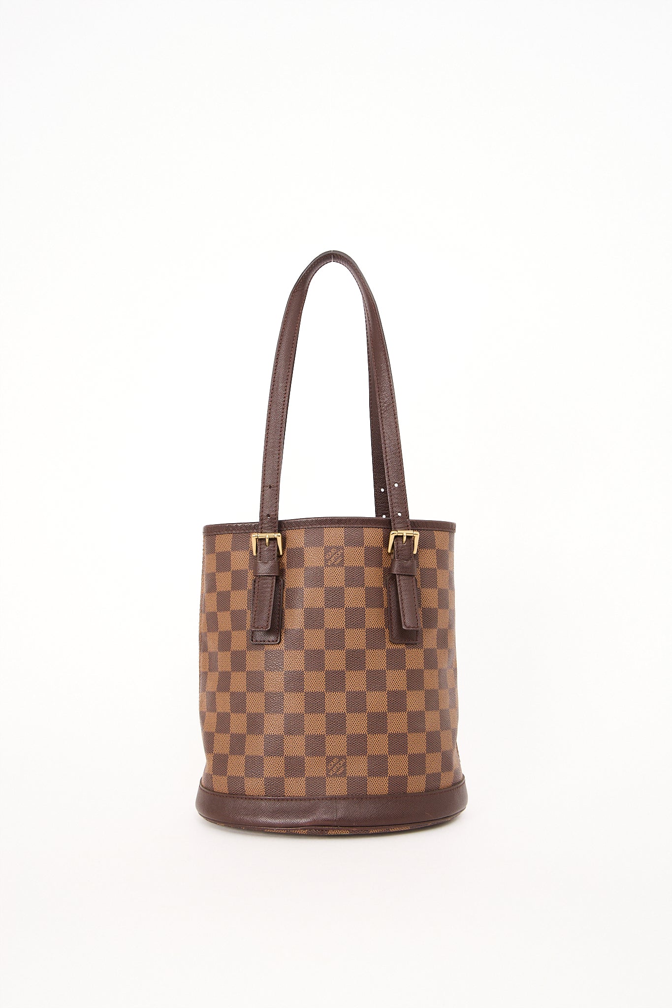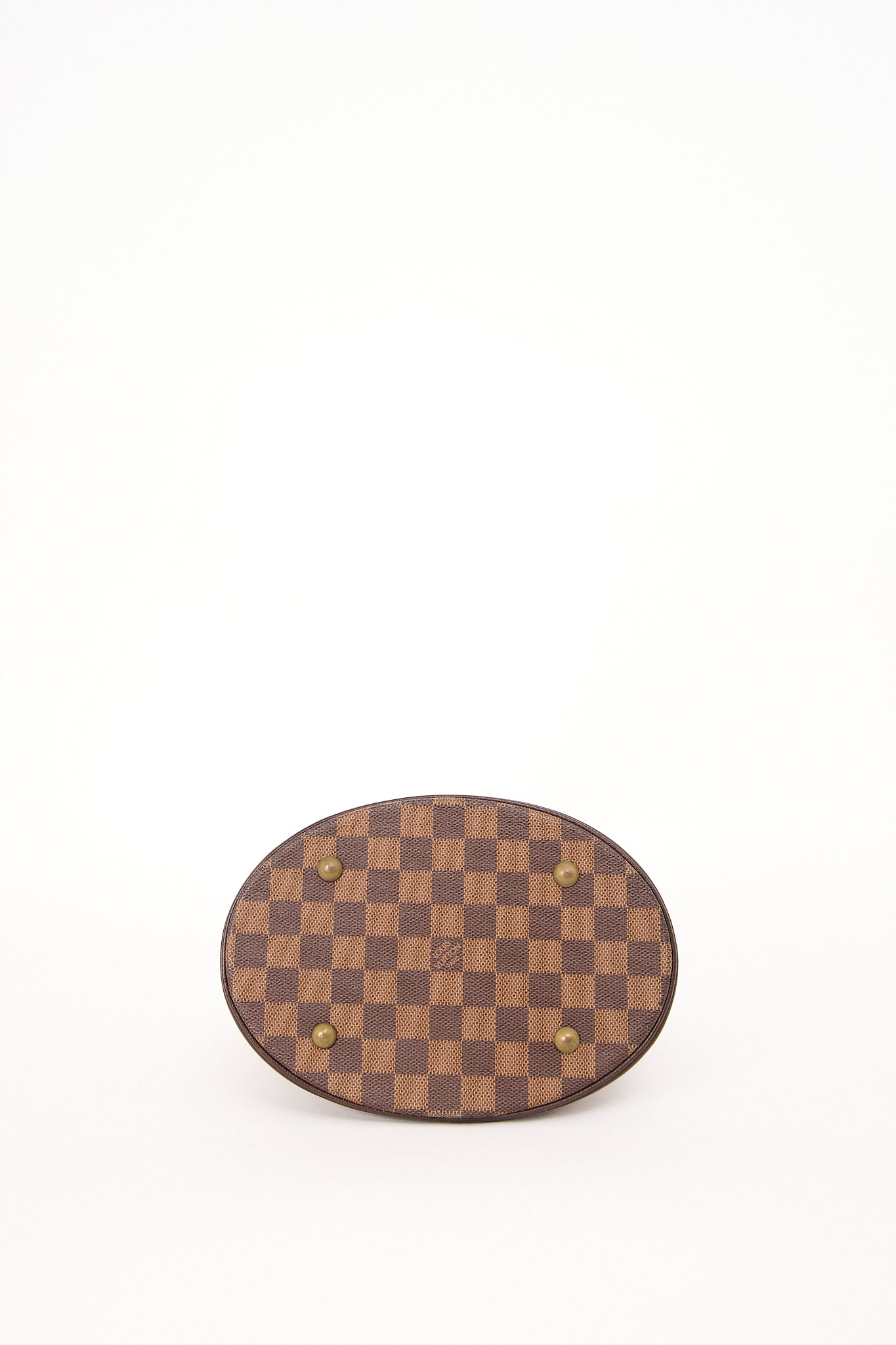 Klassisk Louis Vuitton bucket tote i tidløst Damier Ebene-canvas med mørke læderstropper og guldfarvede spænder. En elegant og praktisk skuldertaske med et mere diskret LV-udtryk, der passer perfekt til både hverdag og arbejde. Den cylinder-/bucket-inspirerede form giver et flot fald og god anvendelighed, mens Damier Ebene er kendt for sin slidstyrke og for at holde sig pæn over tid.