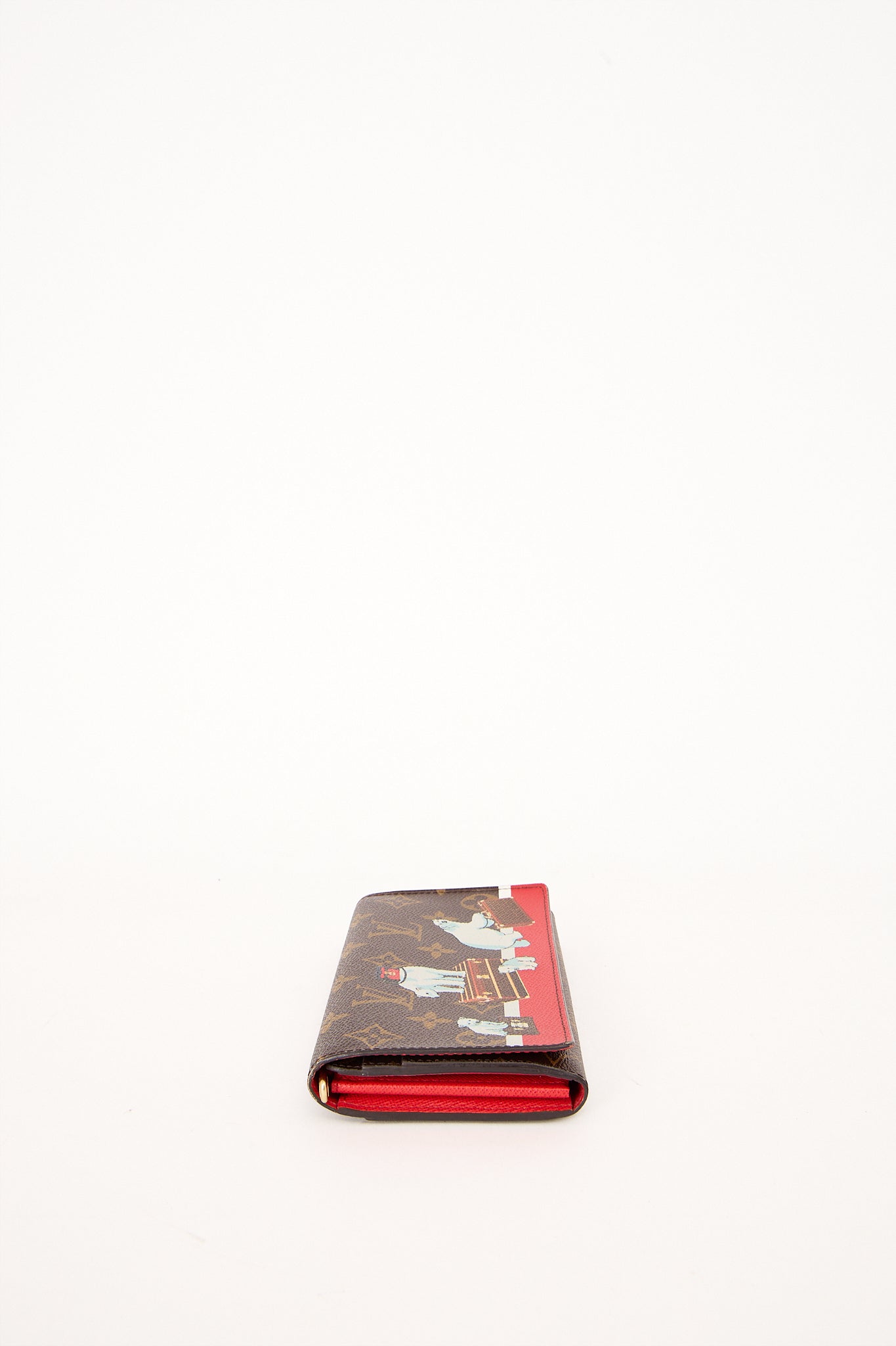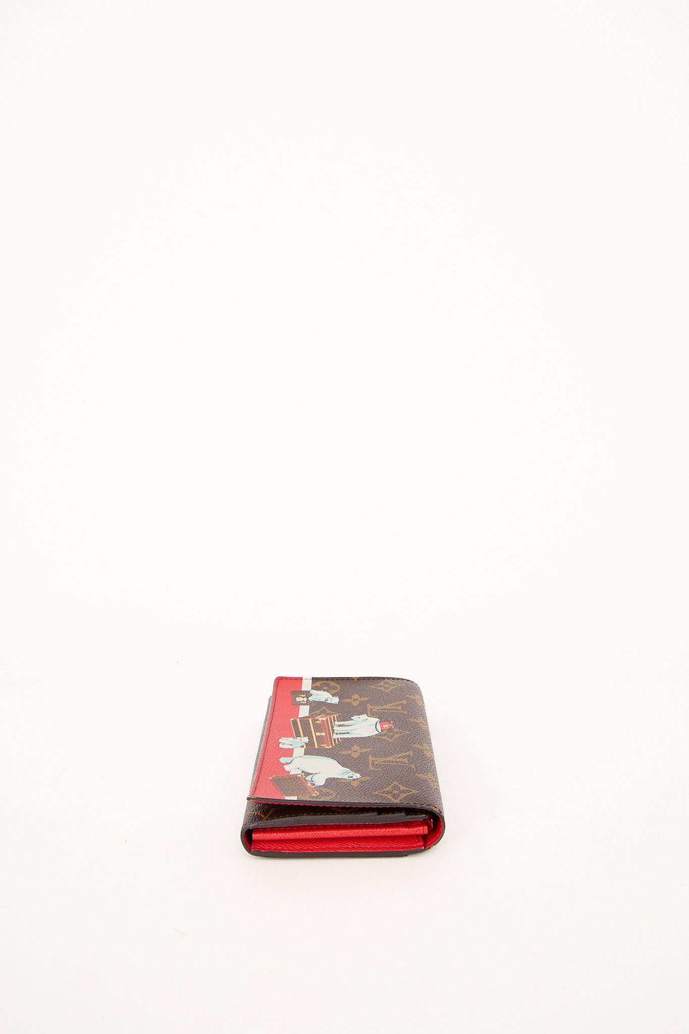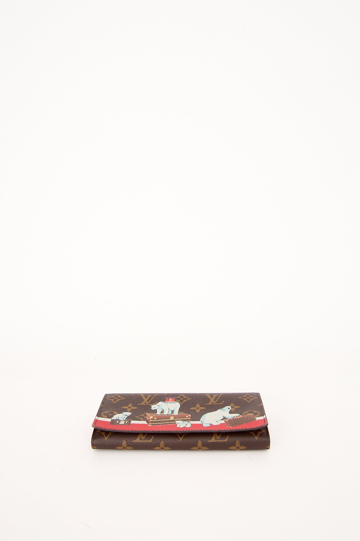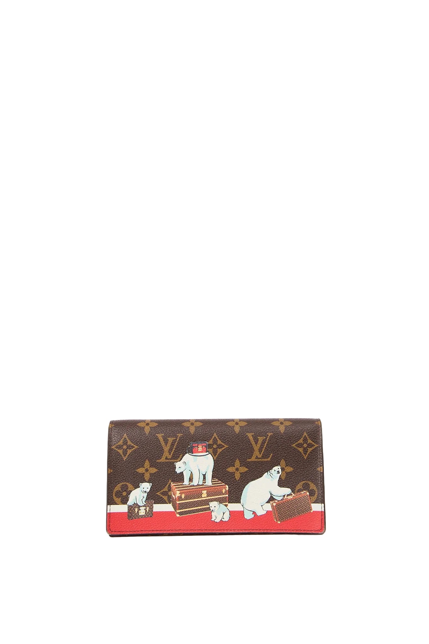 Denne sjældne Louis Vuitton pung er en del af en Limited Edition kollektion med det ikoniske monogram canvas og et legende print af isbjørne og Louis Vuitton-kufferter. Et samlerobjekt for den modebevidste – både elegant og iøjnefaldende. Pungen har praktisk klaplukning og plads til kort, sedler og mønter.