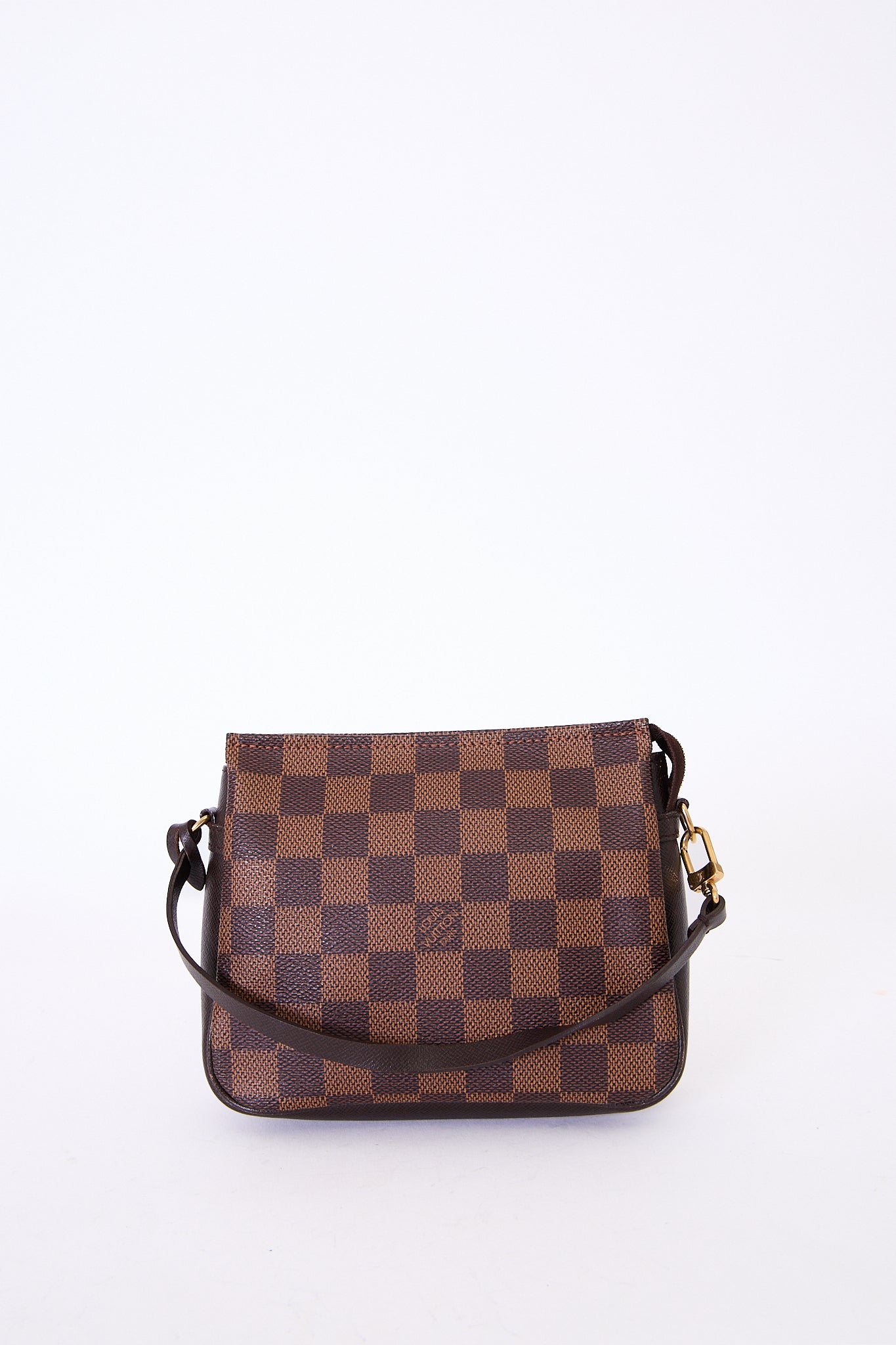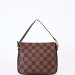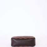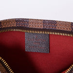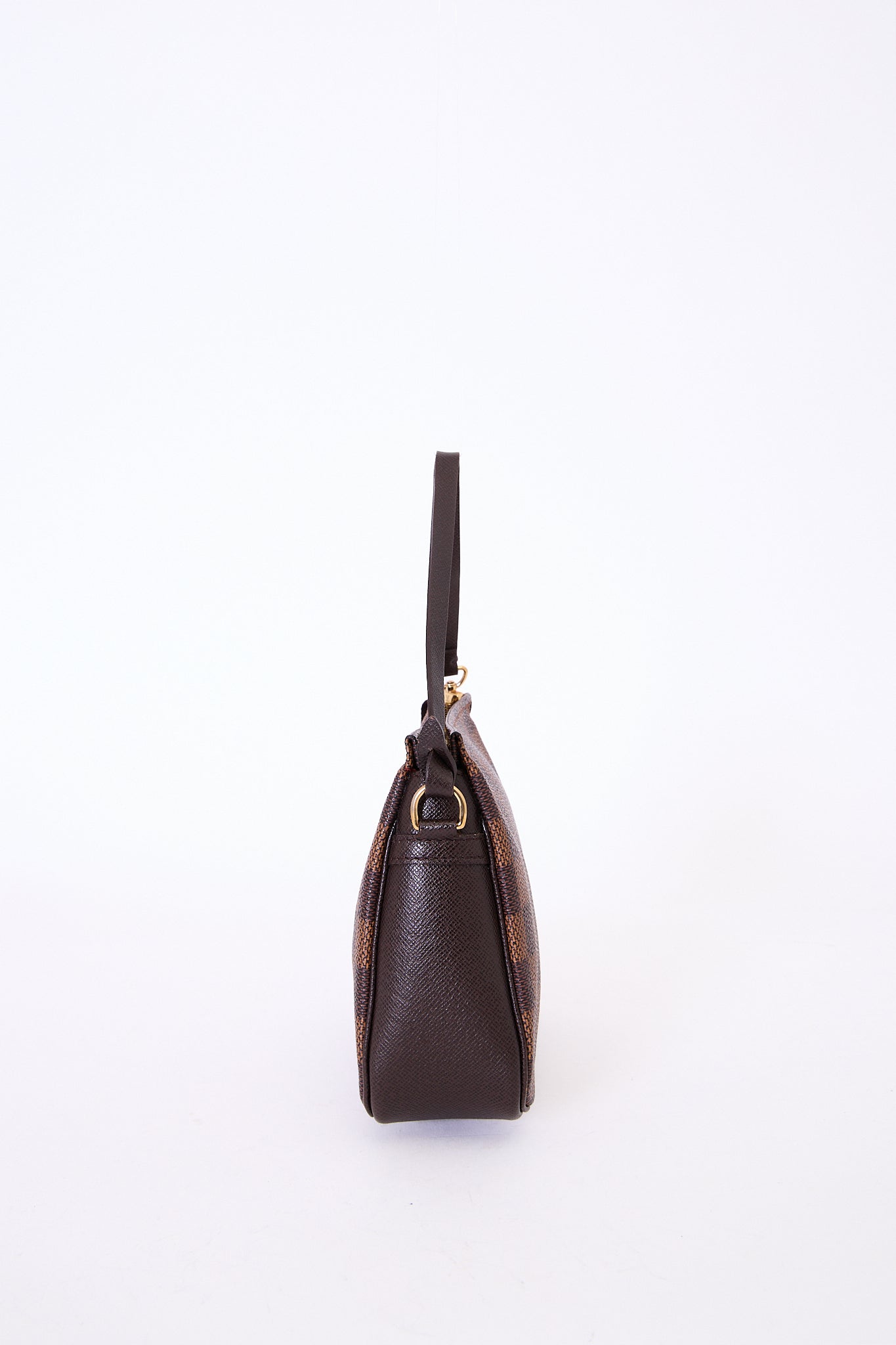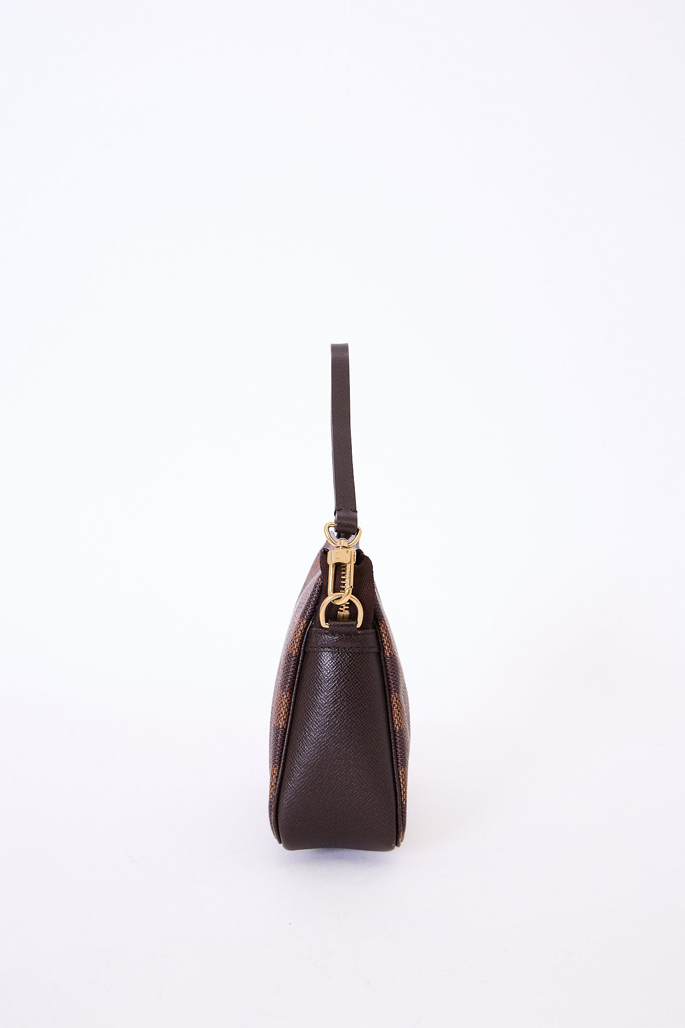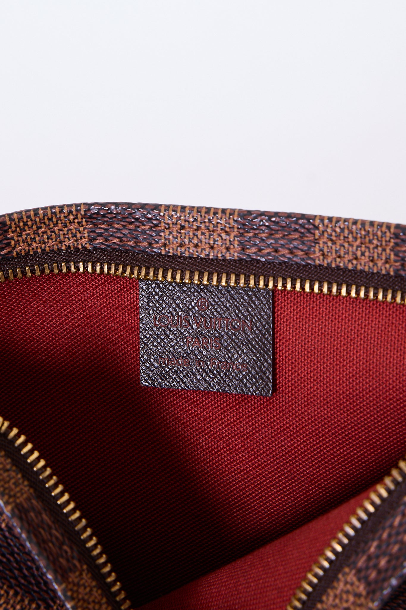 Tidløs Louis Vuitton Eva taske i det karakteristiske Damier Ebene-canvas med mørkebrune læderdetaljer og gyldent hardware. Et elegant og funktionelt design, der kombinerer klassisk parisisk stil med praktisk hverdagsbrug.