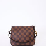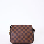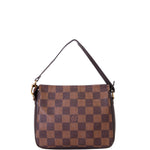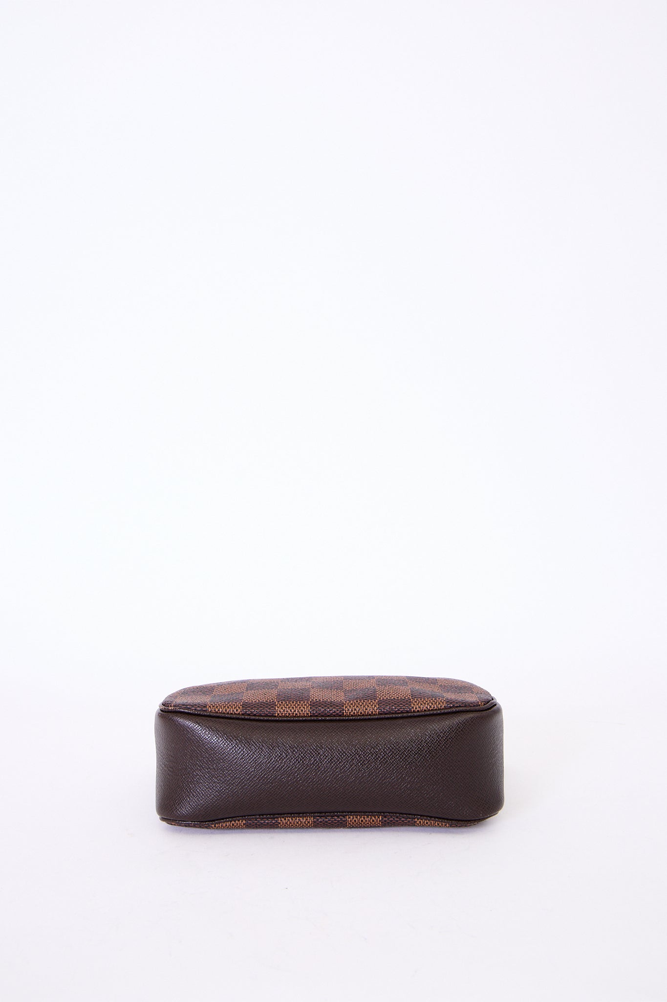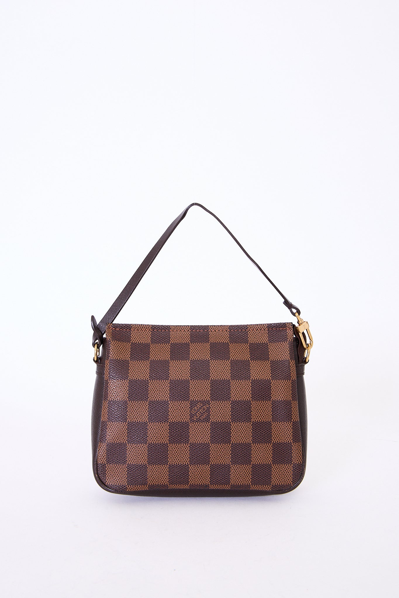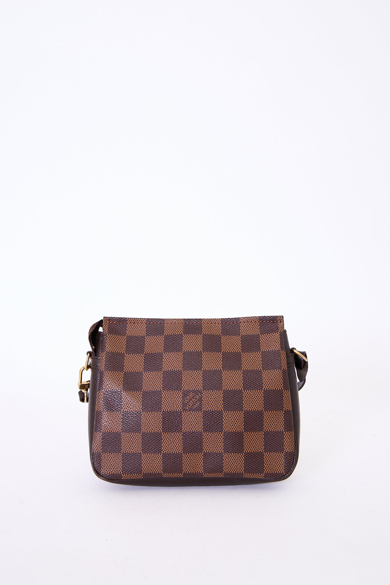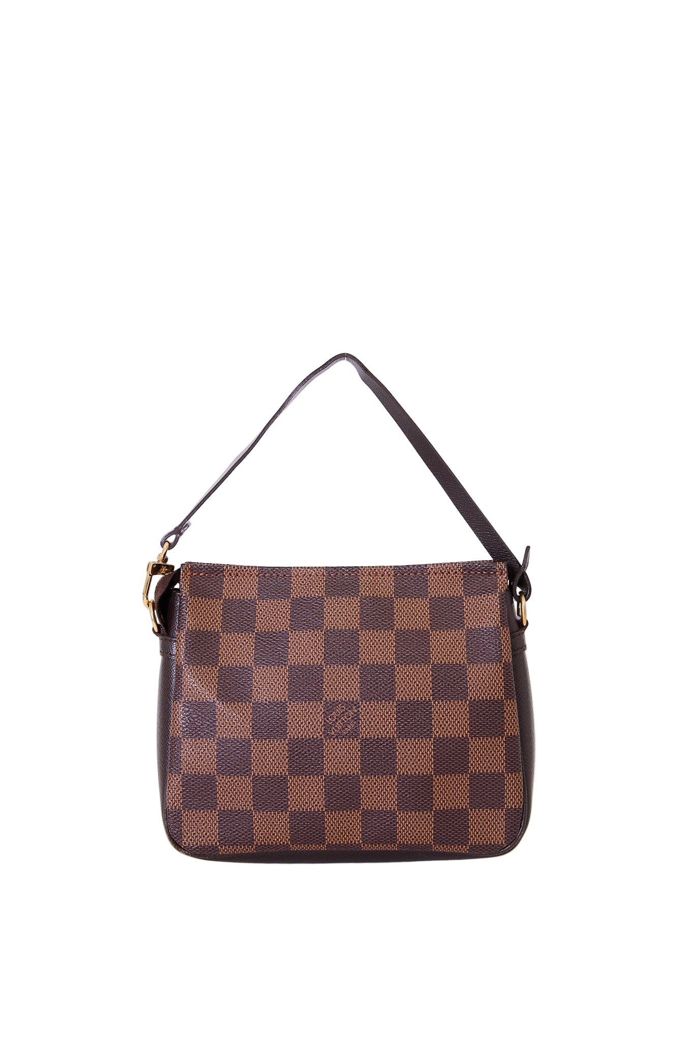 Tidløs Louis Vuitton Eva taske i det karakteristiske Damier Ebene-canvas med mørkebrune læderdetaljer og gyldent hardware. Et elegant og funktionelt design, der kombinerer klassisk parisisk stil med praktisk hverdagsbrug.