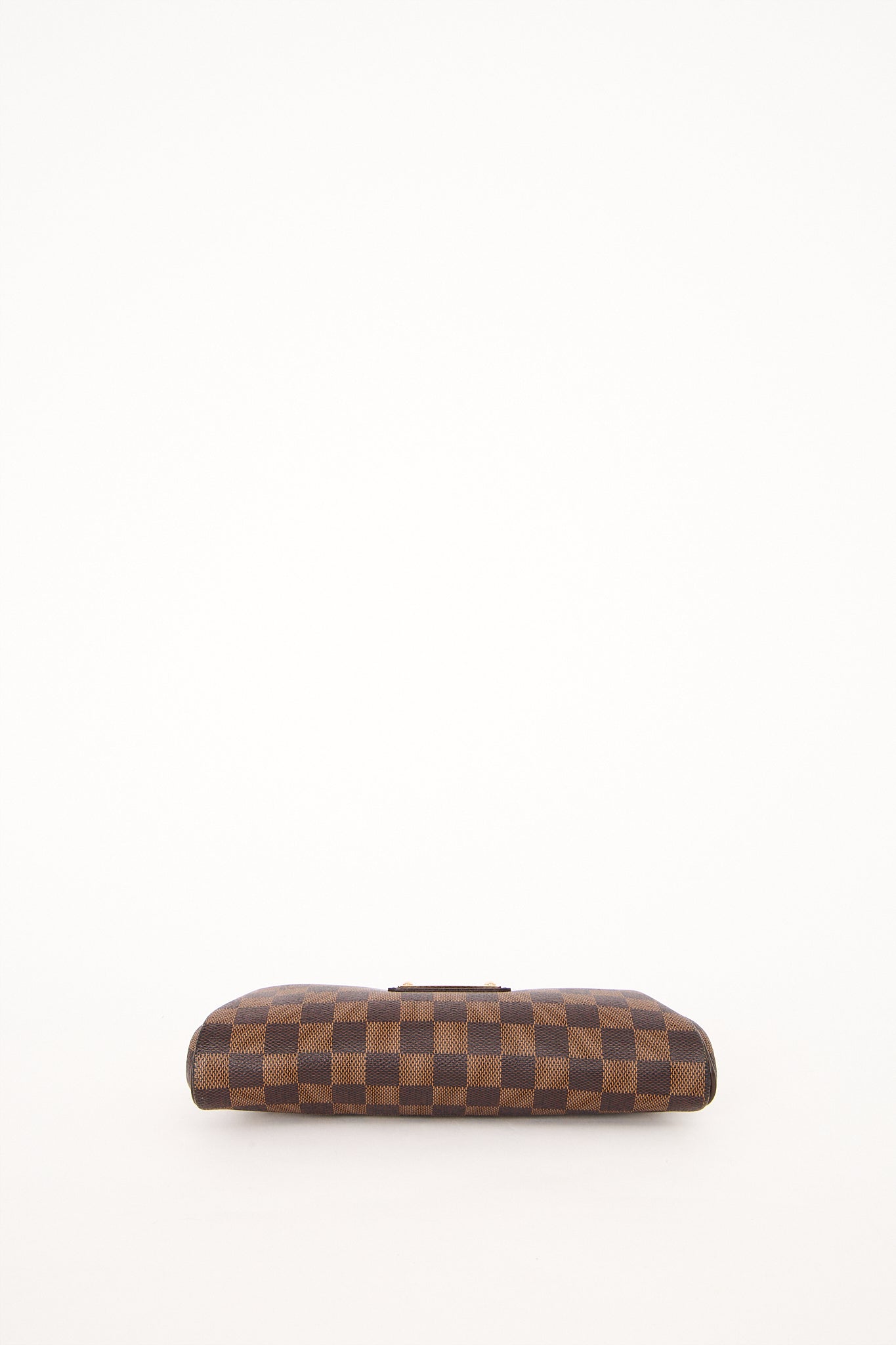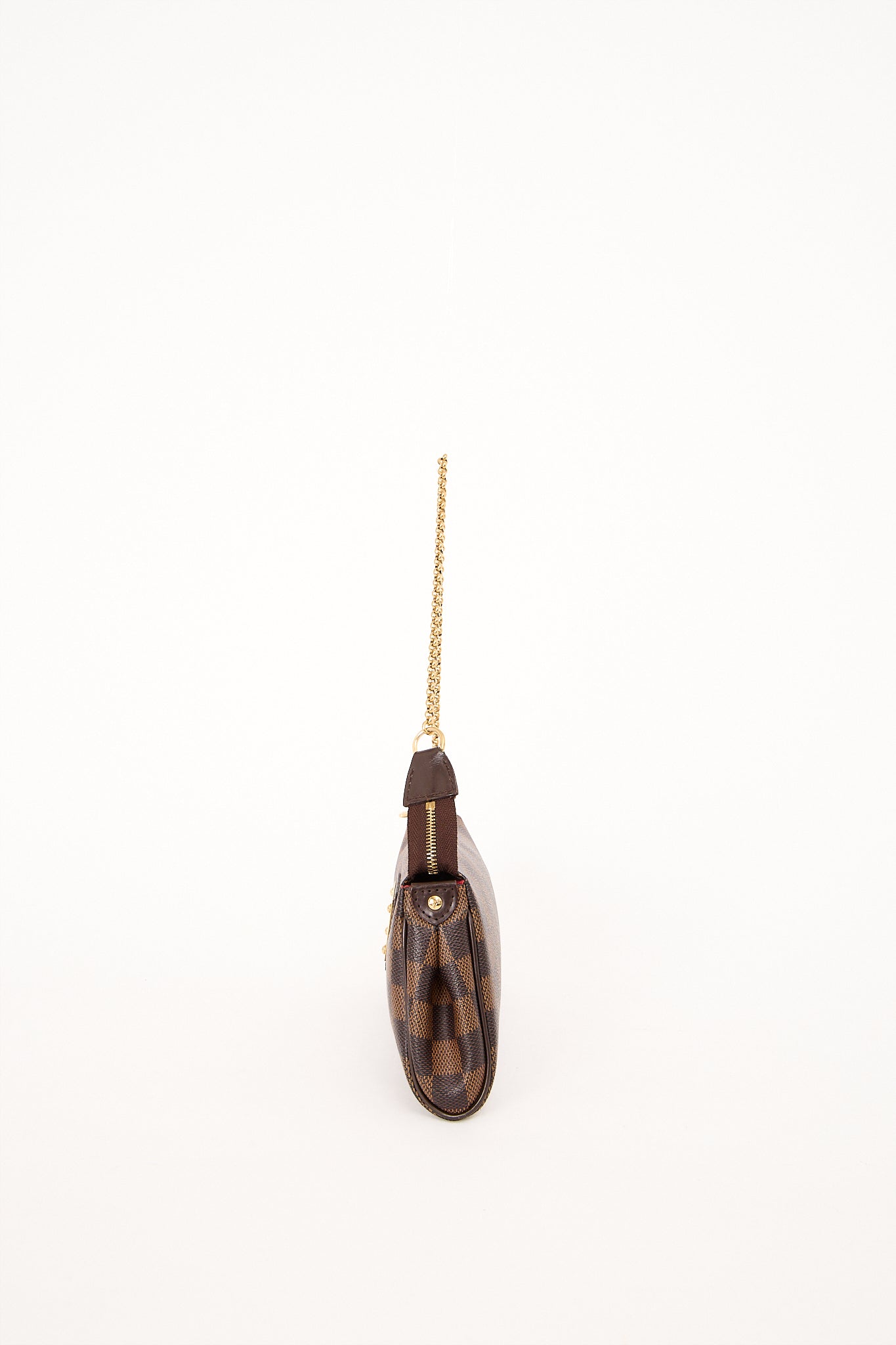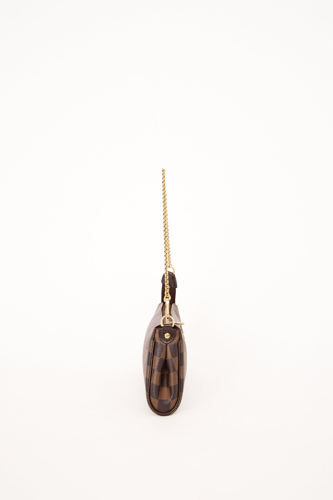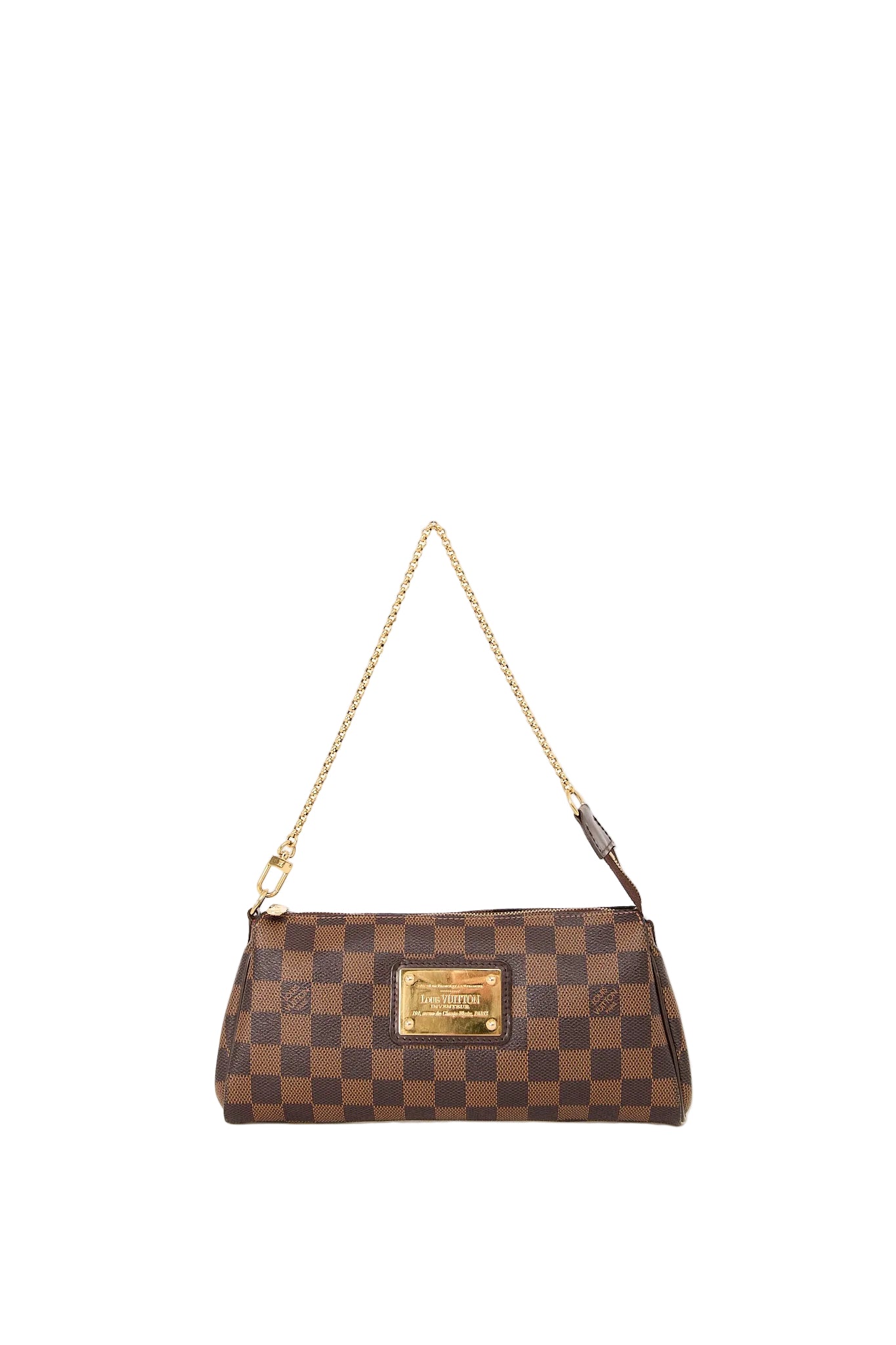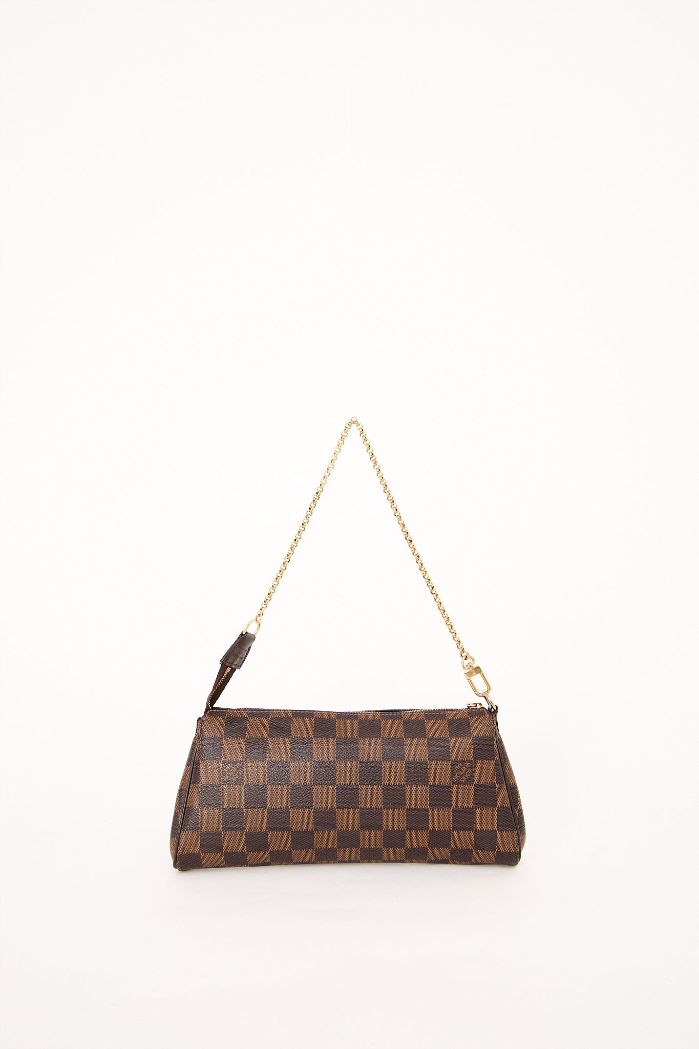Den ikoniske Louis Vuitton Eva Pochette i klassisk Damier Ebene canvas med guldfarvet hardware og signaturplade på fronten. Tasken kan bæres som skuldertaske med kæden for et elegant udtryk. En tidløs og alsidig model, der fungerer både til hverdag og fest, og som hurtigt er blevet en favorit blandt Louis Vuitton-entusiaster.