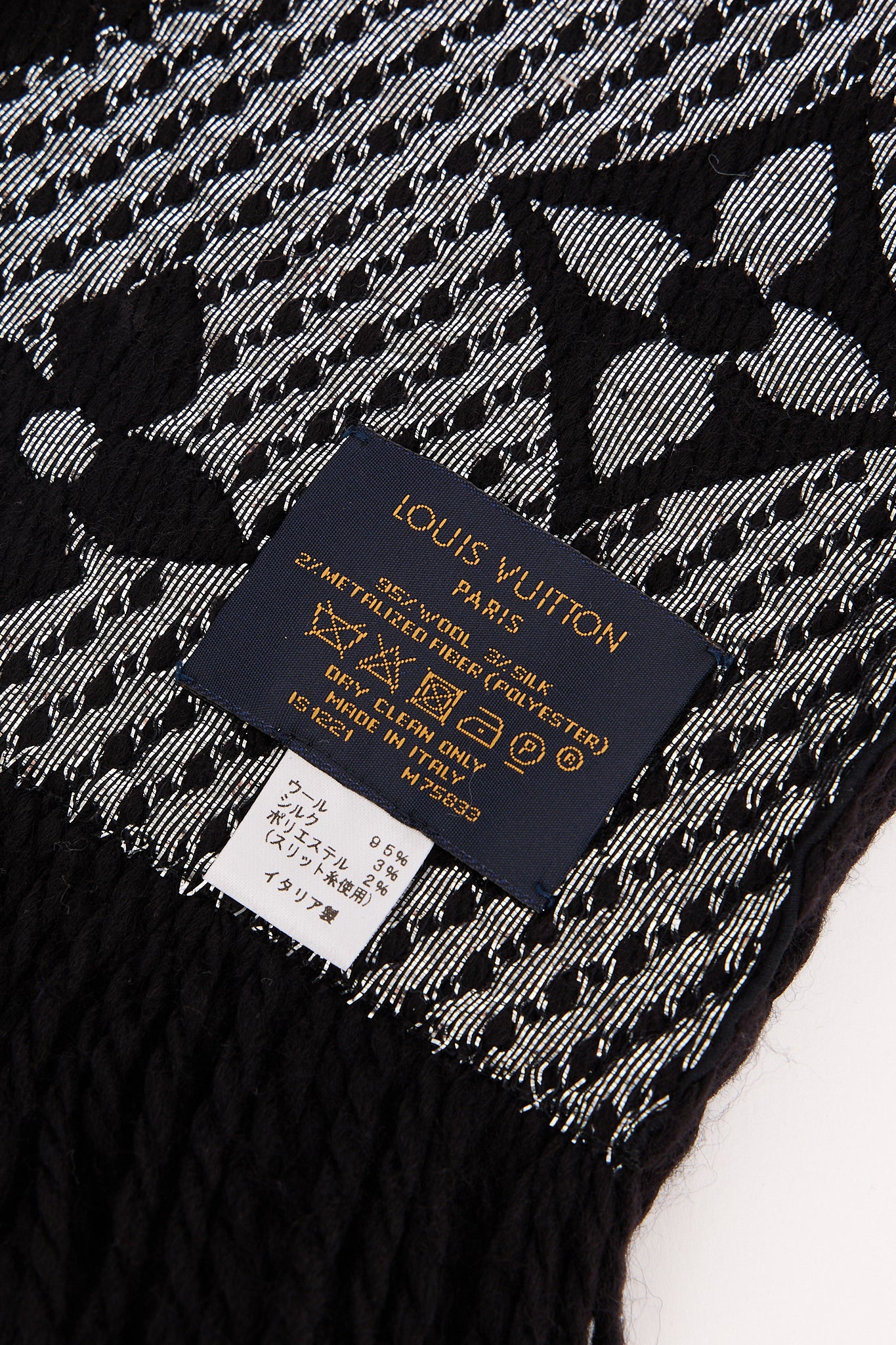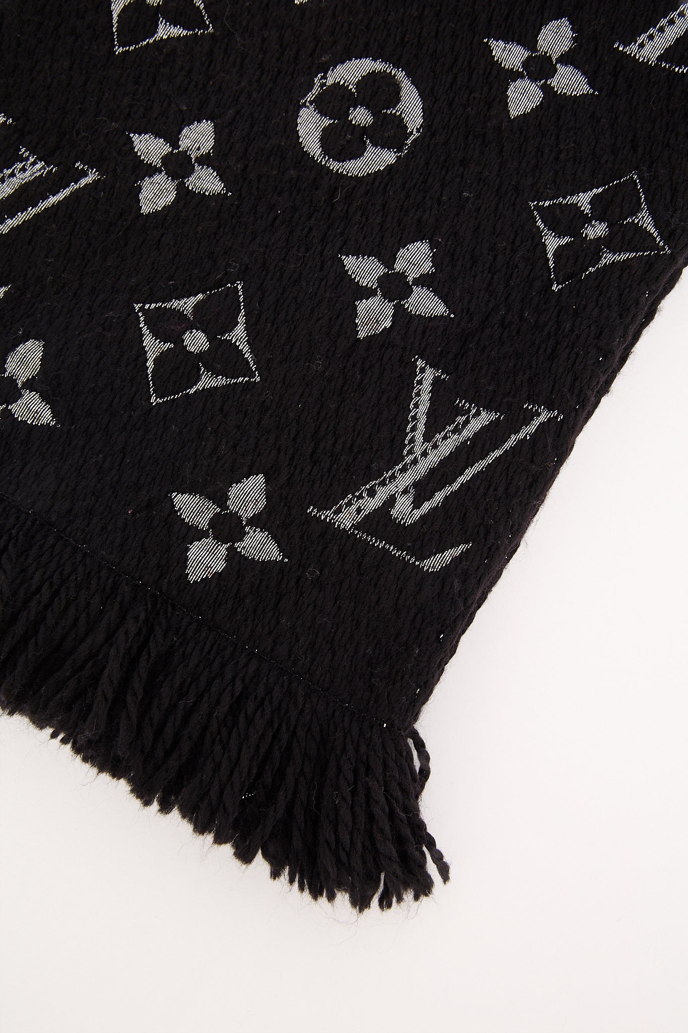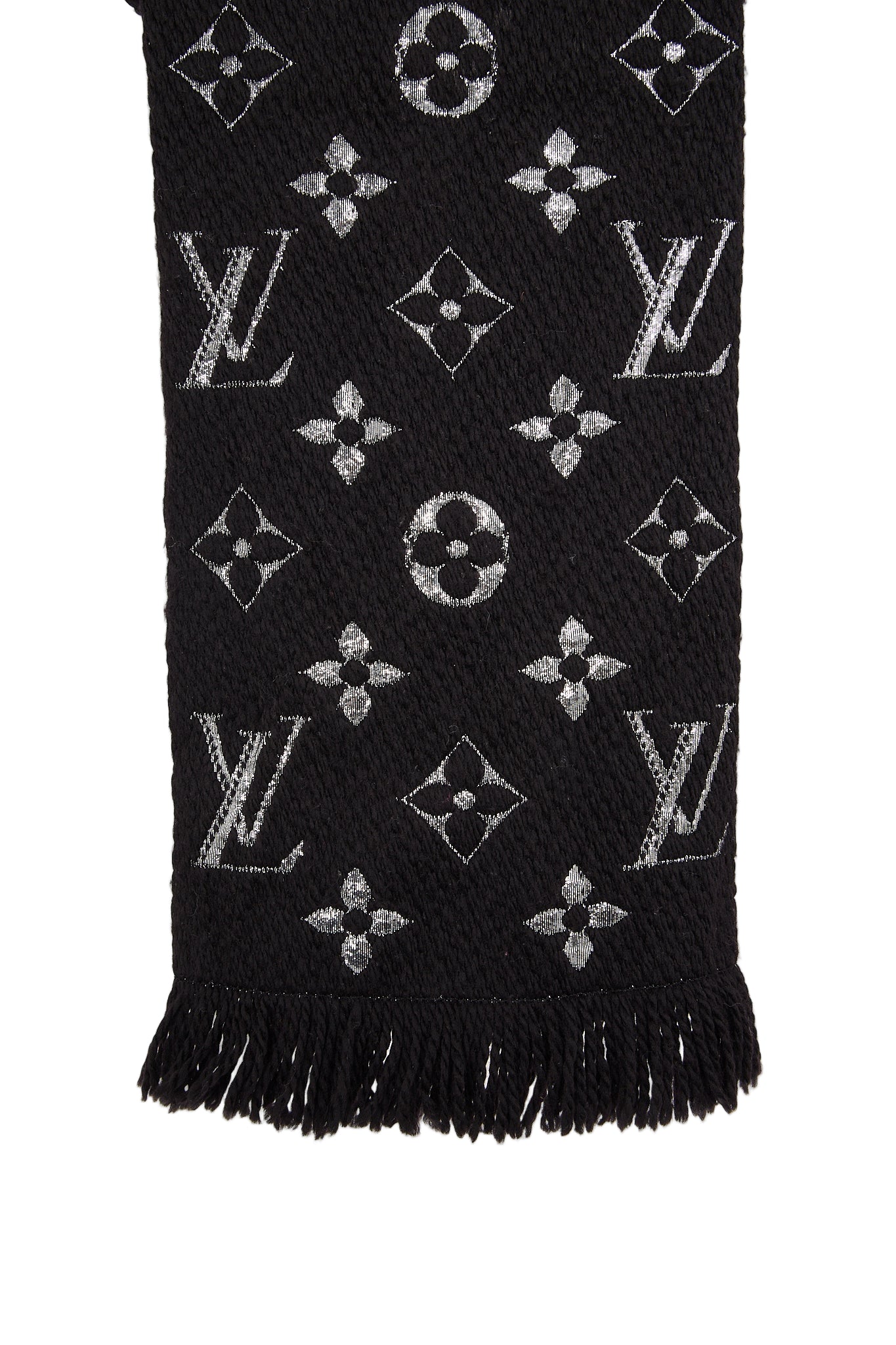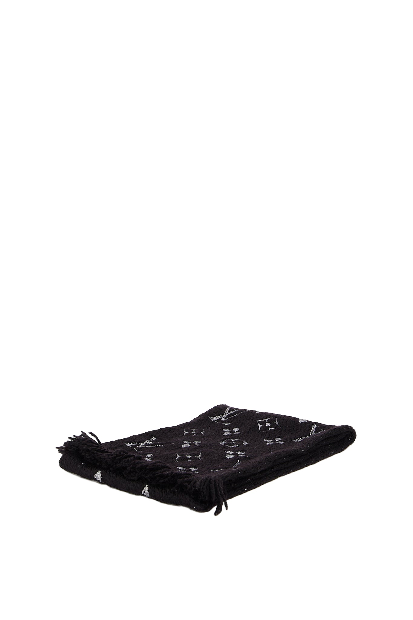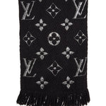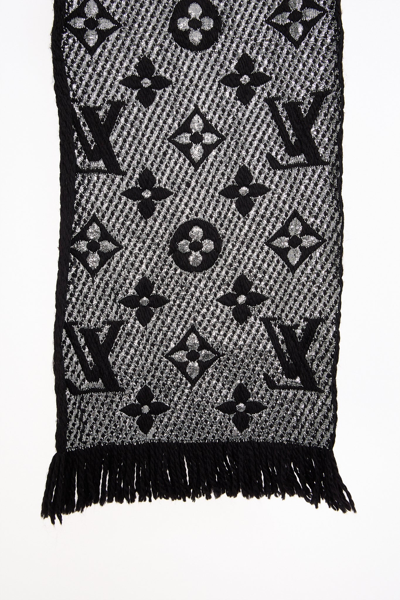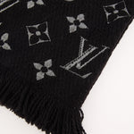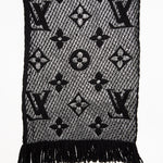 Eksklusivt Louis Vuitton tørklæde i blød uld- og silkeblanding med ikonisk monogrammønster i metallic sølv. Det luksuriøse strikdesign har en let glans og en varm, behagelig tekstur - ideel til både daglig brug og elegante vinterlooks. En klassiker i Louis Vuittons accessories-kollektion.
