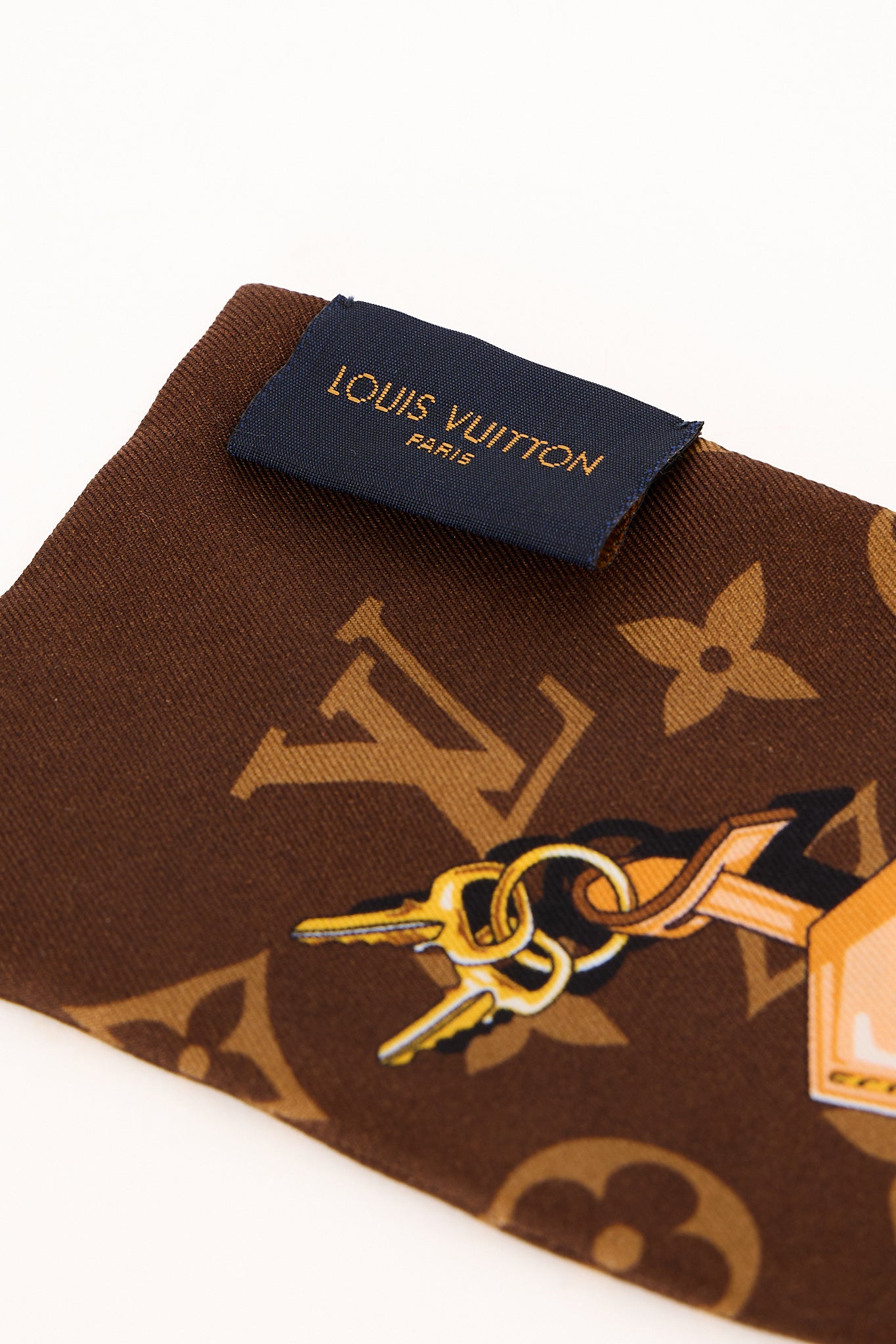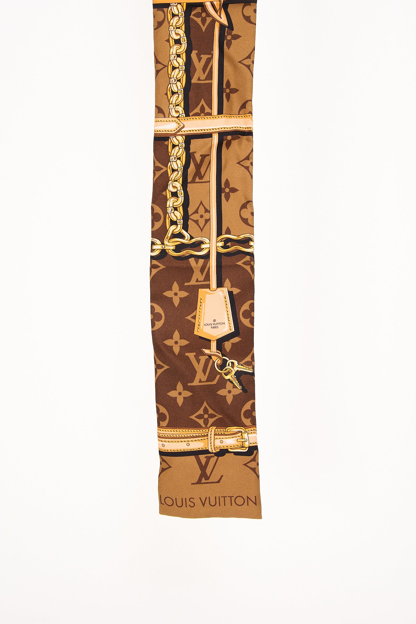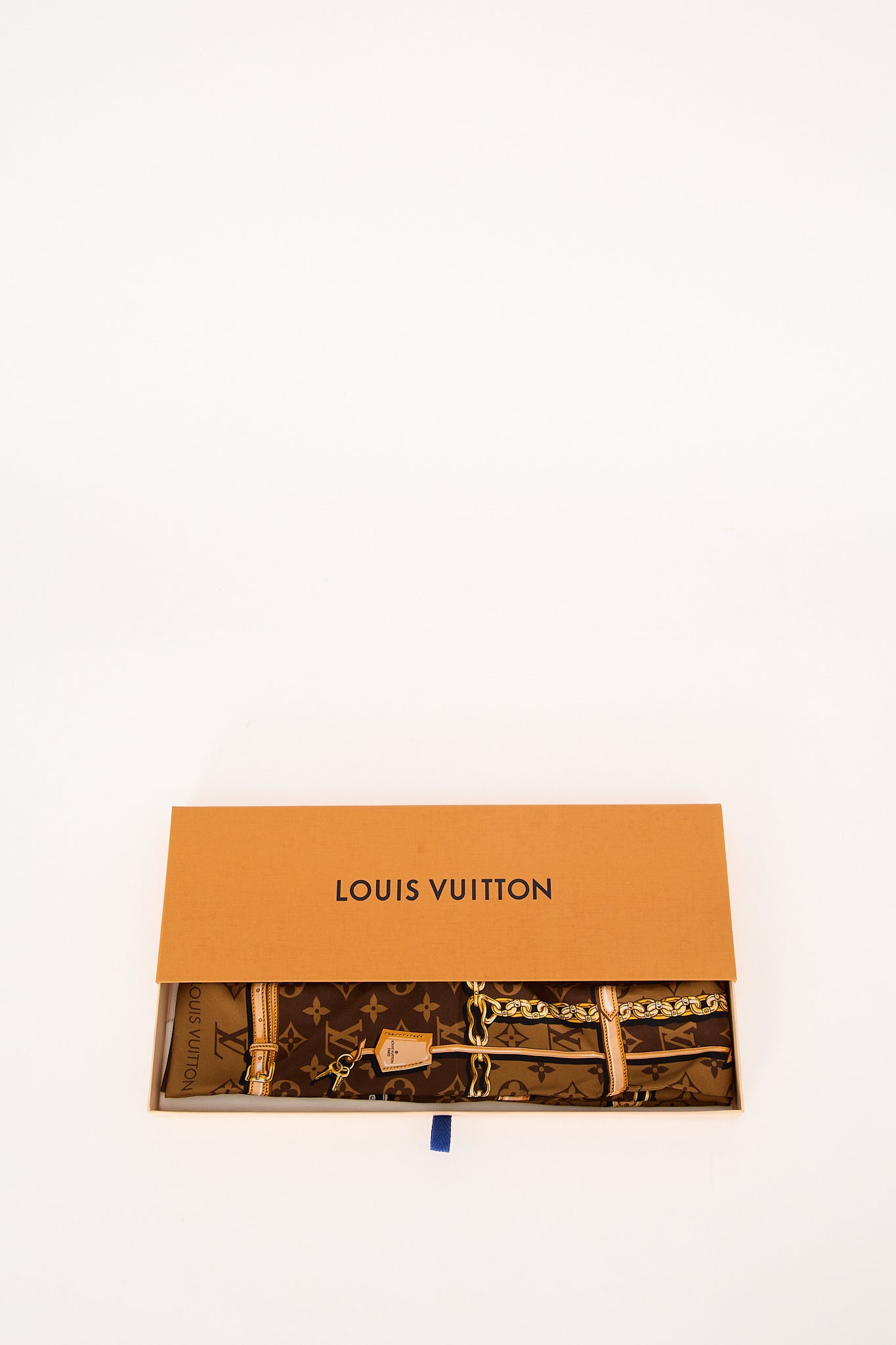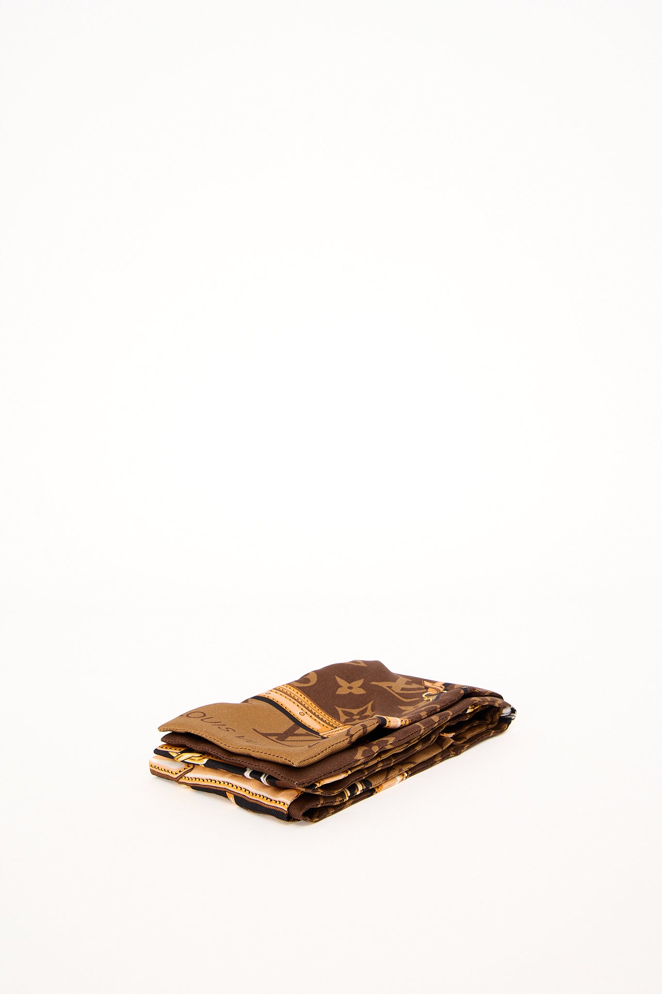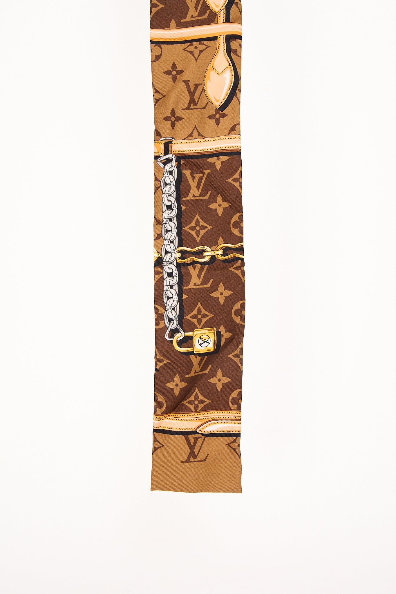 Opgrader dit look med denne elegante Louis Vuitton monogram-twilly i varme brune og gyldne nuancer. Det luksuriøse design kombinerer klassiske LV-elementer med et eksklusivt satin-skær, som giver et sofistikeret finish – perfekt til at binde på tasken eller i håret. Et tidløst accessory, der tilføjer et strejf af glamour til enhver stil.