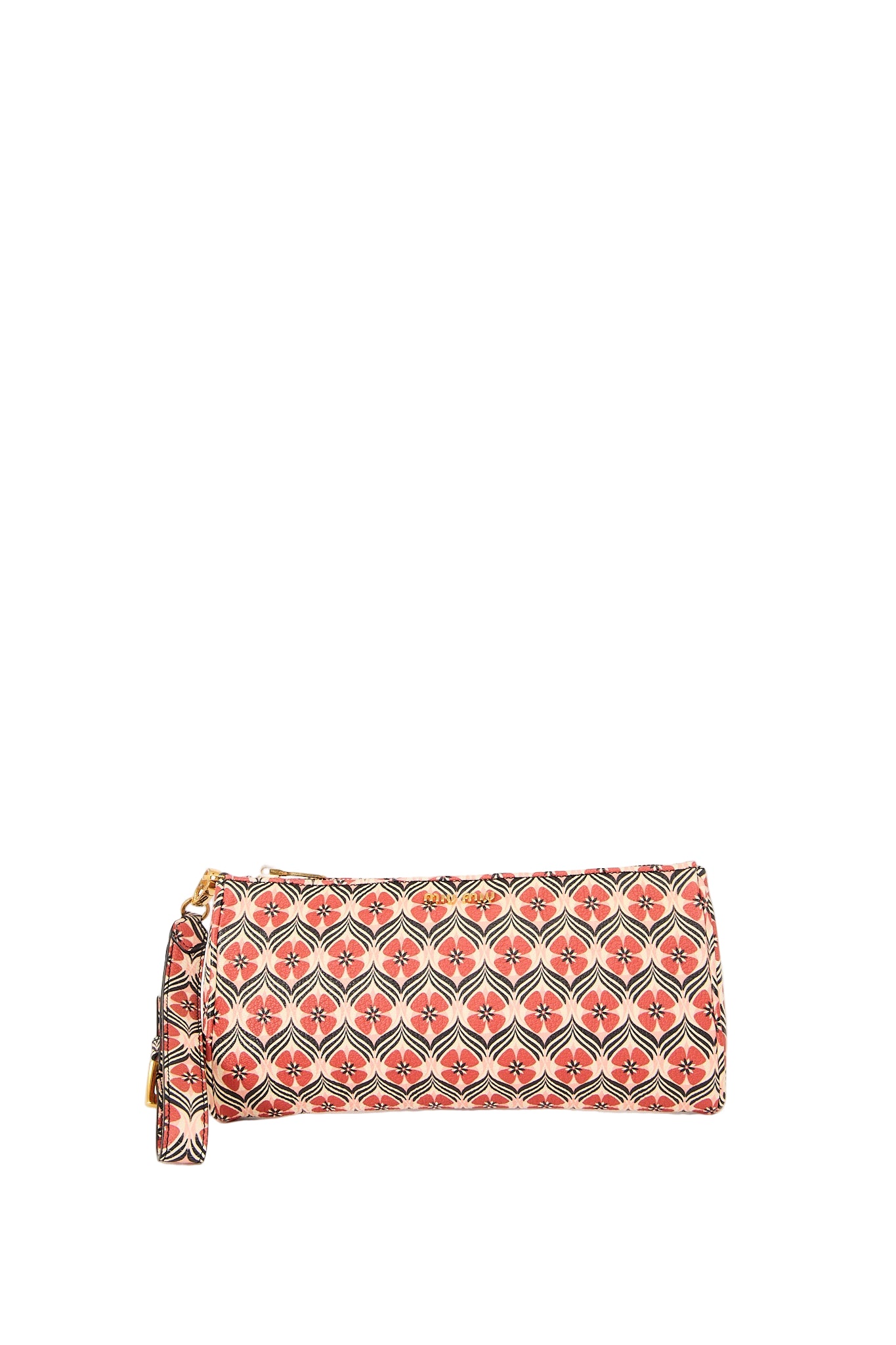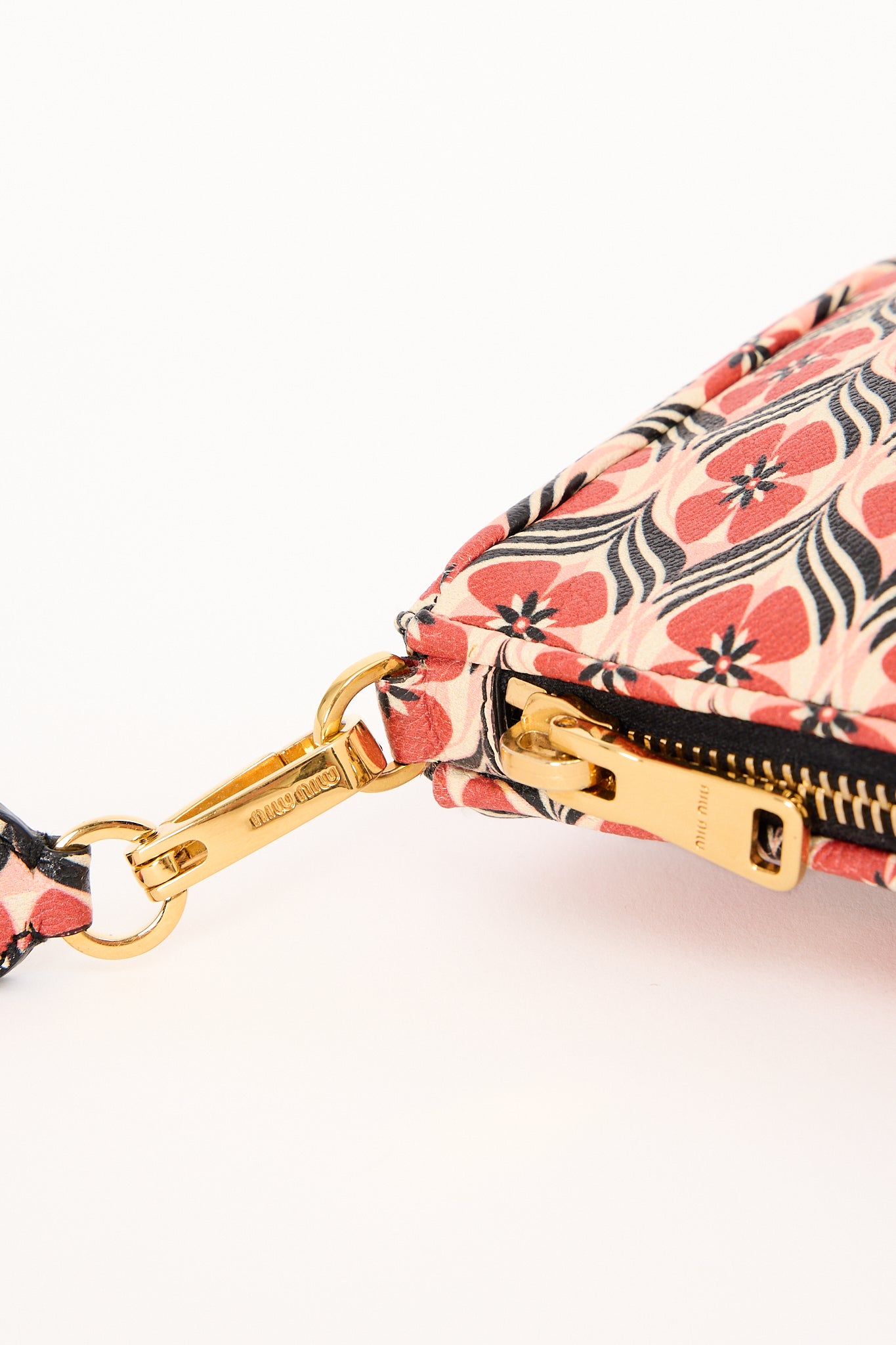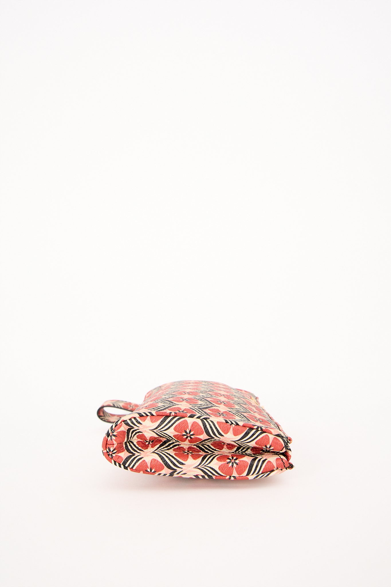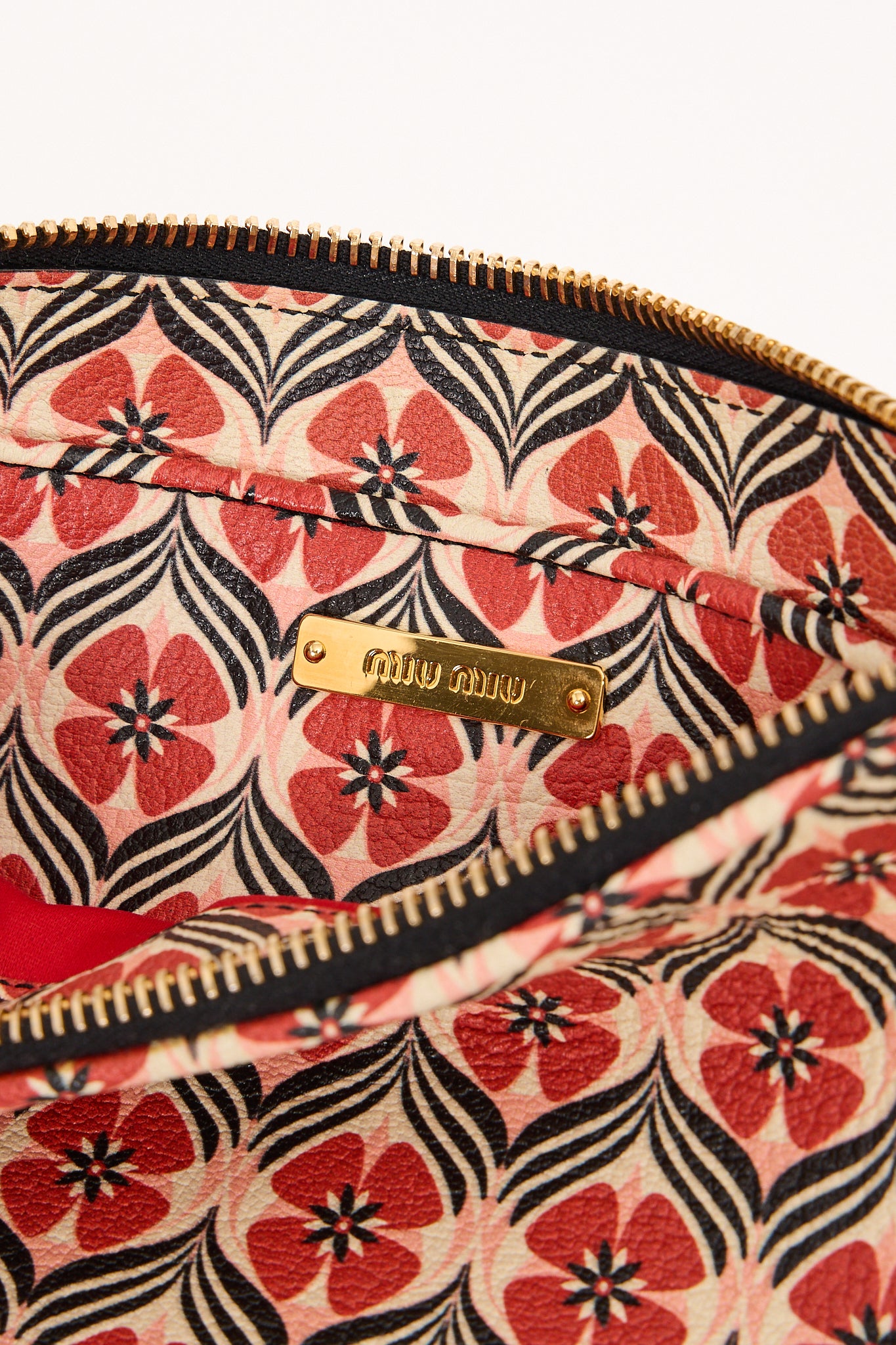 Fin Miu Miu clutch i mønstret canvas med grafisk blomsterprint i rosa, sort og creme.