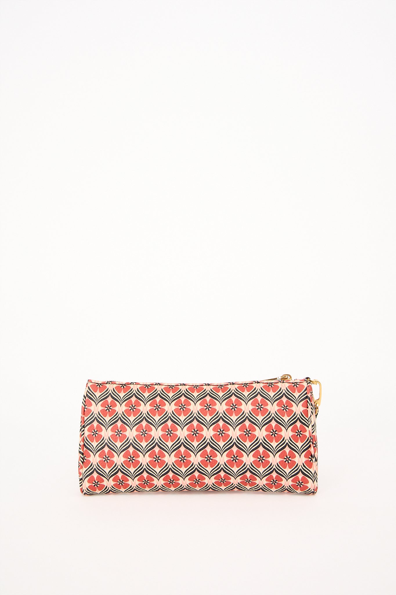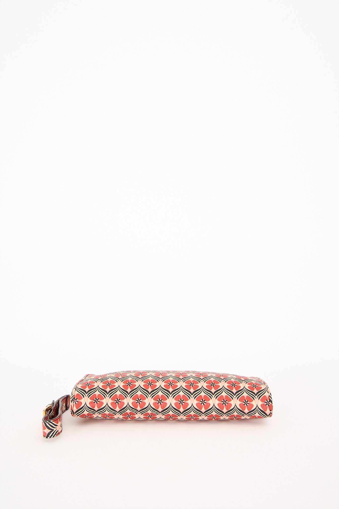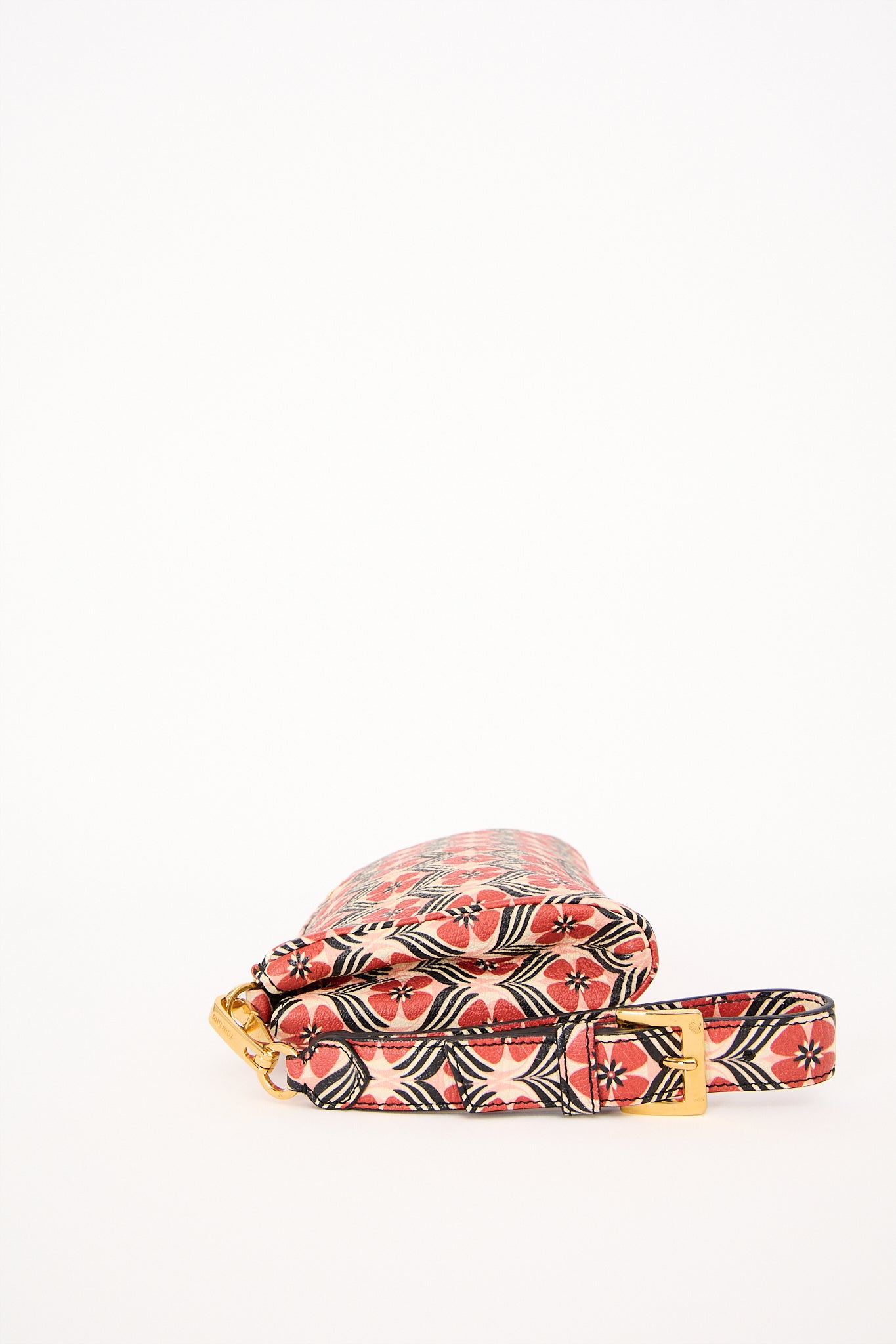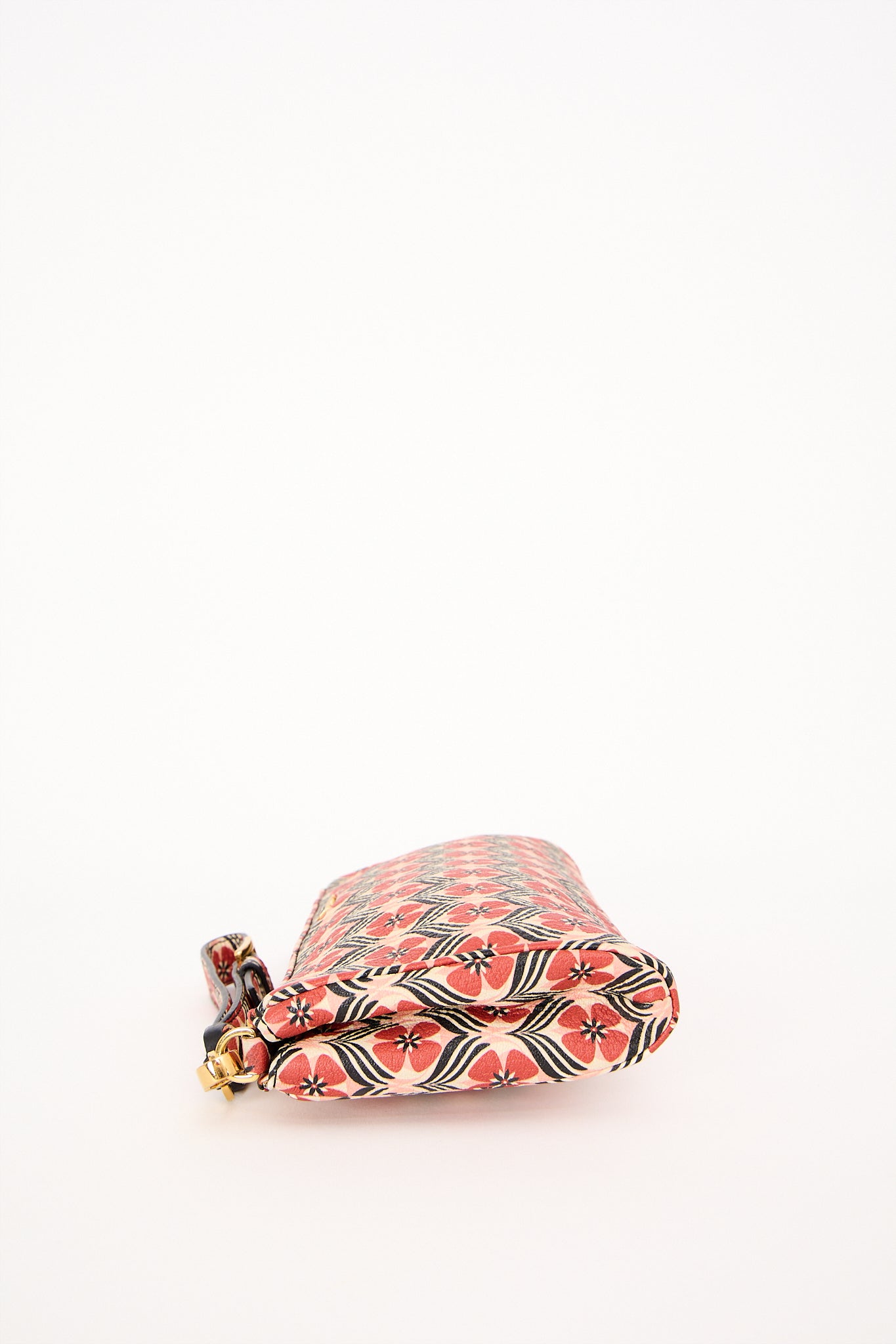 Fin Miu Miu clutch i mønstret canvas med grafisk blomsterprint i rosa, sort og creme.