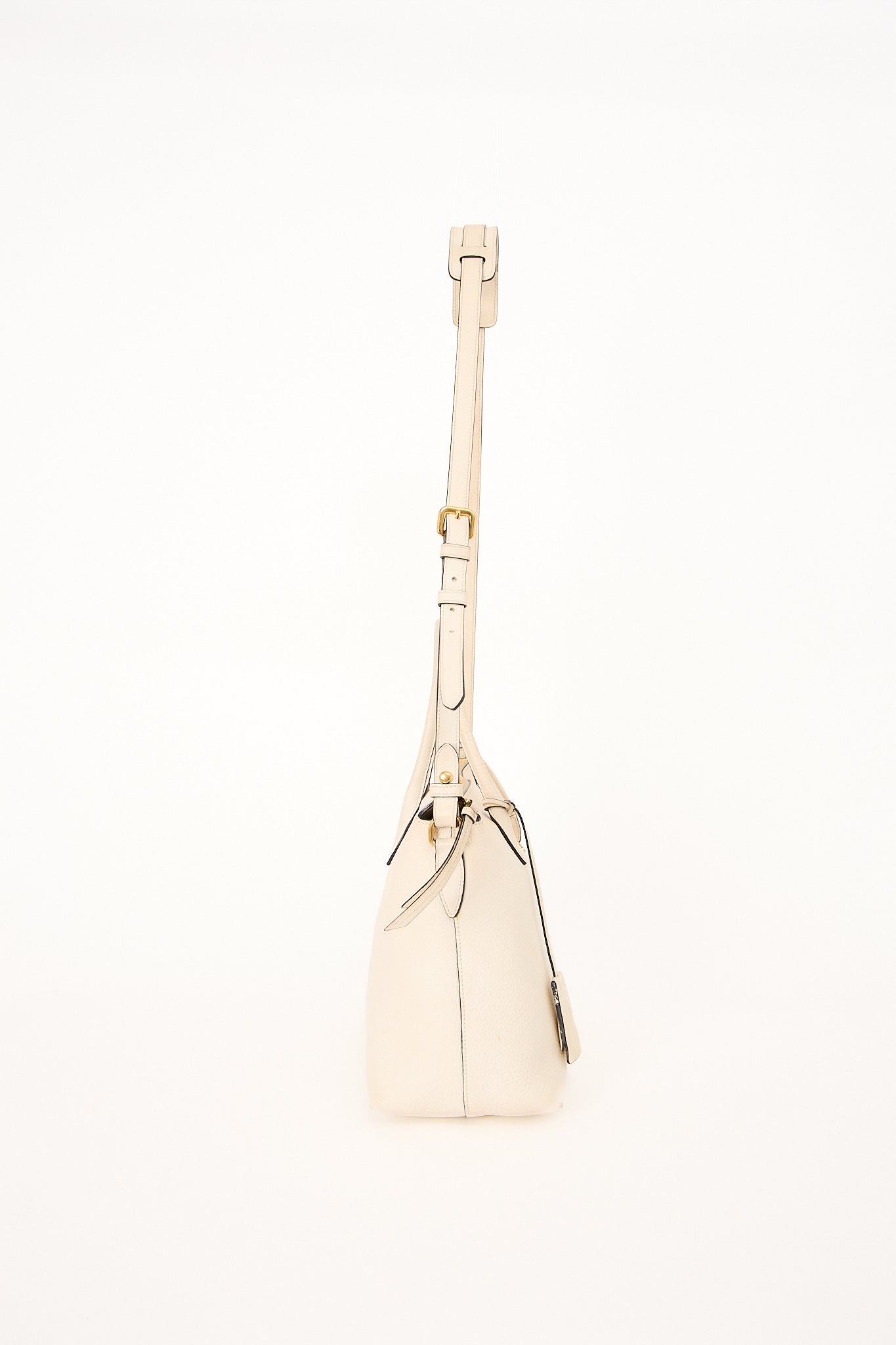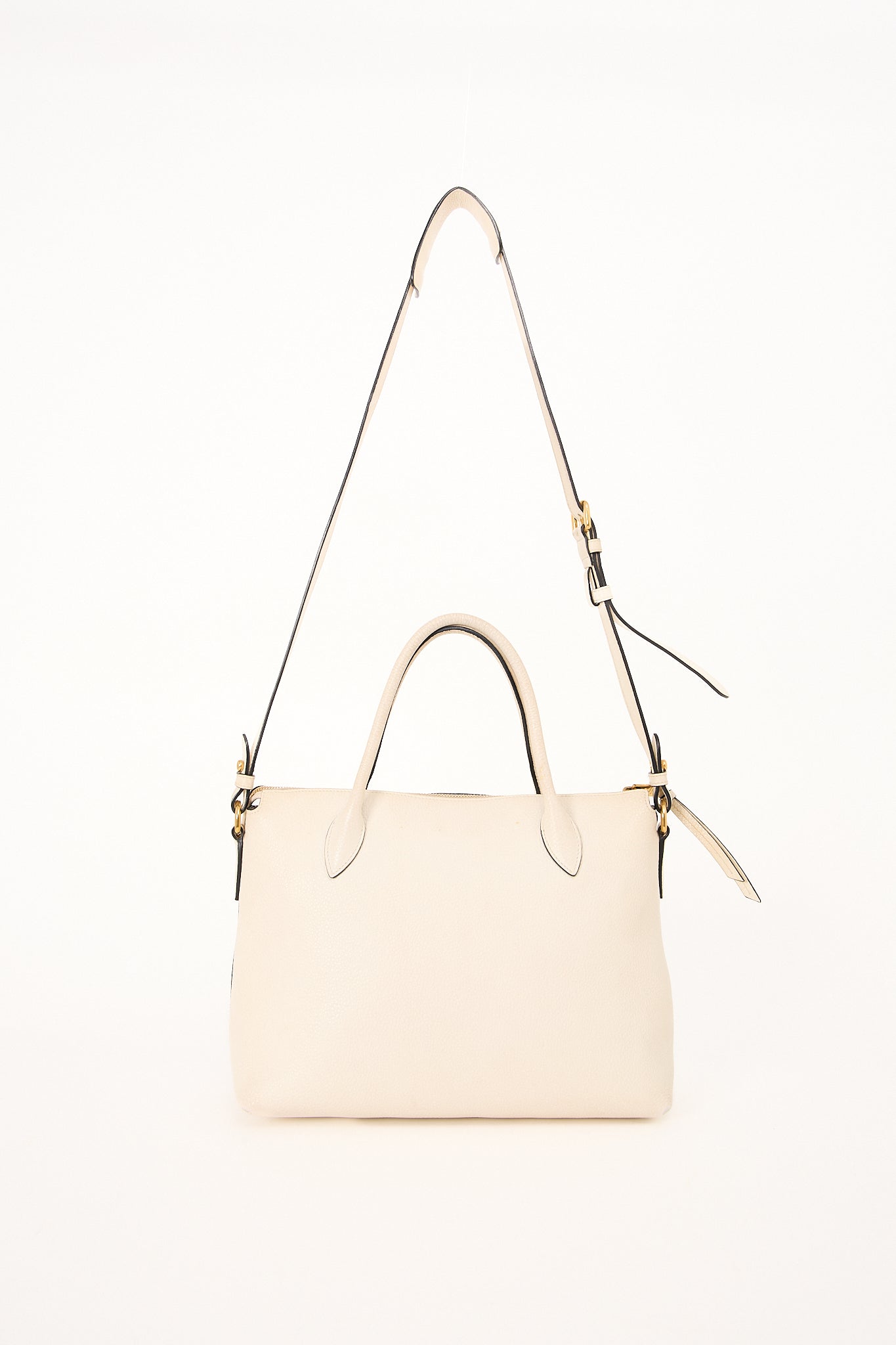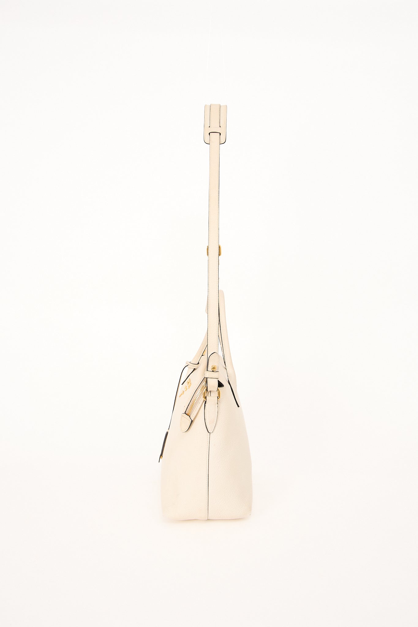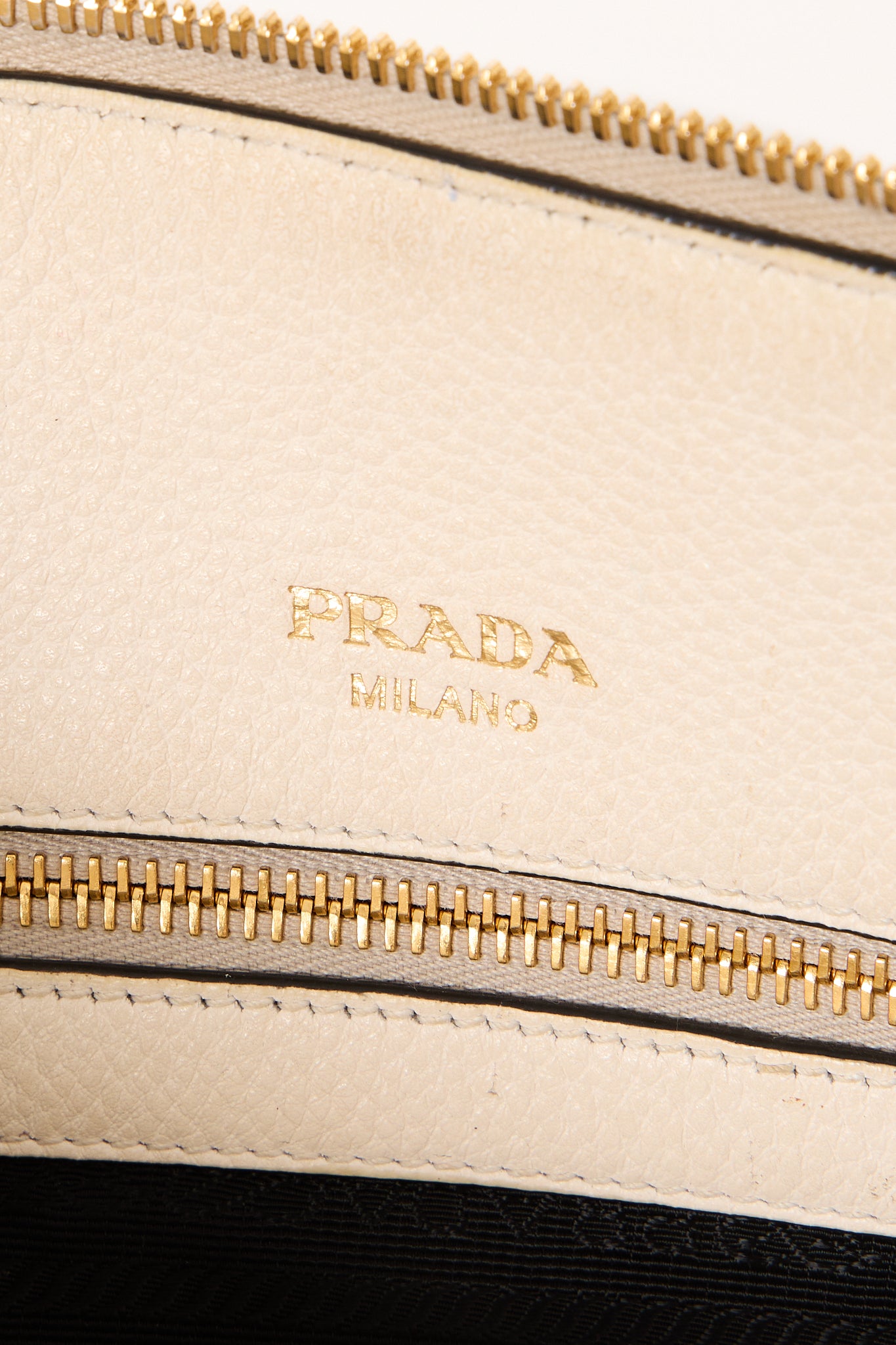 Elegant Prada Vitello Daino tote i smukt off-white/cremefarvet kornet læder. Vitello Daino er en af Pradas mest populære læderkvaliteter, kendt for sin bløde struktur og eksklusive, robuste finish. Tasken har et klassisk, minimalistisk udtryk med Prada-logo på fronten, top-hanke samt skulderrem, så den kan bæres både i hånden og på skulderen/crossbody. En perfekt “everyday luxury”-taske med god plads og et tidløst look.
