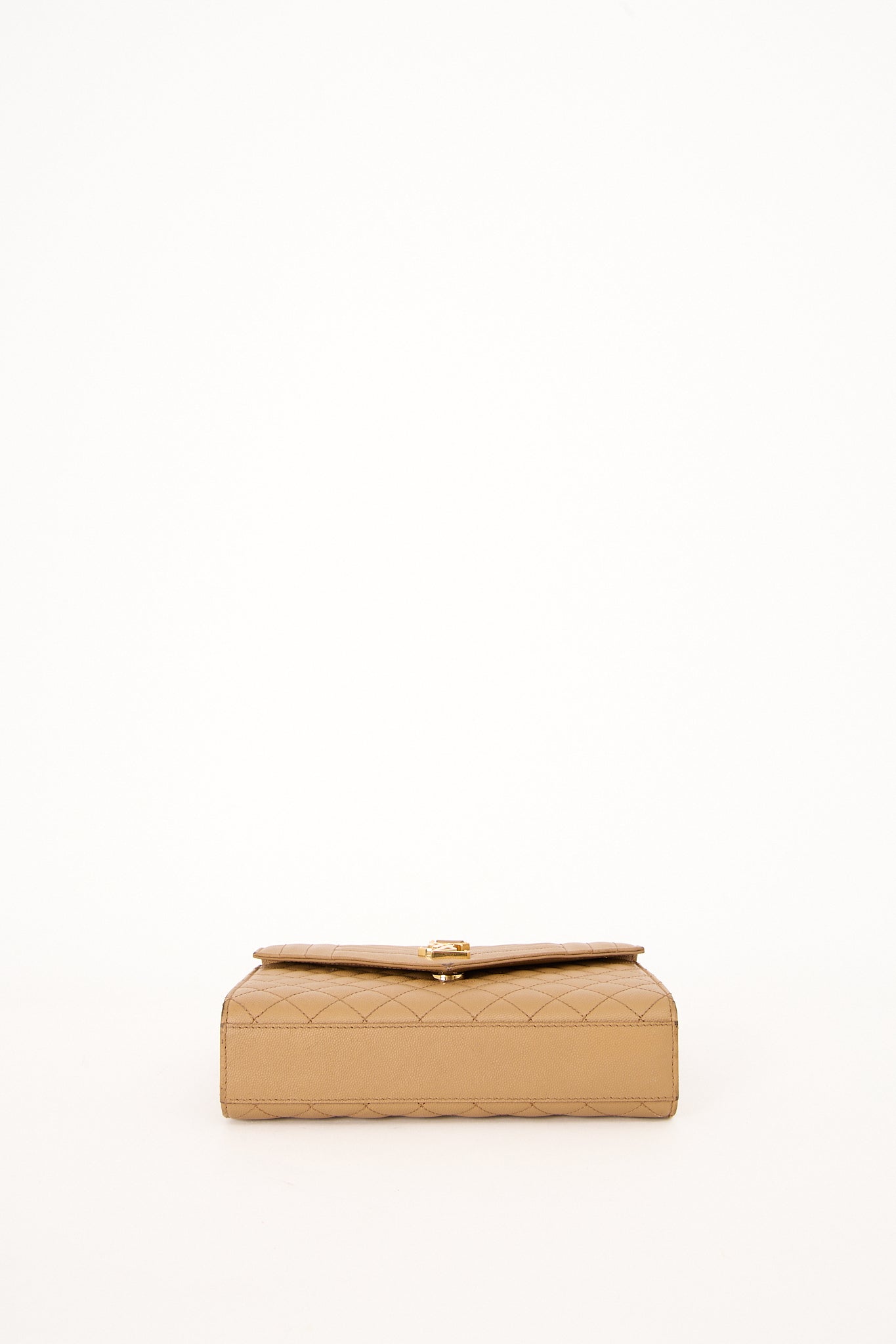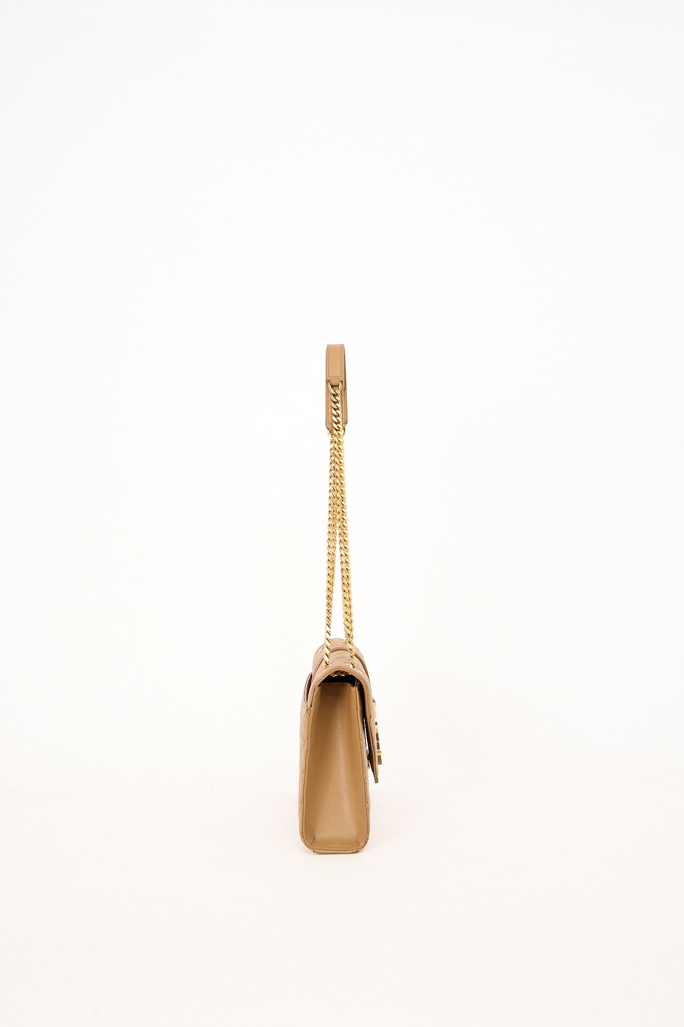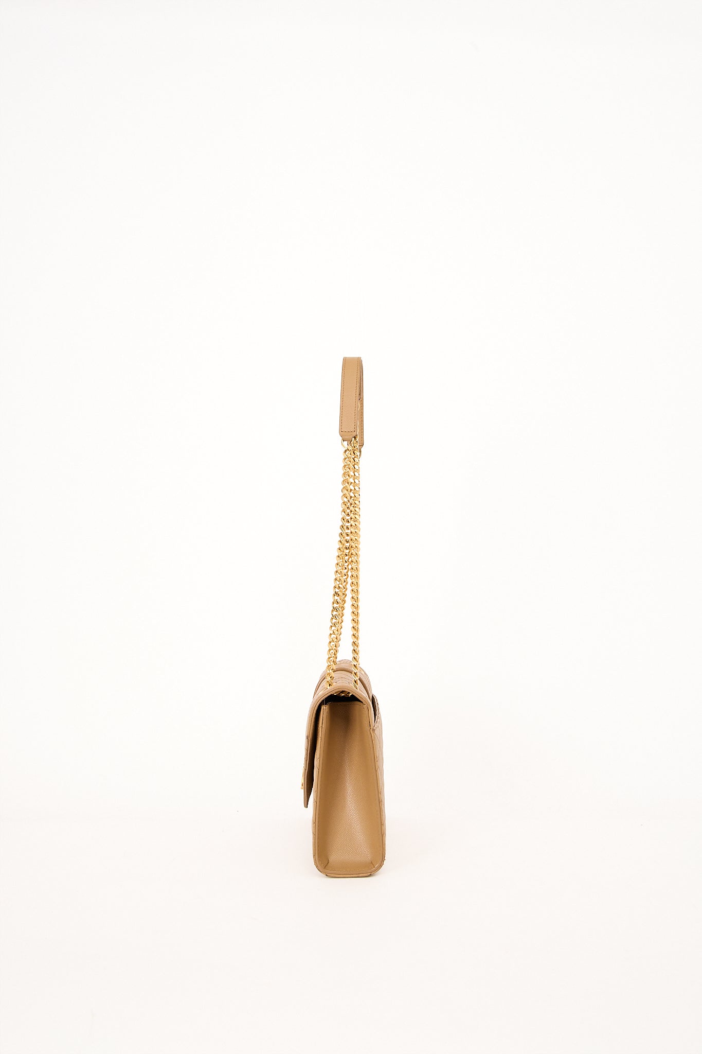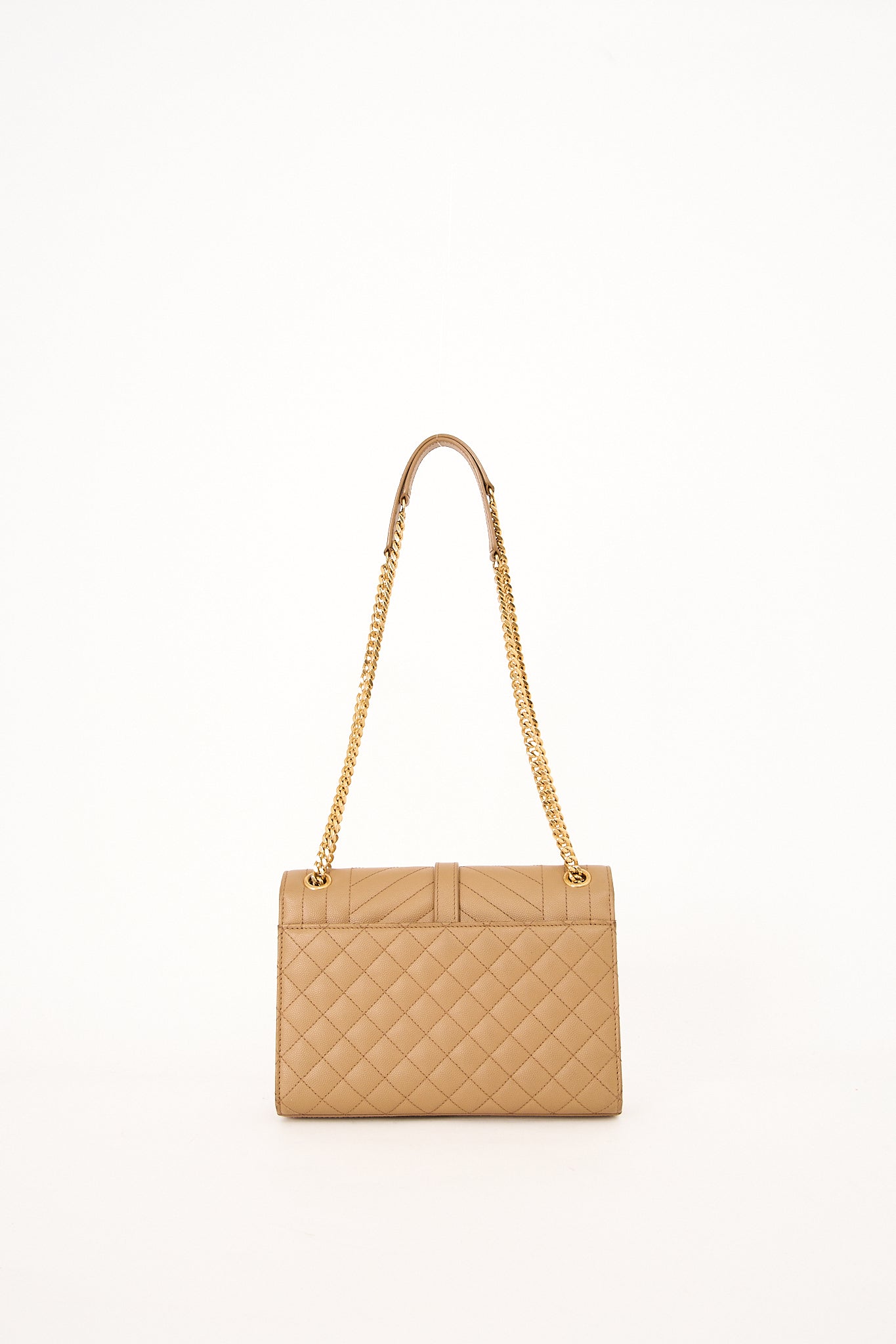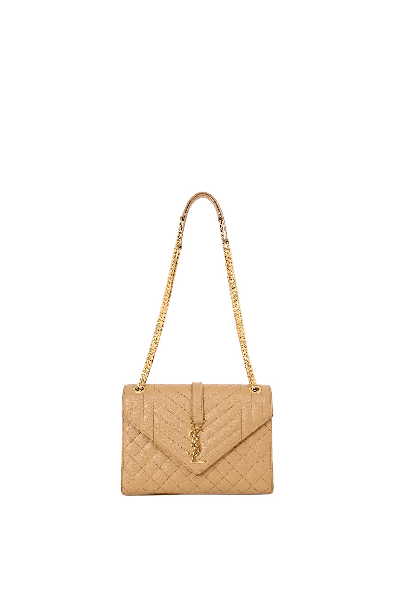 Elegant Saint Laurent Envelope Medium skuldertaske i beige quiltet læder med ikonisk YSL-logo i guld foran. Tasken har dobbelt kæderem, der kan bæres både på skulderen og crossbody, og er designet med klaplukning og rummeligt interiør med lynlåslomme. En klassiker, der kombinerer luksus og funktionalitet.