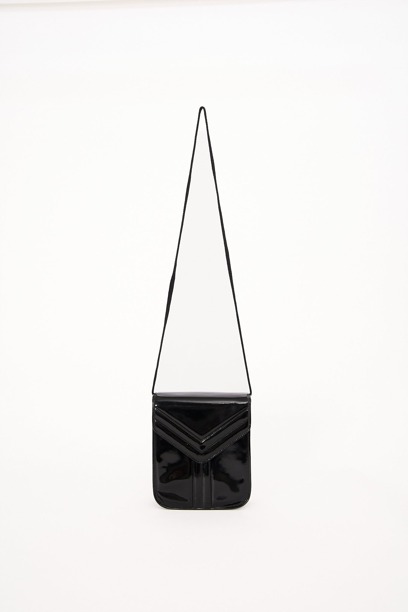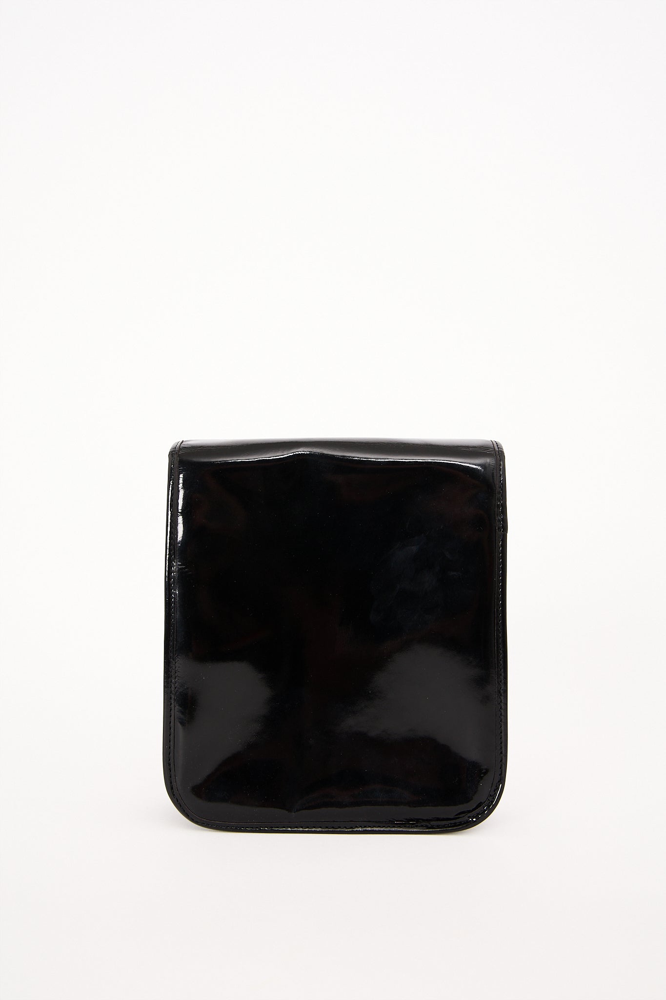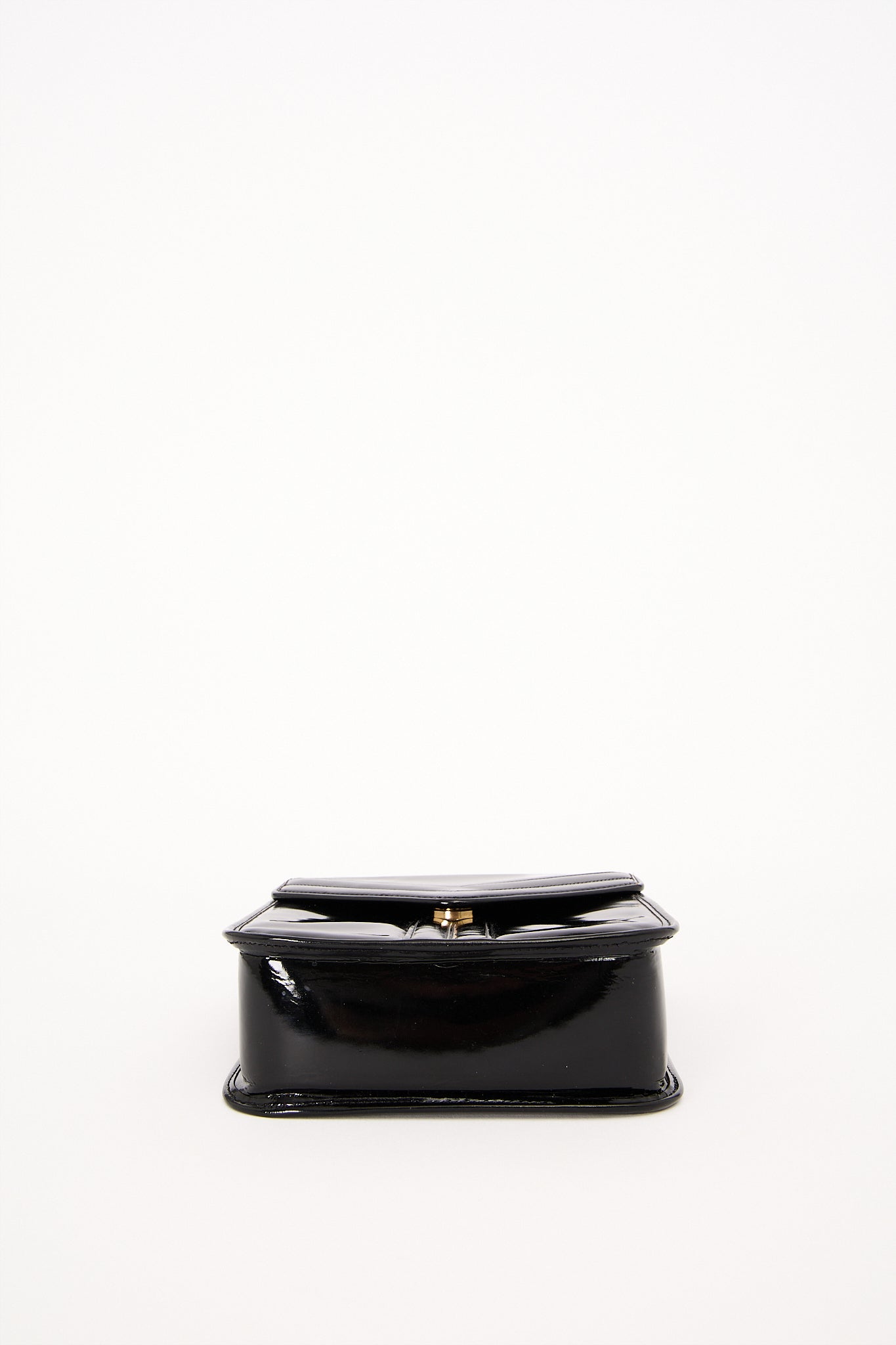 Elegant Yves Saint Laurent crossbody taske i sort laklæder med karakteristisk V-formet frontklap og guldfarvet logo-plade indvendigt. Et sofistikeret vintagefund, der kombinerer YSL’s tidløse parisiske elegance med et edgy, moderne udtryk.