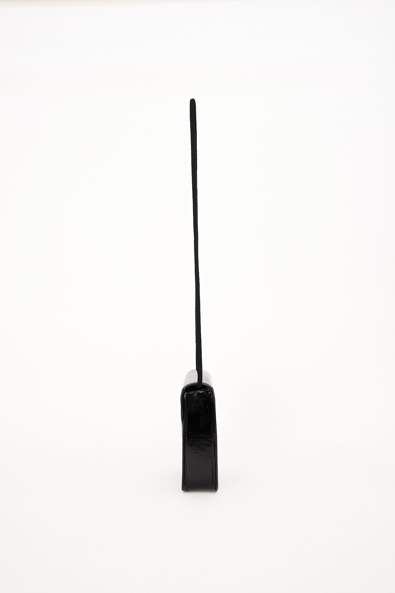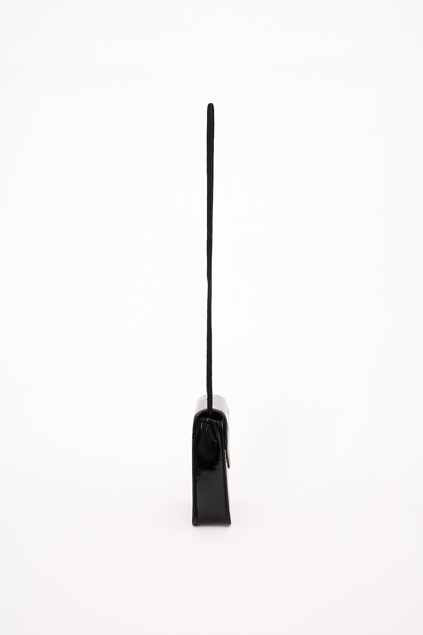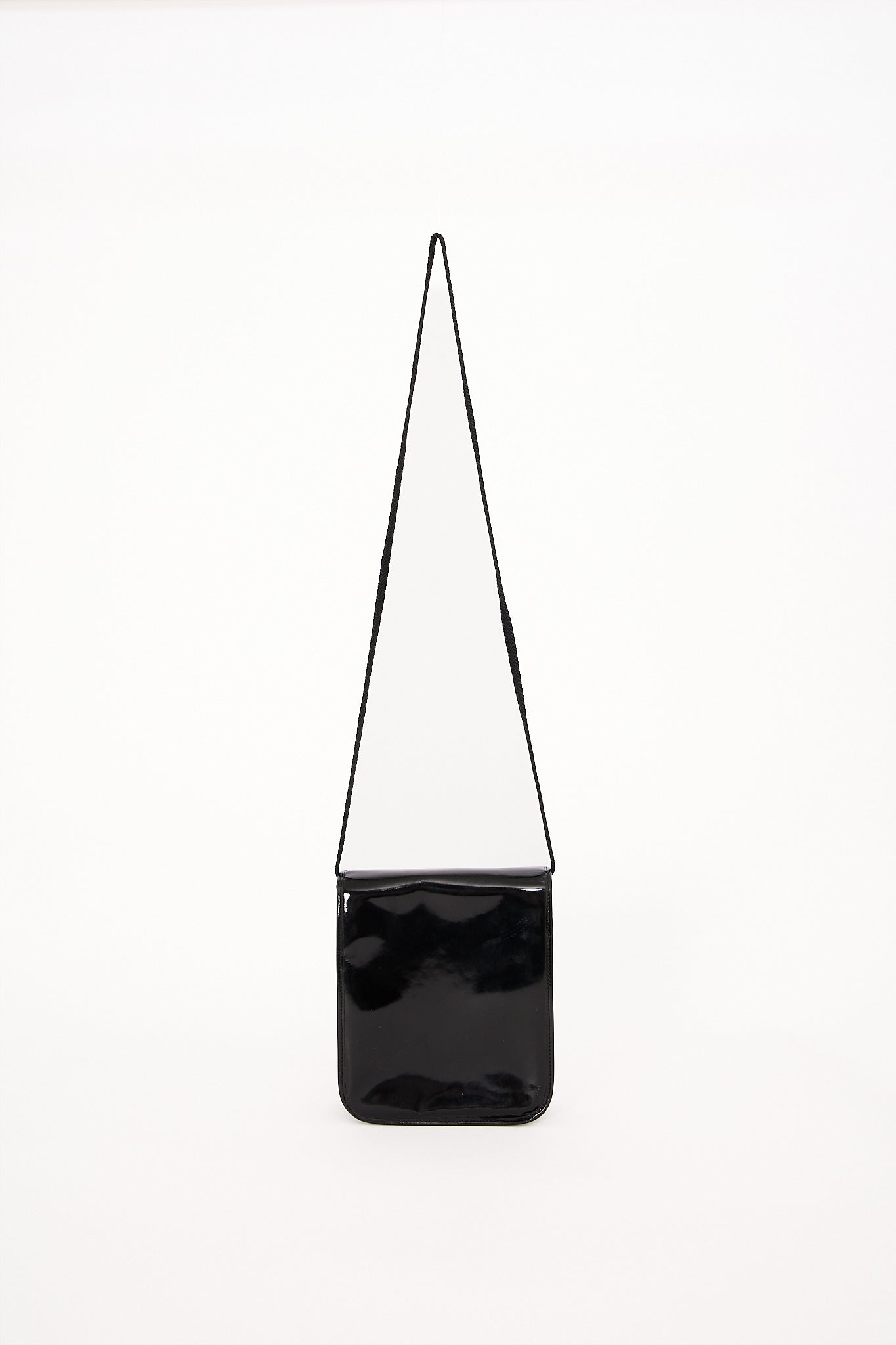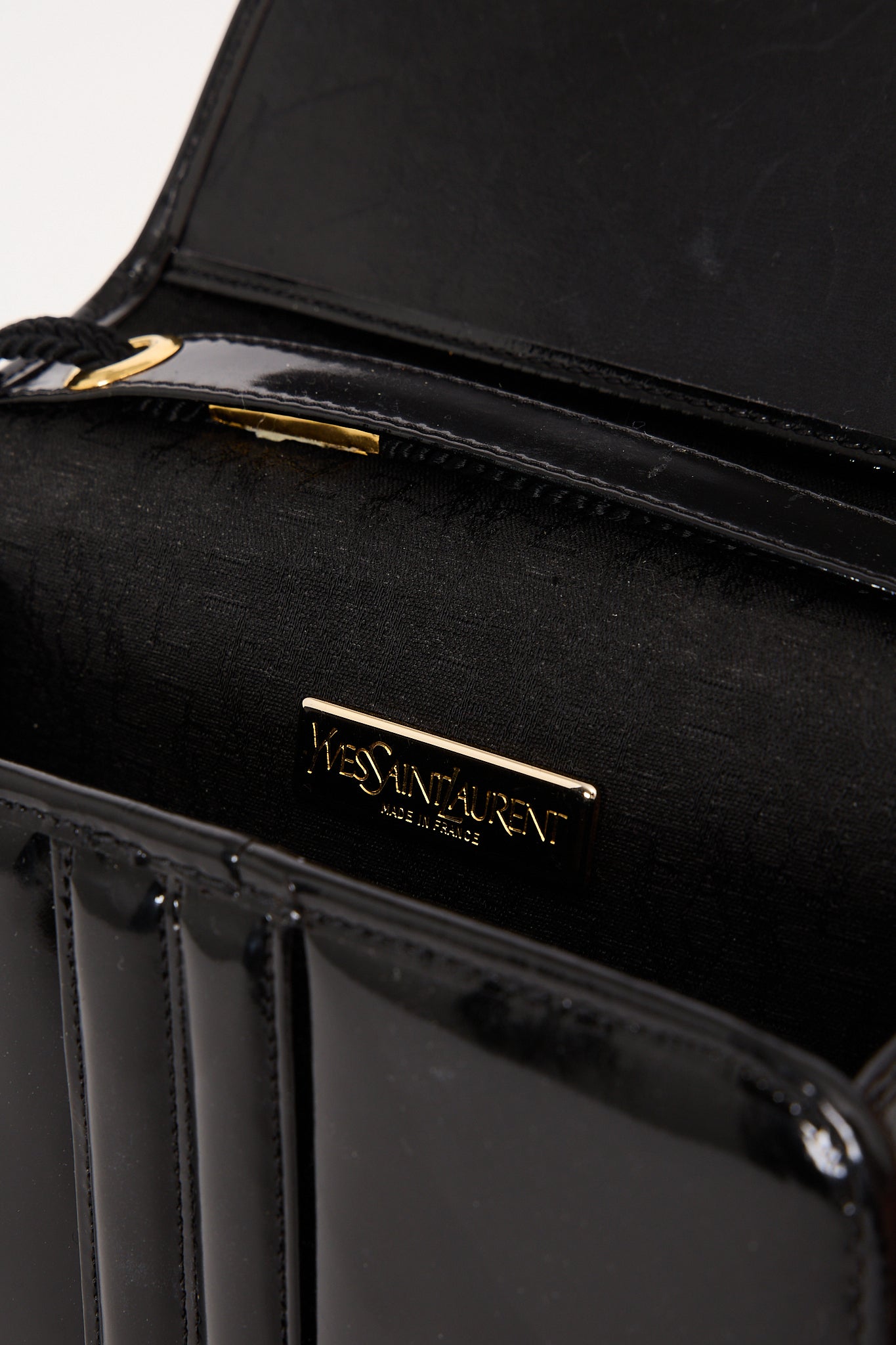 Elegant Yves Saint Laurent crossbody taske i sort laklæder med karakteristisk V-formet frontklap og guldfarvet logo-plade indvendigt. Et sofistikeret vintagefund, der kombinerer YSL’s tidløse parisiske elegance med et edgy, moderne udtryk.
