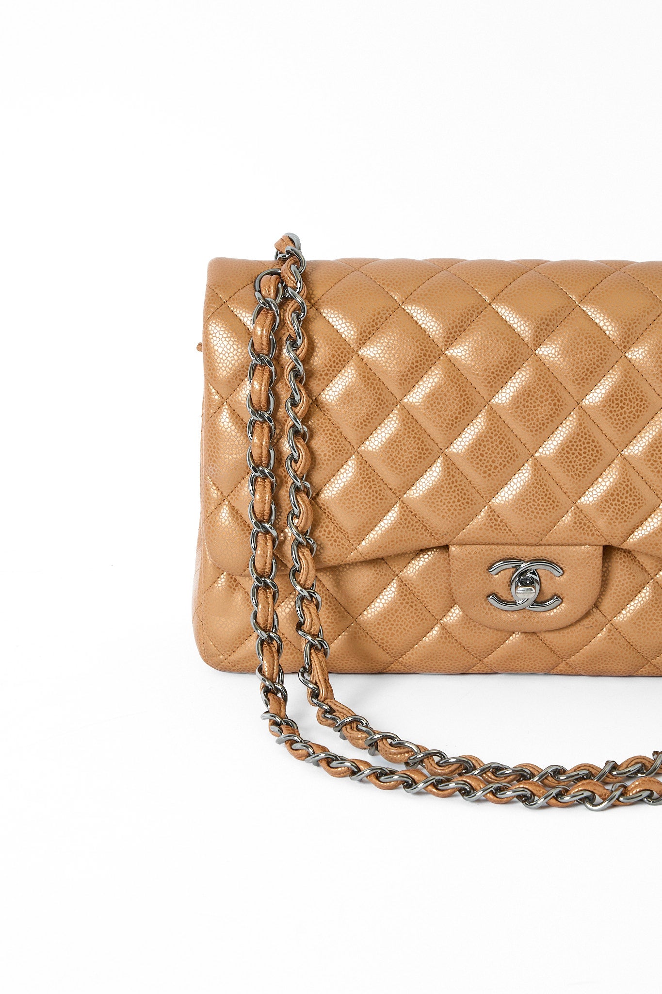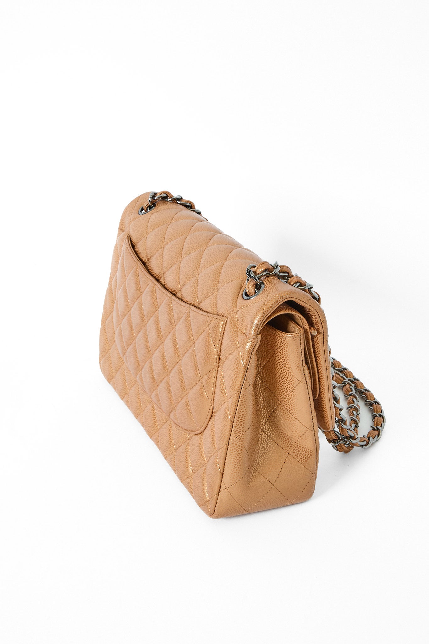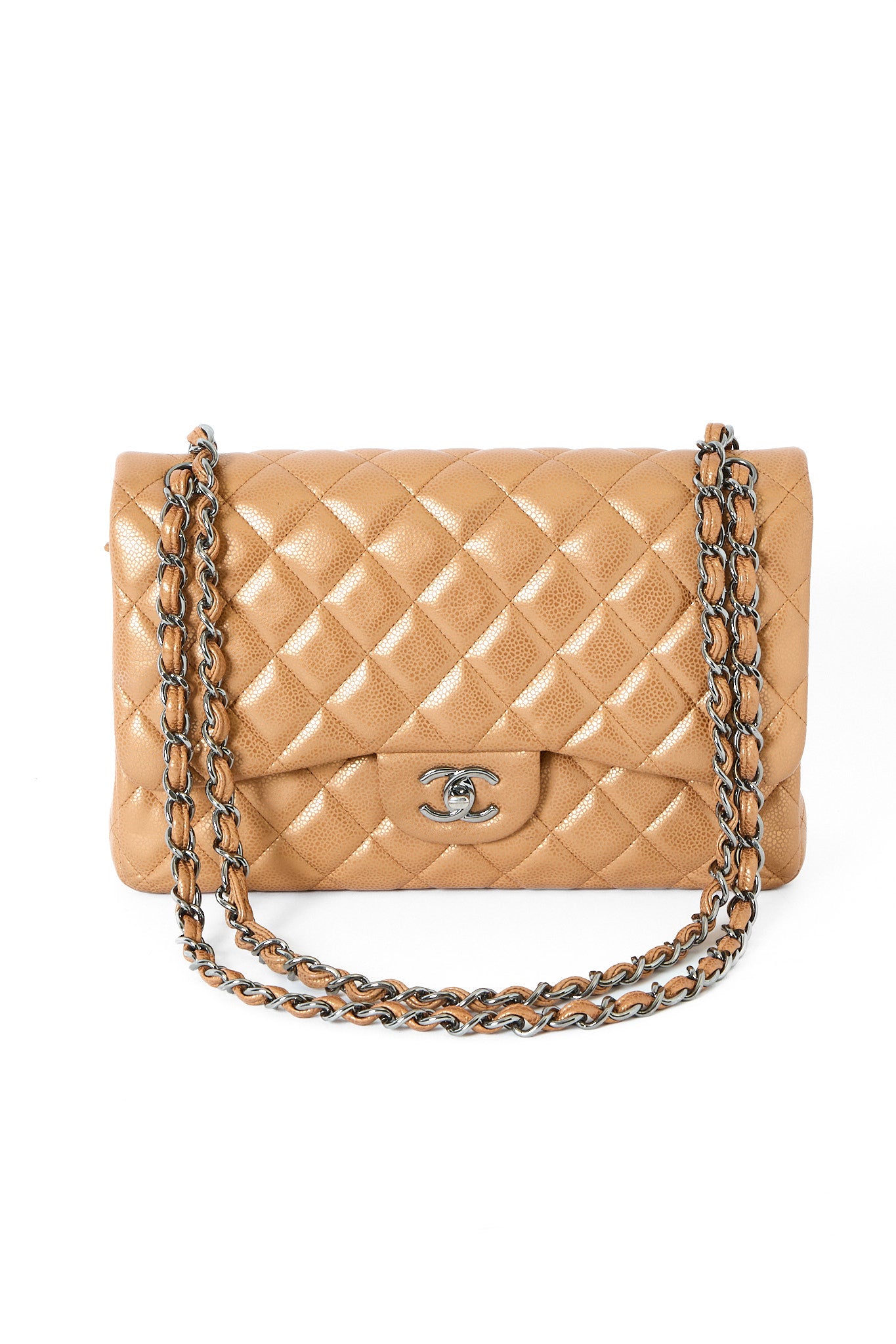 Upptäck den eleganta CHANEL JUMBO DOUBLE FLAP-väskan från Chanel Classic Flap-kollektionen. Denna väska kombinerar utsökt kaviarläder med lammskinn för att garantera både stil och hållbarhet. Den tidlösa designen gör den till ett mångsidigt accessoar i vilken garderob som helst, och den kan matchas med både en klänning eller jeans och kavaj för en sofistikerad look.